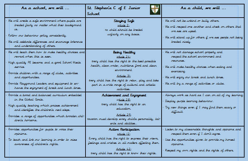 St. Stephen's Junior School is a Rights Committed school where children's rights are at the heart of our ethos and culture. We aim to improve well-being and develop every child's talents and abilities to their full potential! We have successfully achieved our Bronze `Rights Committed` status and we are currently working towards our Silver `Rights Aware` award.