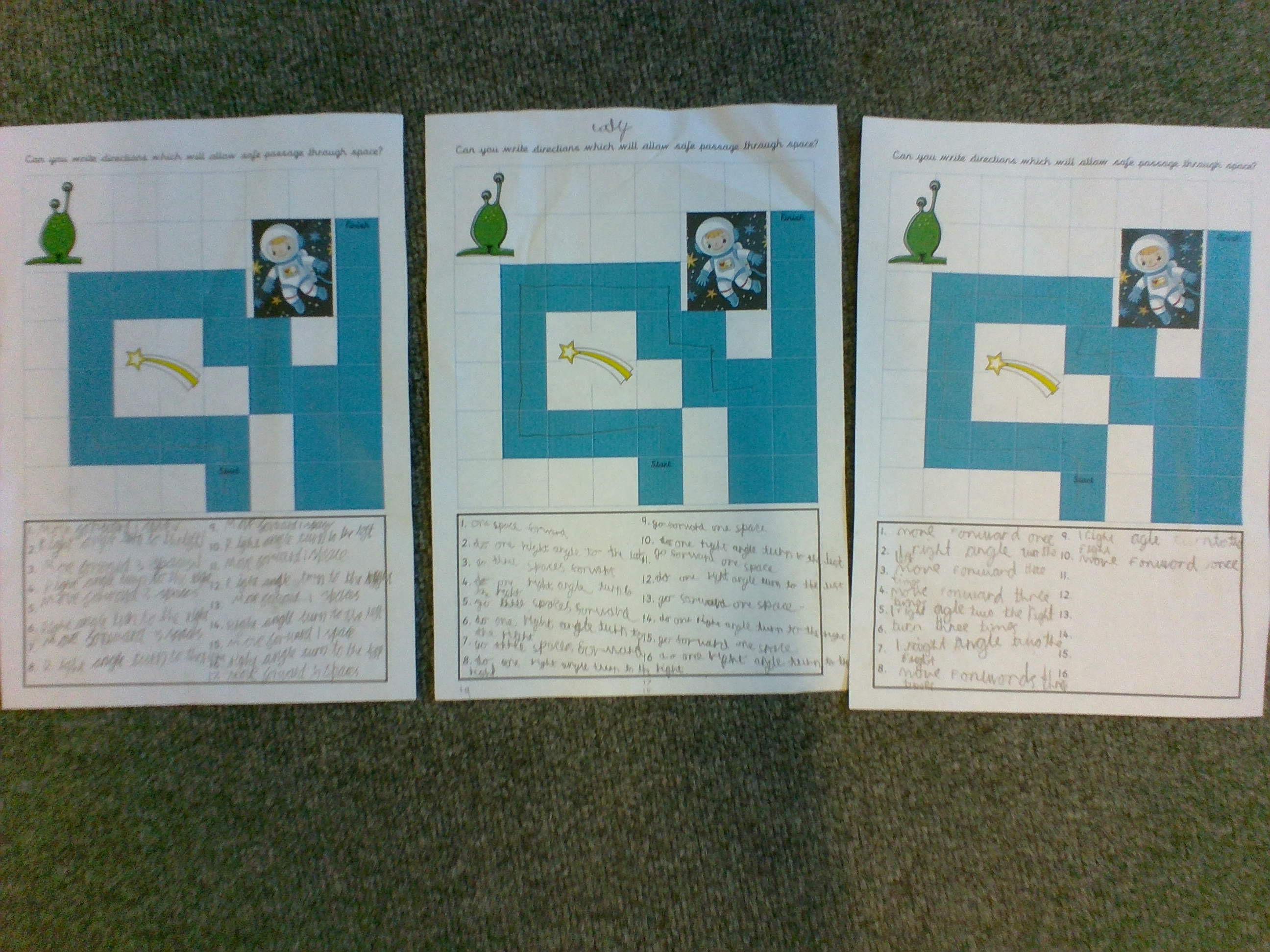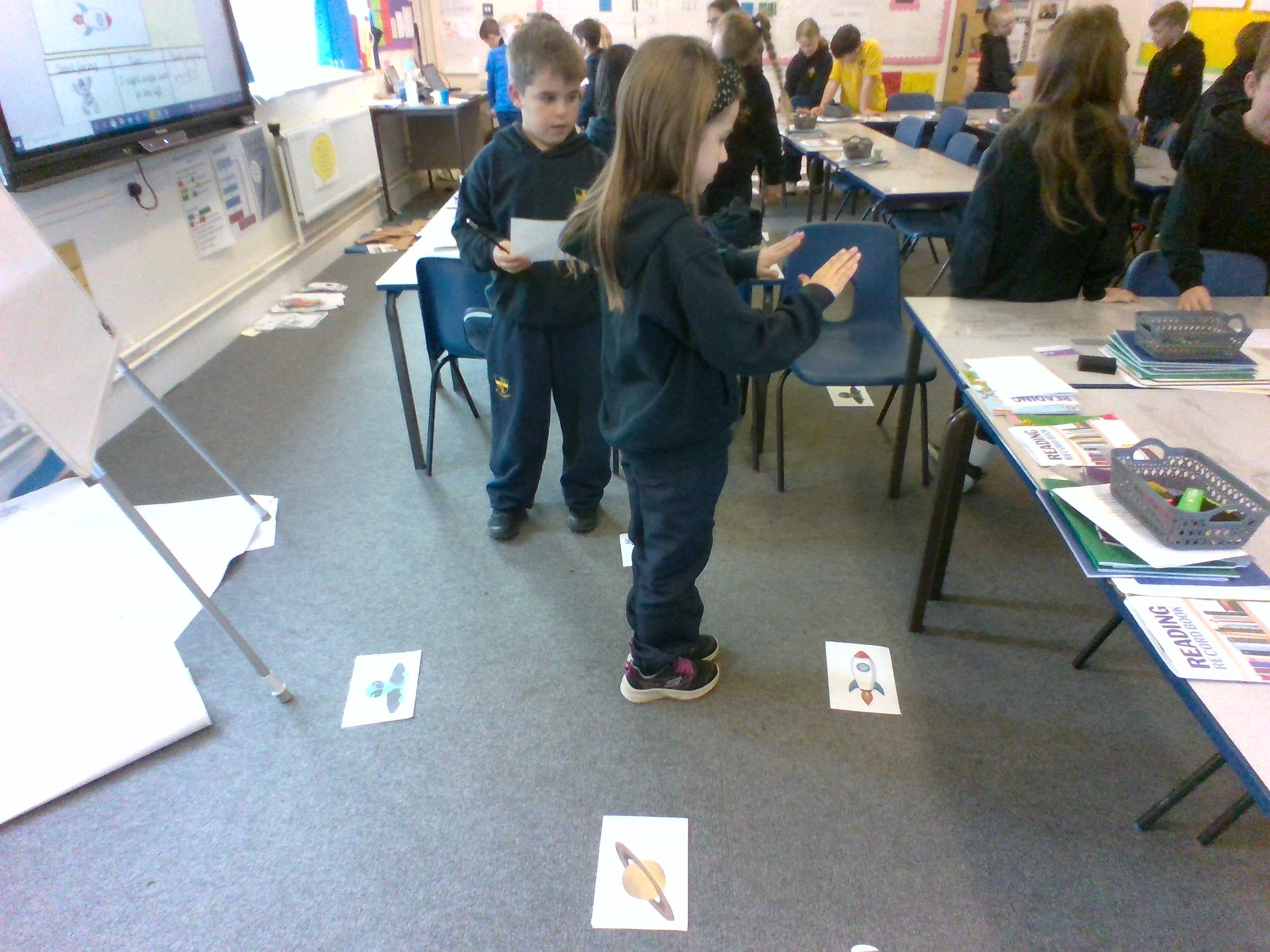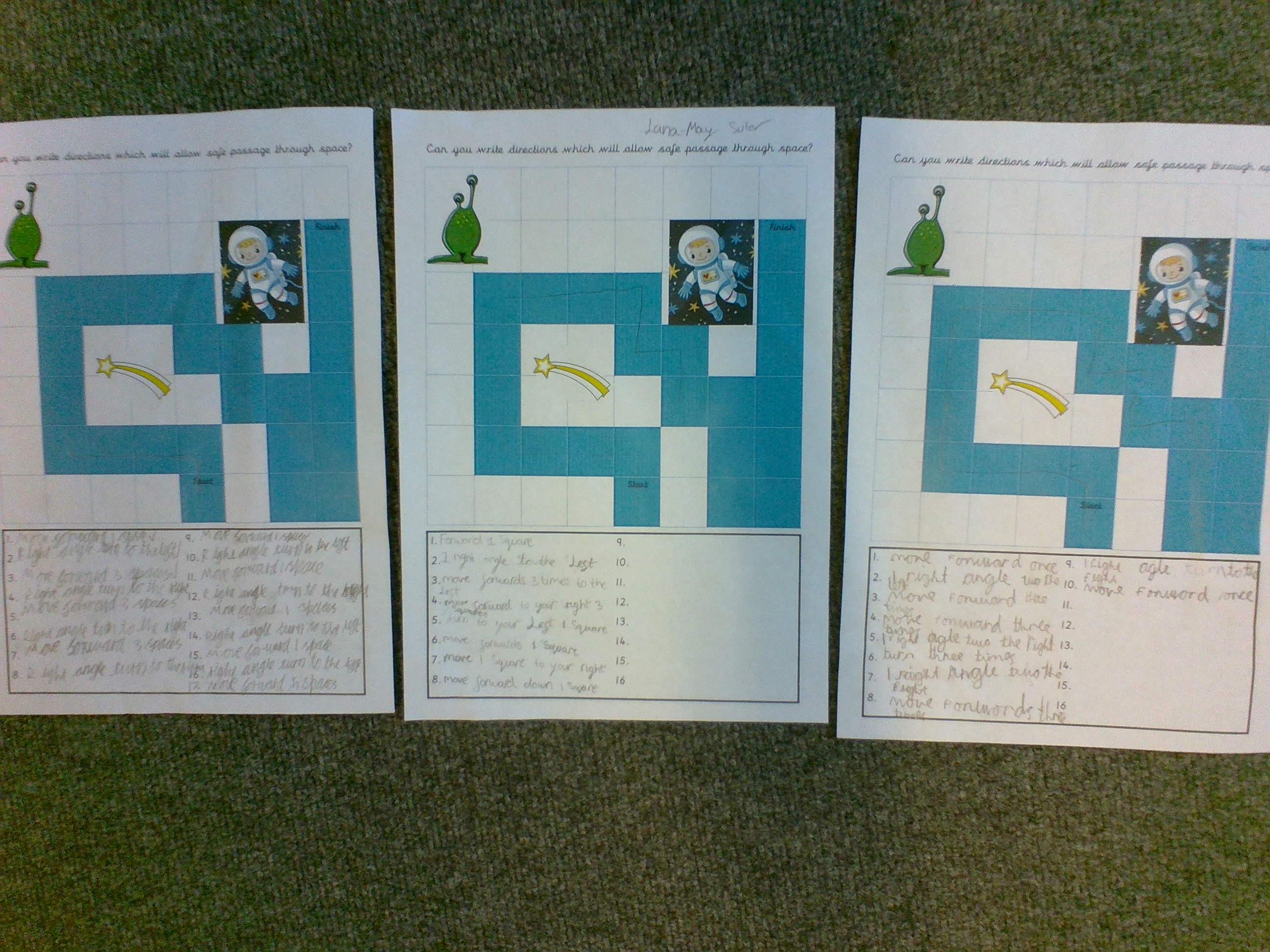 In Week 3, we had a maths day based around space and the solar system! We learnt about right angles and how we can use them to describe direction. We learnt there are 4 right angles turns within a whole turn and practised turning left and right using different amounts of right angle turns. We followed and created directions and then finally created our own space mazes. Can you safely pass through our space mazes?