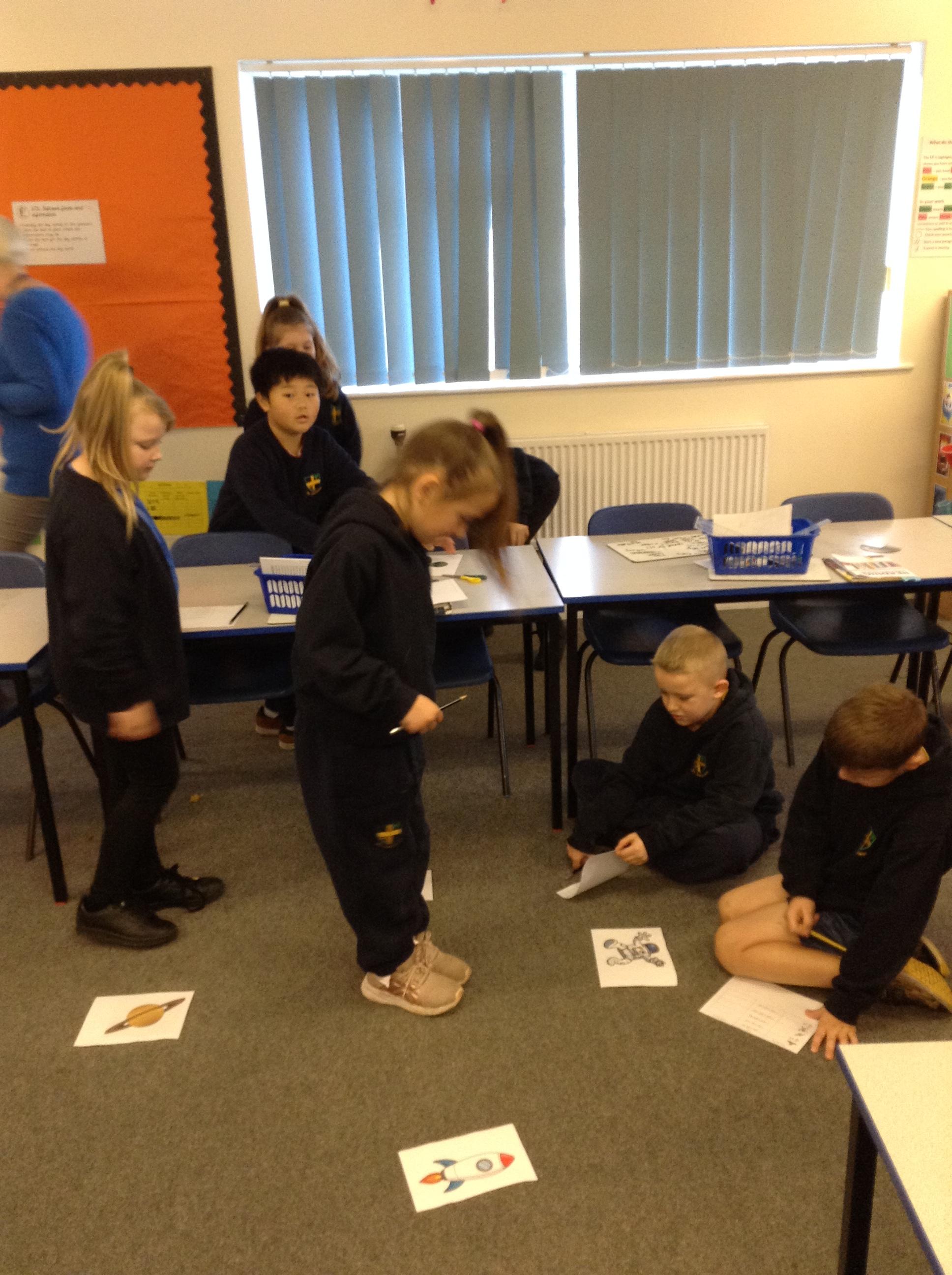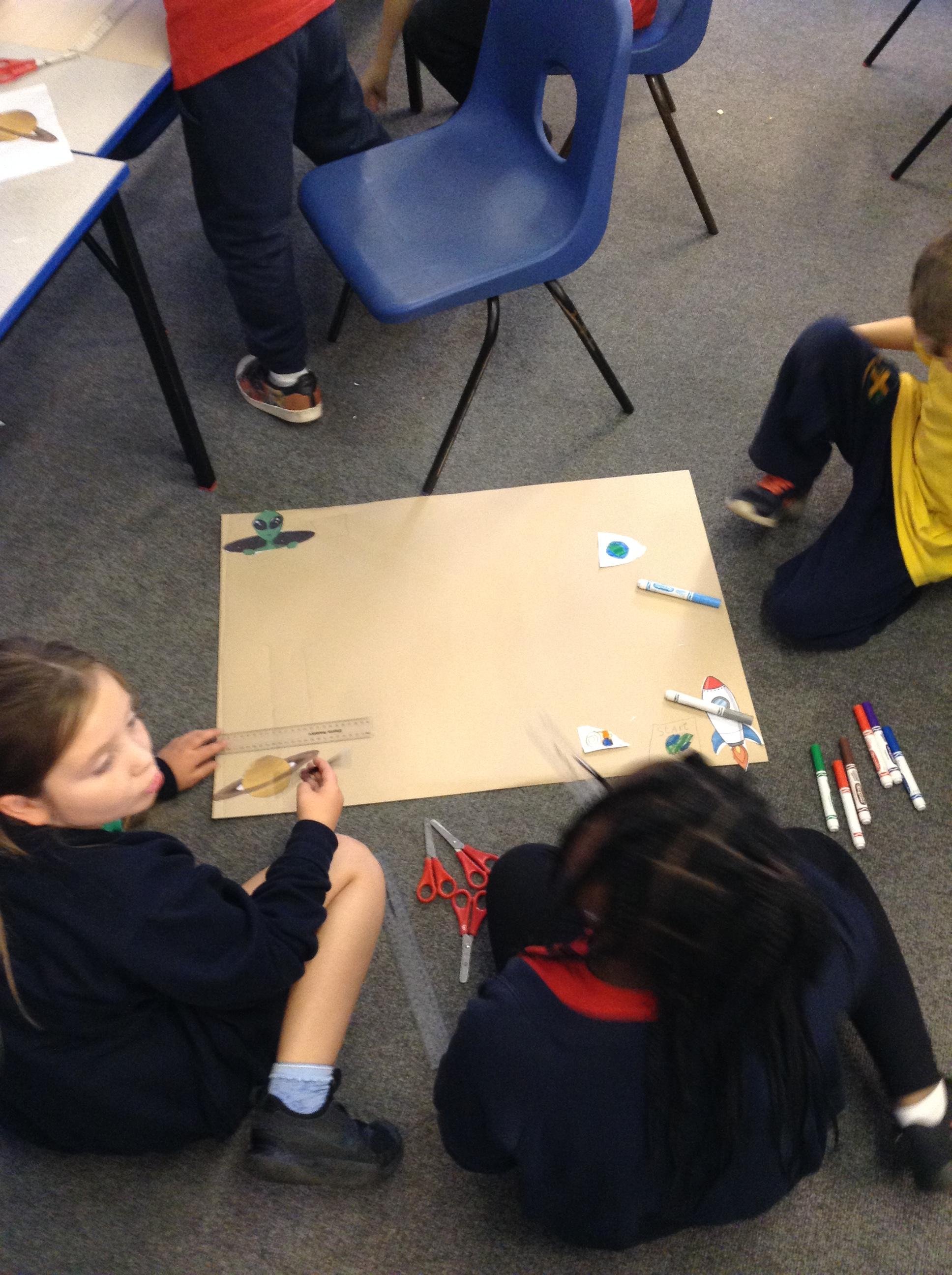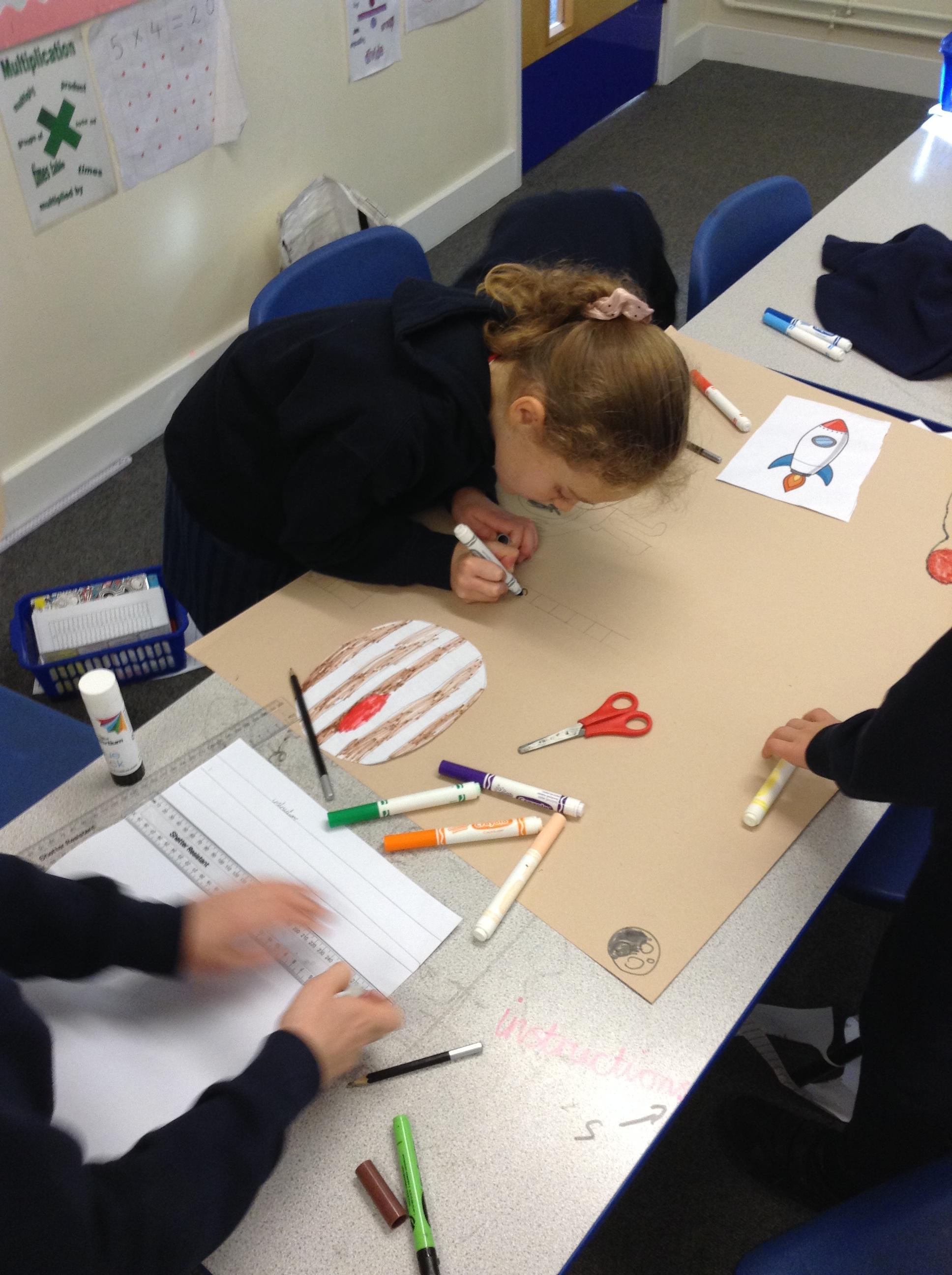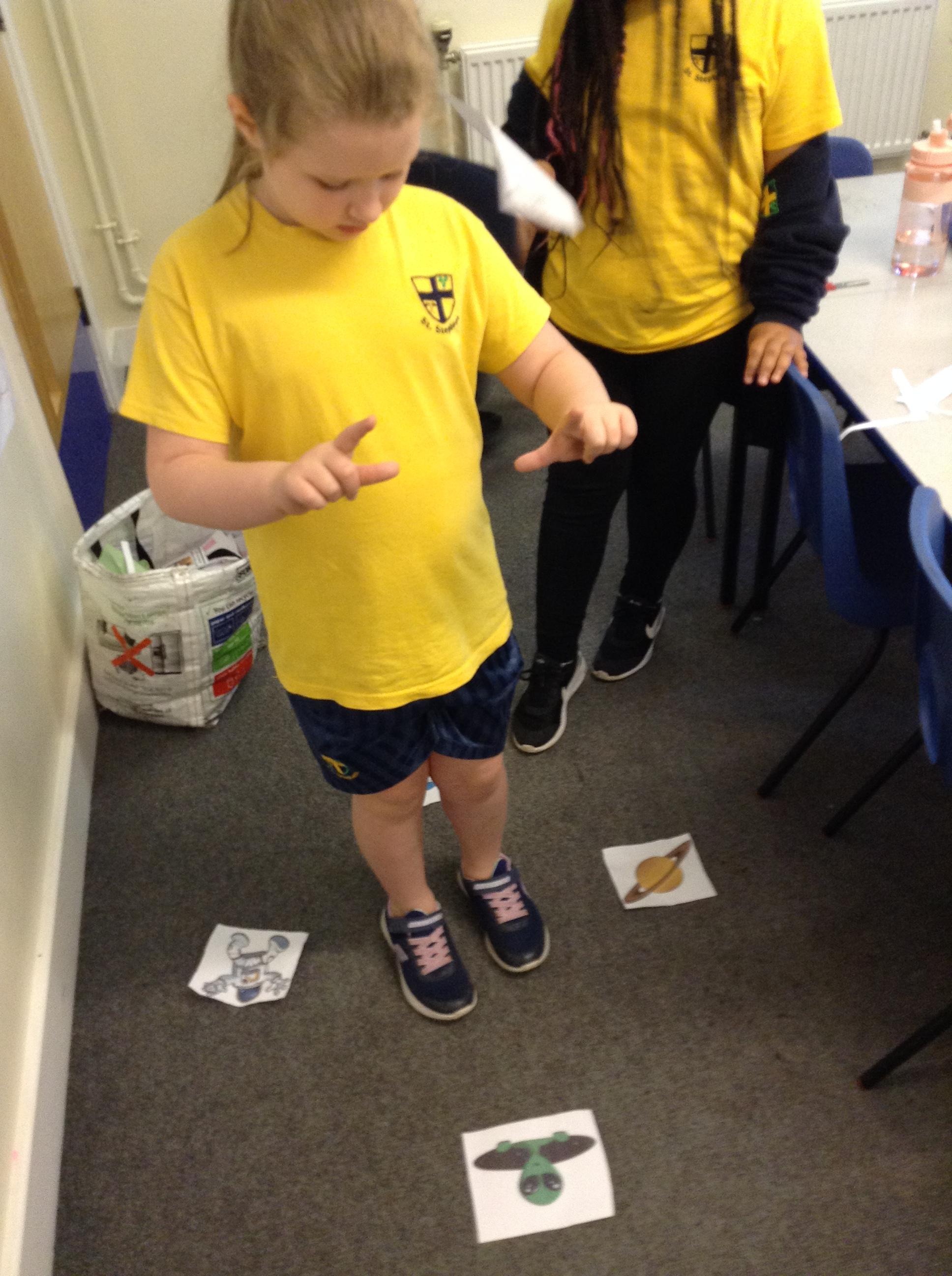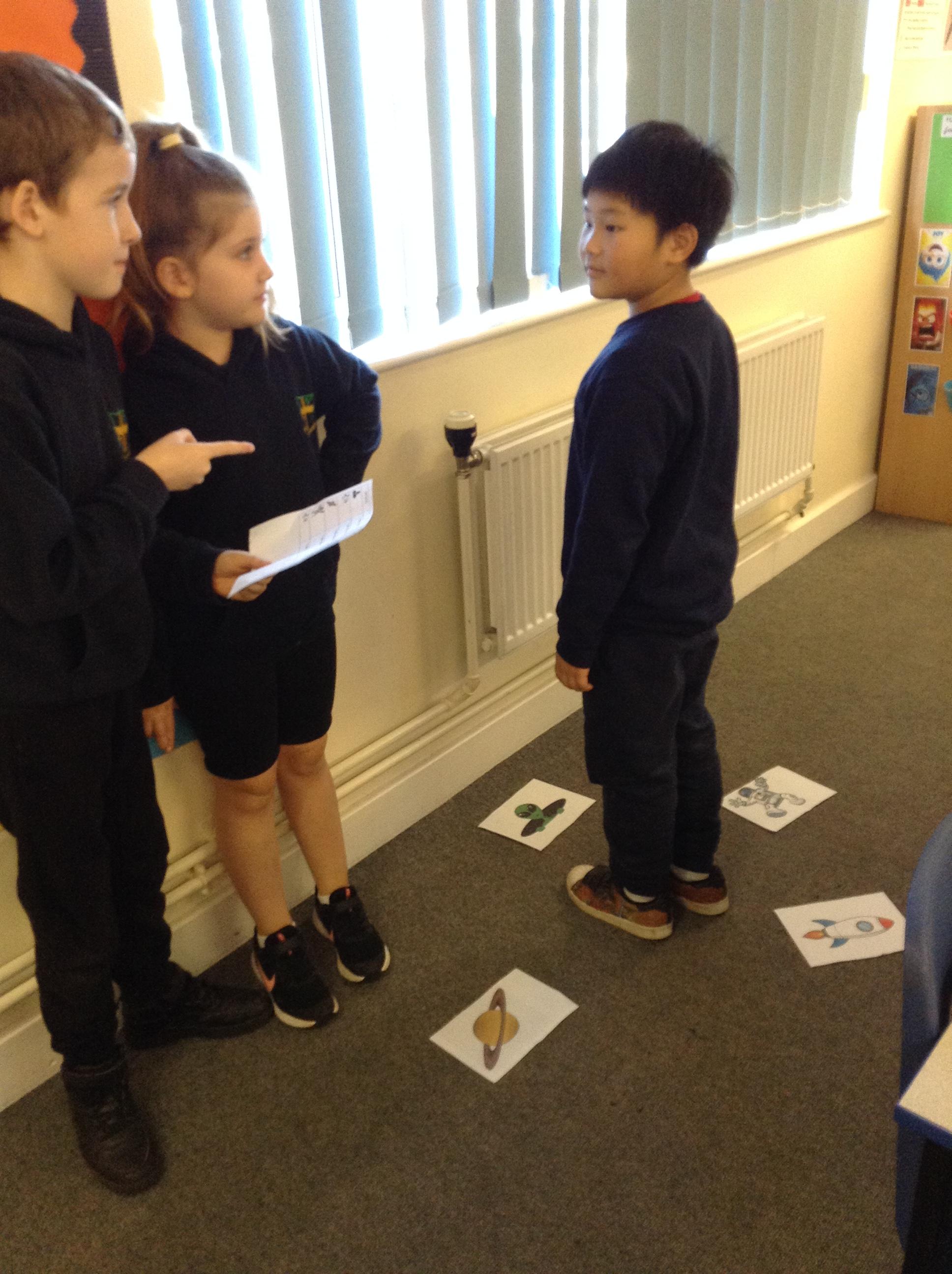 In Week 3, we had a maths day based around space and the solar system! We learnt about right angles and how we can use them to describe direction. We learnt there are 4 right angles turns within a whole turn and practiced turning left and right using different amounts of right angle turns. We followed and created directions and then finally created our own space mazes. Can you safely pass through our space mazes?