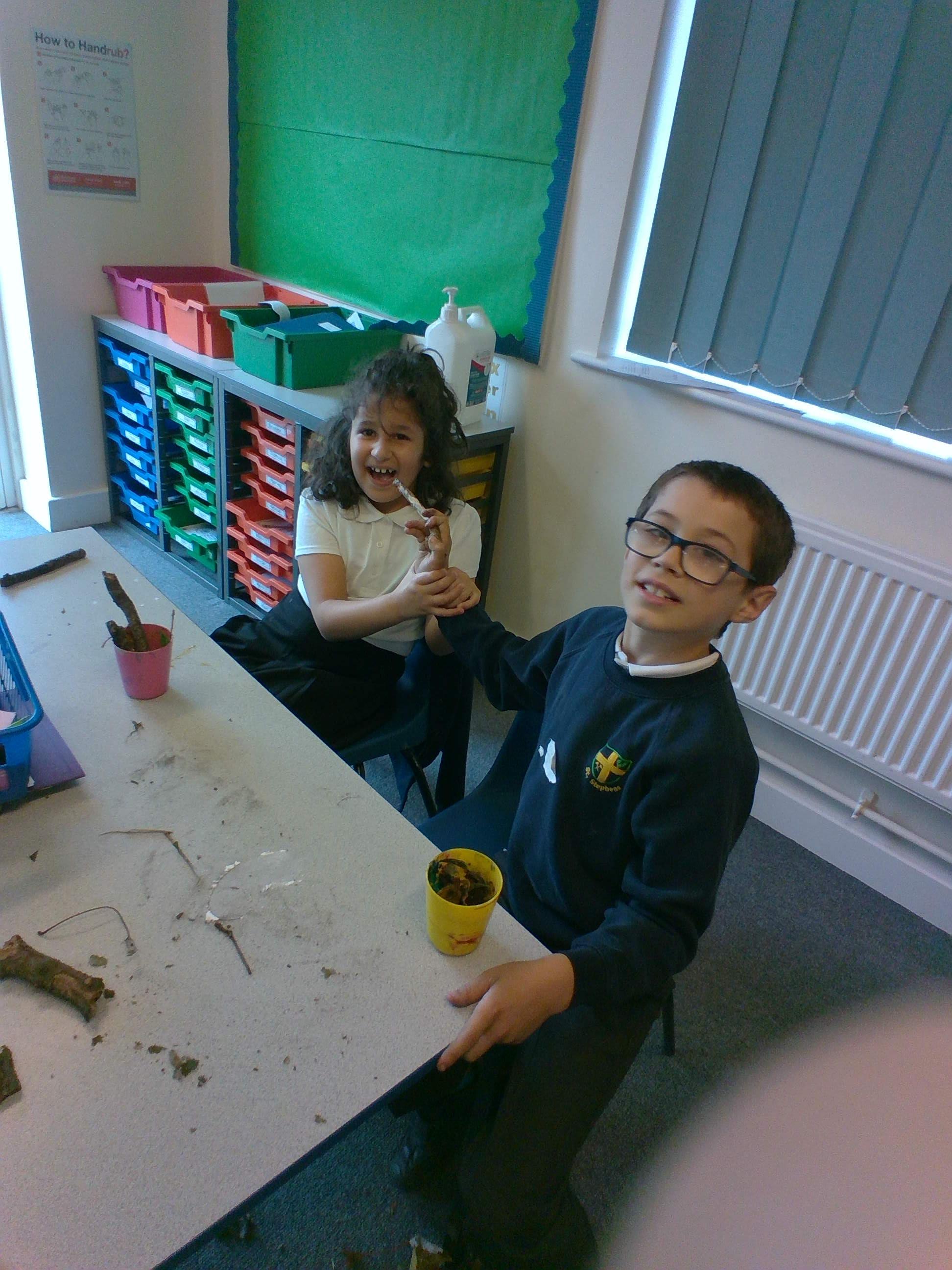 George's marvelous medicine Article 28: The right to an education This term as part of our enquiry, we will be looking at the book, 'George's marvelous medicine' by Roald Dahl. To kick off our learning we looked at the book in close detail and discussed what we thought it would be about. After that, we got started making our own medicines! Using ingredients we found outside and around the classroom and kitchen such as mud, leaves, paint, feathers and even tomatoes! Some of our medicines looked rather disgusting but we really enjoyed making them just like George did in the book. We are so excited to keep on reading our book to find out what happens to George and his Grandma.
