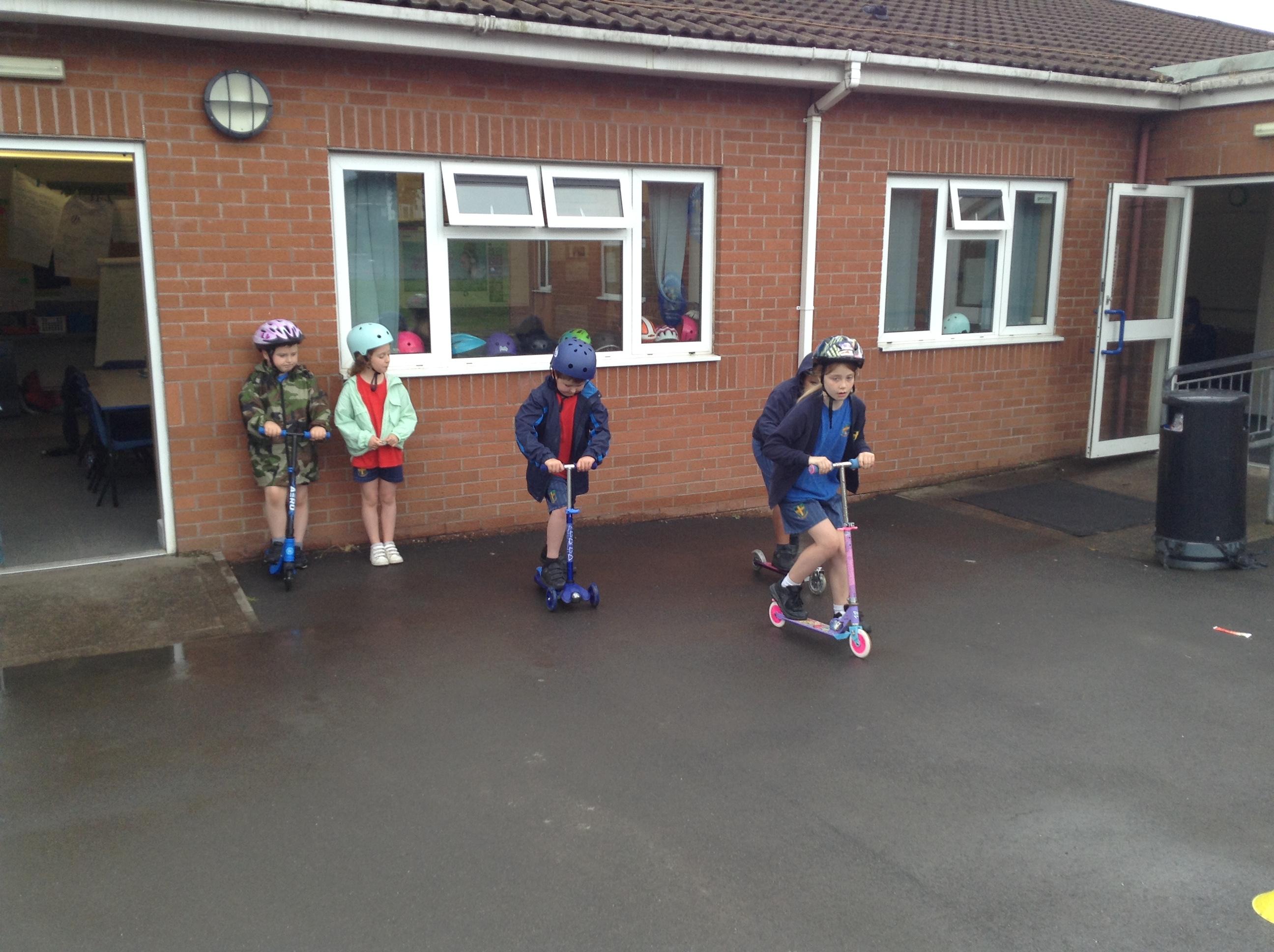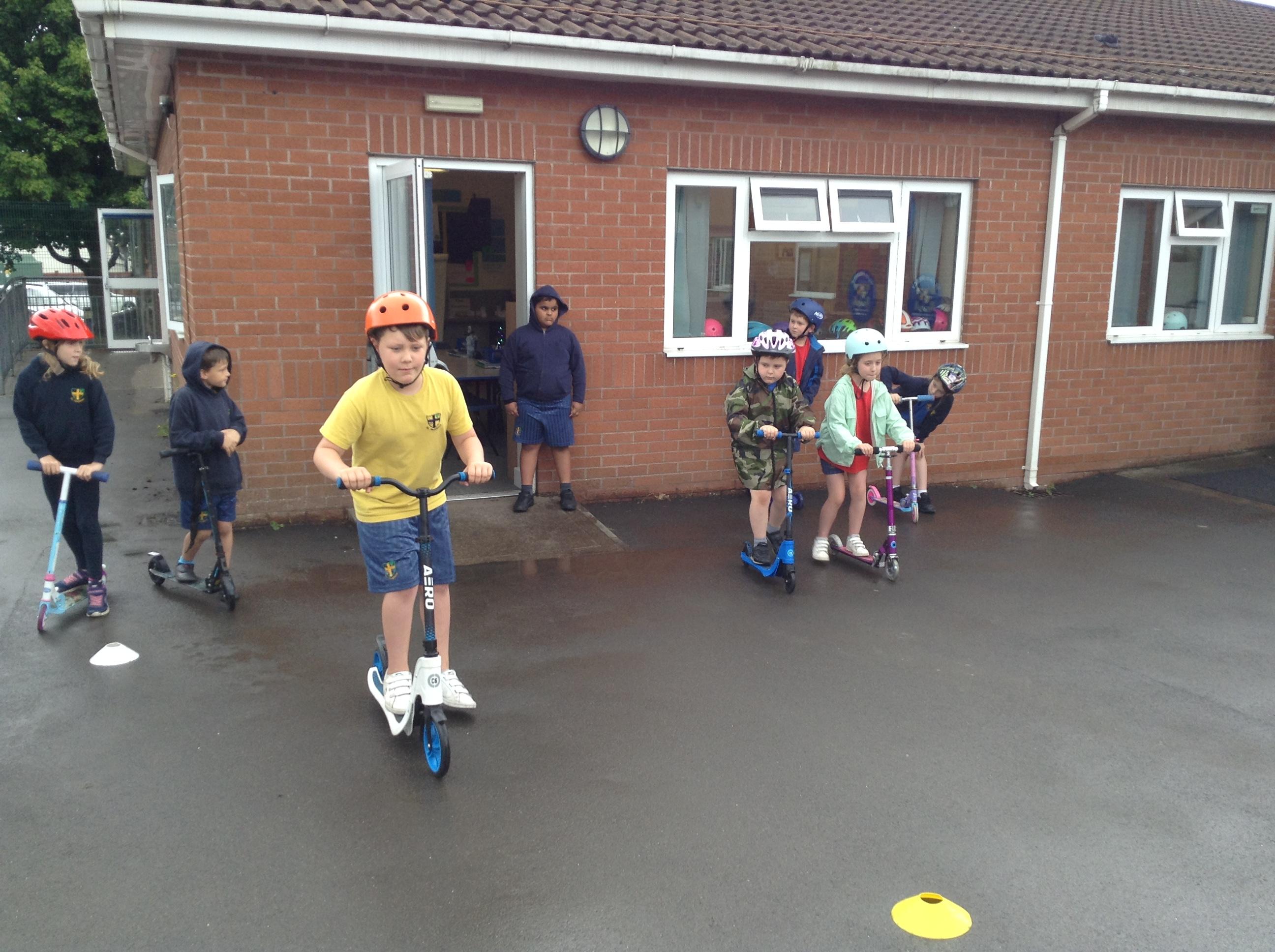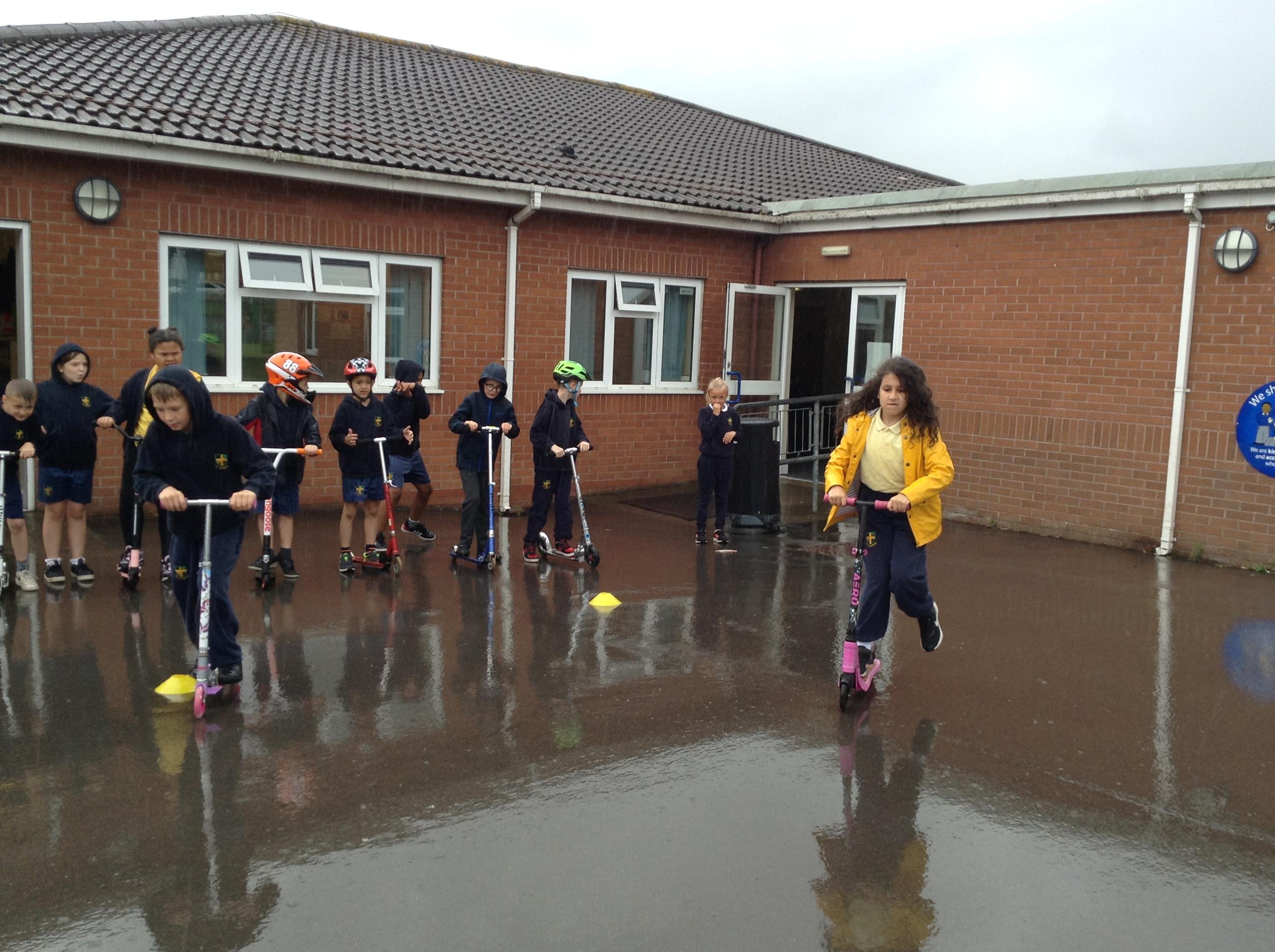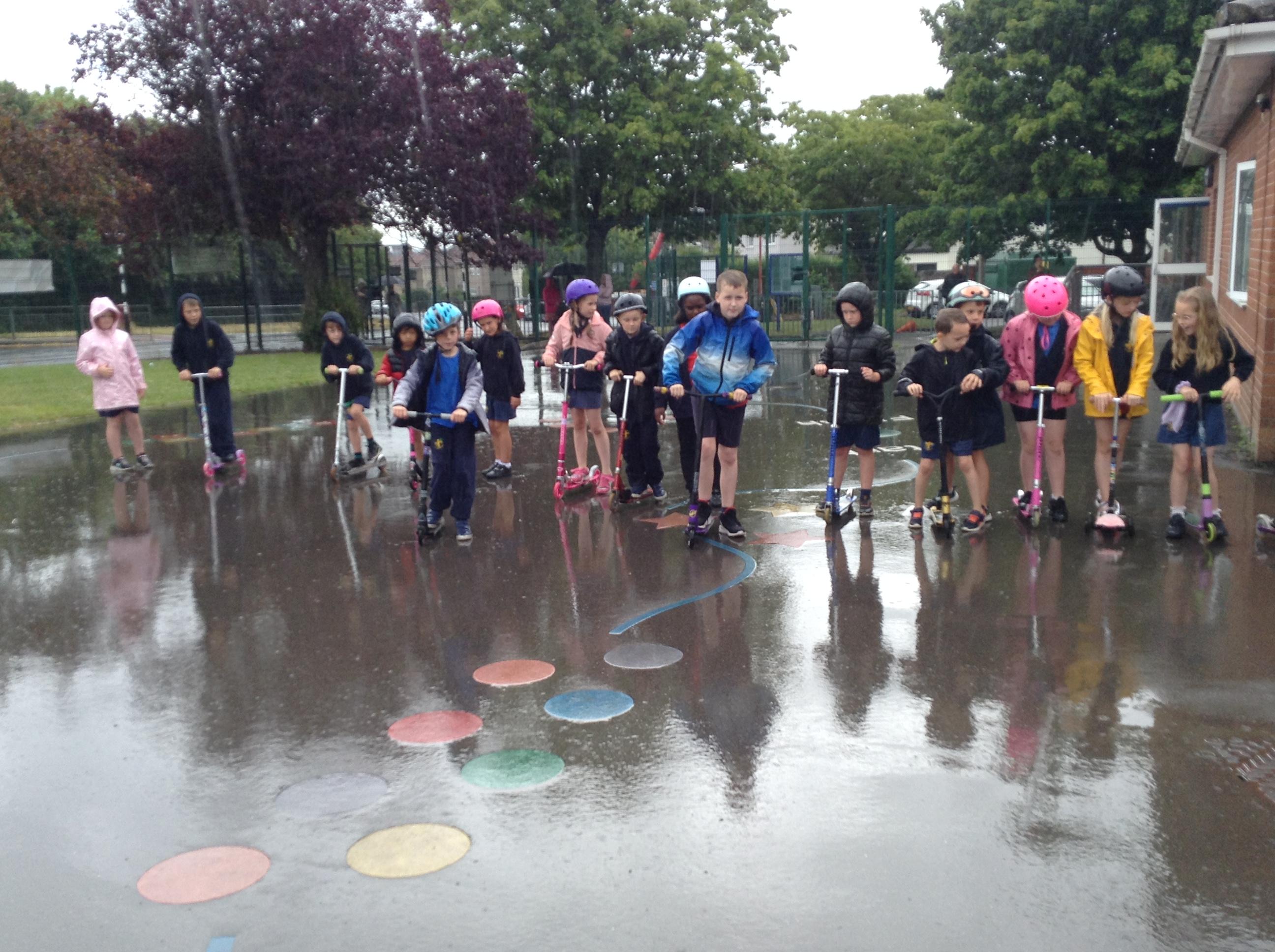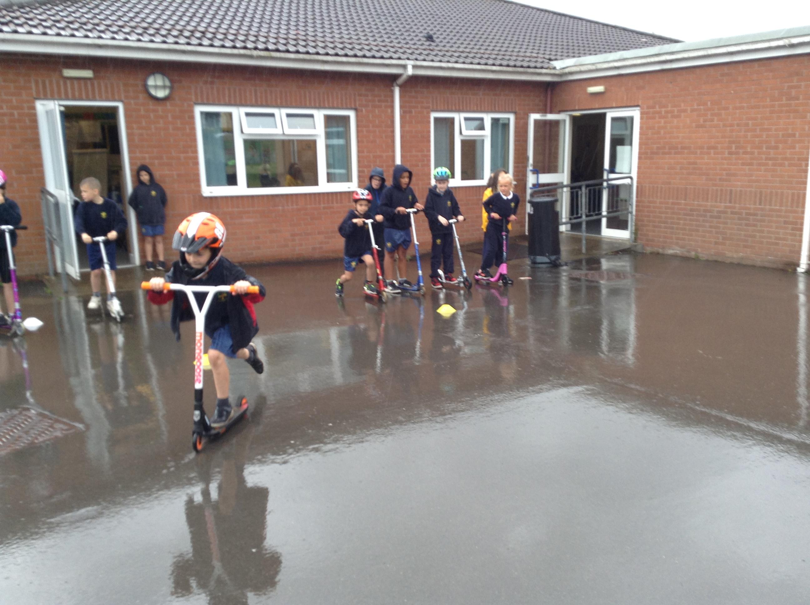 This term, we were given some training on how to properly use our scooters. As well as a theory lesson in the classroom where we learned all about how to put a helmet on correctly, check the scooter is safe and learn where to scoot, we also had a practical lesson outside. Even though it was very wet and rainy, it didn't stop us from putting the theory into practice to check over our scooters, test the brakes to stop before we hit Miss Porter and turn corners using the brakes to help us go steady. It was great fun and we thought it was really good to learn how to do this in all weathers!