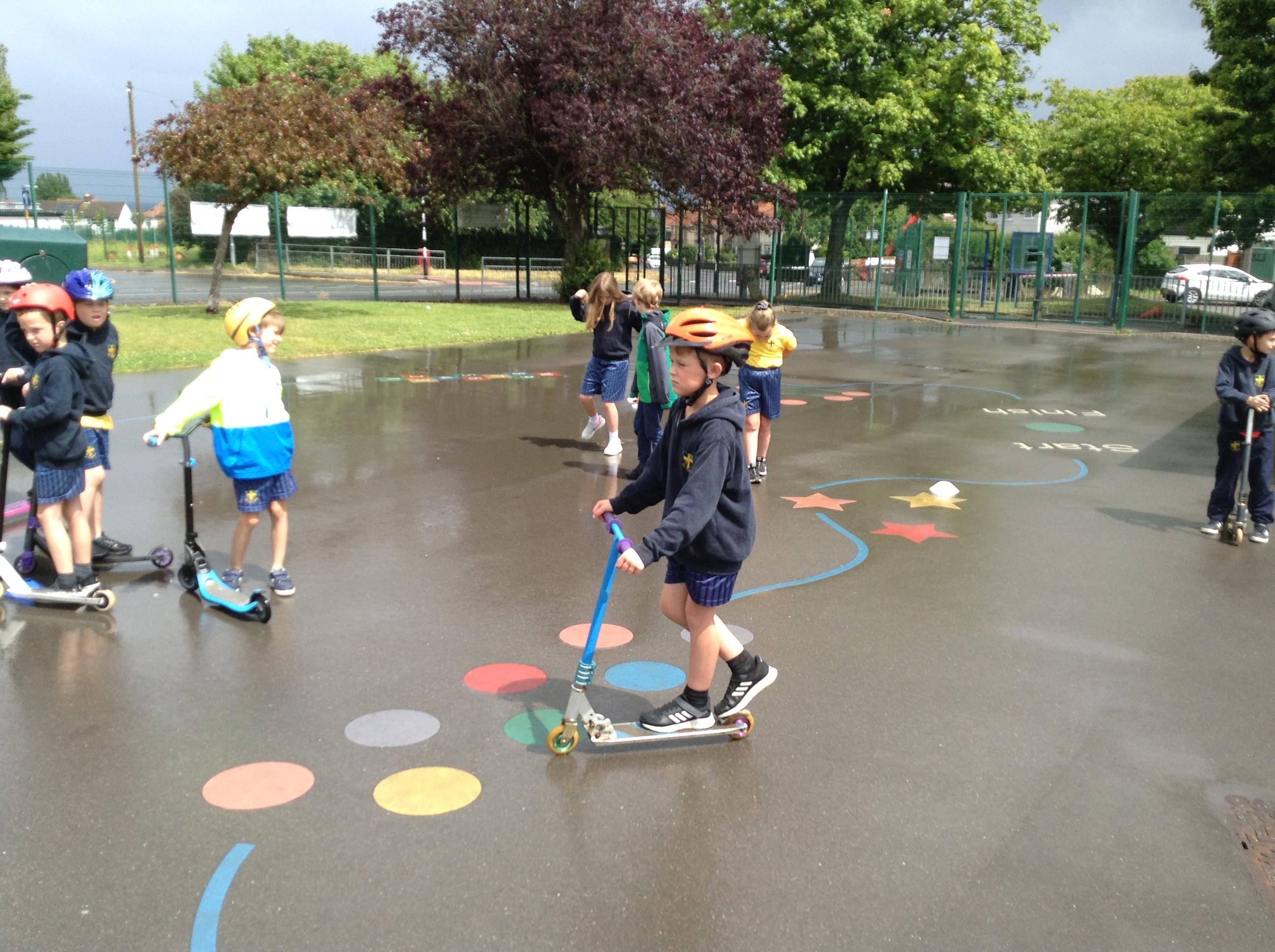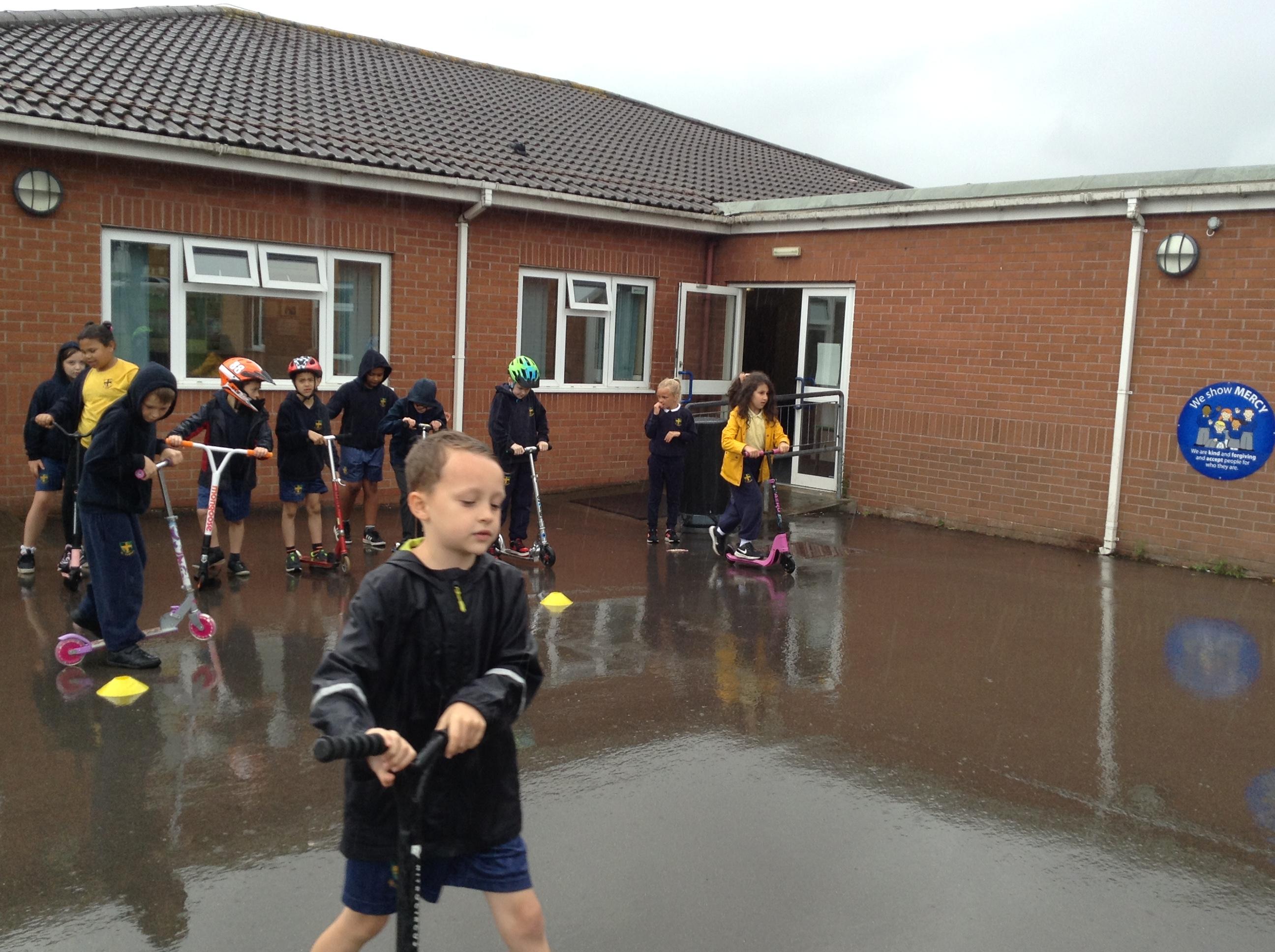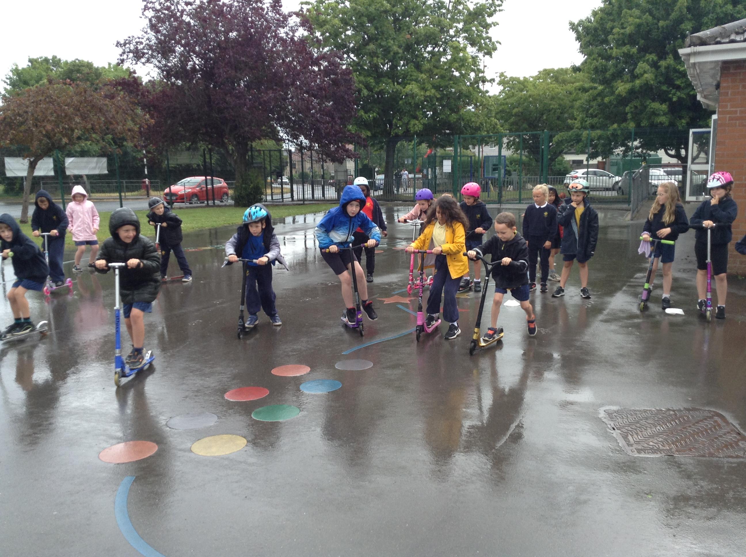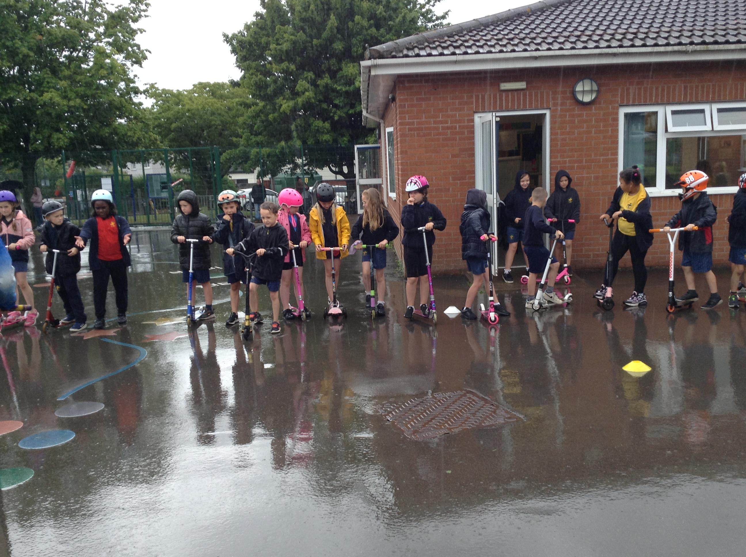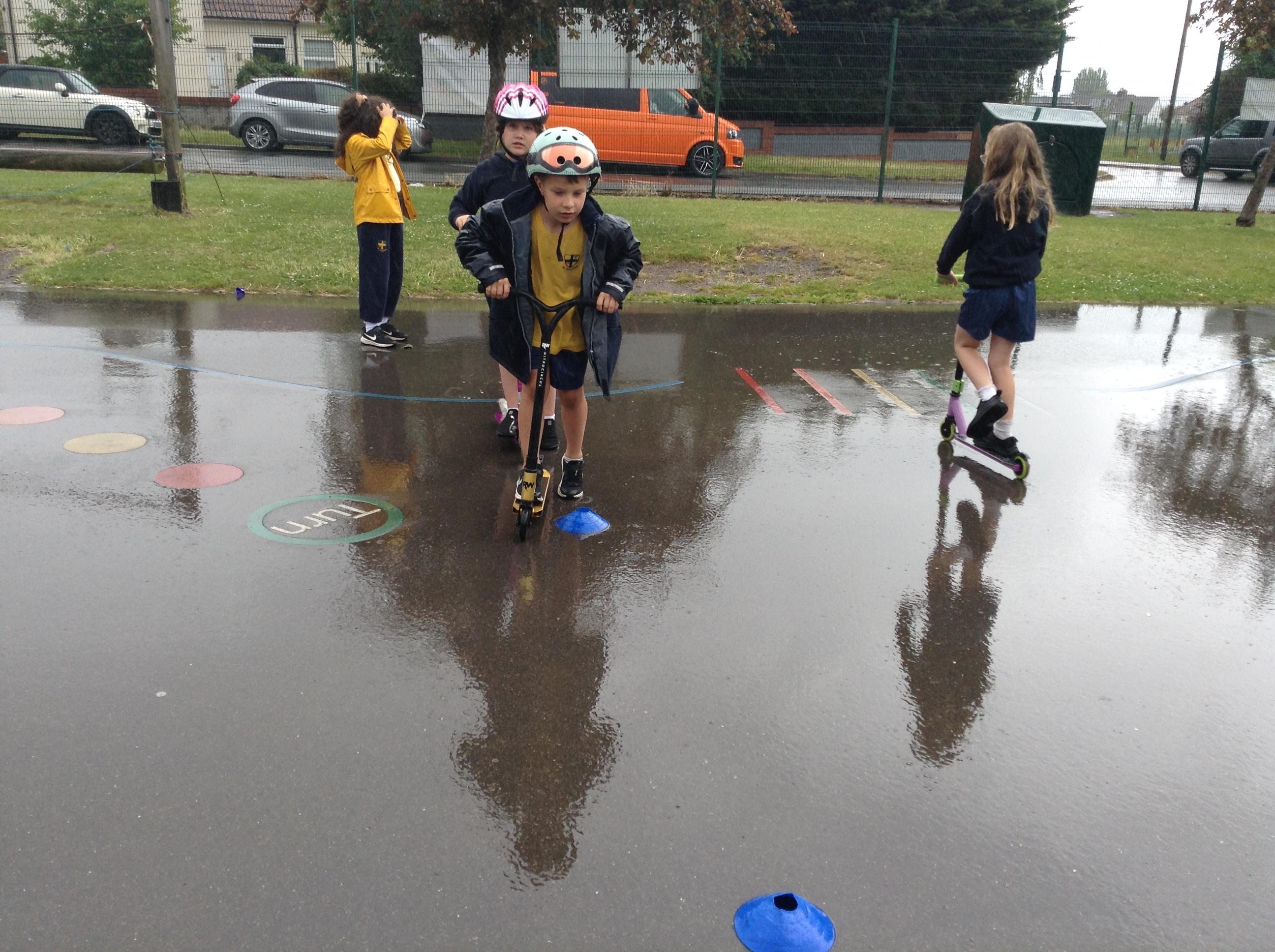 This term, we were given some training on how to properly use our scooters. As well as a theory lesson in the classroom where we learned all about how to put a helmet on correctly, check the scooter is safe and learn where to scoot, we also had a practical lesson outside. Even though it was very wet and rainy, it didn't stop us from putting the theory into practice to check over our scooters, test the brakes to stop before we hit Miss Porter and turn corners using the brakes to help us go steady. It was great fun and we thought it was really good to learn how to do this in all weathers!