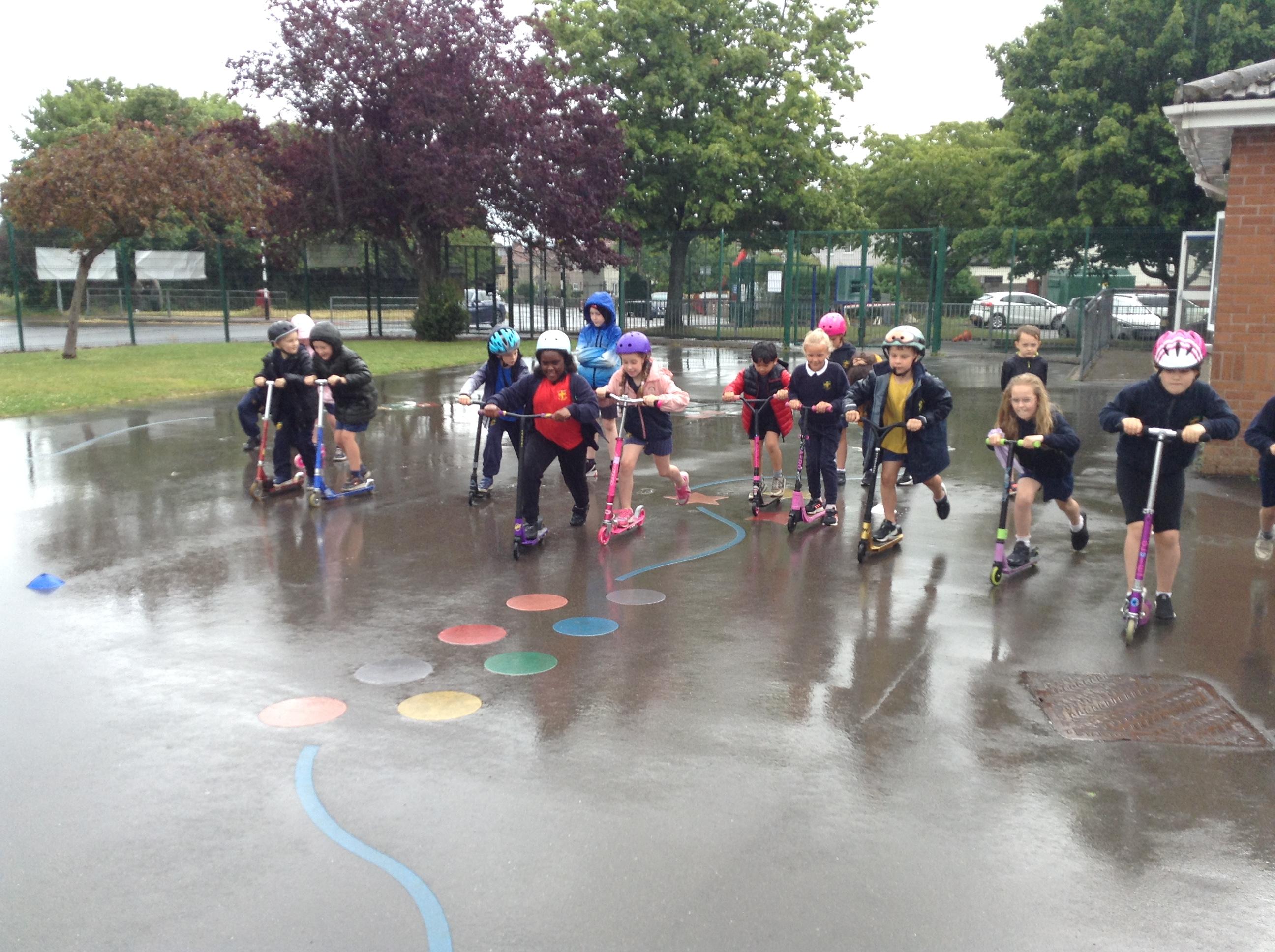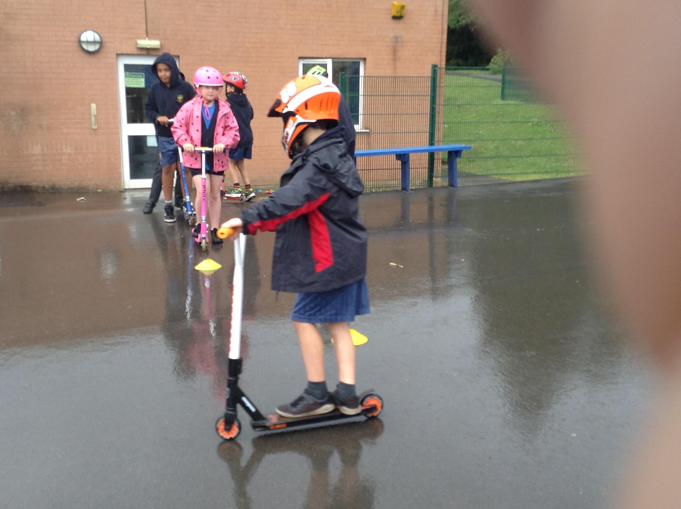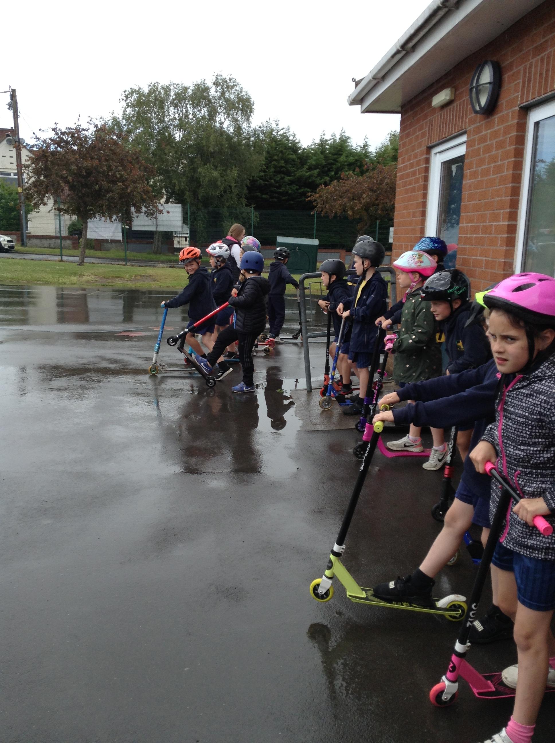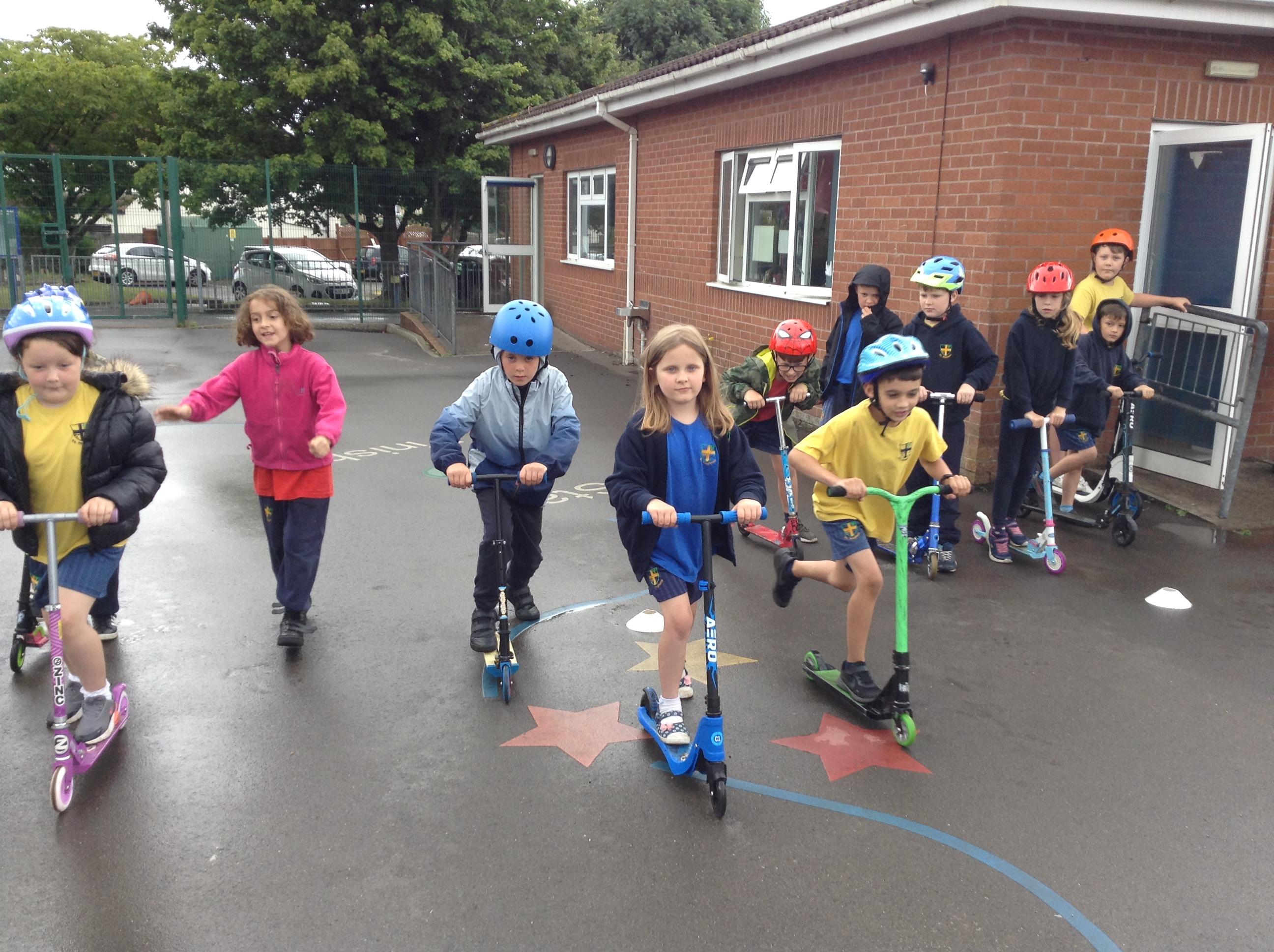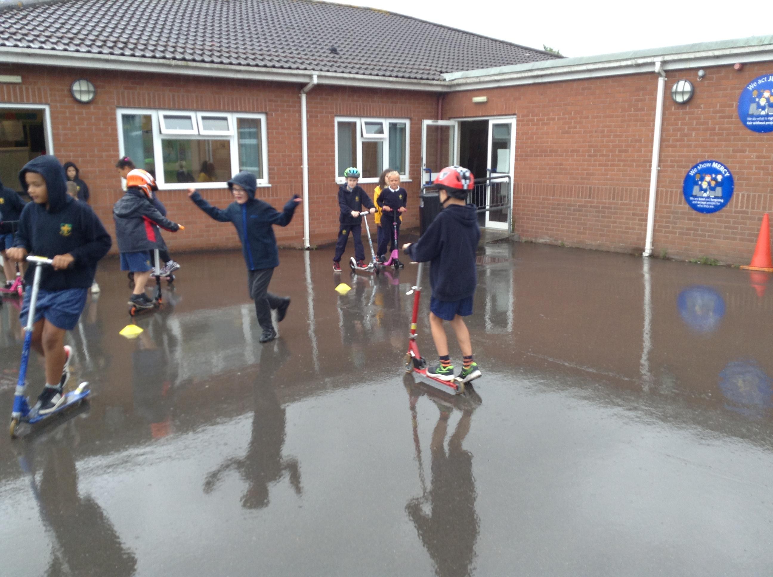 This term, we were given some training on how to properly use our scooters. As well as a theory lesson in the classroom where we learned all about how to put a helmet on correctly, check the scooter is safe and learn where to scoot, we also had a practical lesson outside. Even though it was very wet and rainy, it didn't stop us from putting the theory into practice to check over our scooters, test the brakes to stop before we hit Miss Porter and turn corners using the brakes to help us go steady. It was great fun and we thought it was really good to learn how to do this in all weathers!