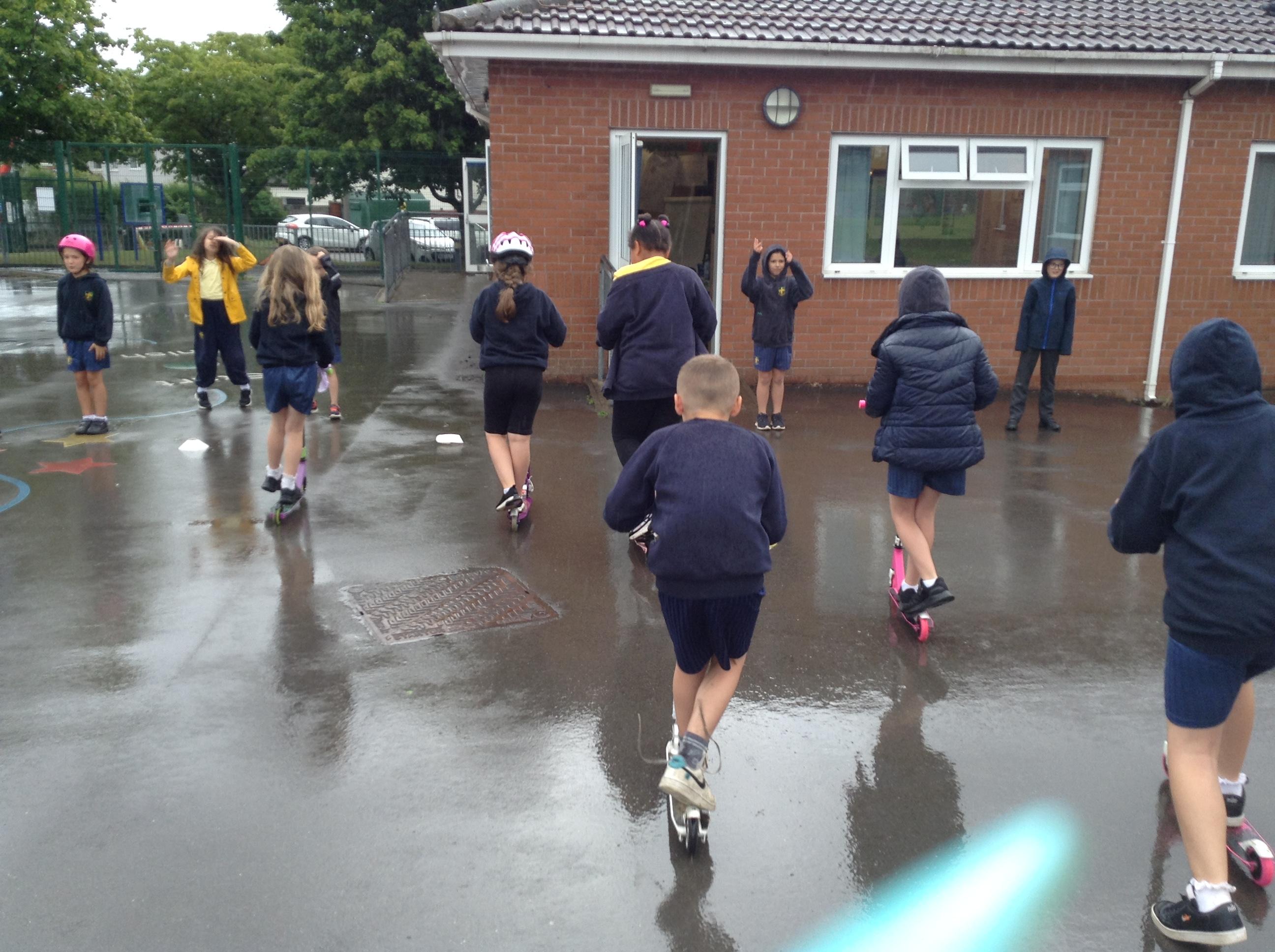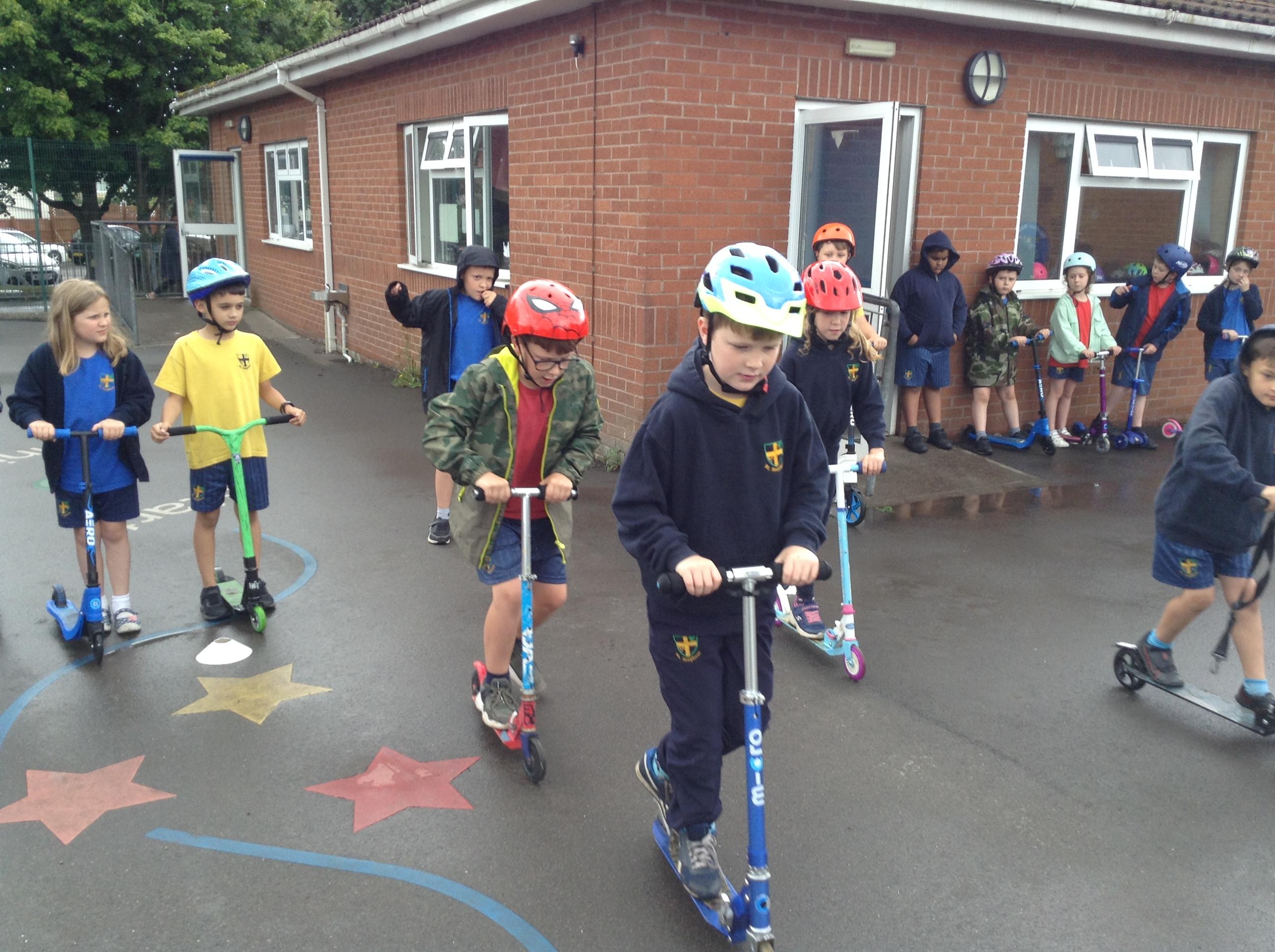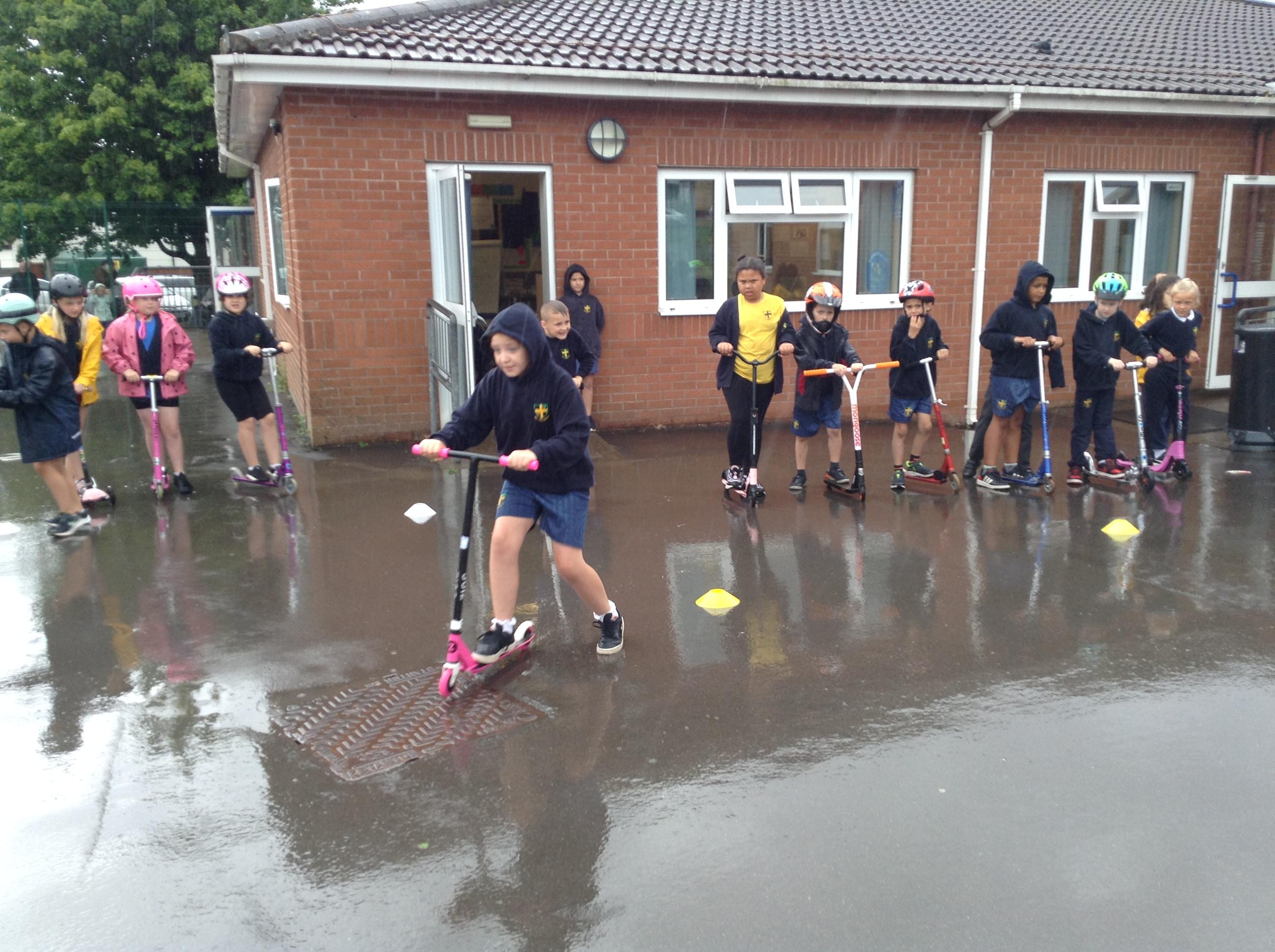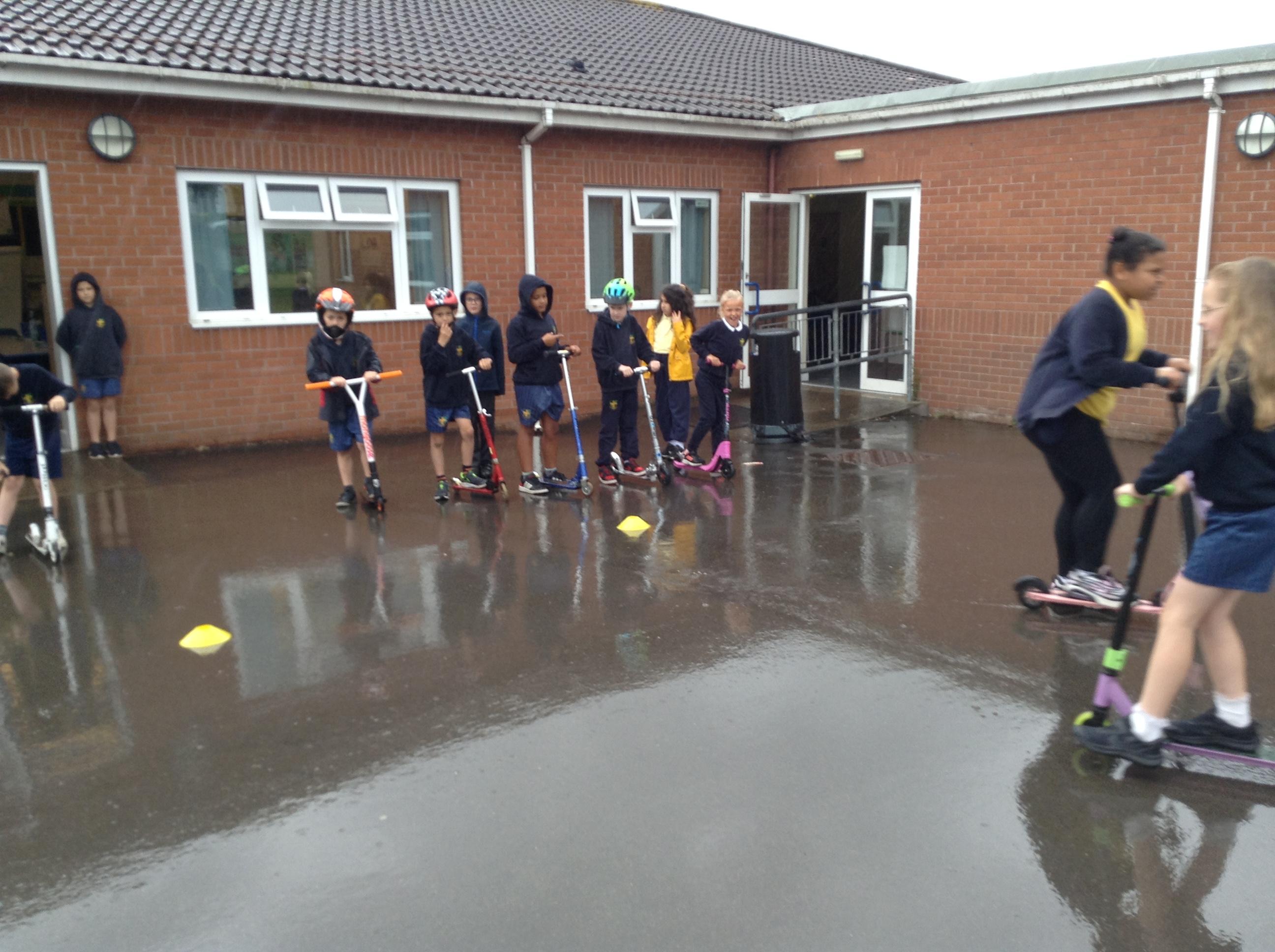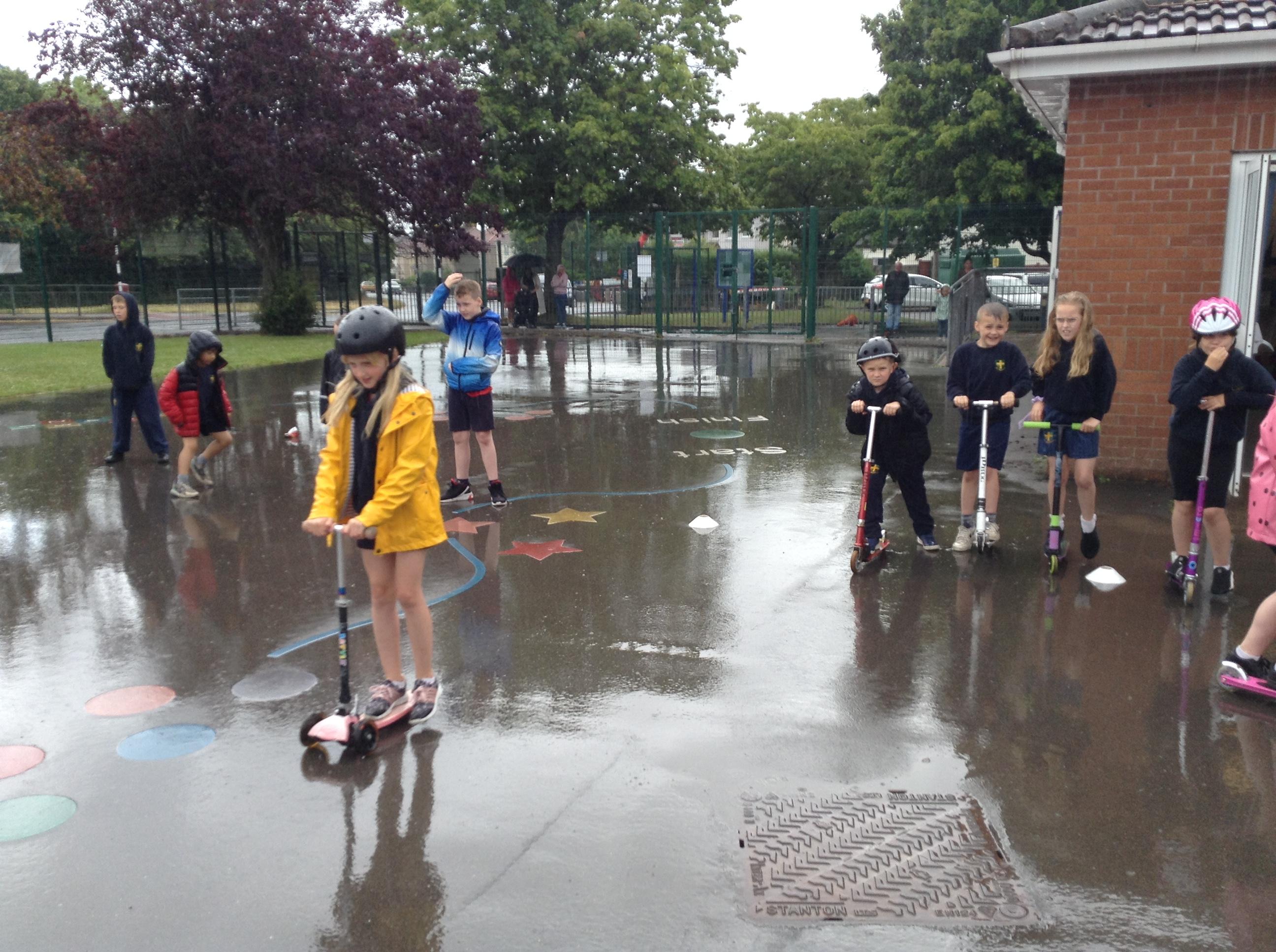 This term, we were given some training on how to properly use our scooters. As well as a theory lesson in the classroom where we learned all about how to put a helmet on correctly, check the scooter is safe and learn where to scoot, we also had a practical lesson outside. Even though it was very wet and rainy, it didn't stop us from putting the theory into practice to check over our scooters, test the brakes to stop before we hit Miss Porter and turn corners using the brakes to help us go steady. It was great fun and we thought it was really good to learn how to do this in all weathers!