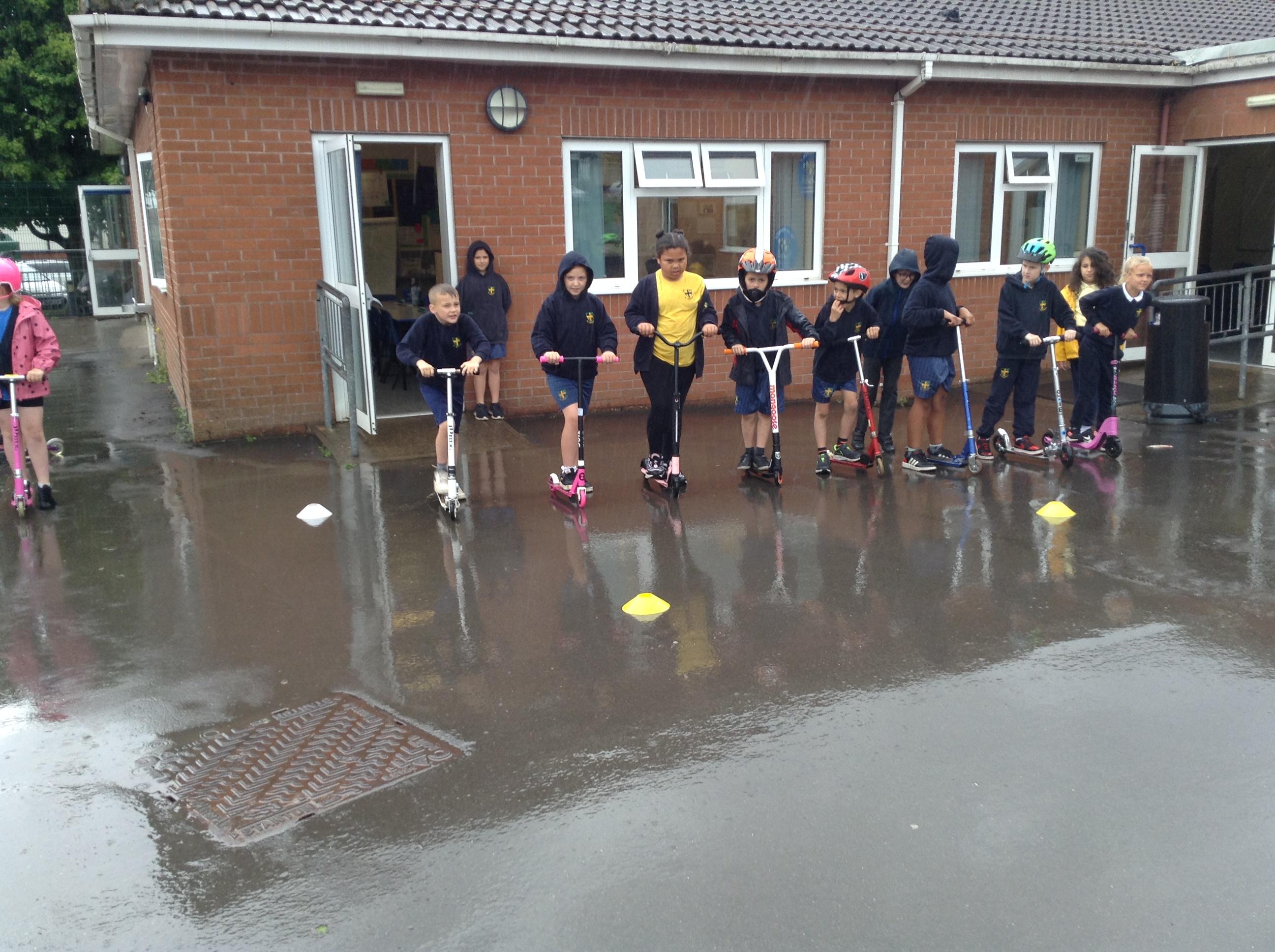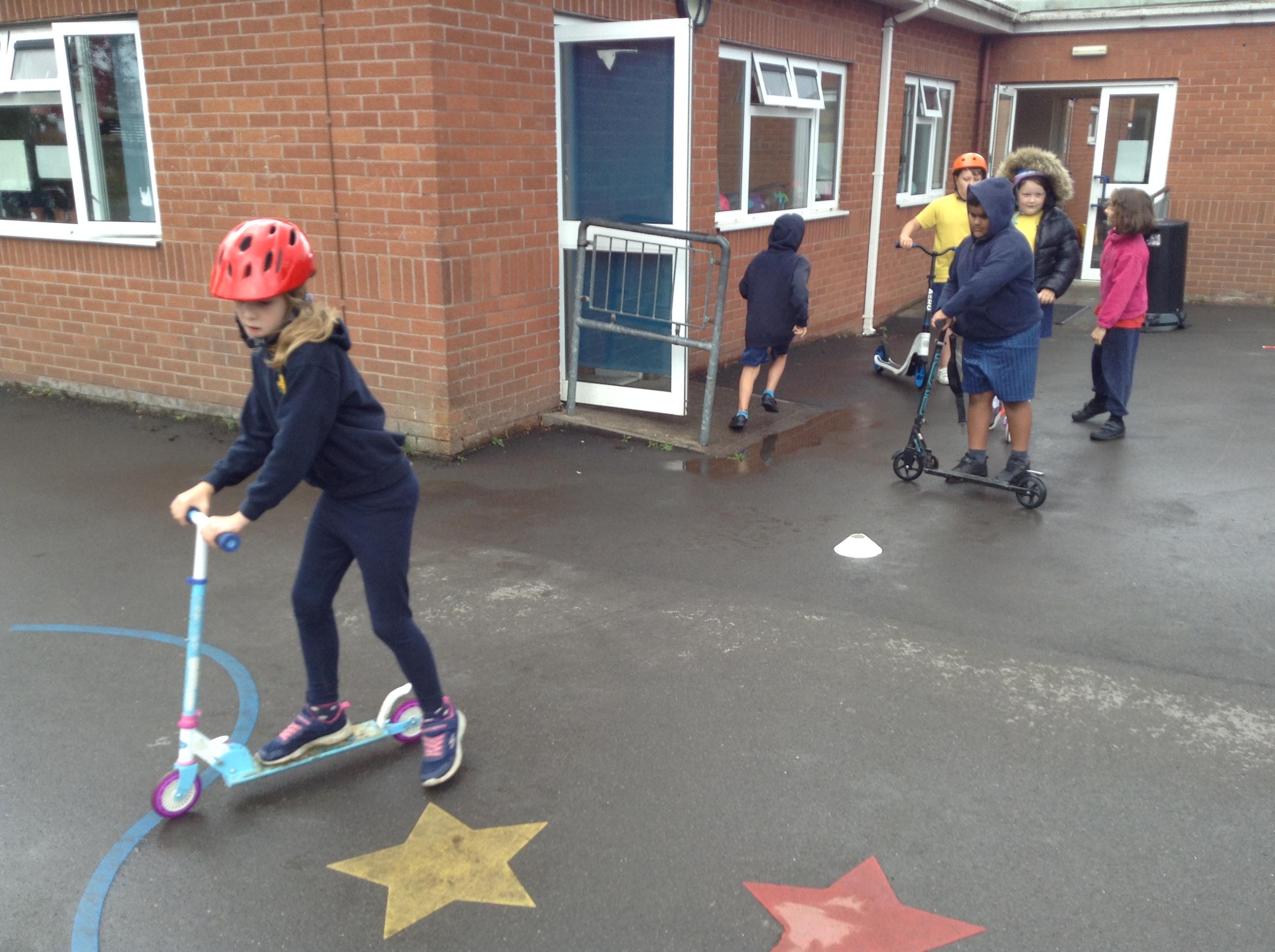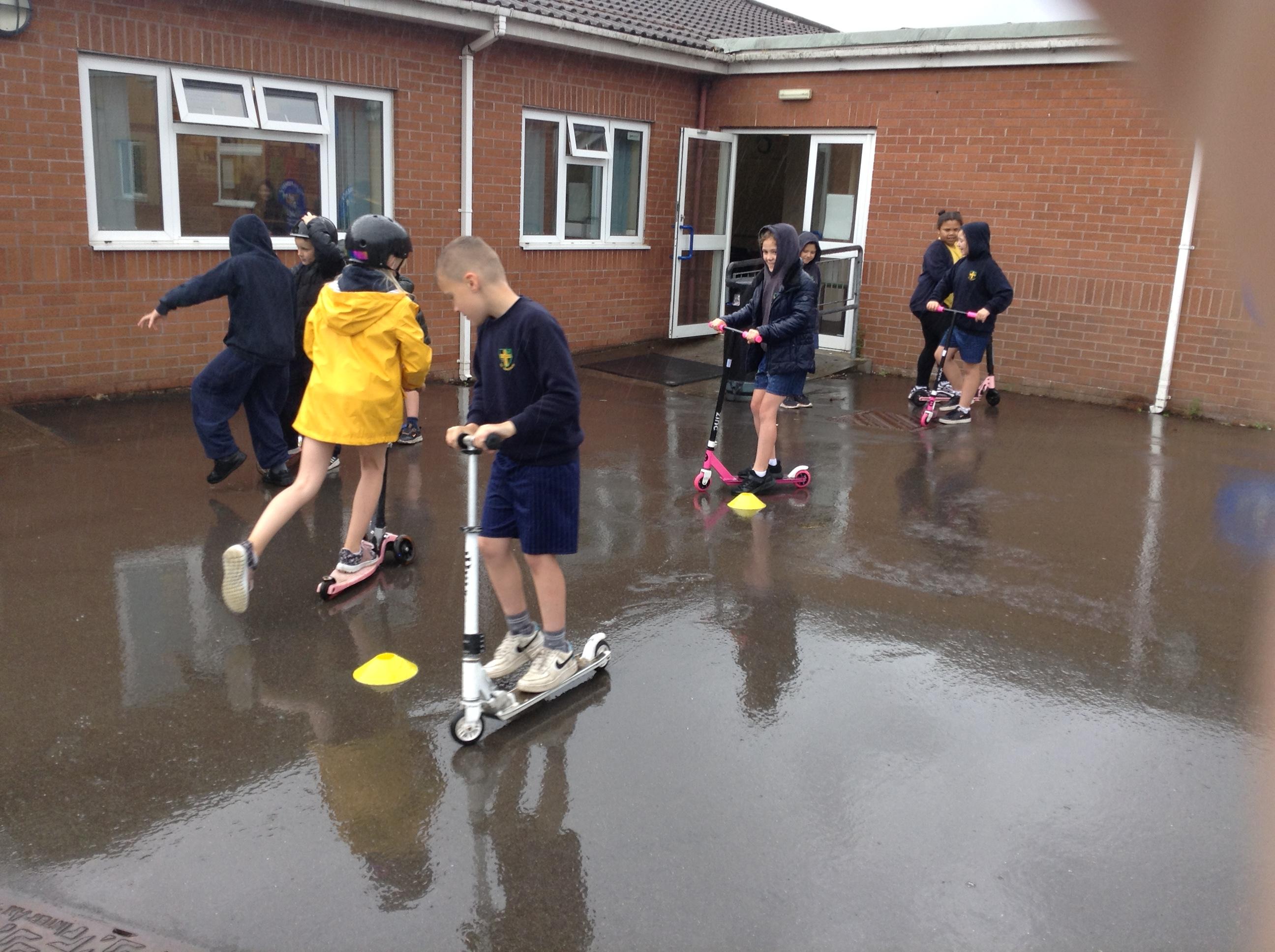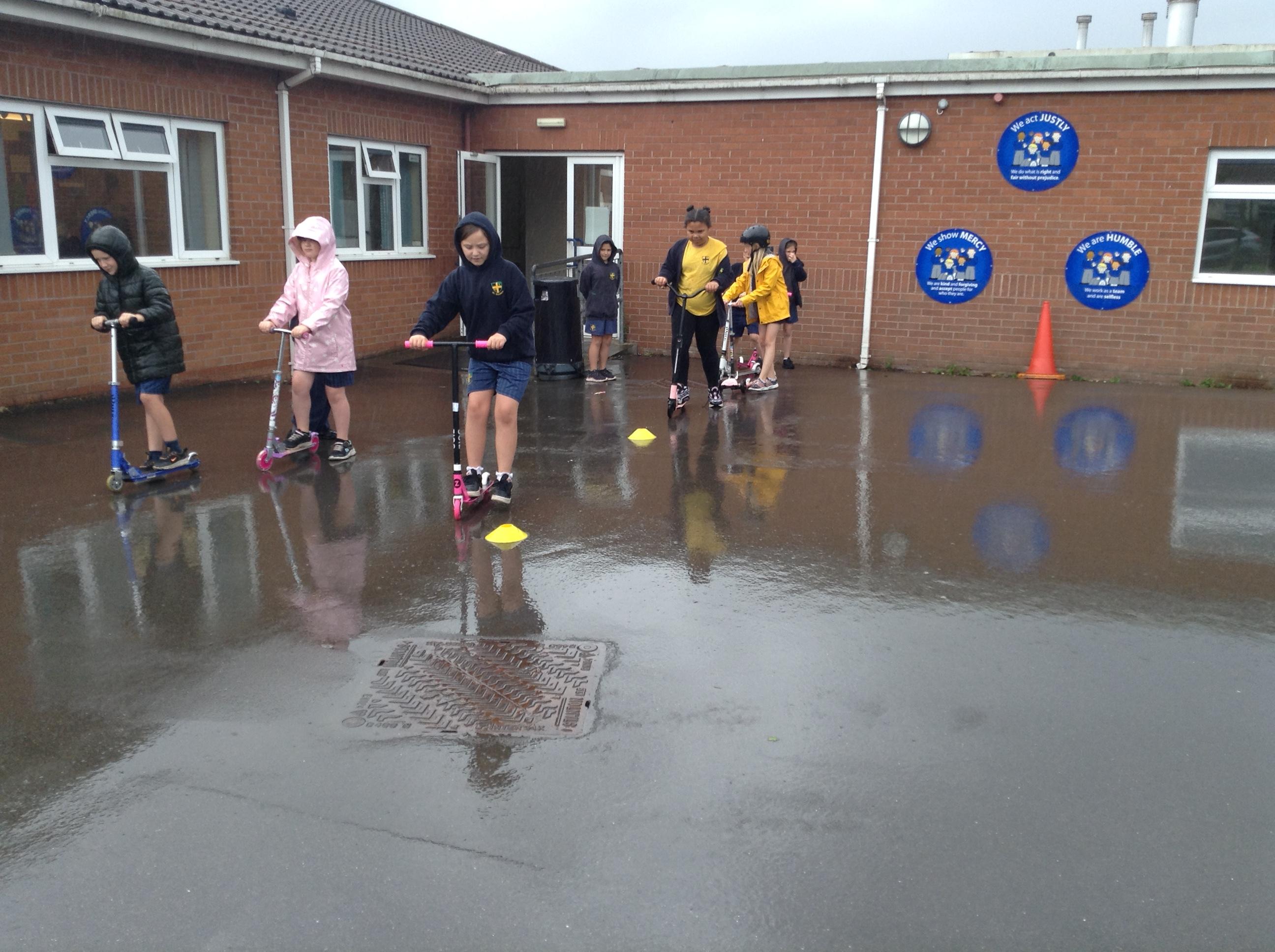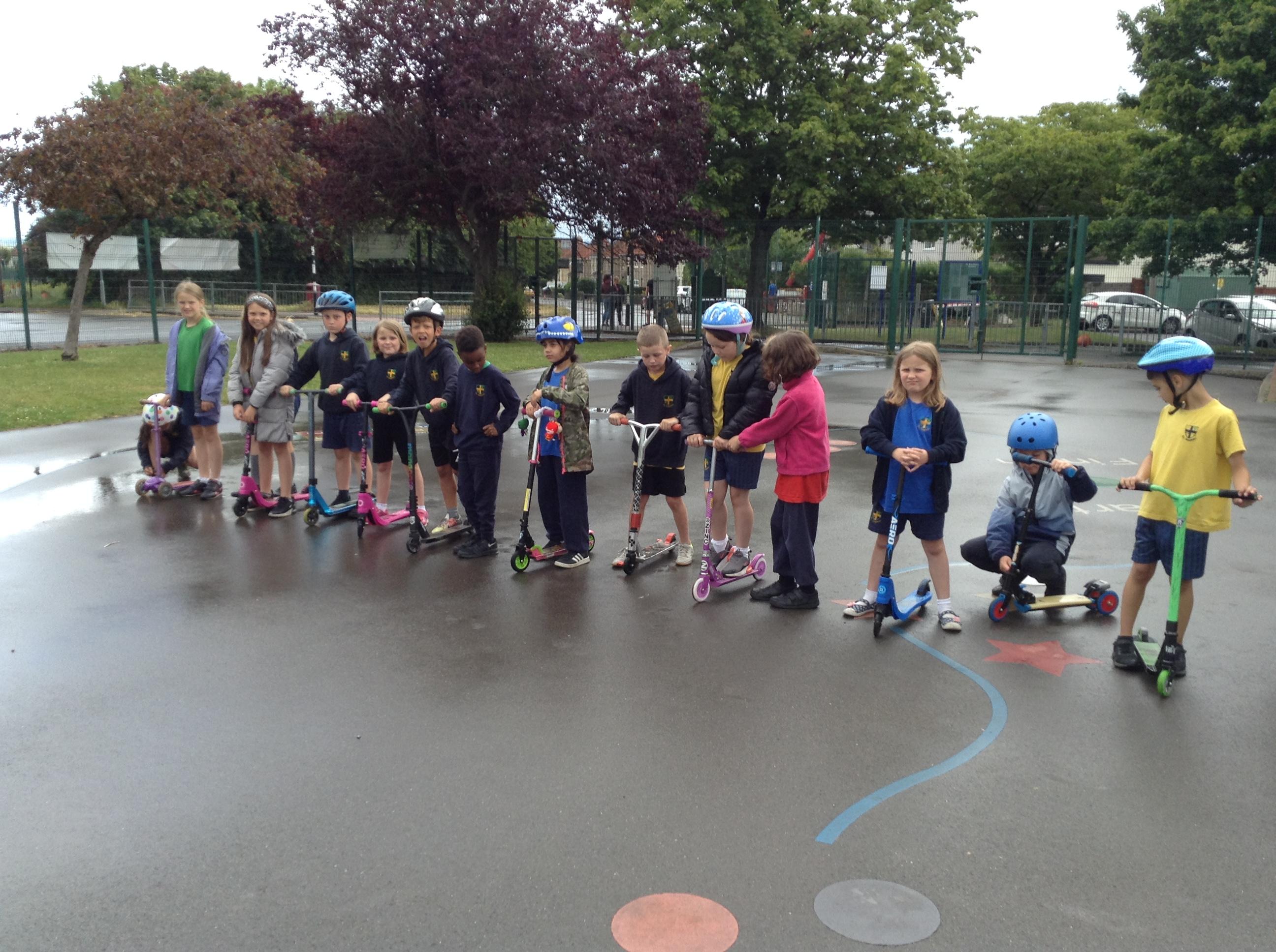 This term, we were given some training on how to properly use our scooters. As well as a theory lesson in the classroom where we learned all about how to put a helmet on correctly, check the scooter is safe and learn where to scoot, we also had a practical lesson outside. Even though it was very wet and rainy, it didn't stop us from putting the theory into practice to check over our scooters, test the brakes to stop before we hit Miss Porter and turn corners using the brakes to help us go steady. It was great fun and we thought it was really good to learn how to do this in all weathers!