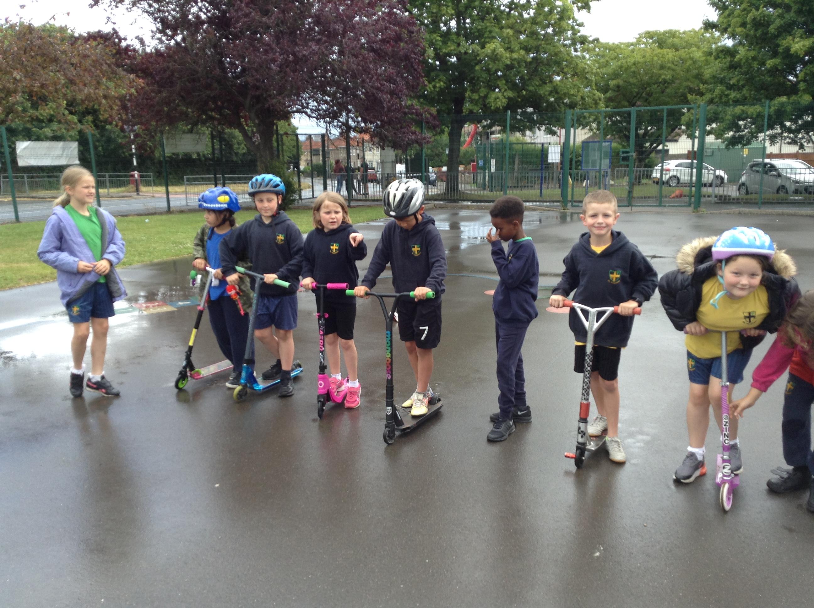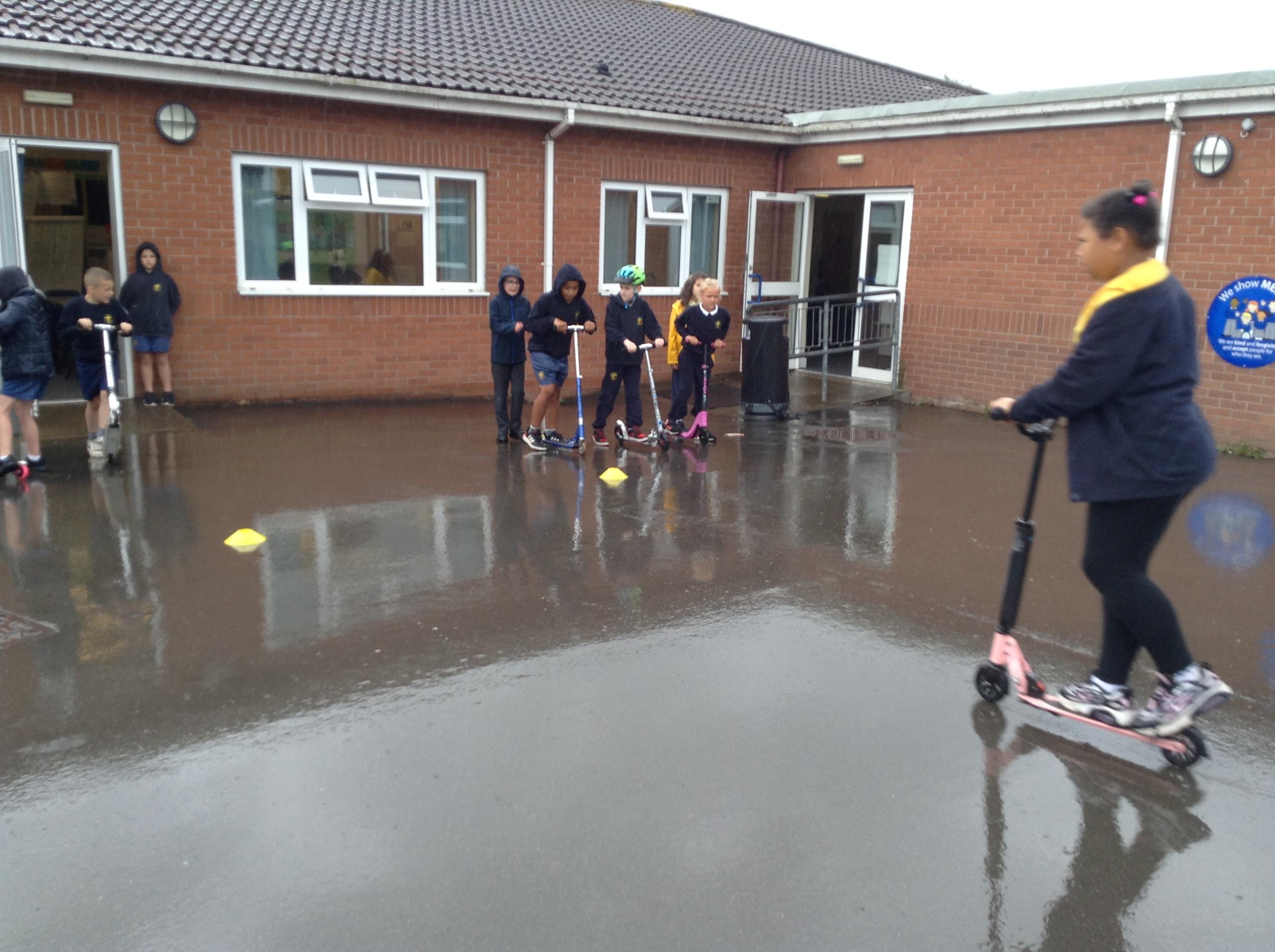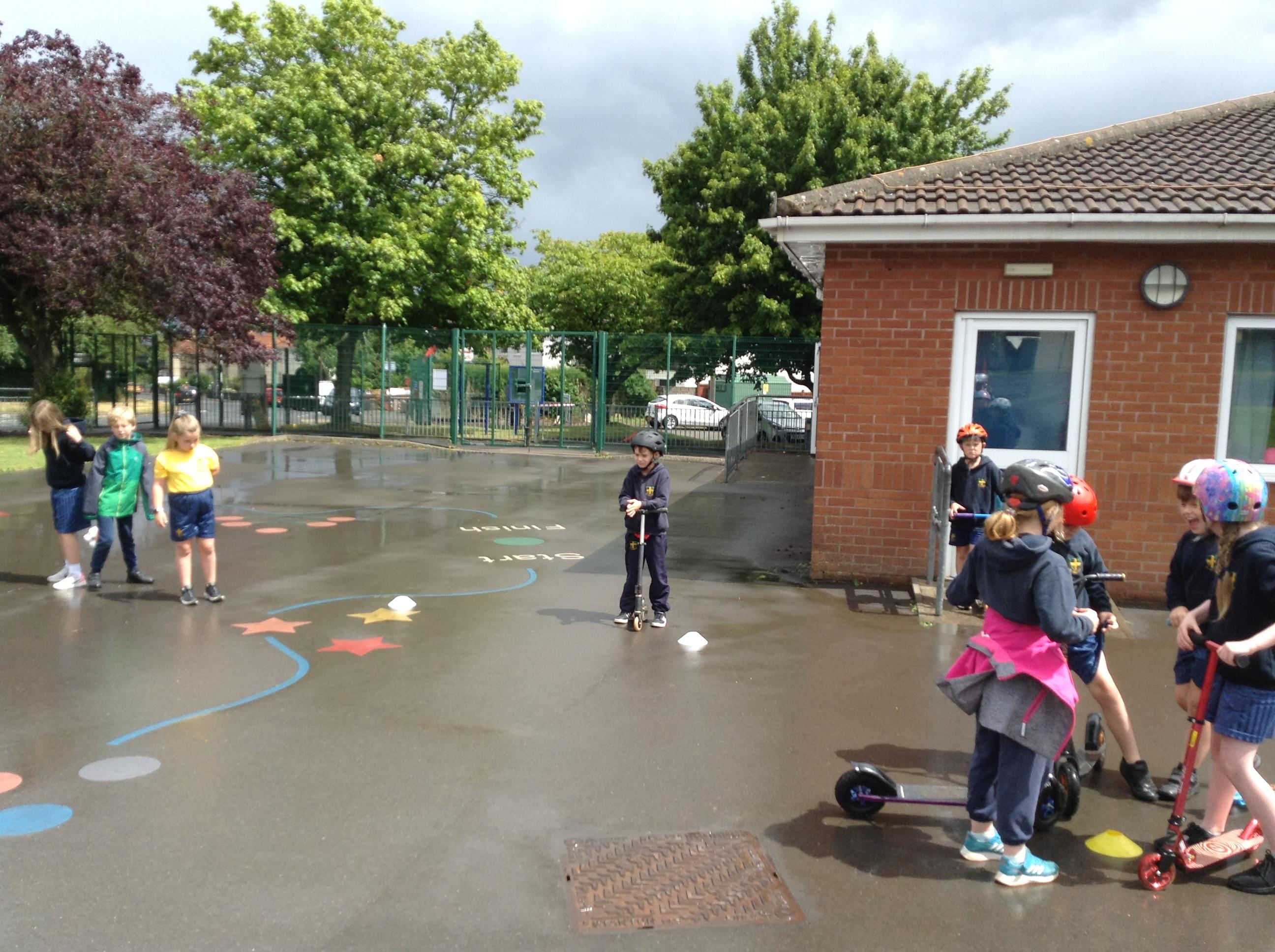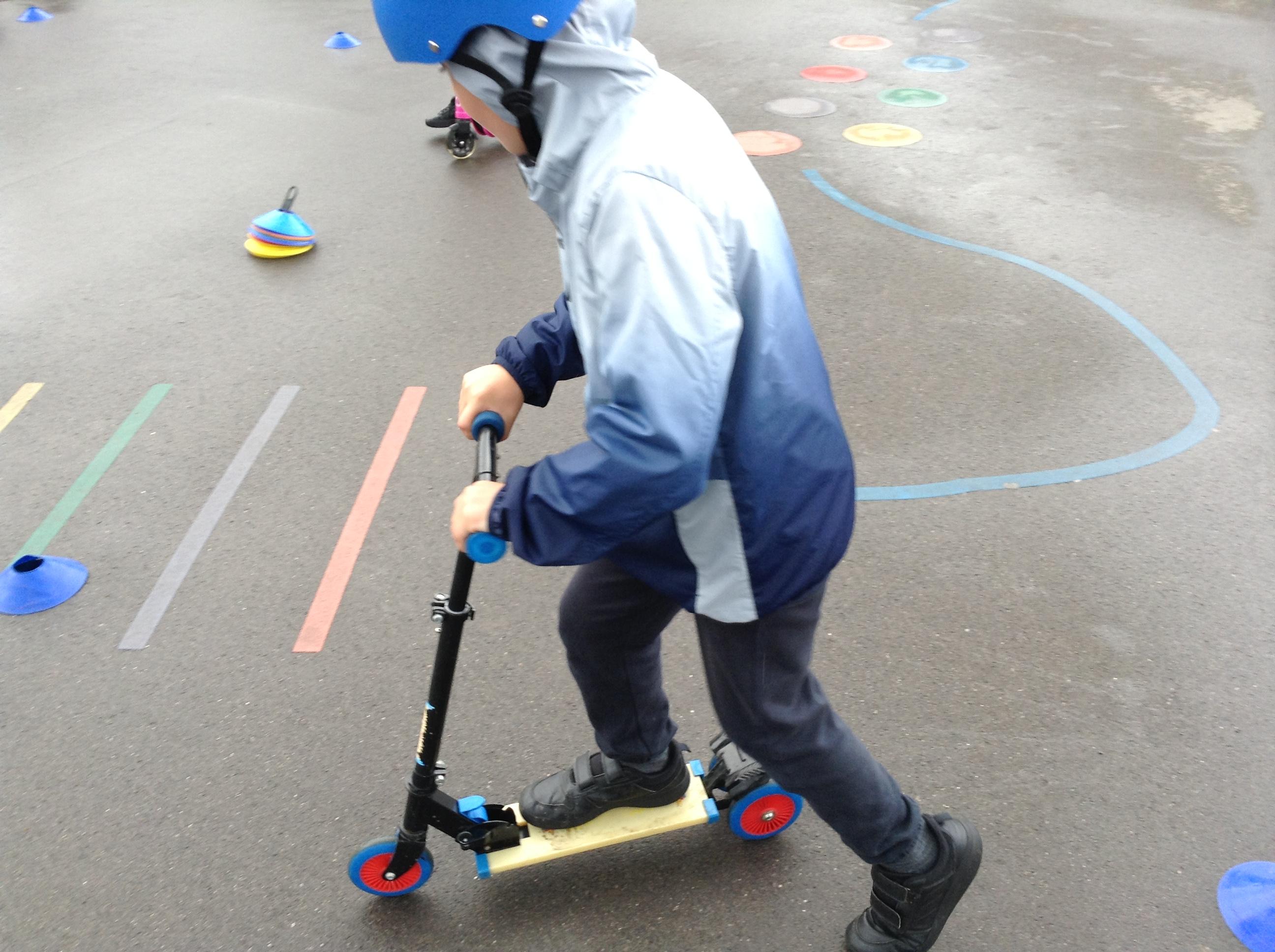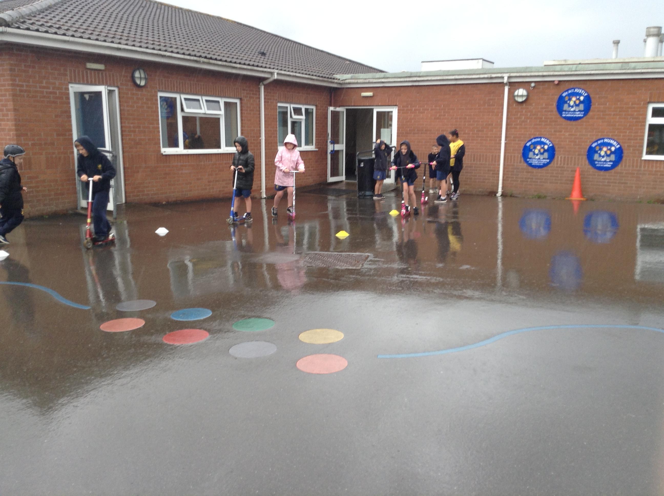 This term, we were given some training on how to properly use our scooters. As well as a theory lesson in the classroom where we learned all about how to put a helmet on correctly, check the scooter is safe and learn where to scoot, we also had a practical lesson outside. Even though it was very wet and rainy, it didn't stop us from putting the theory into practice to check over our scooters, test the brakes to stop before we hit Miss Porter and turn corners using the brakes to help us go steady. It was great fun and we thought it was really good to learn how to do this in all weathers!