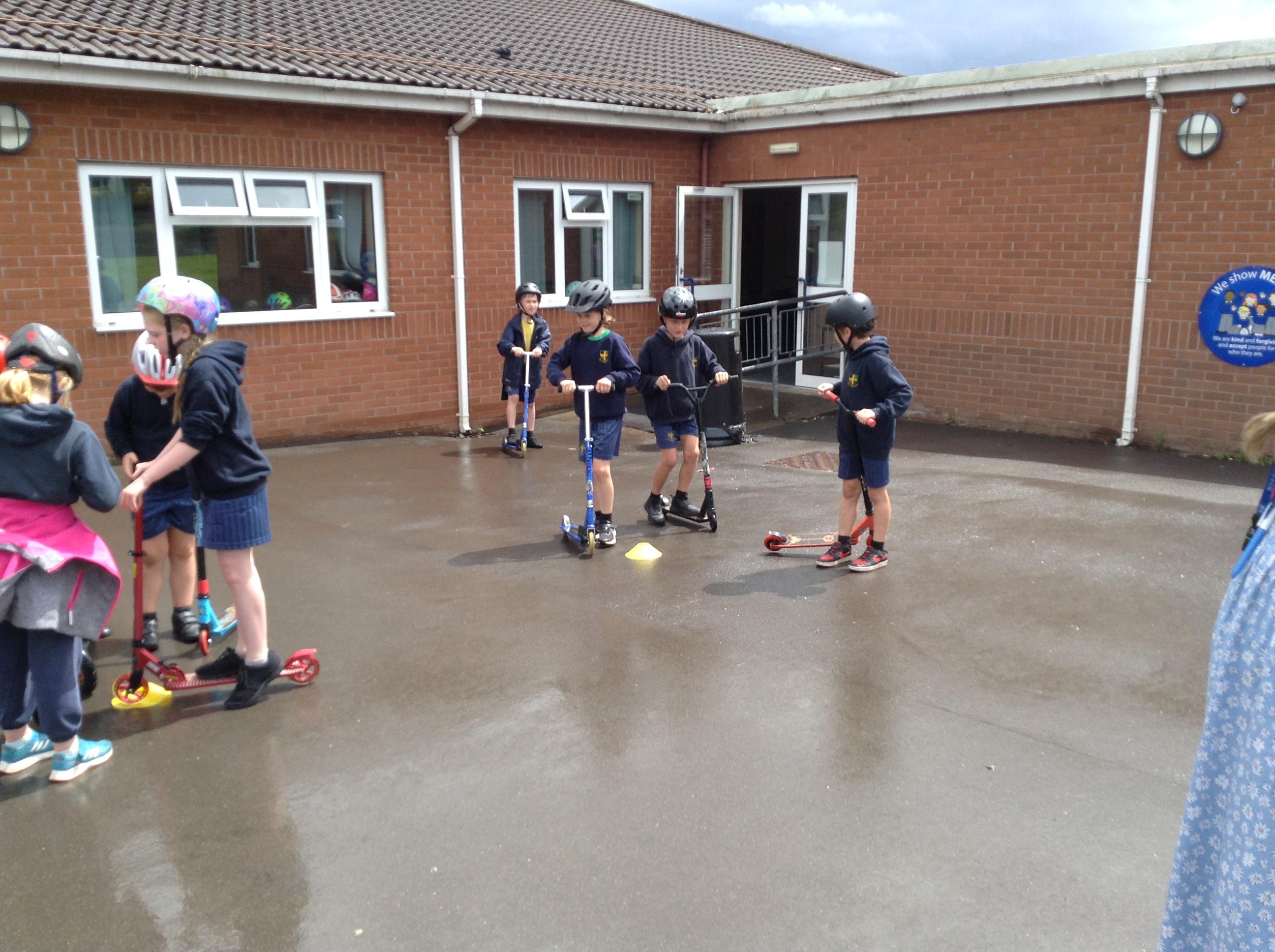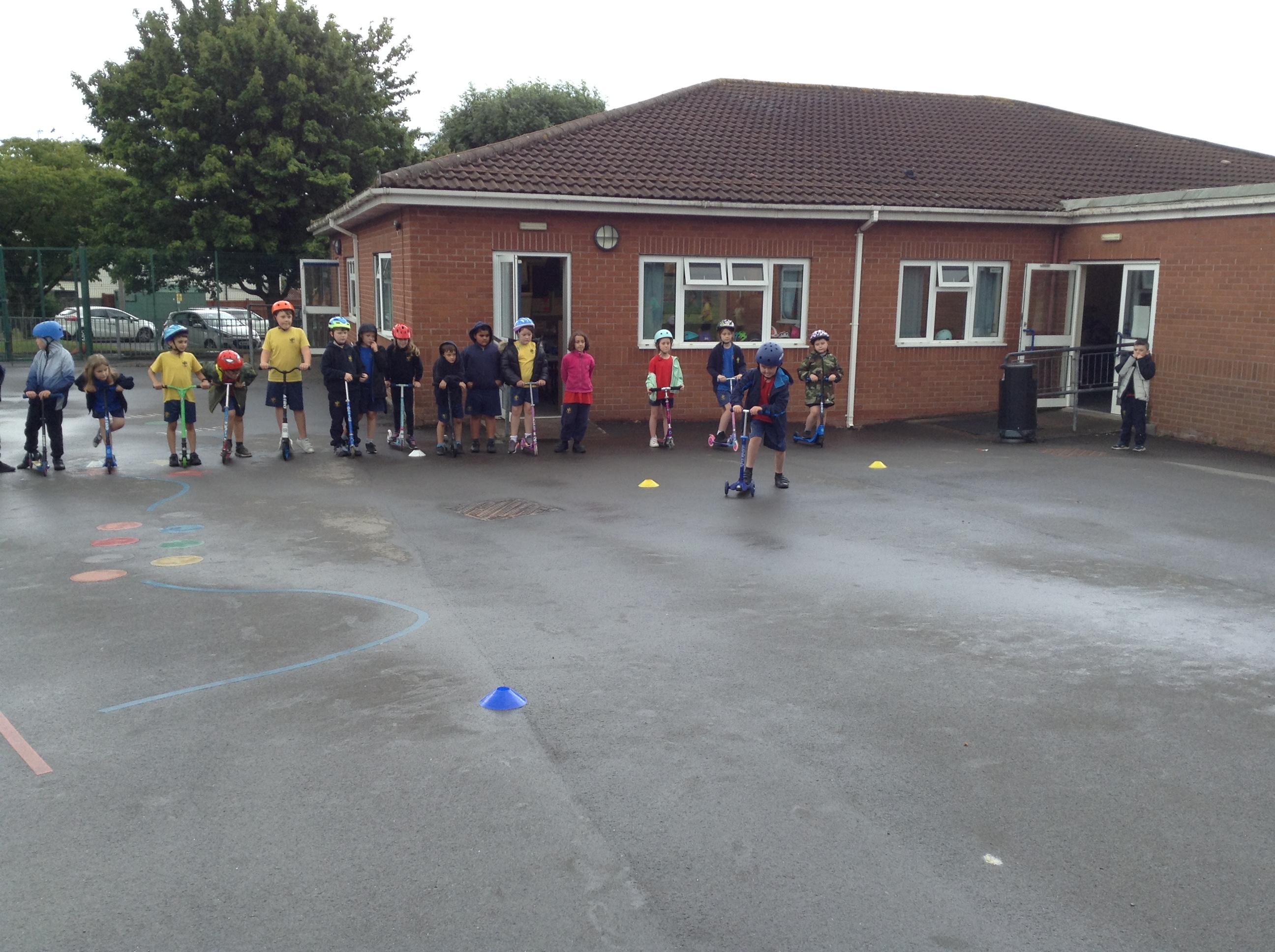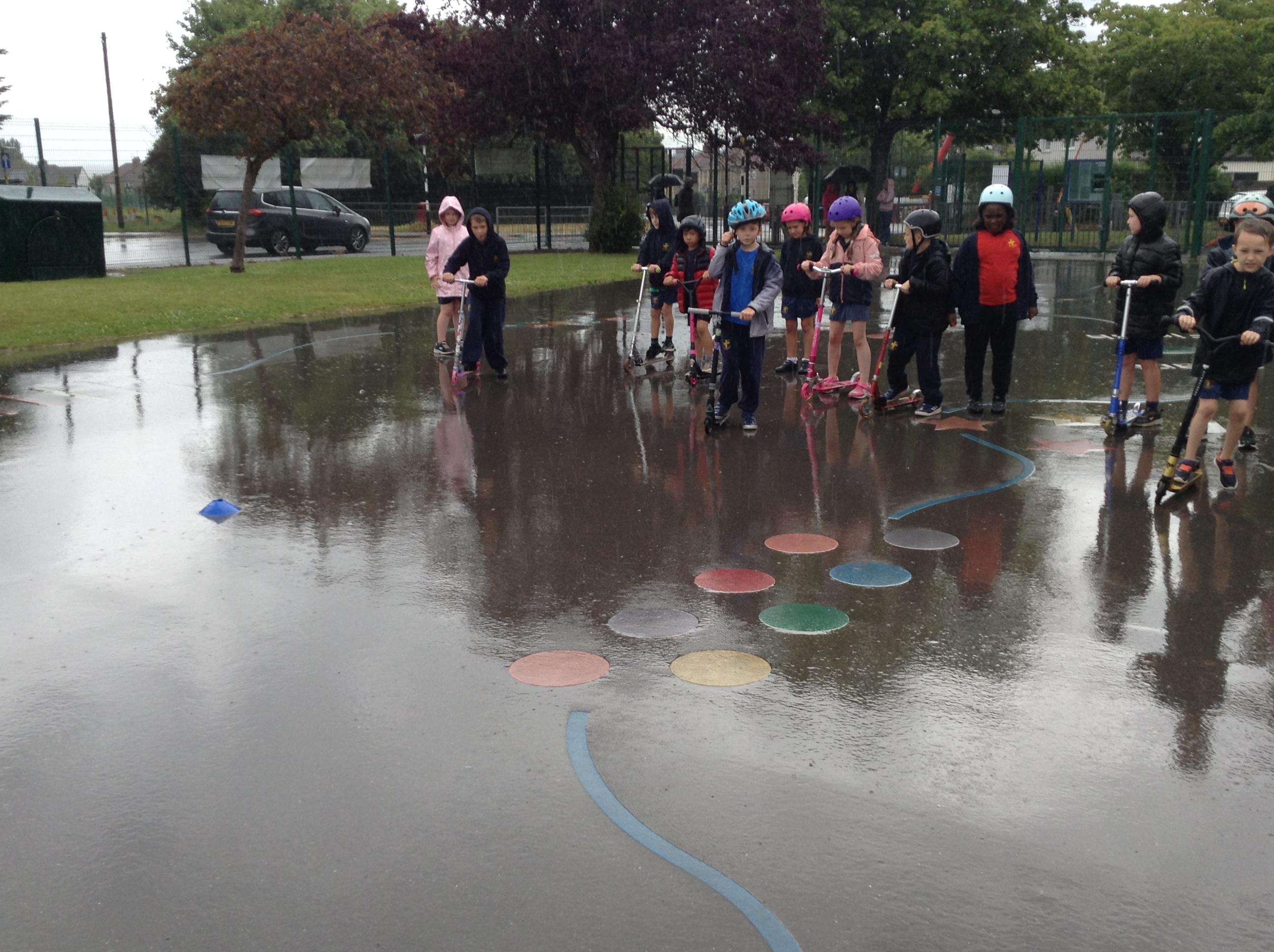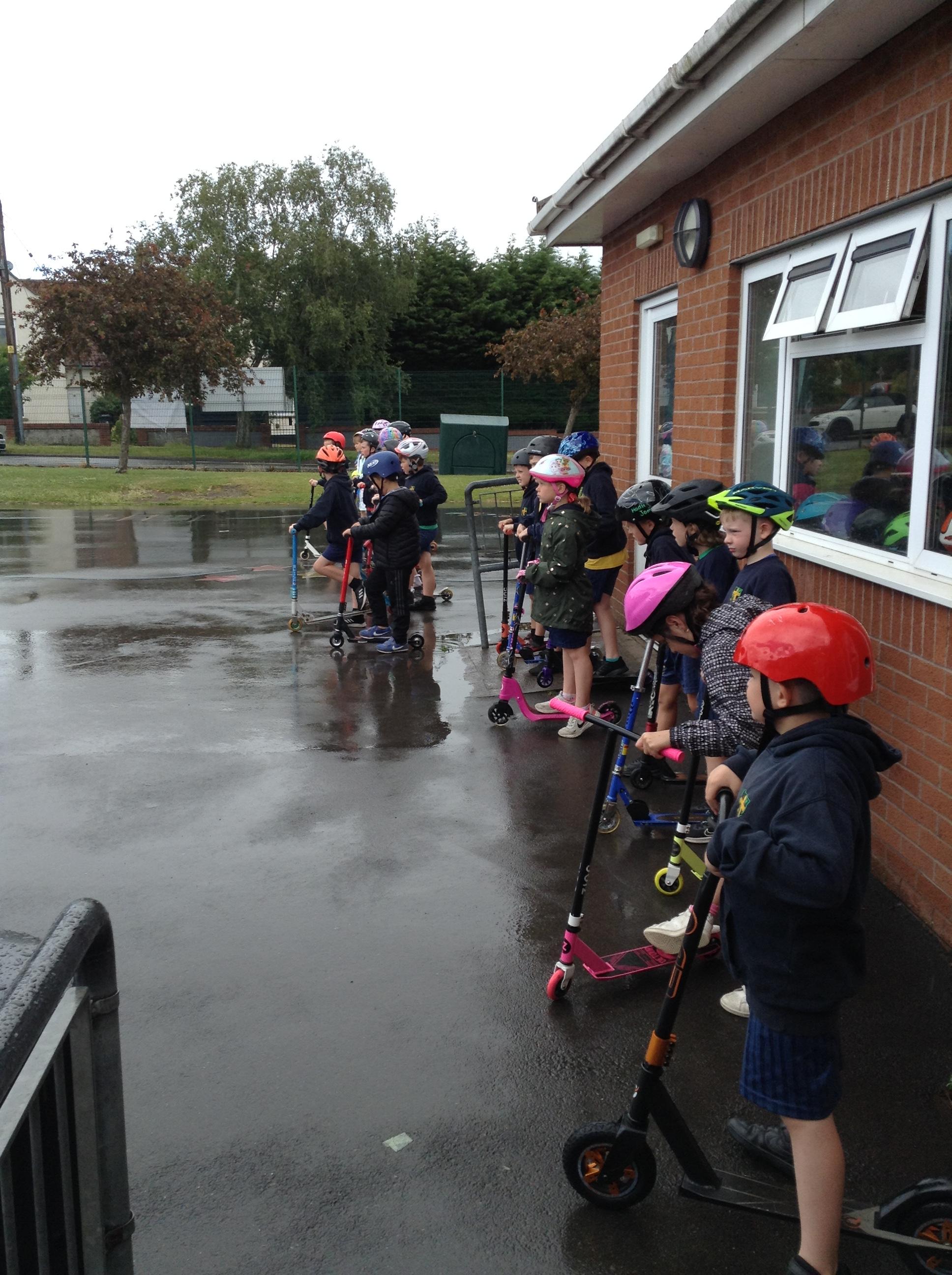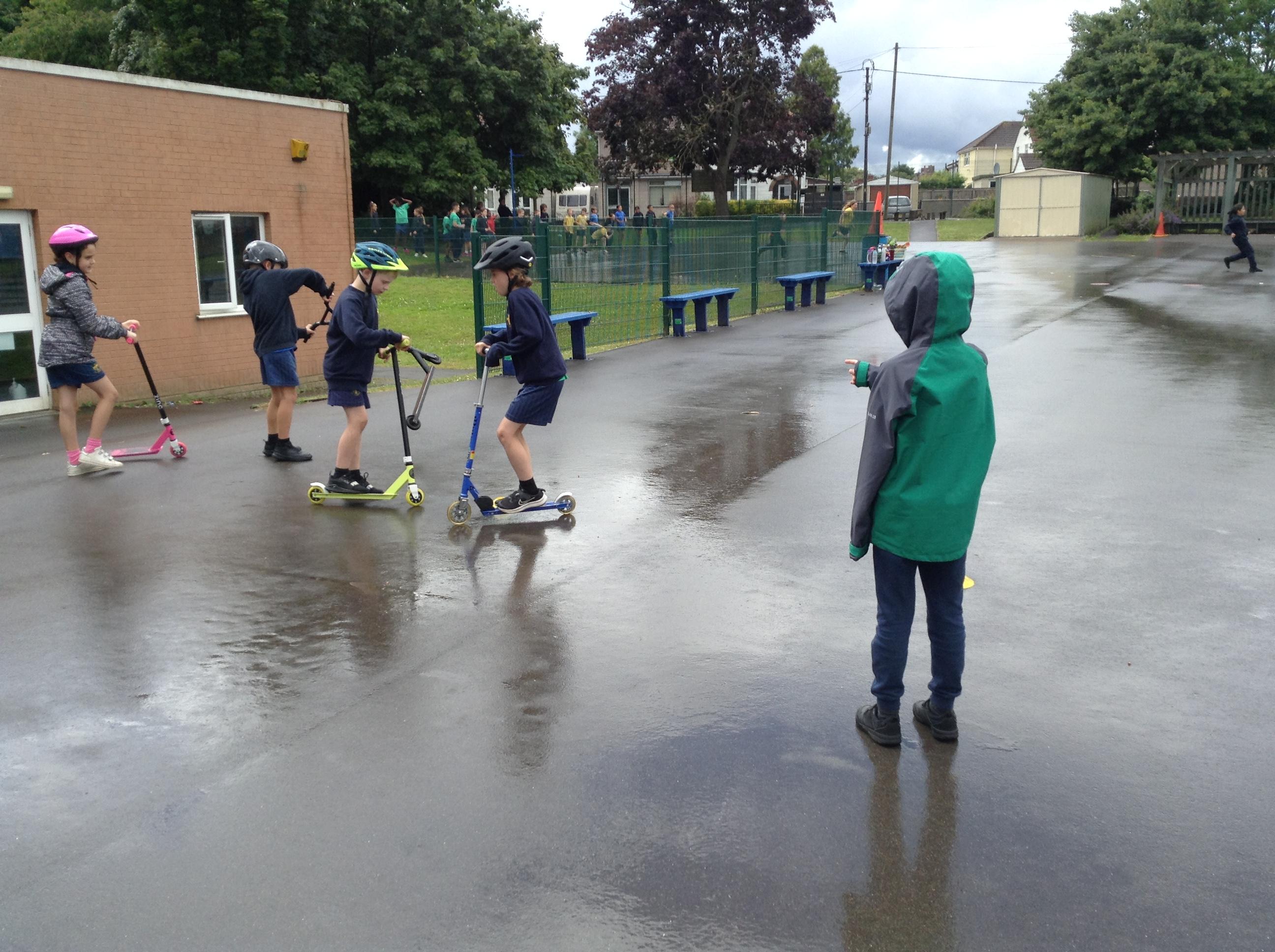 This term, we were given some training on how to properly use our scooters. As well as a theory lesson in the classroom where we learned all about how to put a helmet on correctly, check the scooter is safe and learn where to scoot, we also had a practical lesson outside. Even though it was very wet and rainy, it didn't stop us from putting the theory into practice to check over our scooters, test the brakes to stop before we hit Miss Porter and turn corners using the brakes to help us go steady. It was great fun and we thought it was really good to learn how to do this in all weathers!