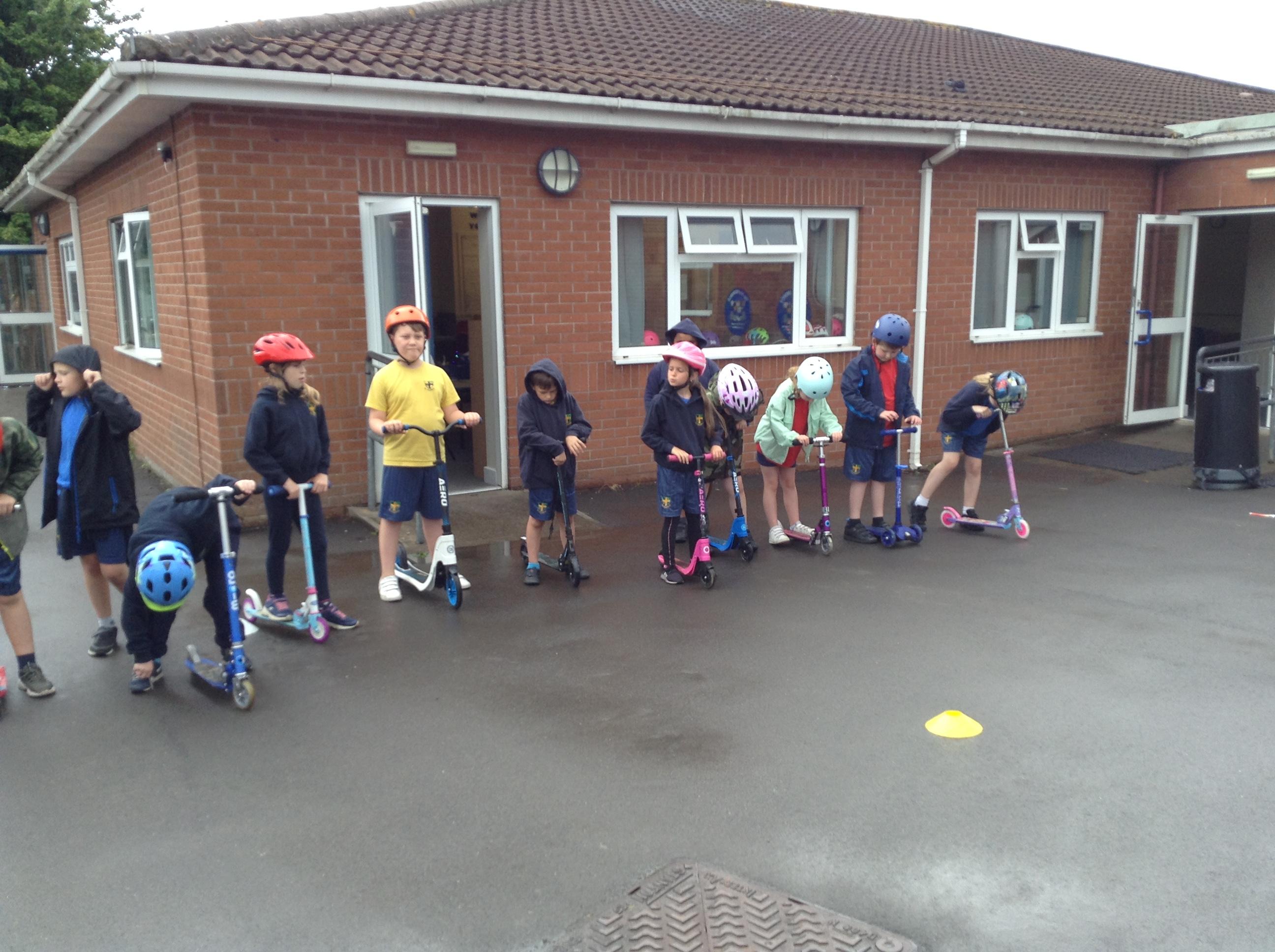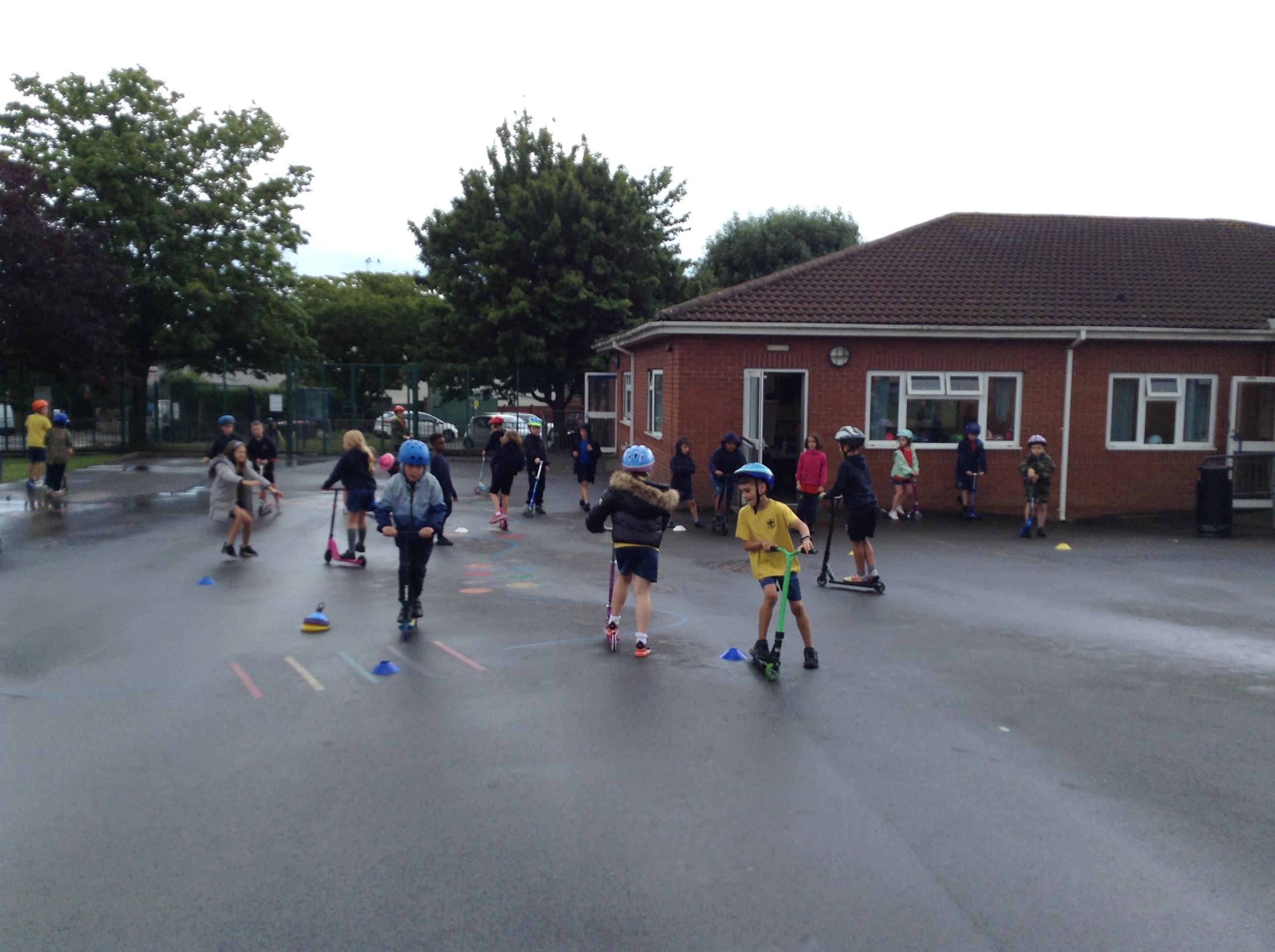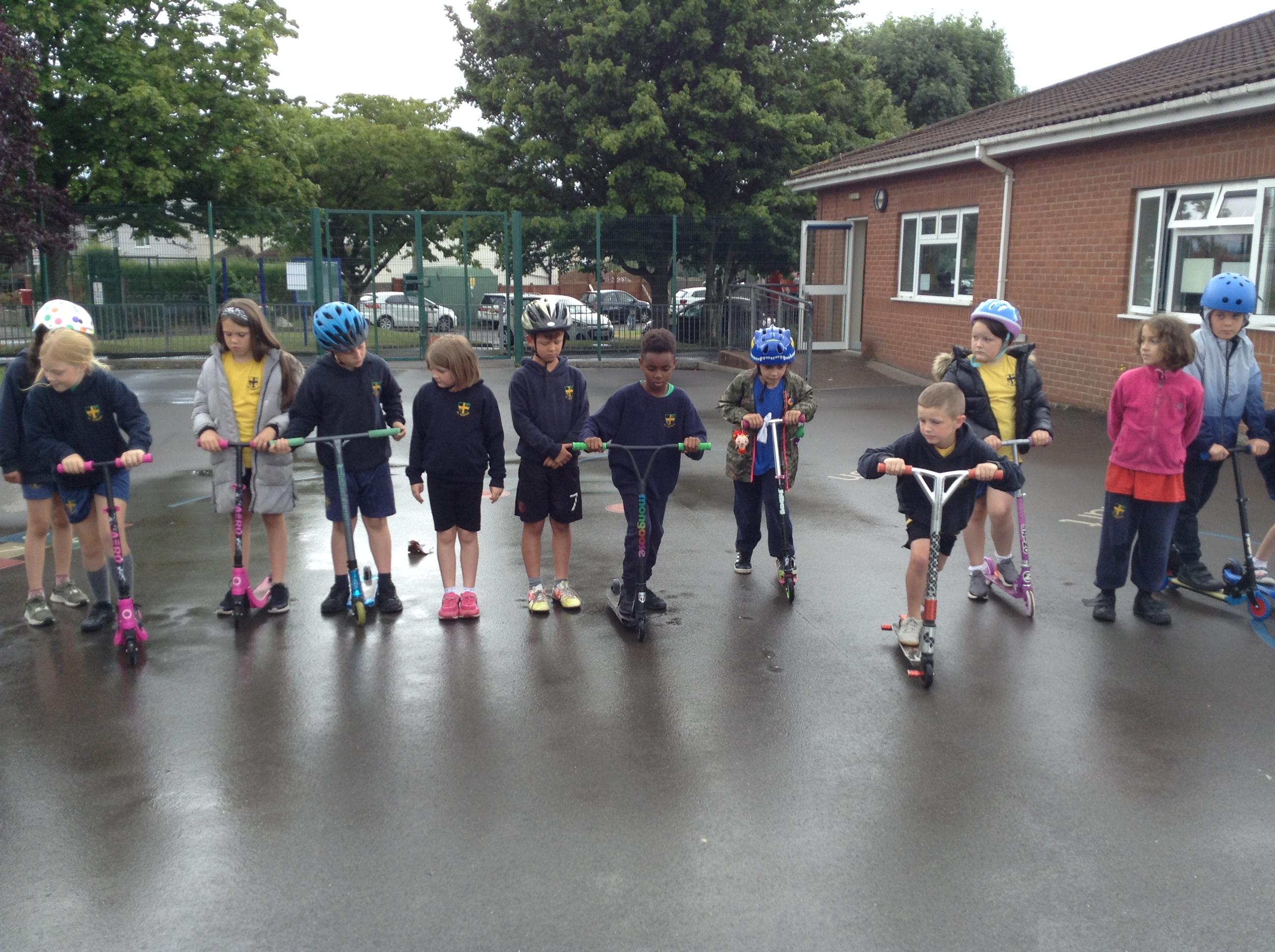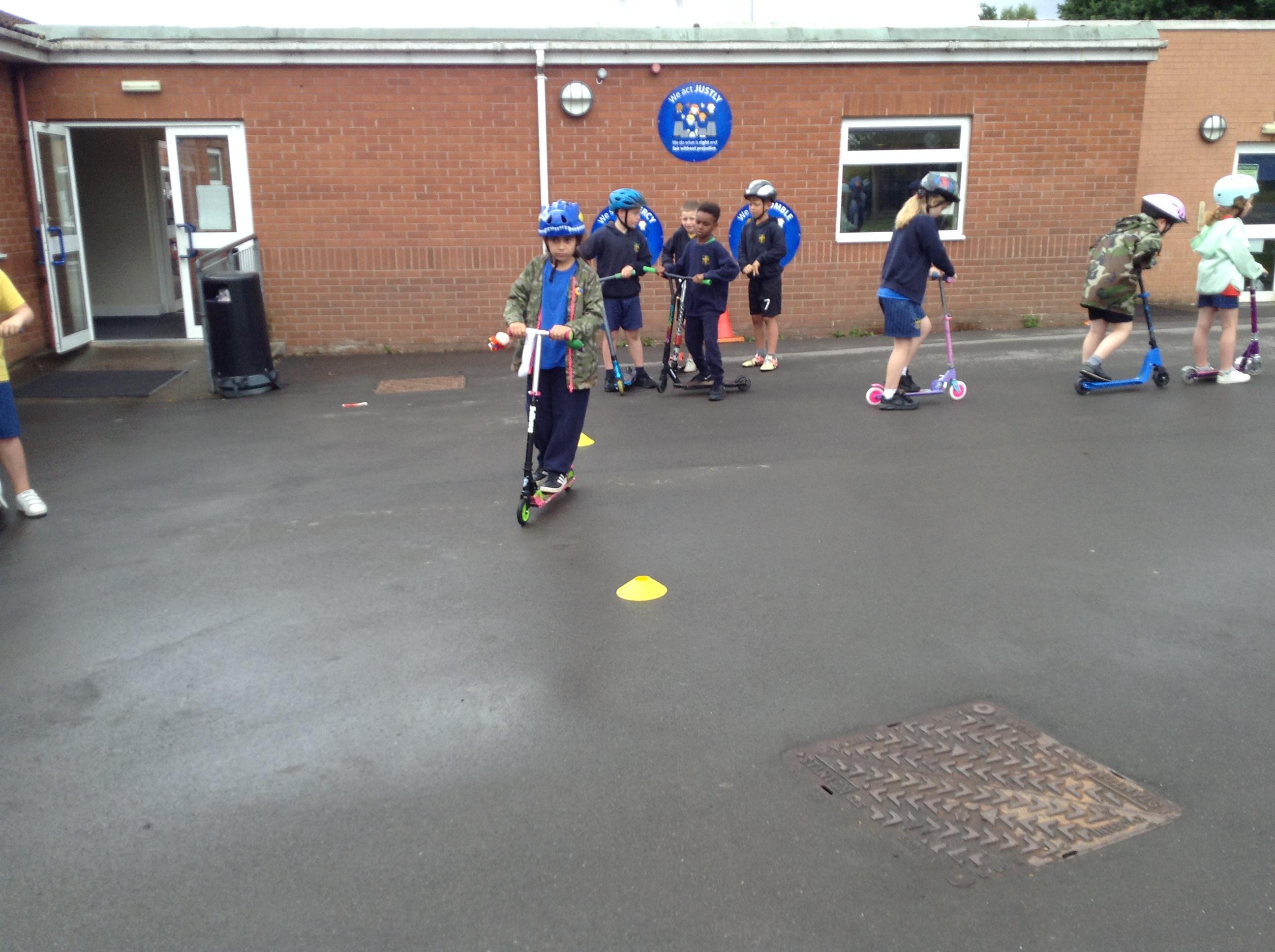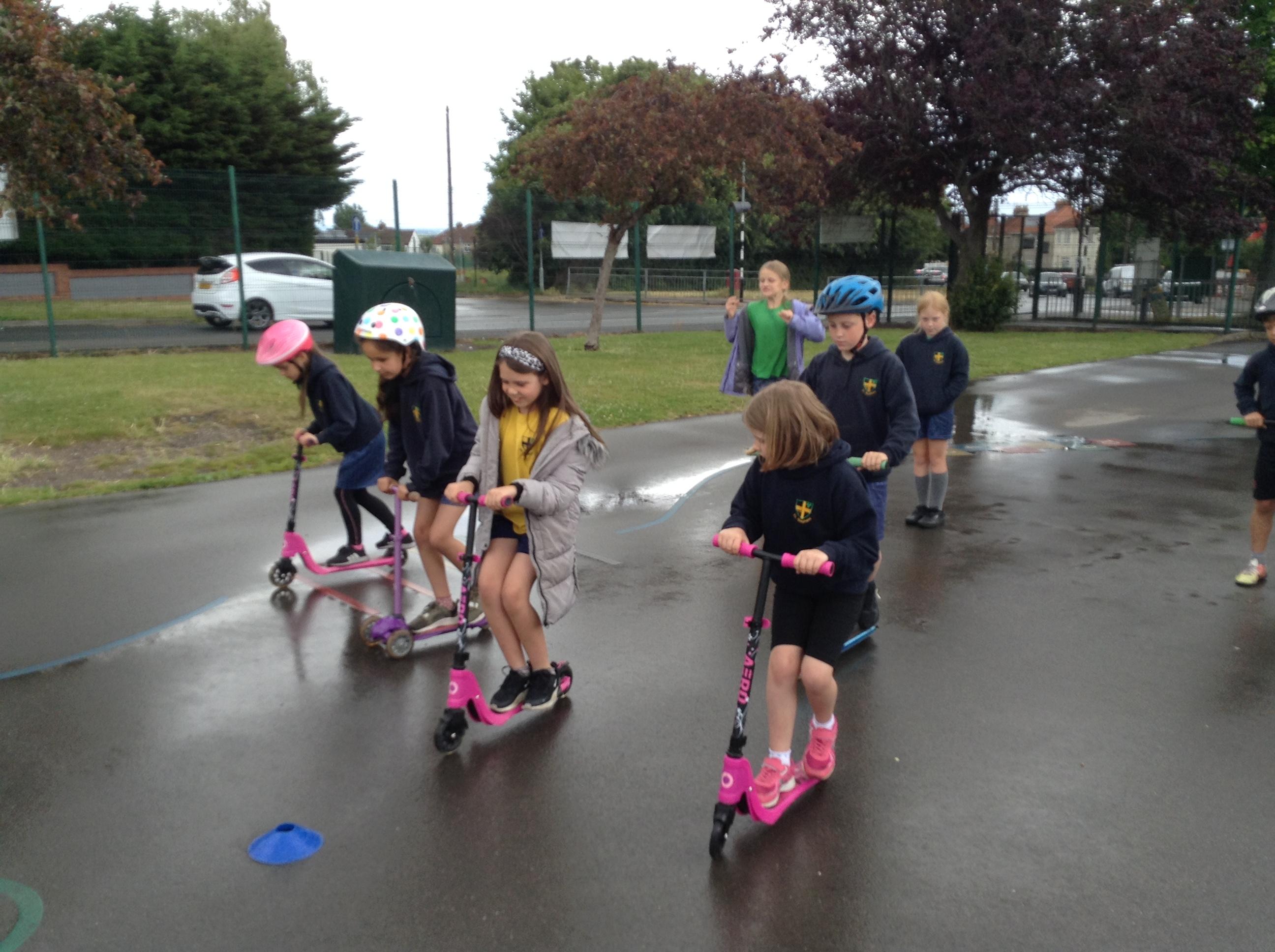 This term, we were given some training on how to properly use our scooters. As well as a theory lesson in the classroom where we learned all about how to put a helmet on correctly, check the scooter is safe and learn where to scoot, we also had a practical lesson outside. Even though it was very wet and rainy, it didn't stop us from putting the theory into practice to check over our scooters, test the brakes to stop before we hit Miss Porter and turn corners using the brakes to help us go steady. It was great fun and we thought it was really good to learn how to do this in all weathers!