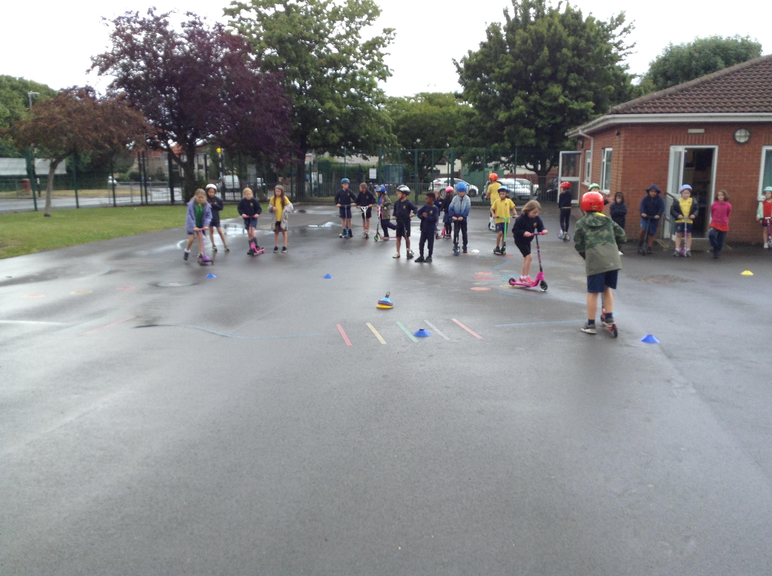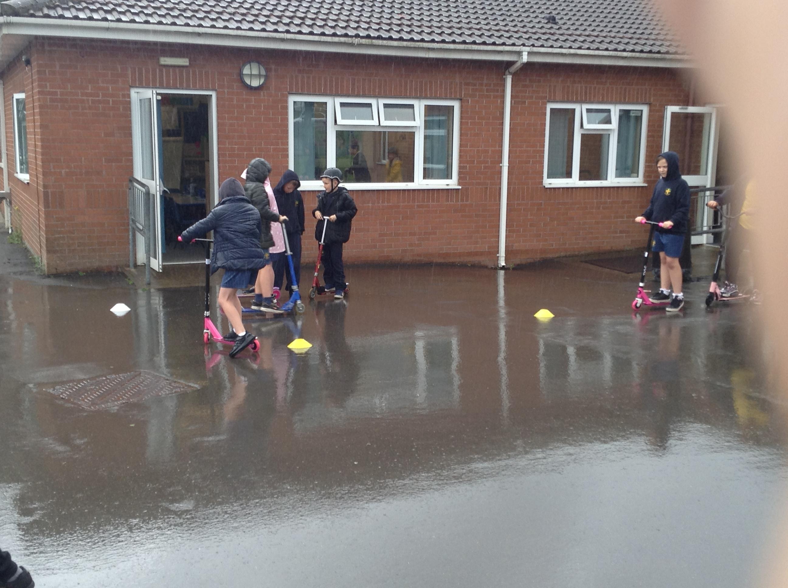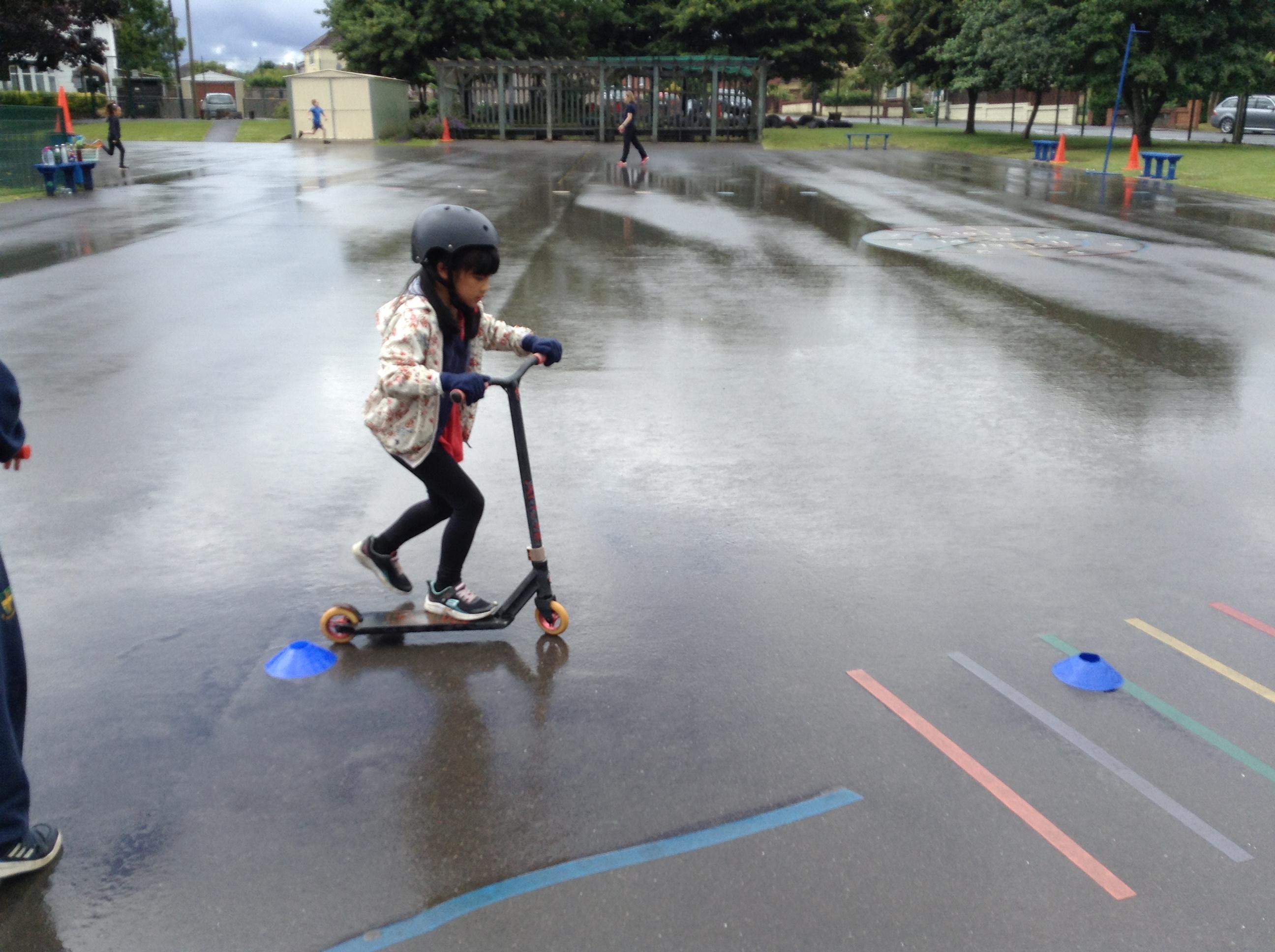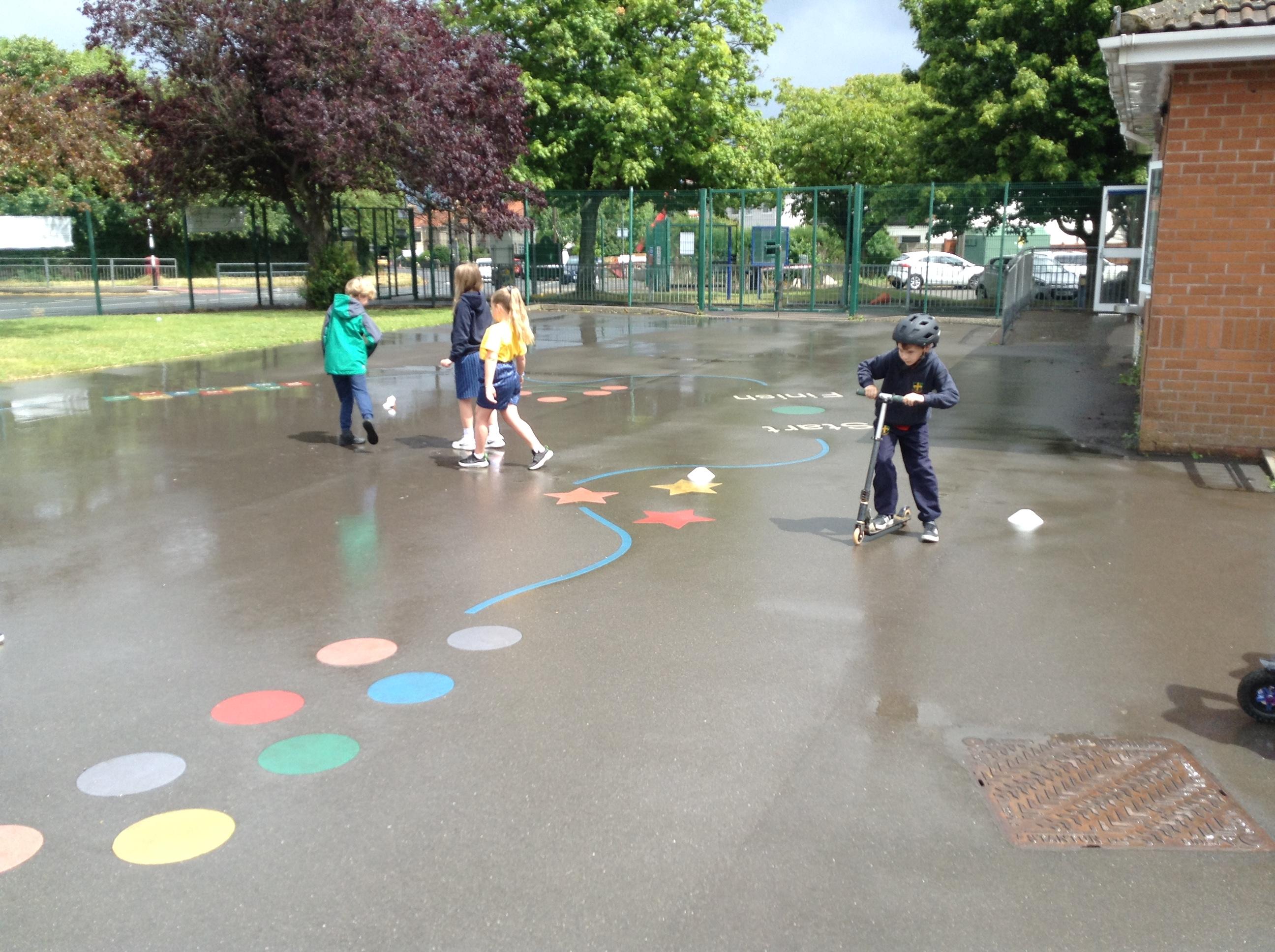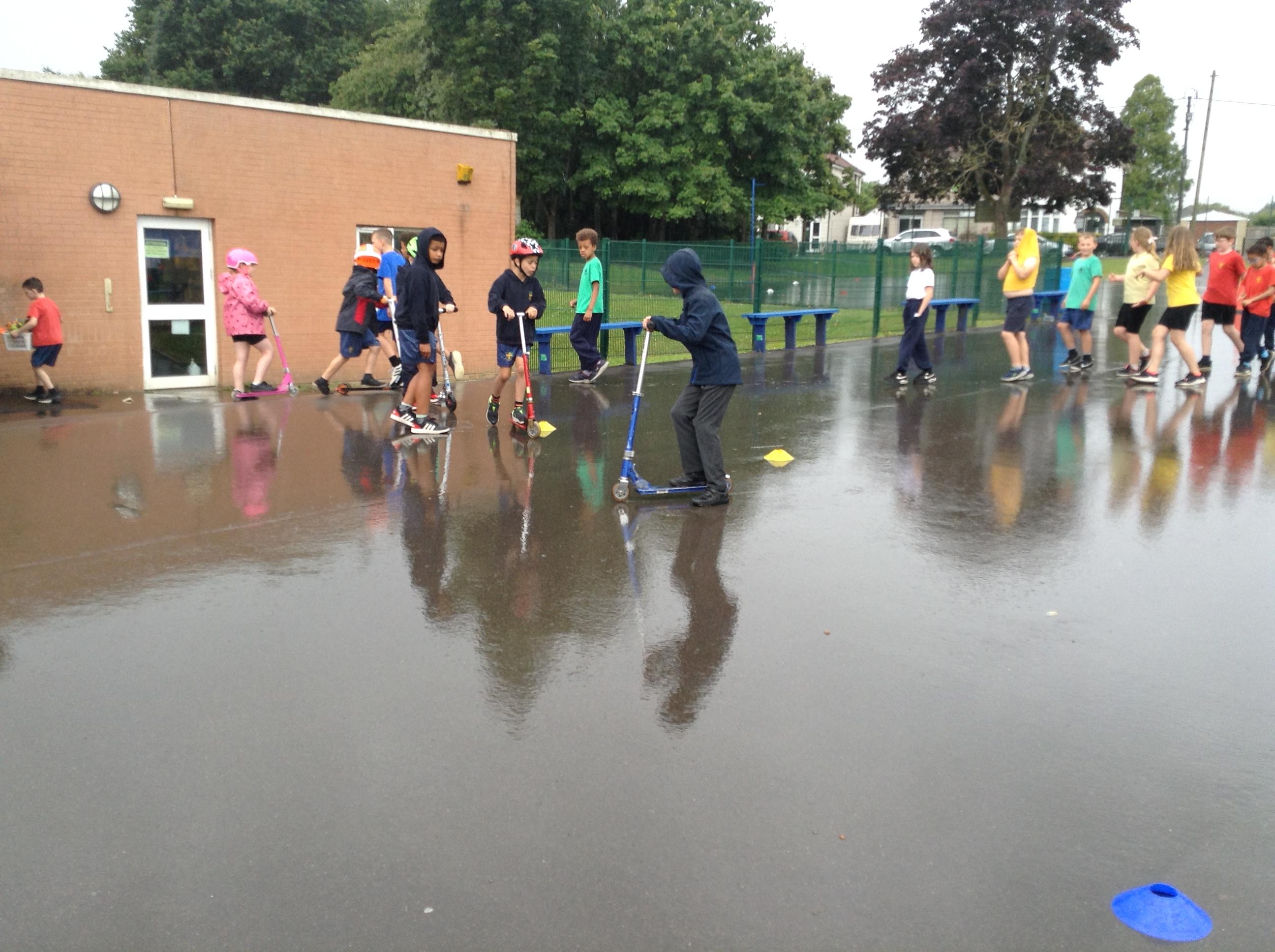 This term, we were given some training on how to properly use our scooters. As well as a theory lesson in the classroom where we learned all about how to put a helmet on correctly, check the scooter is safe and learn where to scoot, we also had a practical lesson outside. Even though it was very wet and rainy, it didn't stop us from putting the theory into practice to check over our scooters, test the brakes to stop before we hit Miss Porter and turn corners using the brakes to help us go steady. It was great fun and we thought it was really good to learn how to do this in all weathers!