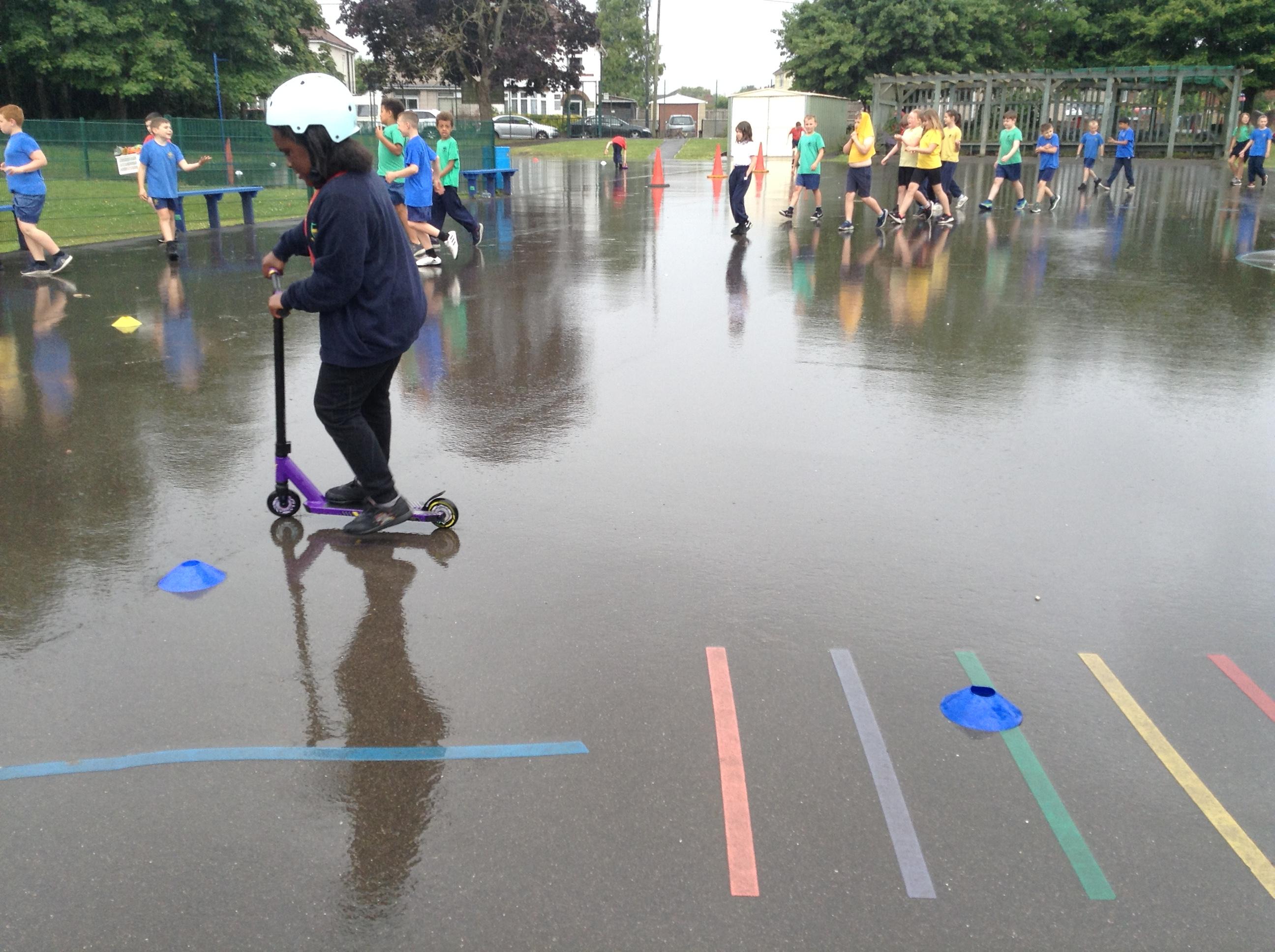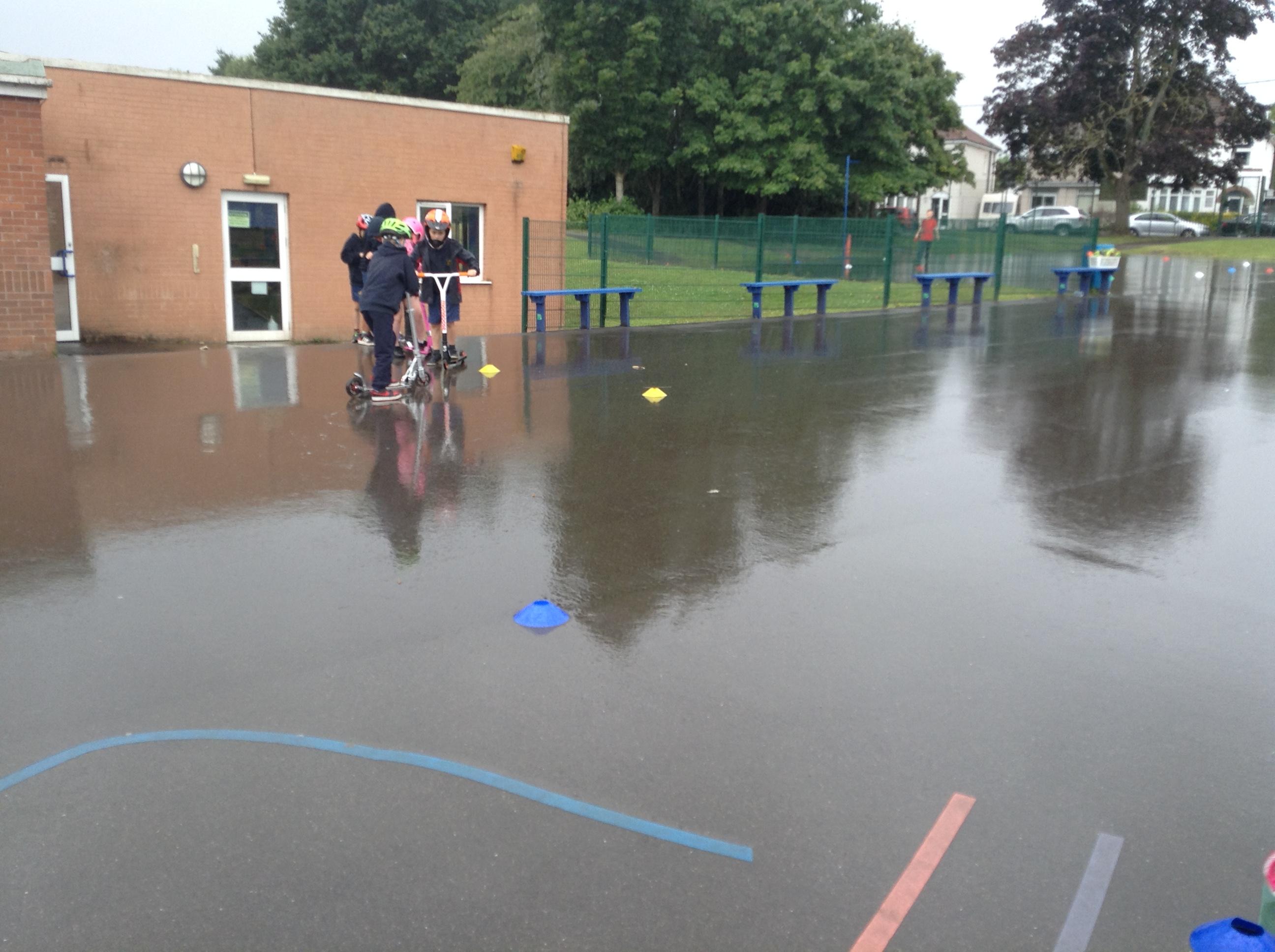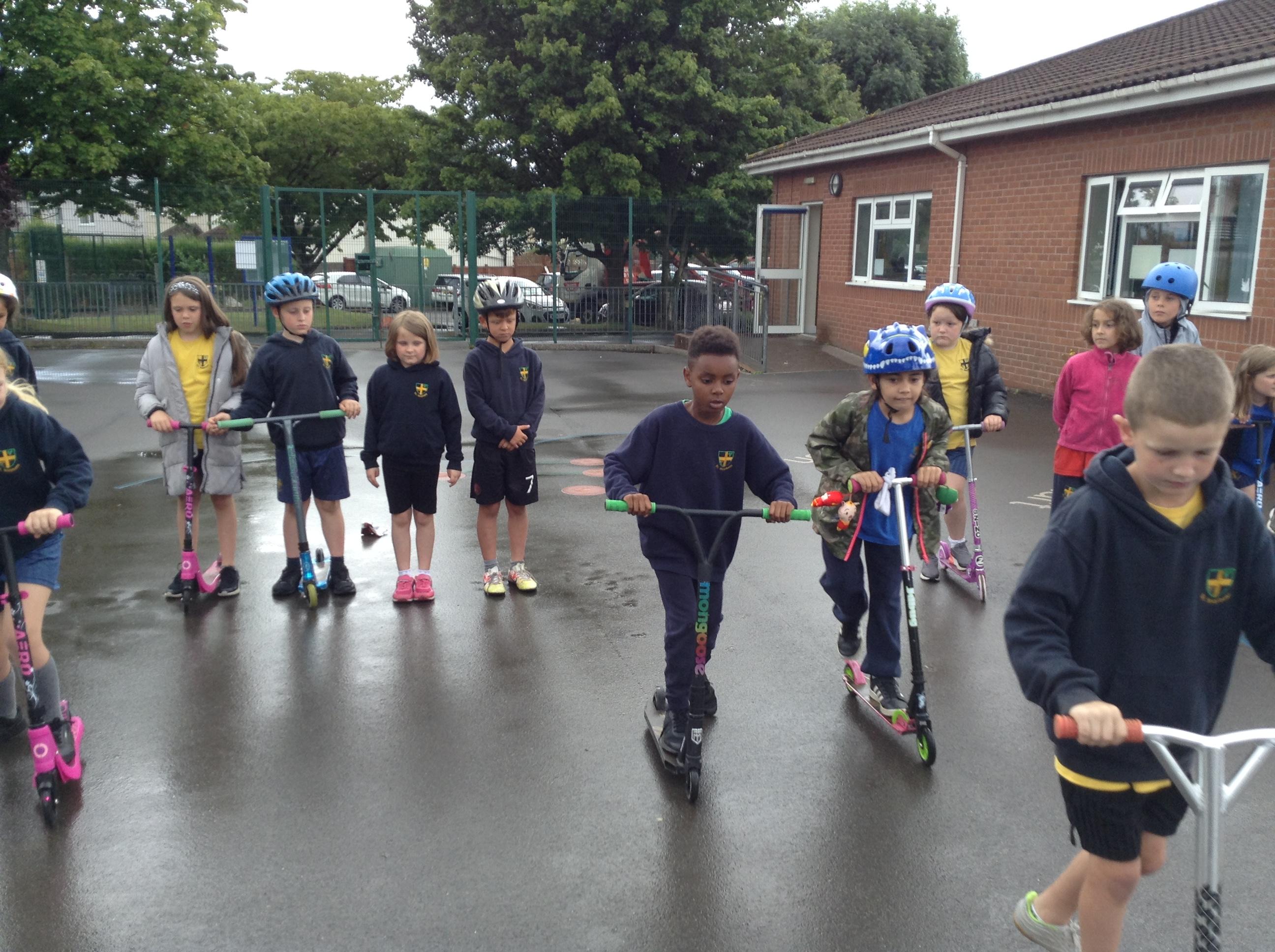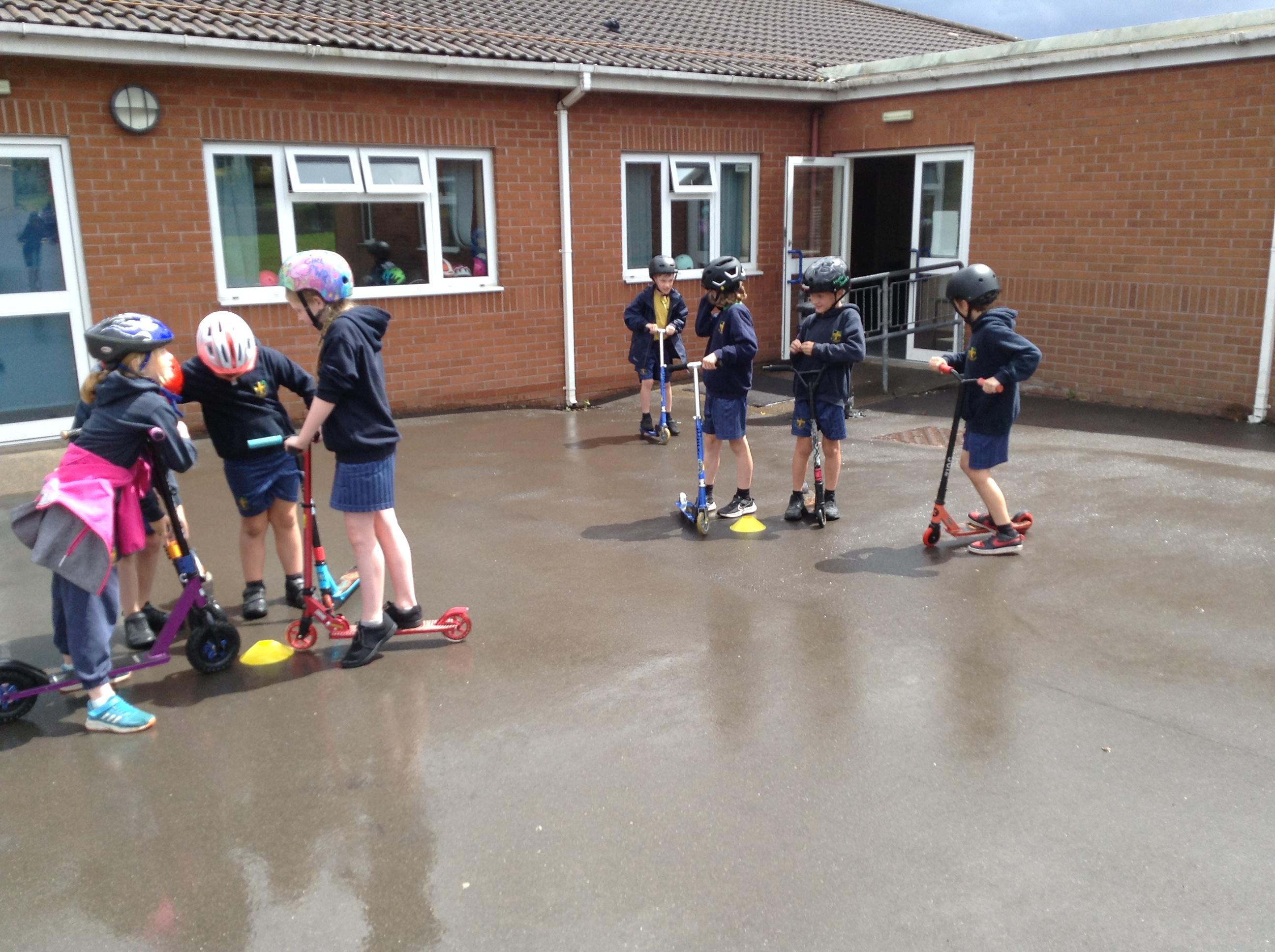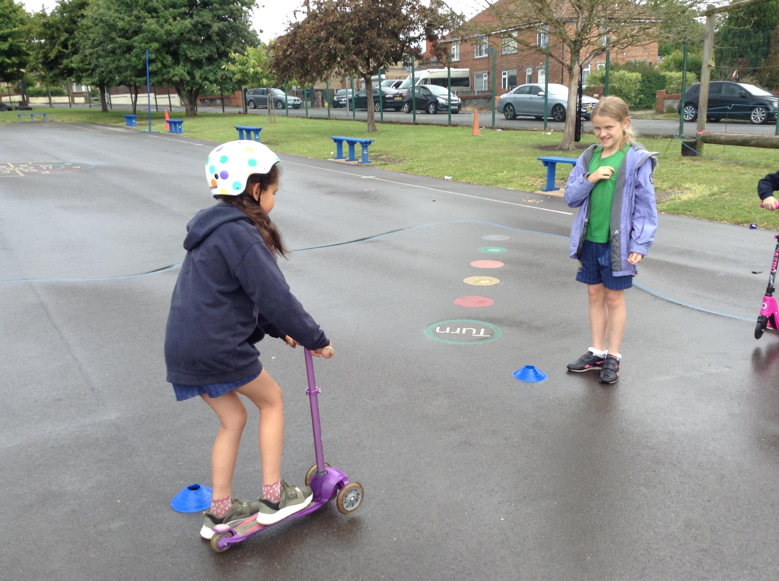 This term, we were given some training on how to properly use our scooters. As well as a theory lesson in the classroom where we learned all about how to put a helmet on correctly, check the scooter is safe and learn where to scoot, we also had a practical lesson outside. Even though it was very wet and rainy, it didn't stop us from putting the theory into practice to check over our scooters, test the brakes to stop before we hit Miss Porter and turn corners using the brakes to help us go steady. It was great fun and we thought it was really good to learn how to do this in all weathers!