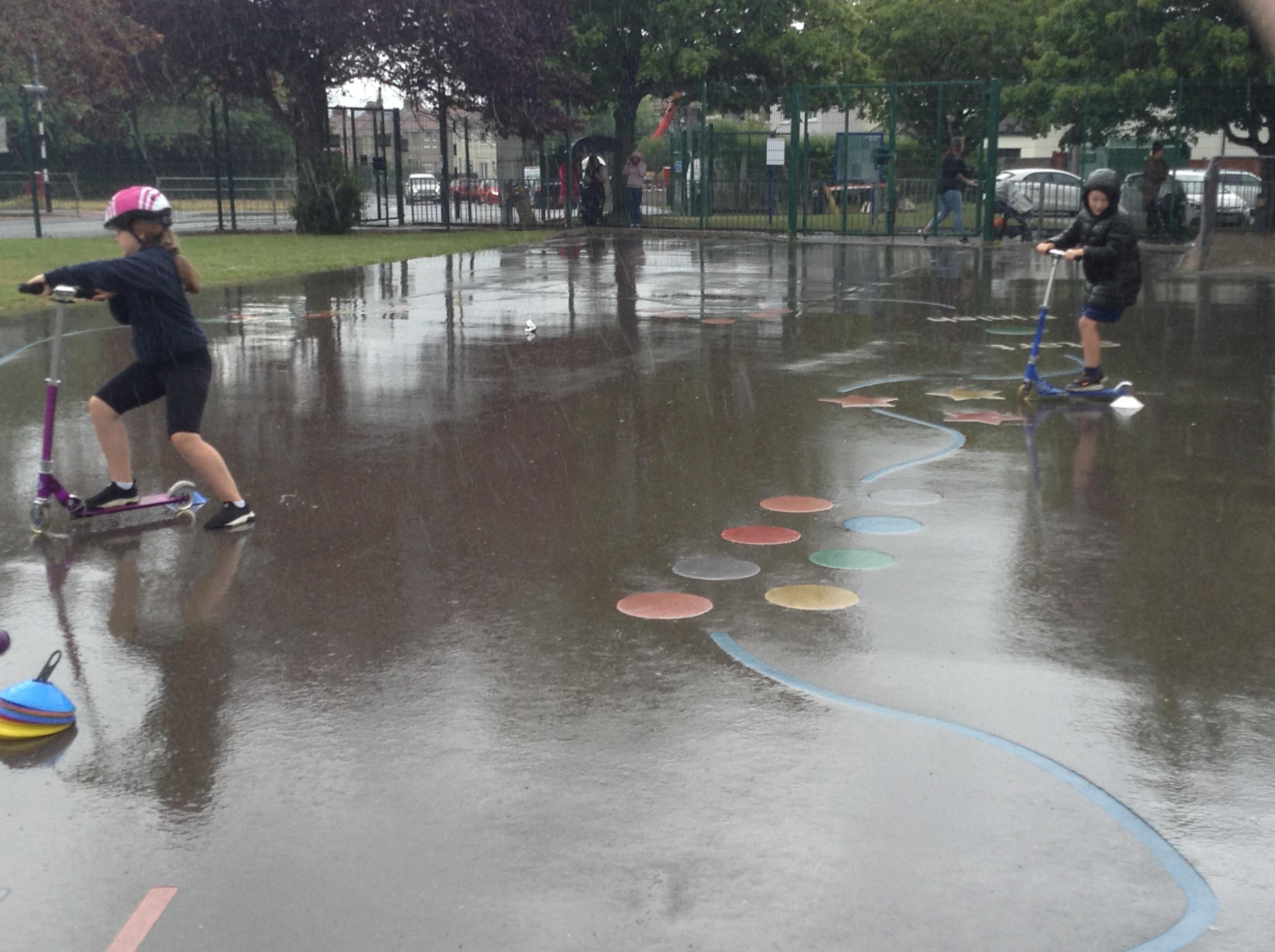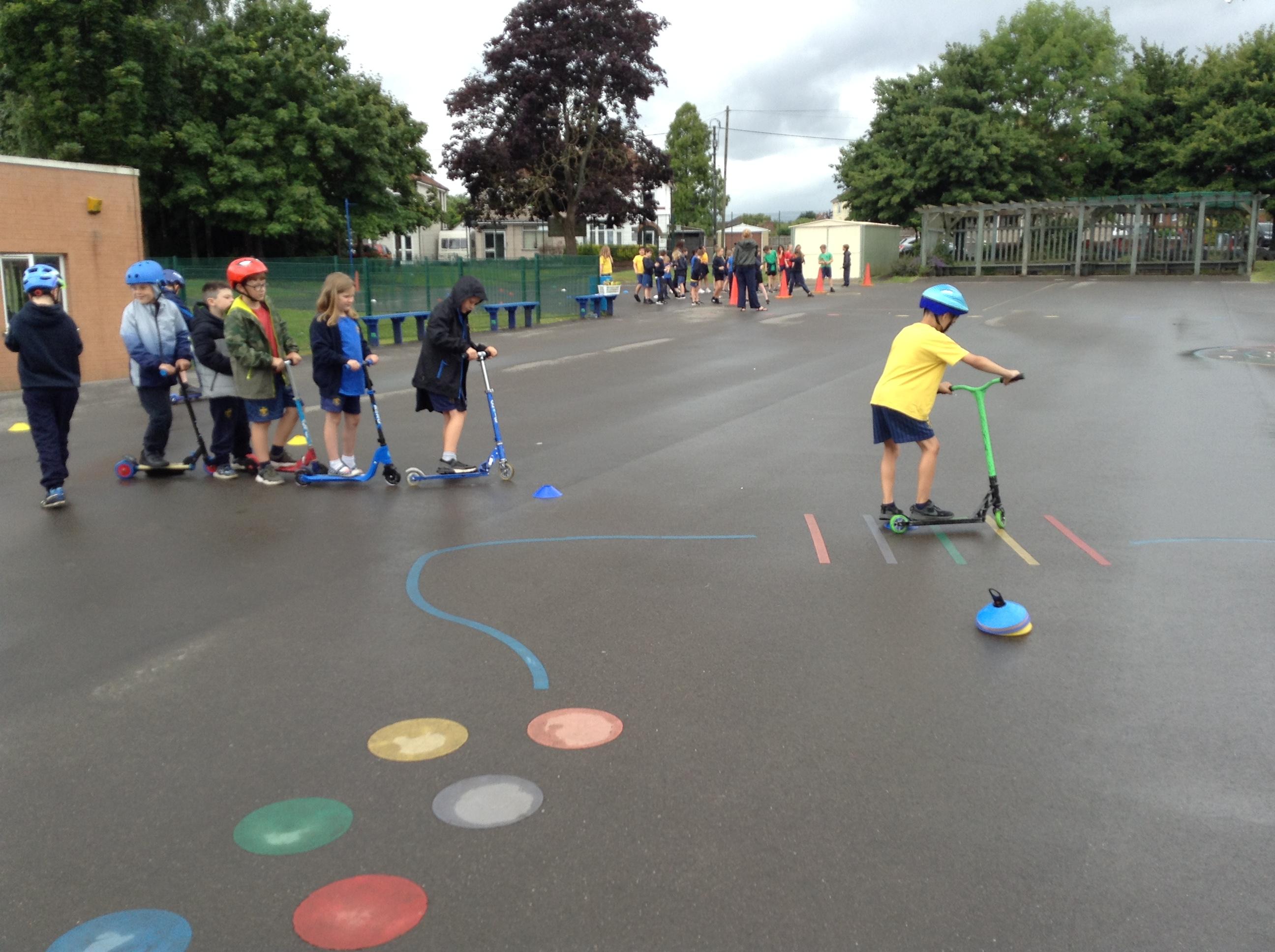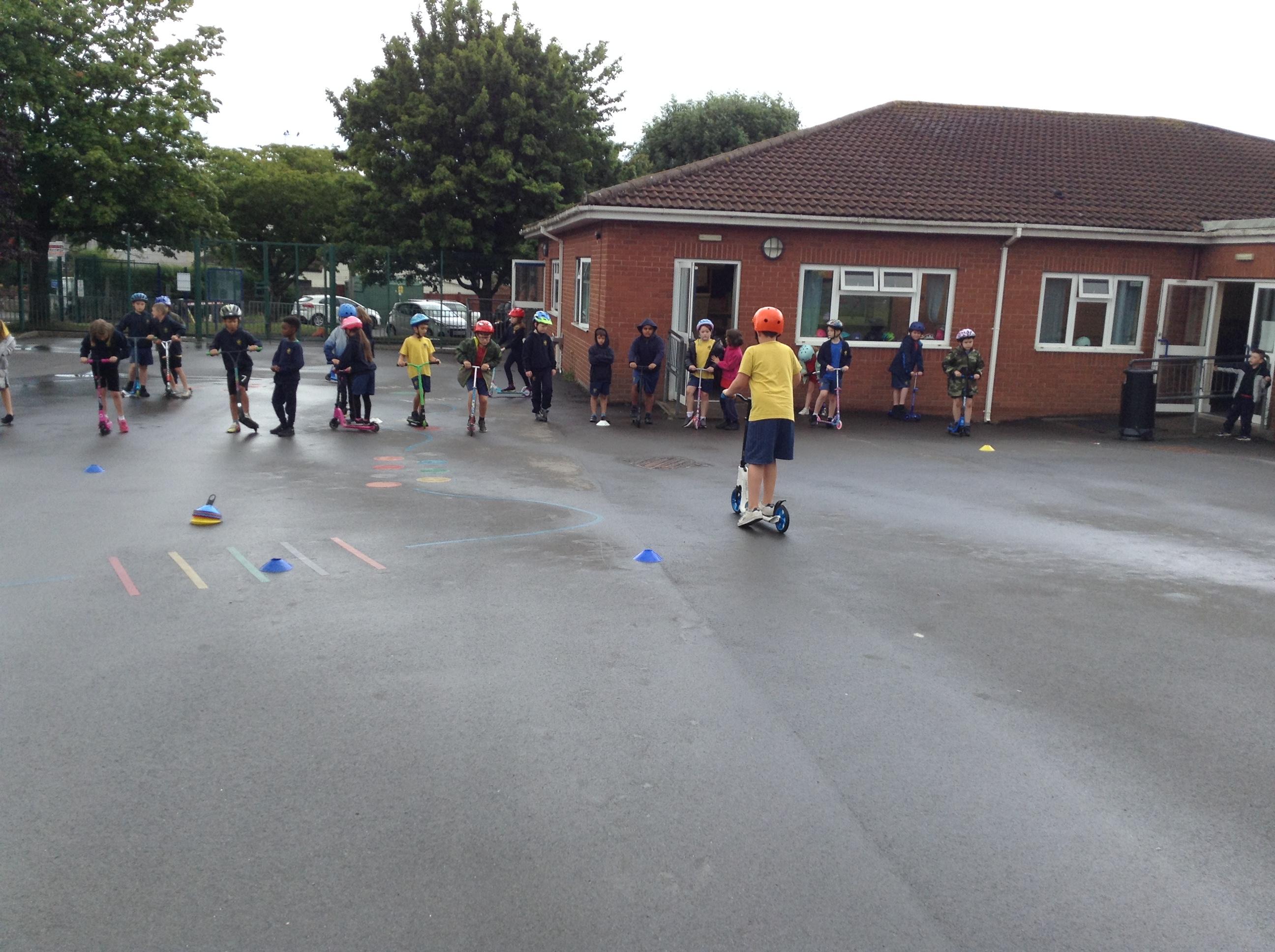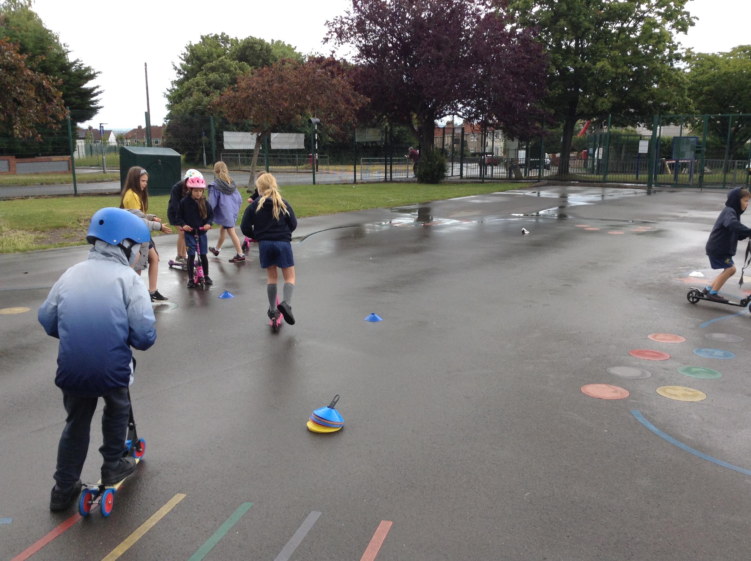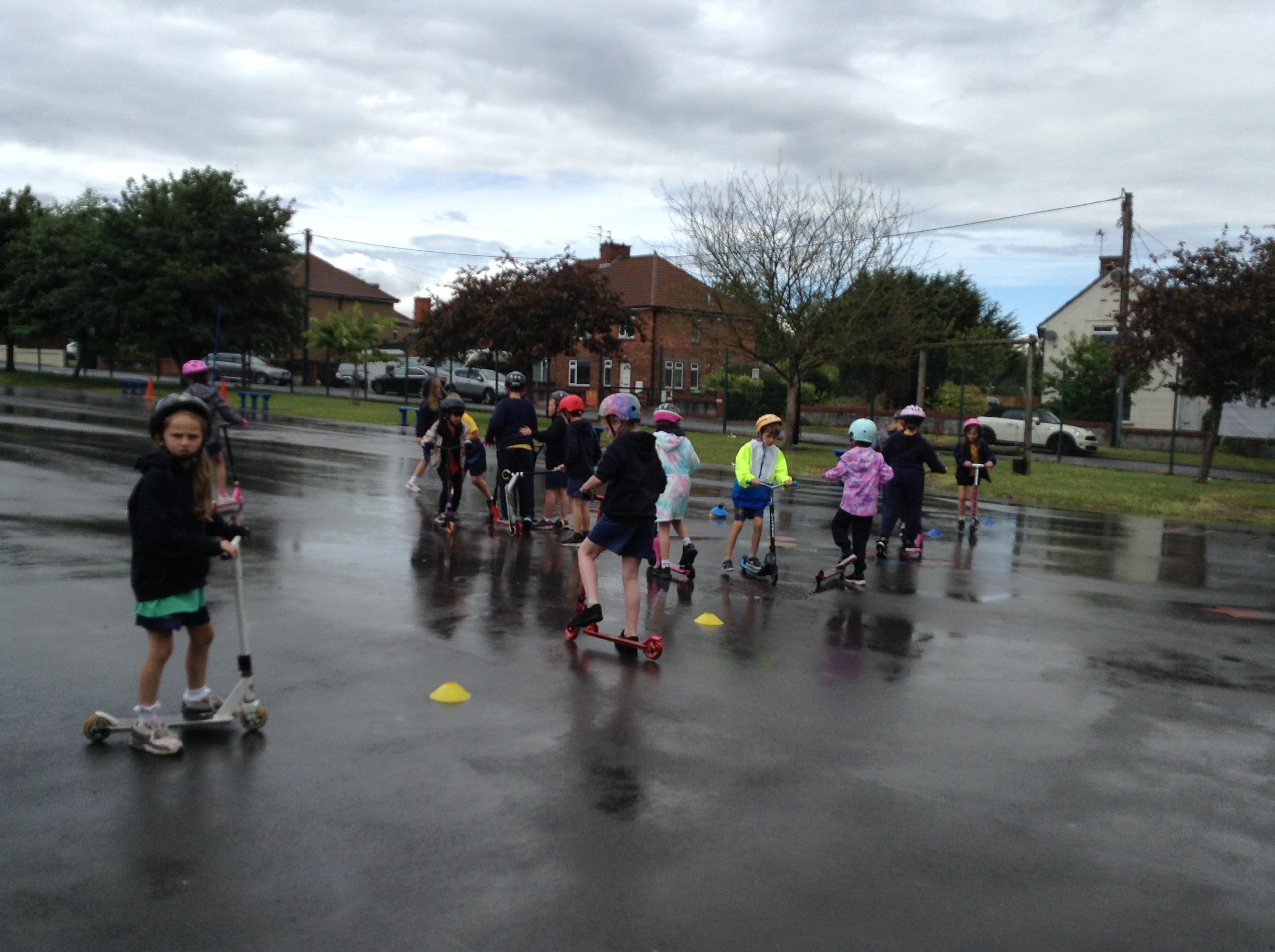 This term, we were given some training on how to properly use our scooters. As well as a theory lesson in the classroom where we learned all about how to put a helmet on correctly, check the scooter is safe and learn where to scoot, we also had a practical lesson outside. Even though it was very wet and rainy, it didn't stop us from putting the theory into practice to check over our scooters, test the brakes to stop before we hit Miss Porter and turn corners using the brakes to help us go steady. It was great fun and we thought it was really good to learn how to do this in all weathers!