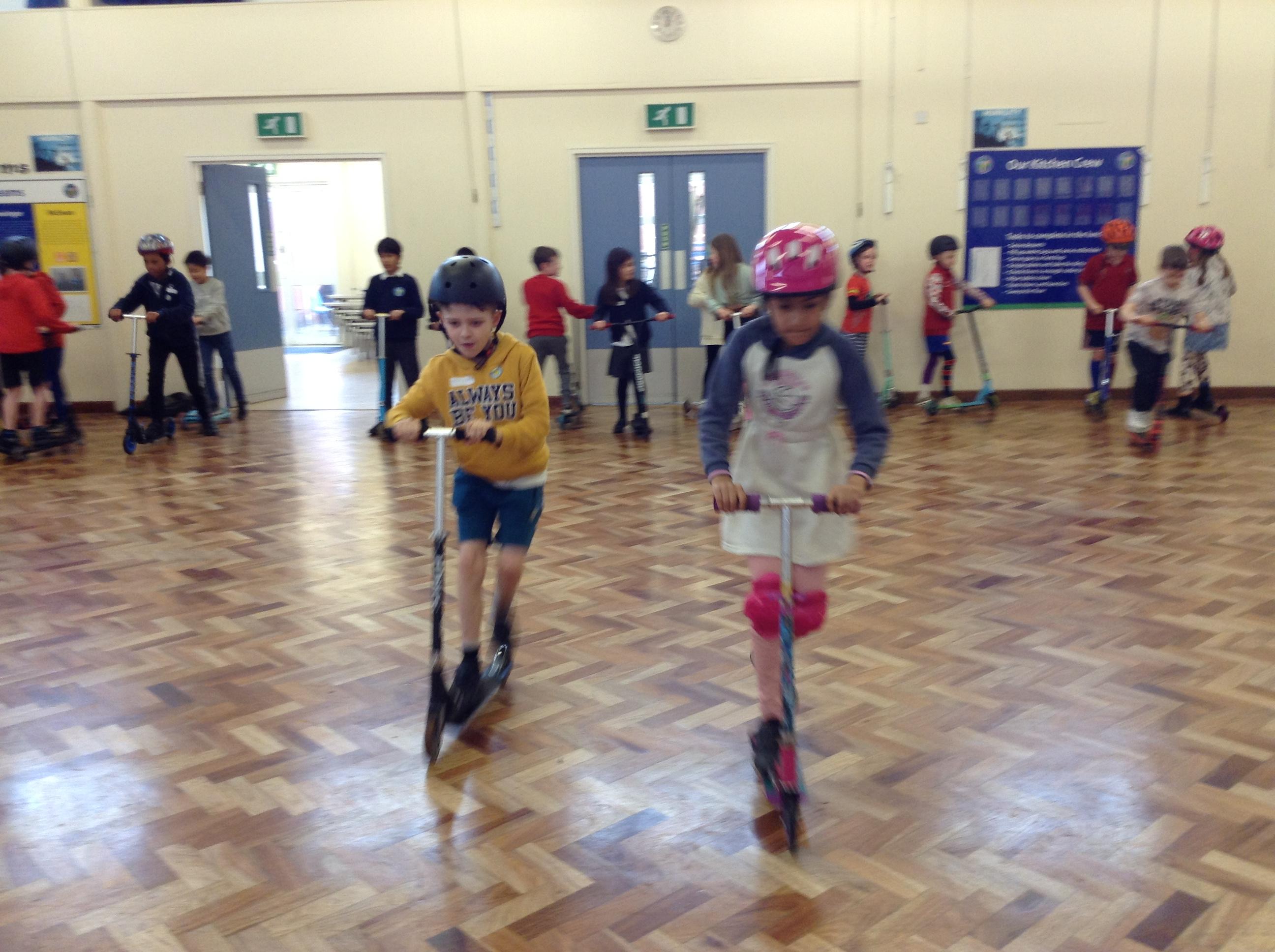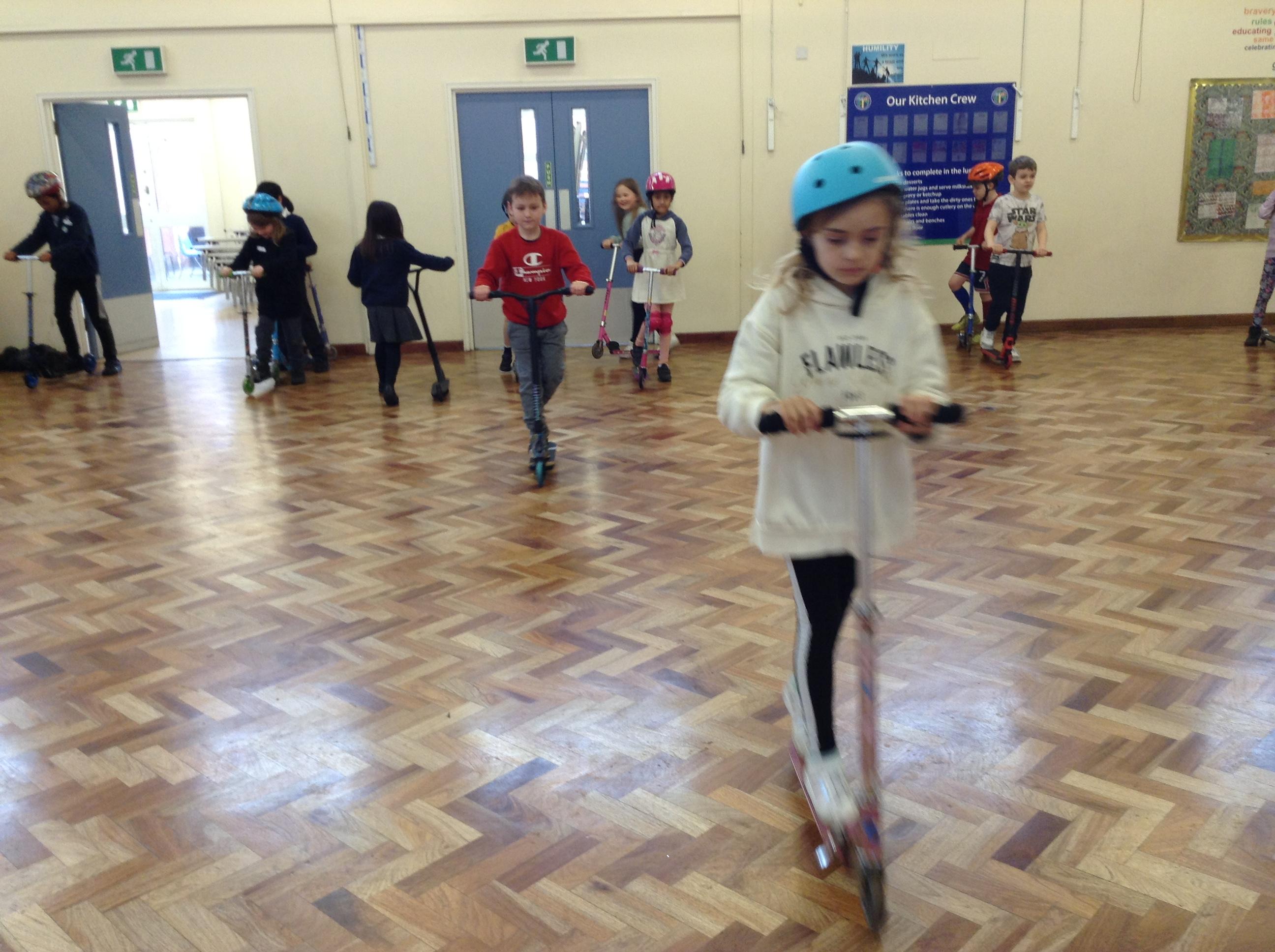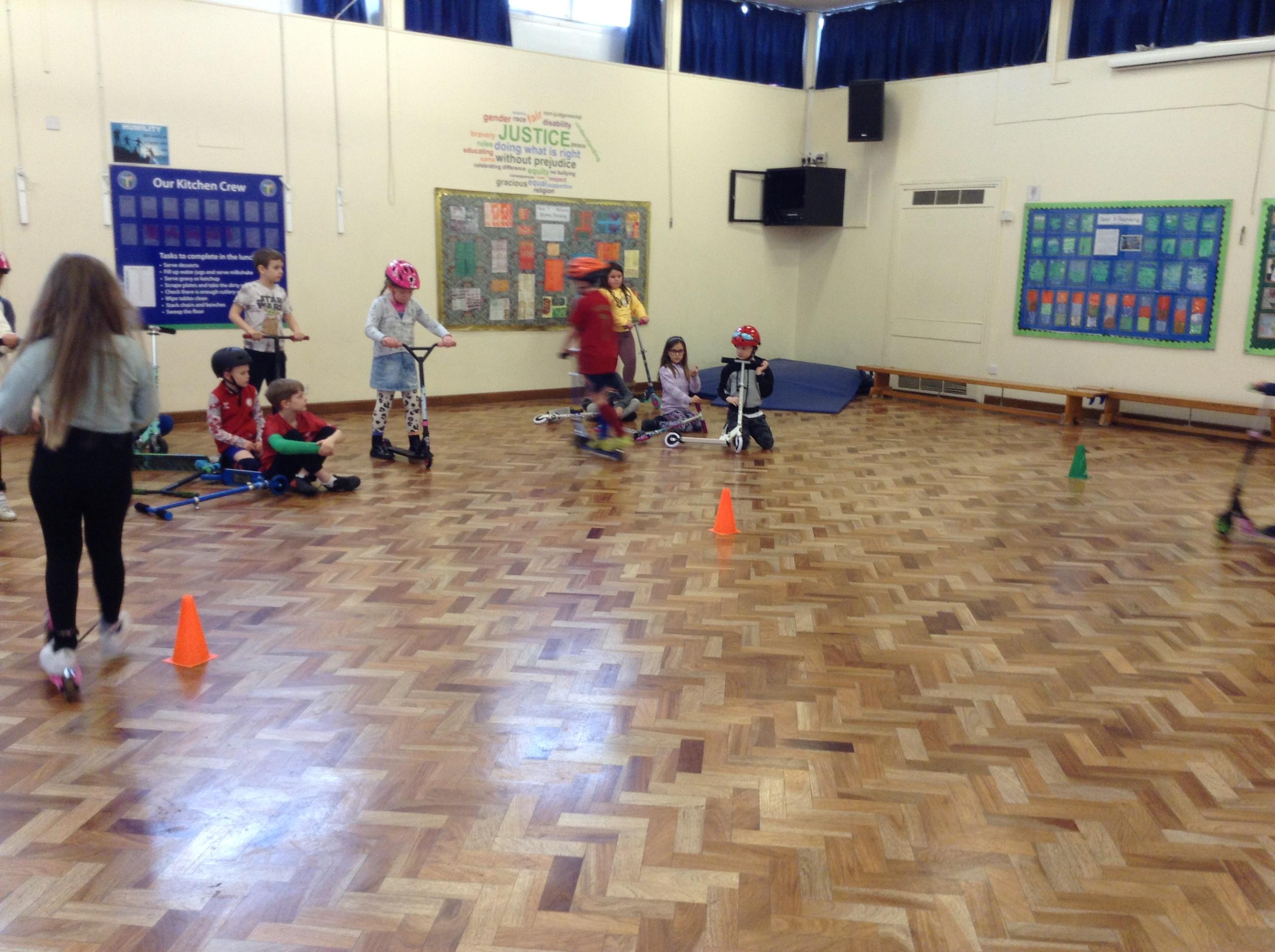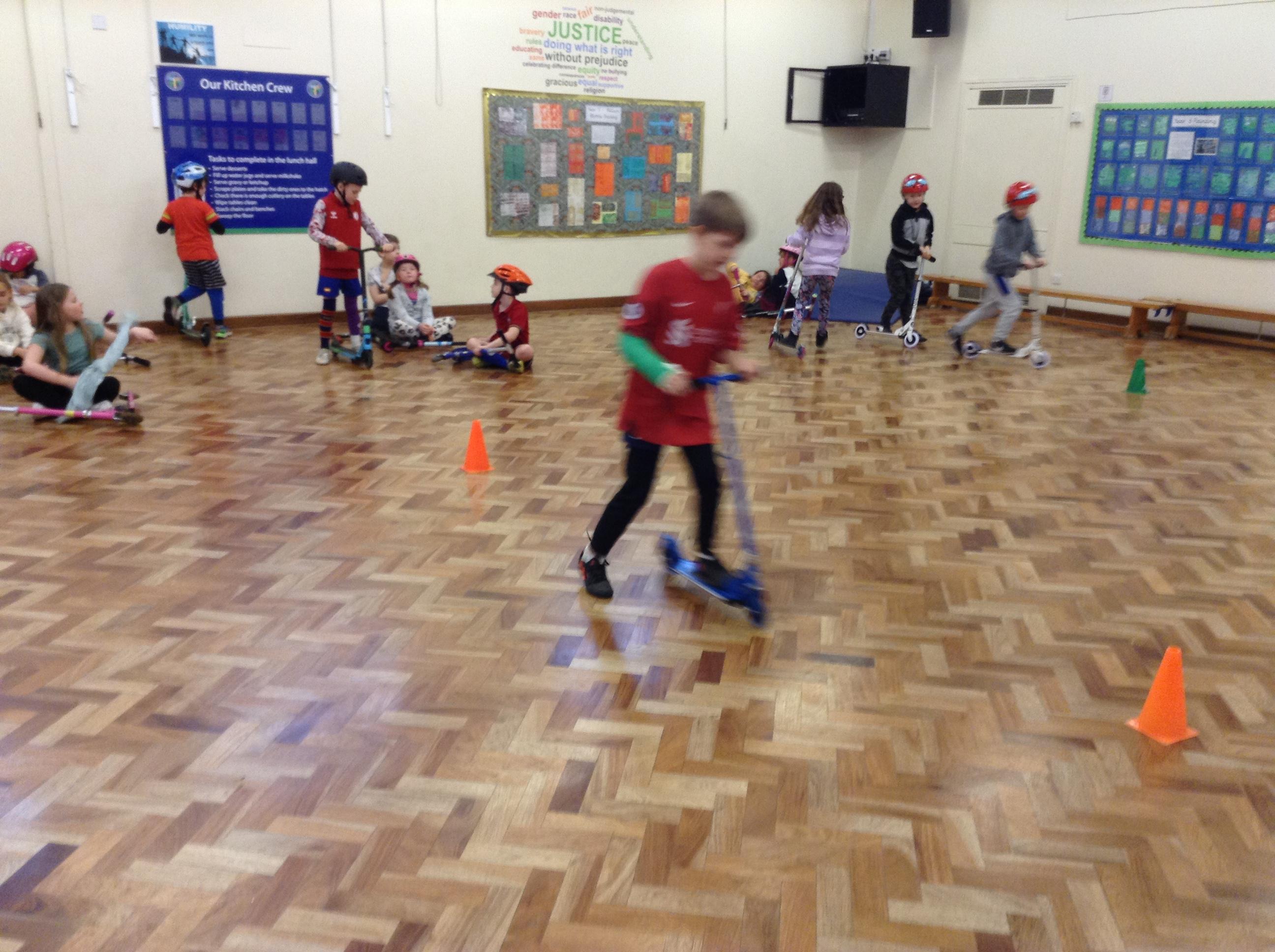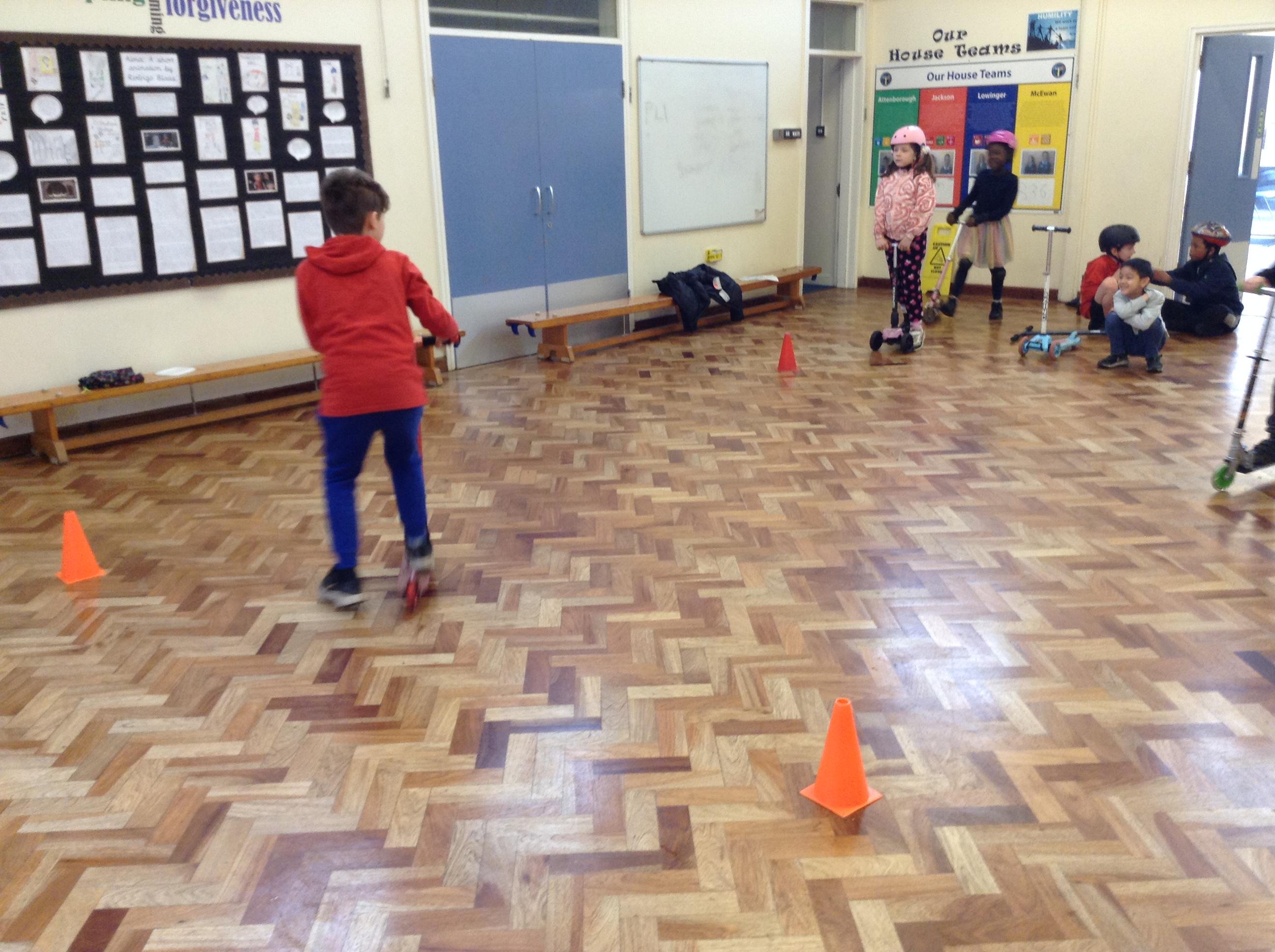 We ended the term with some scooter training on how to use our scooters safely. After a theory lesson where we watched a video on safety tips, we took part in a practical session where we used our brakes, practiced our turns and scooted whilst watching out for distractions and obstacles around us. It was great fun!