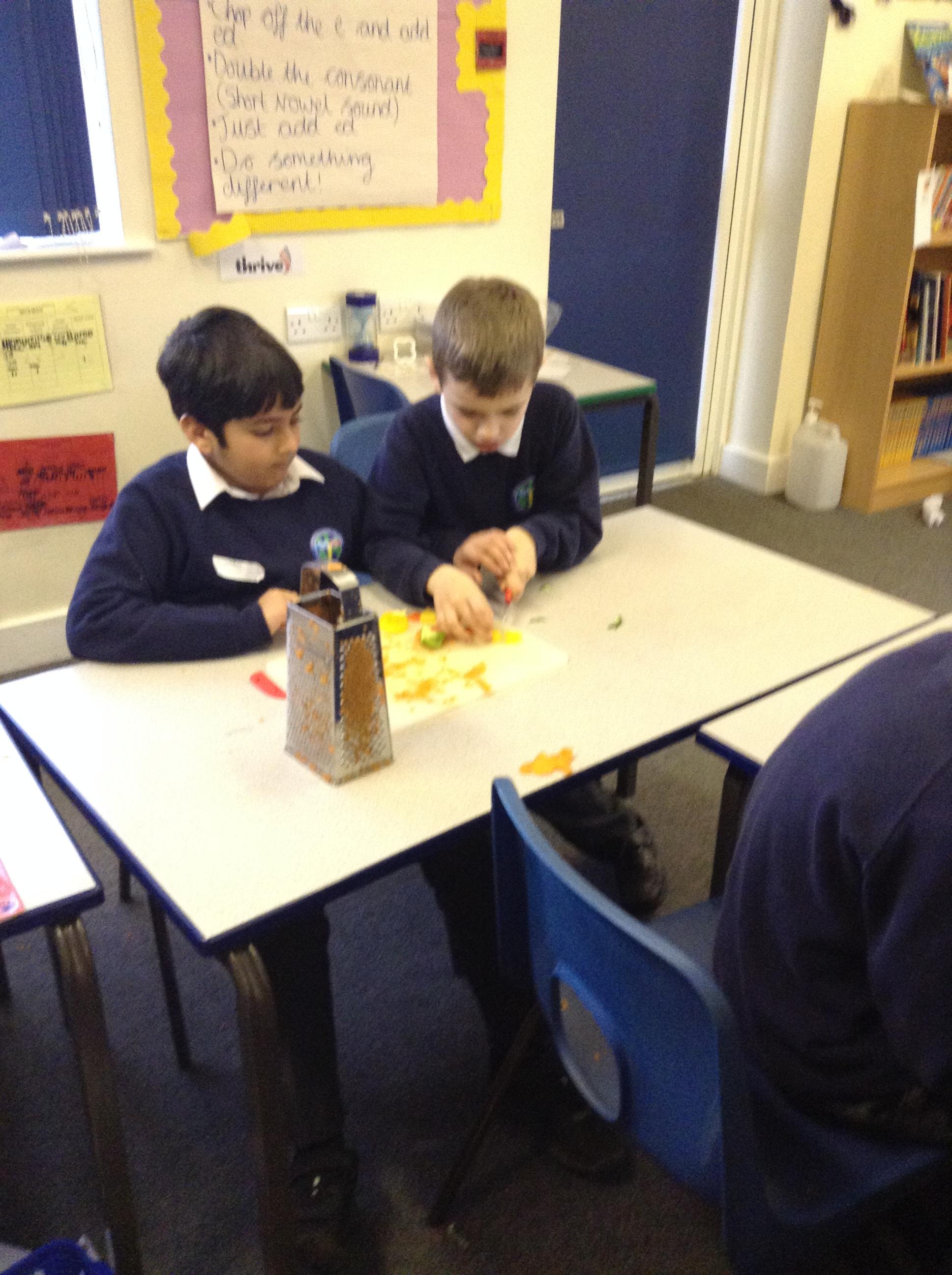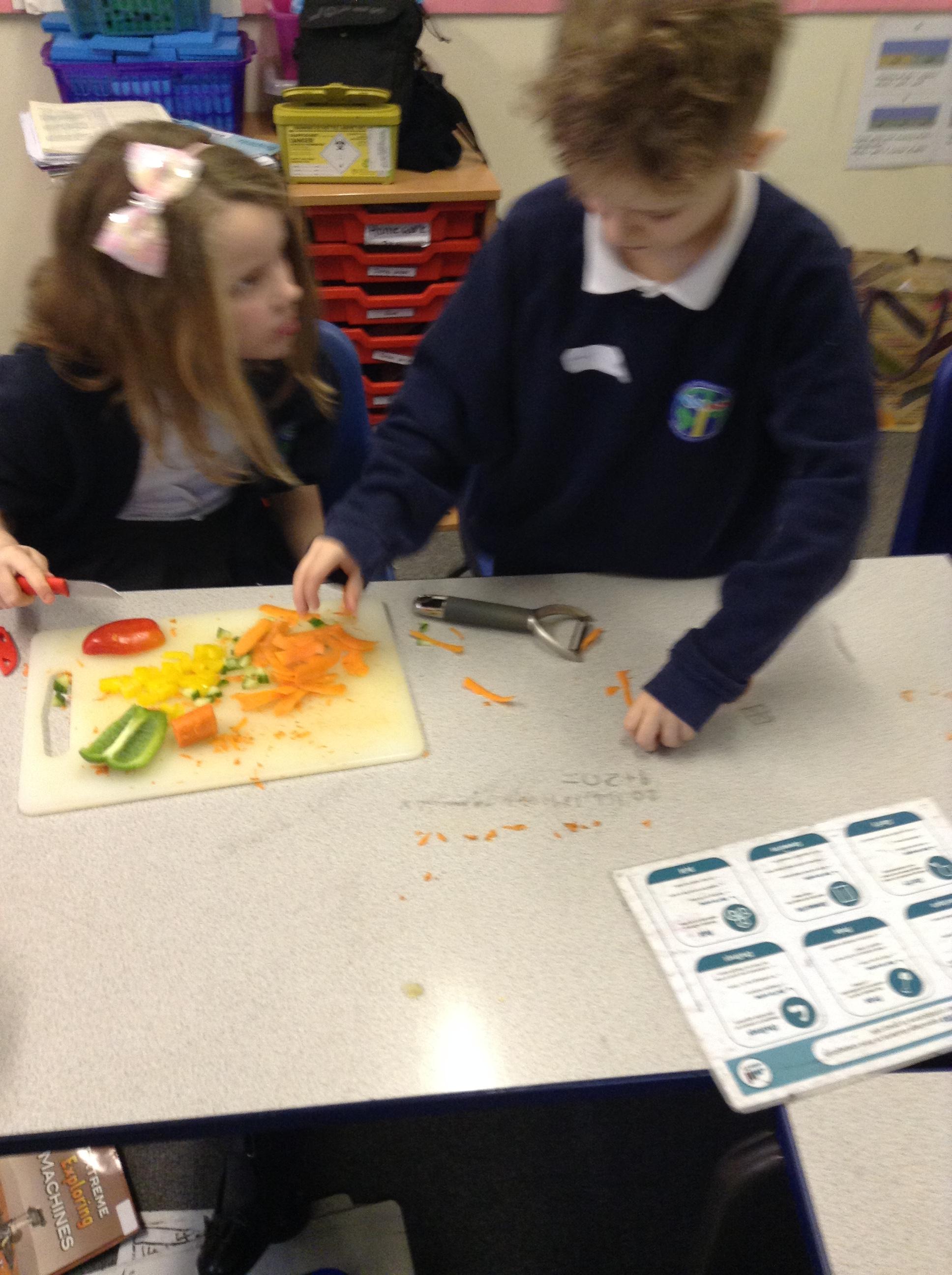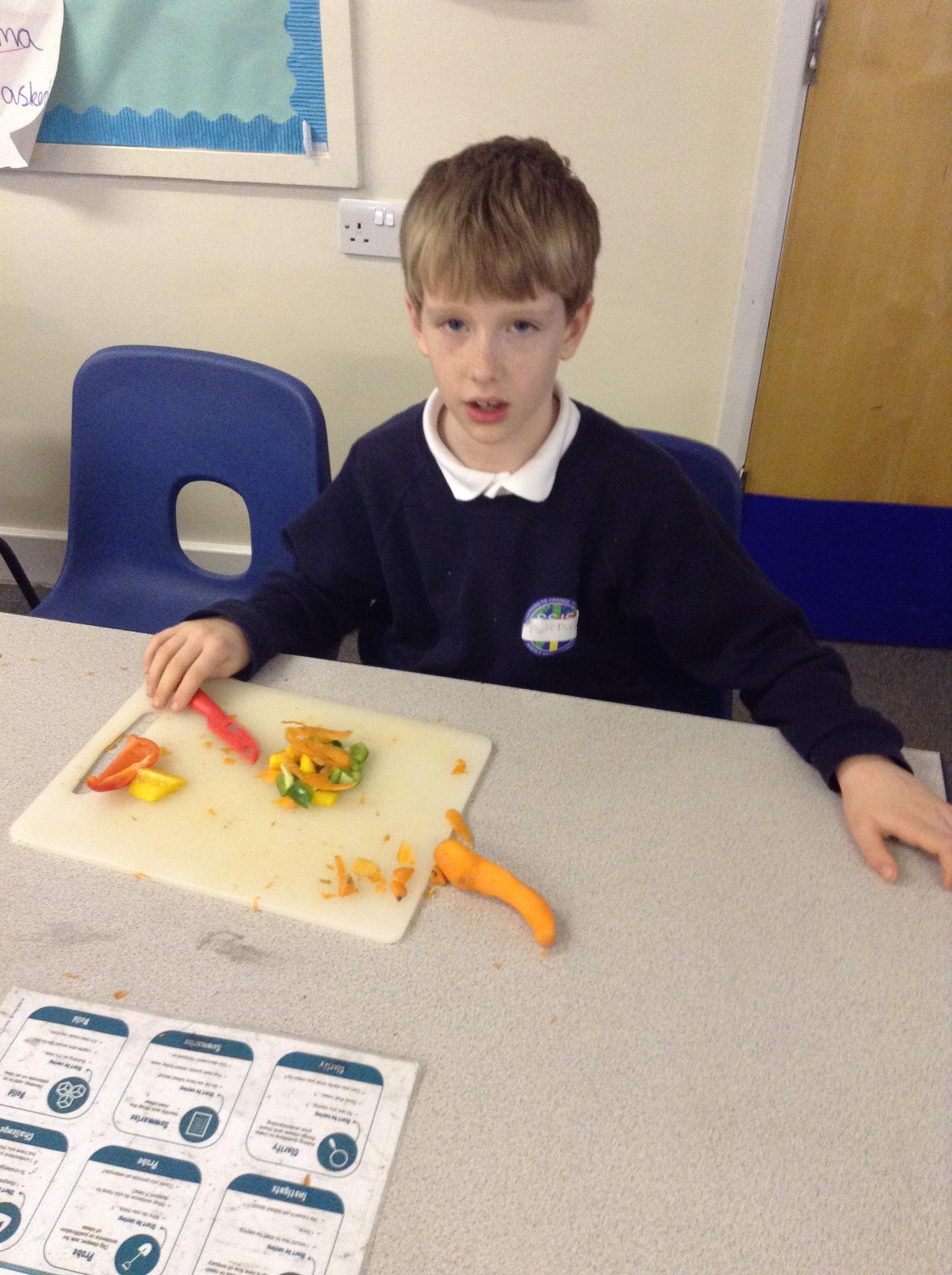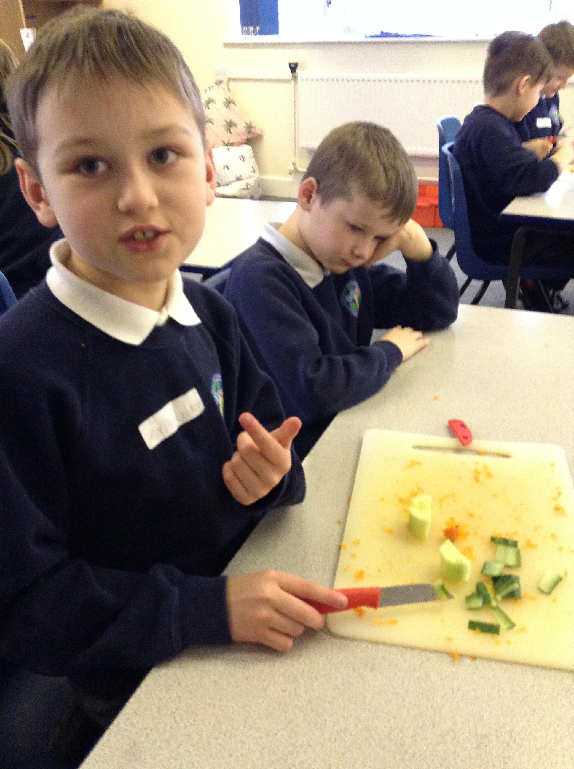 For this term's no pens day, we swapped the pens and pencils for knifes and graters to help us develop our cooking skills. We watched videos that explained to us exactly how we needed to chop, slice, grate and peel safely. After, we practiced these skills without equipment to make sure we were able to hold the knifes correctly. Once we knew the correct holds, we had a go at using these skills to chop peppers, slice cucumber and grate/peel carrots. To top it off, we got an healthy snack at the end of it!