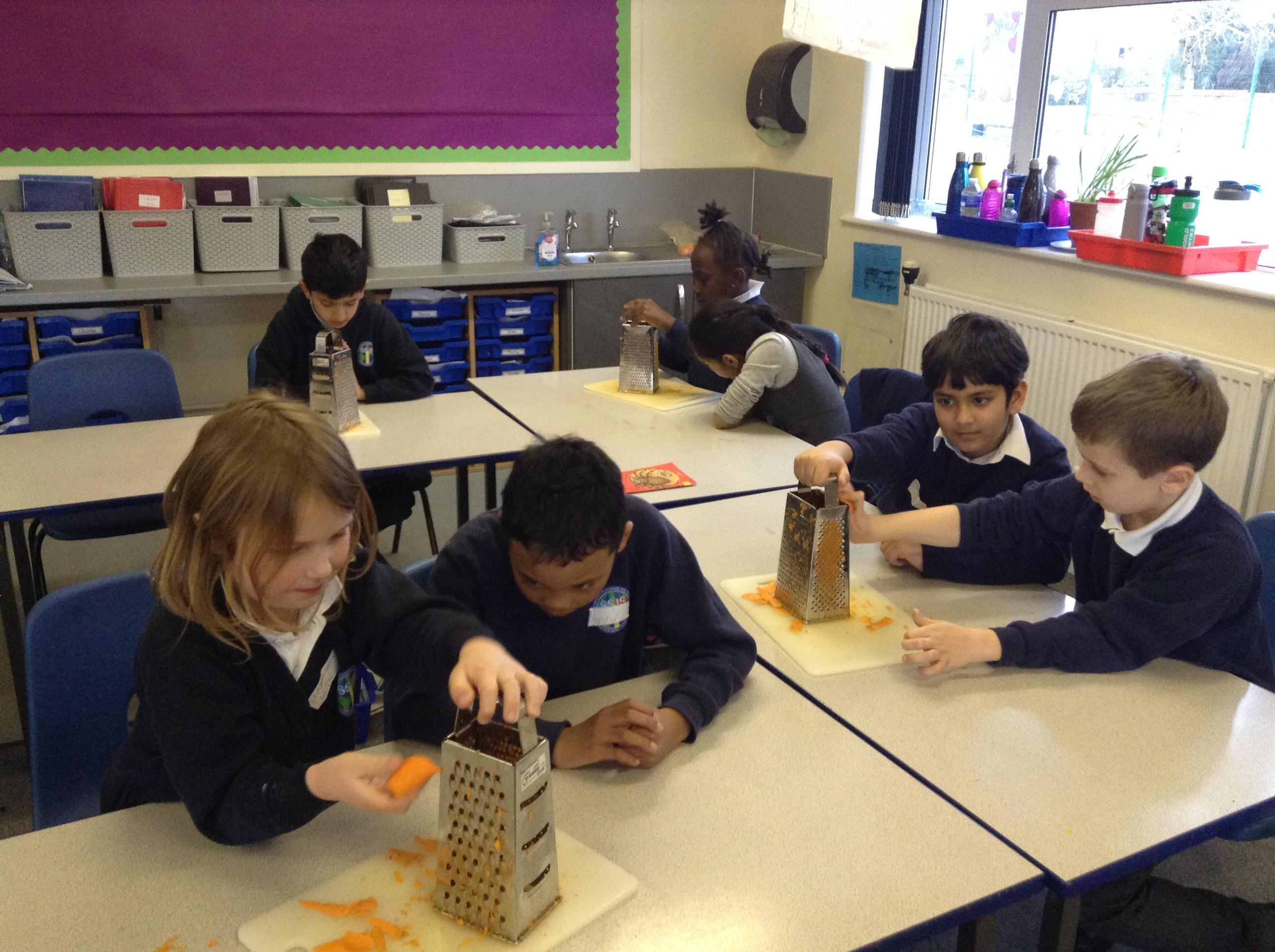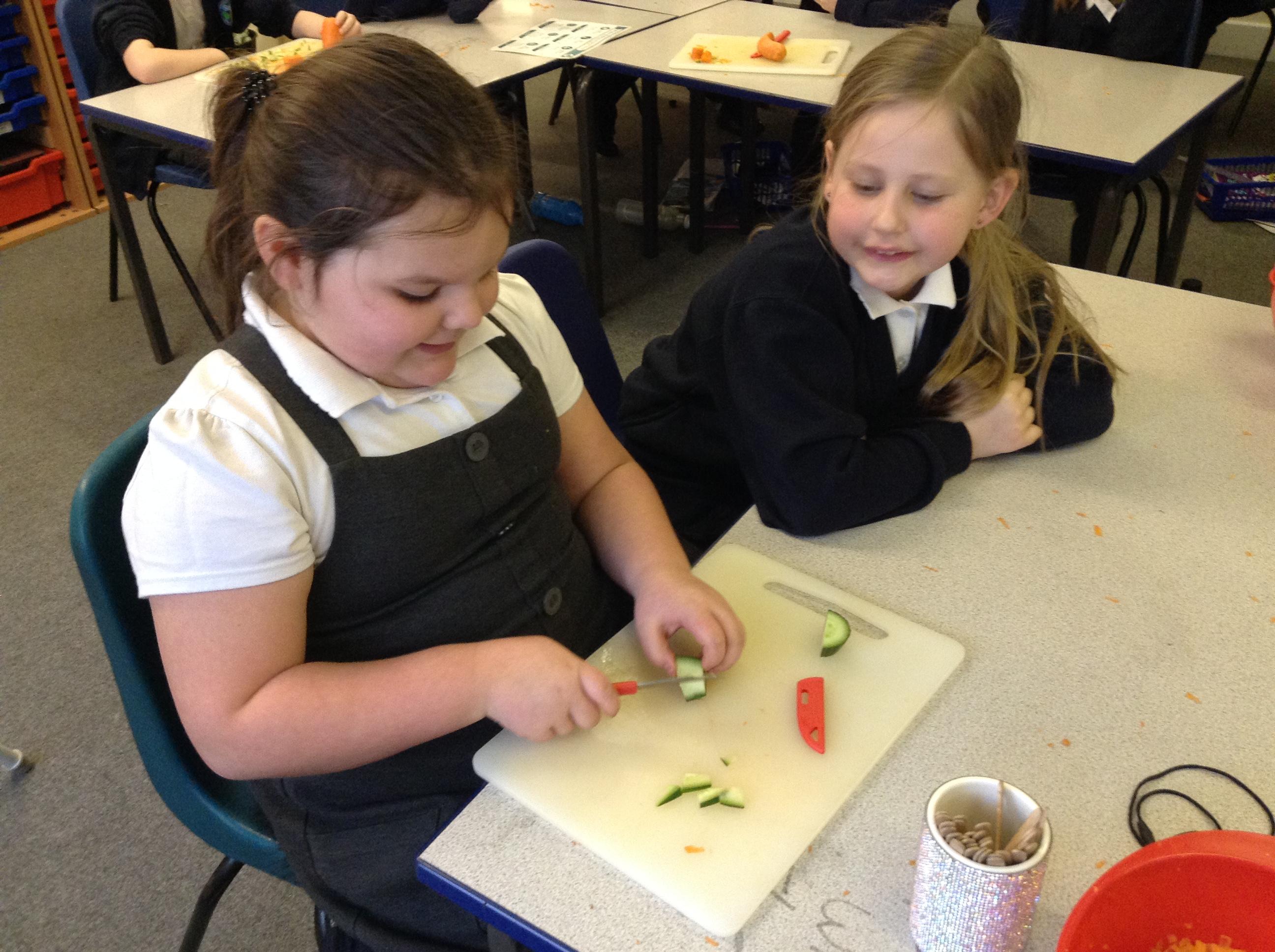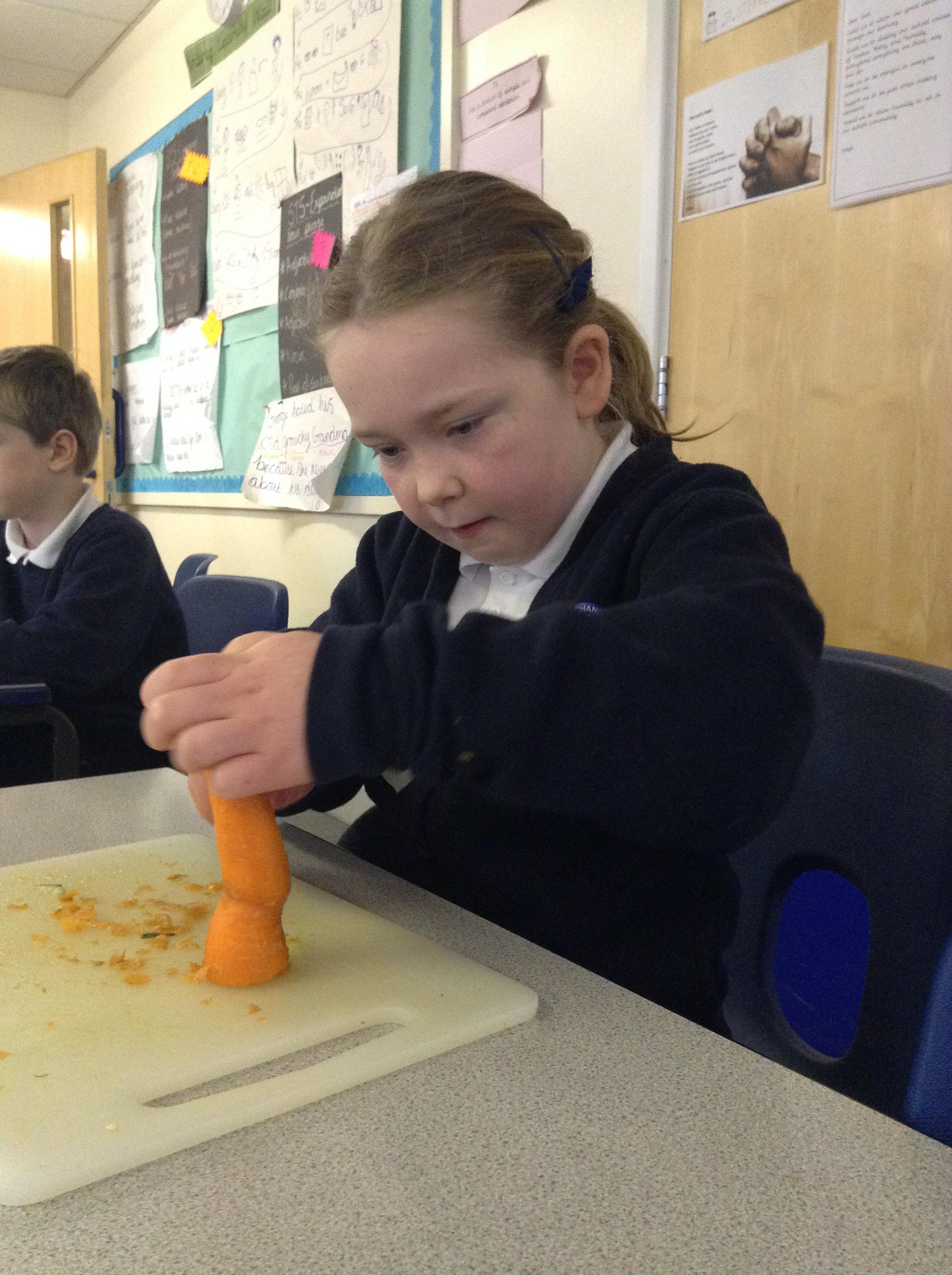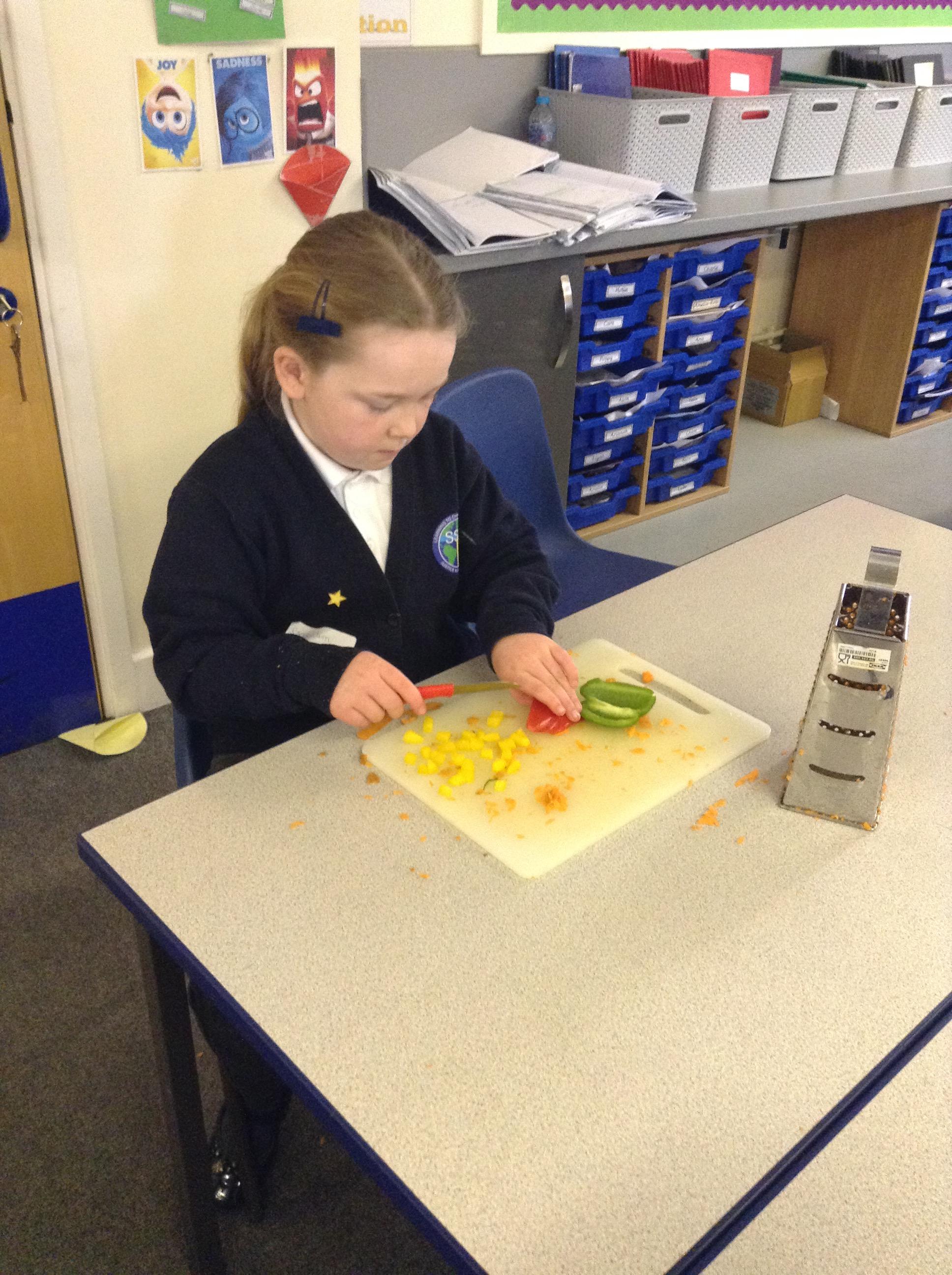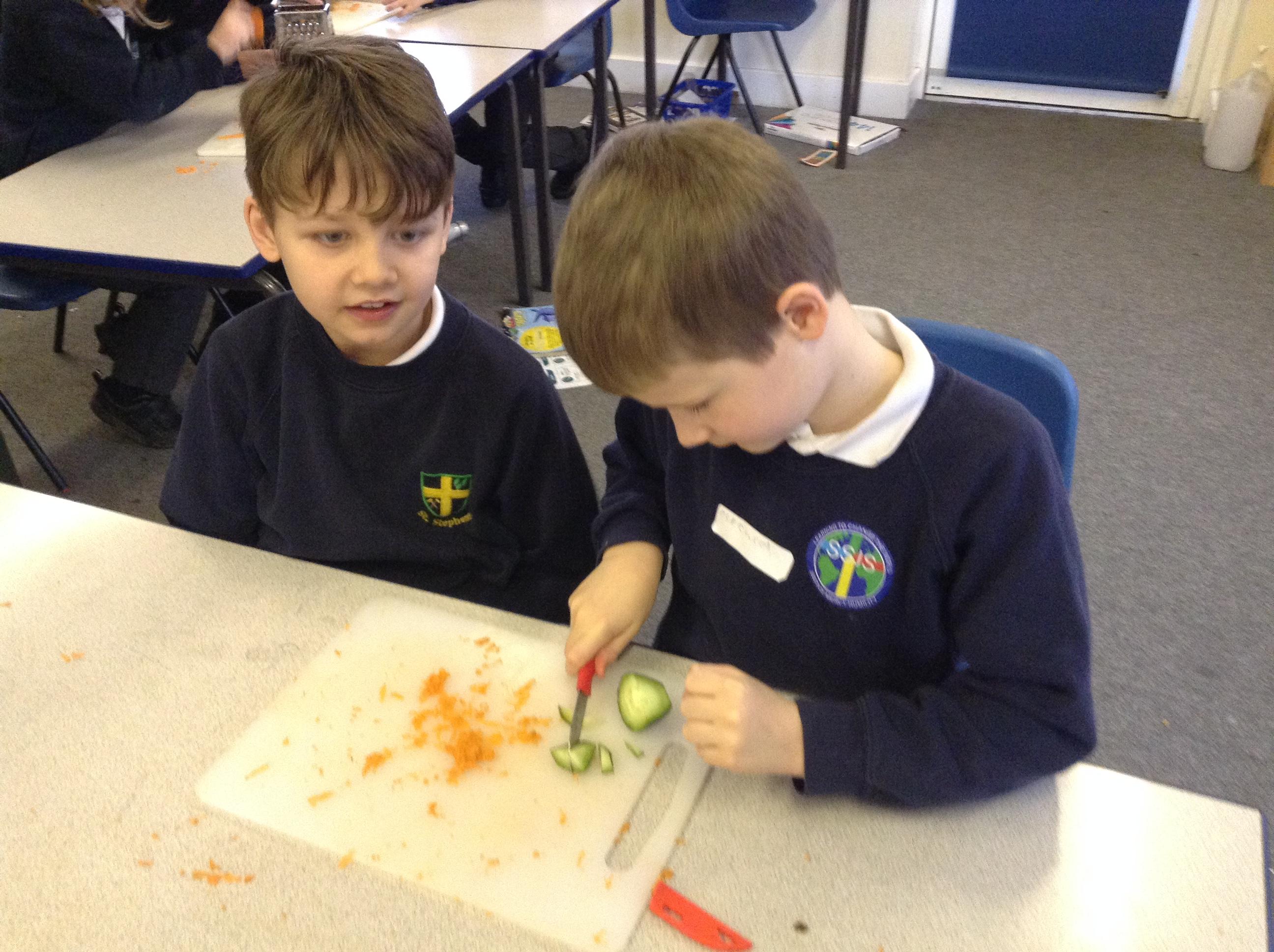 For this term's no pens day, we swapped the pens and pencils for knifes and graters to help us develop our cooking skills. We watched videos that explained to us exactly how we needed to chop, slice, grate and peel safely. After, we practiced these skills without equipment to make sure we were able to hold the knifes correctly. Once we knew the correct holds, we had a go at using these skills to chop peppers, slice cucumber and grate/peel carrots. To top it off, we got an healthy snack at the end of it!
