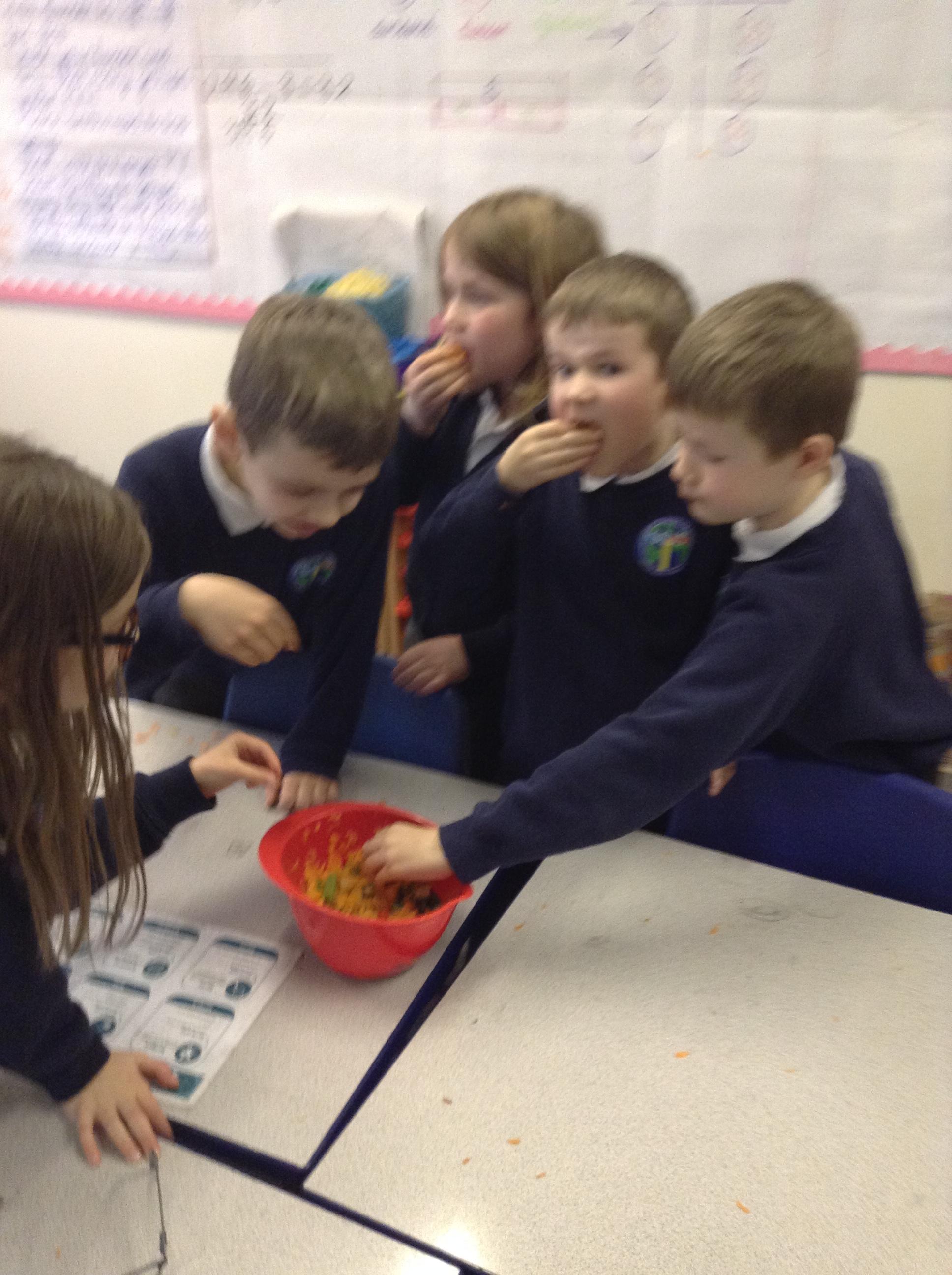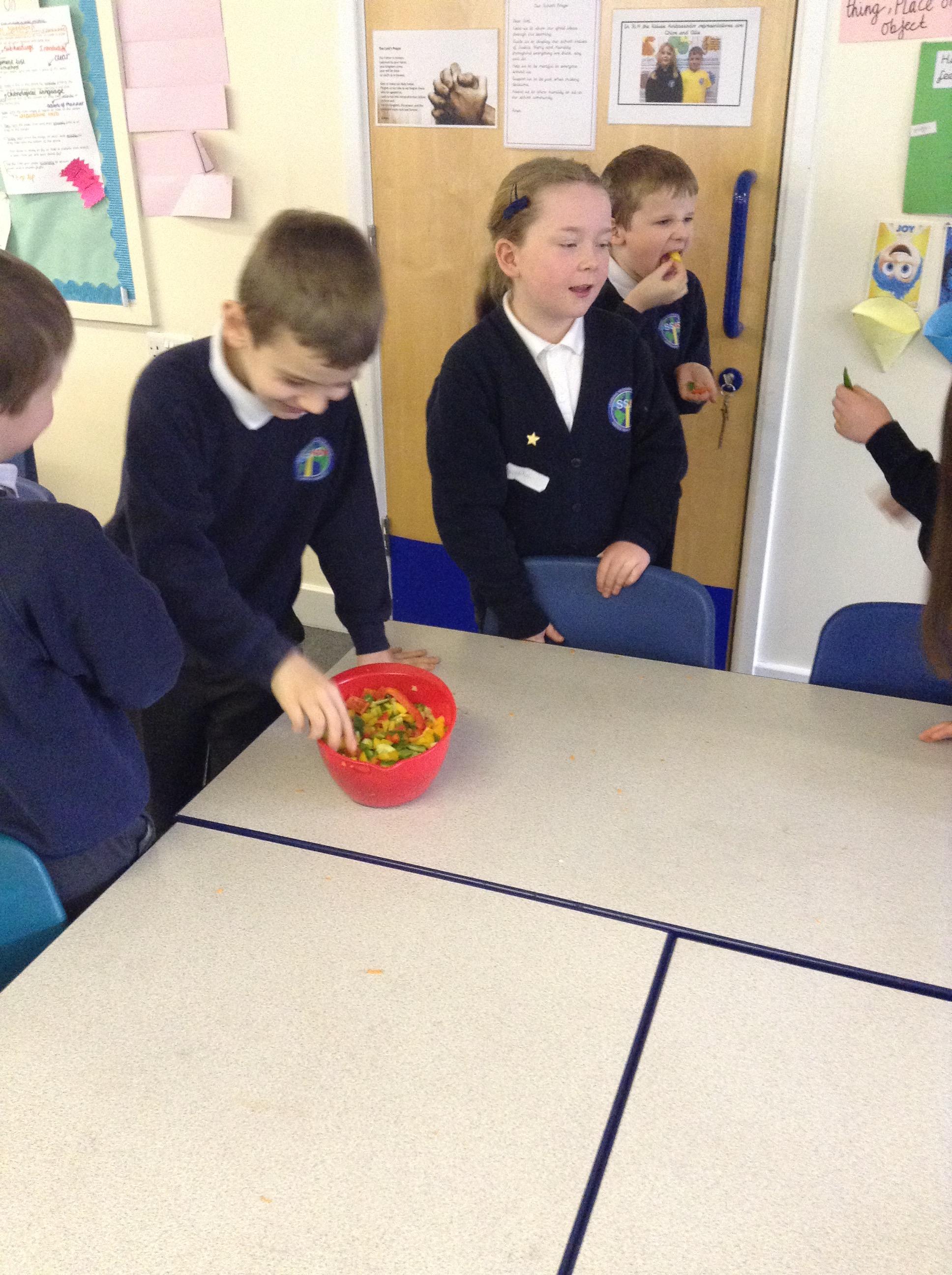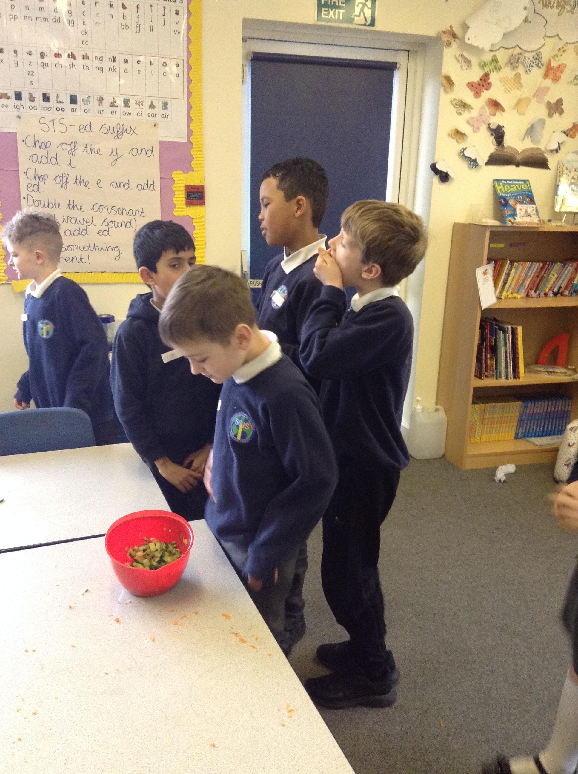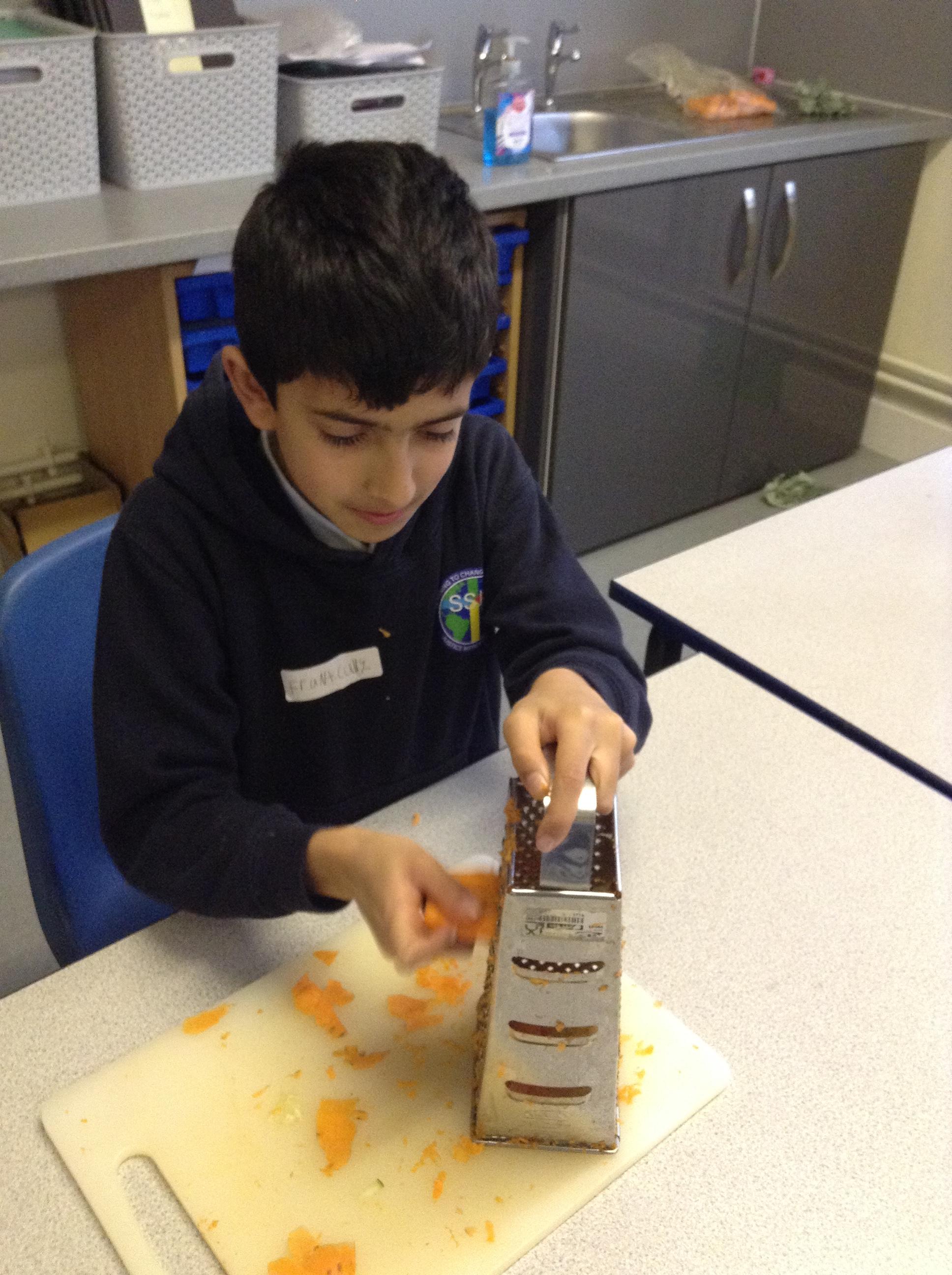 For this term's no pens day, we swapped the pens and pencils for knifes and graters to help us develop our cooking skills. We watched videos that explained to us exactly how we needed to chop, slice, grate and peel safely. After, we practiced these skills without equipment to make sure we were able to hold the knifes correctly. Once we knew the correct holds, we had a go at using these skills to chop peppers, slice cucumber and grate/peel carrots. To top it off, we got an healthy snack at the end of it!