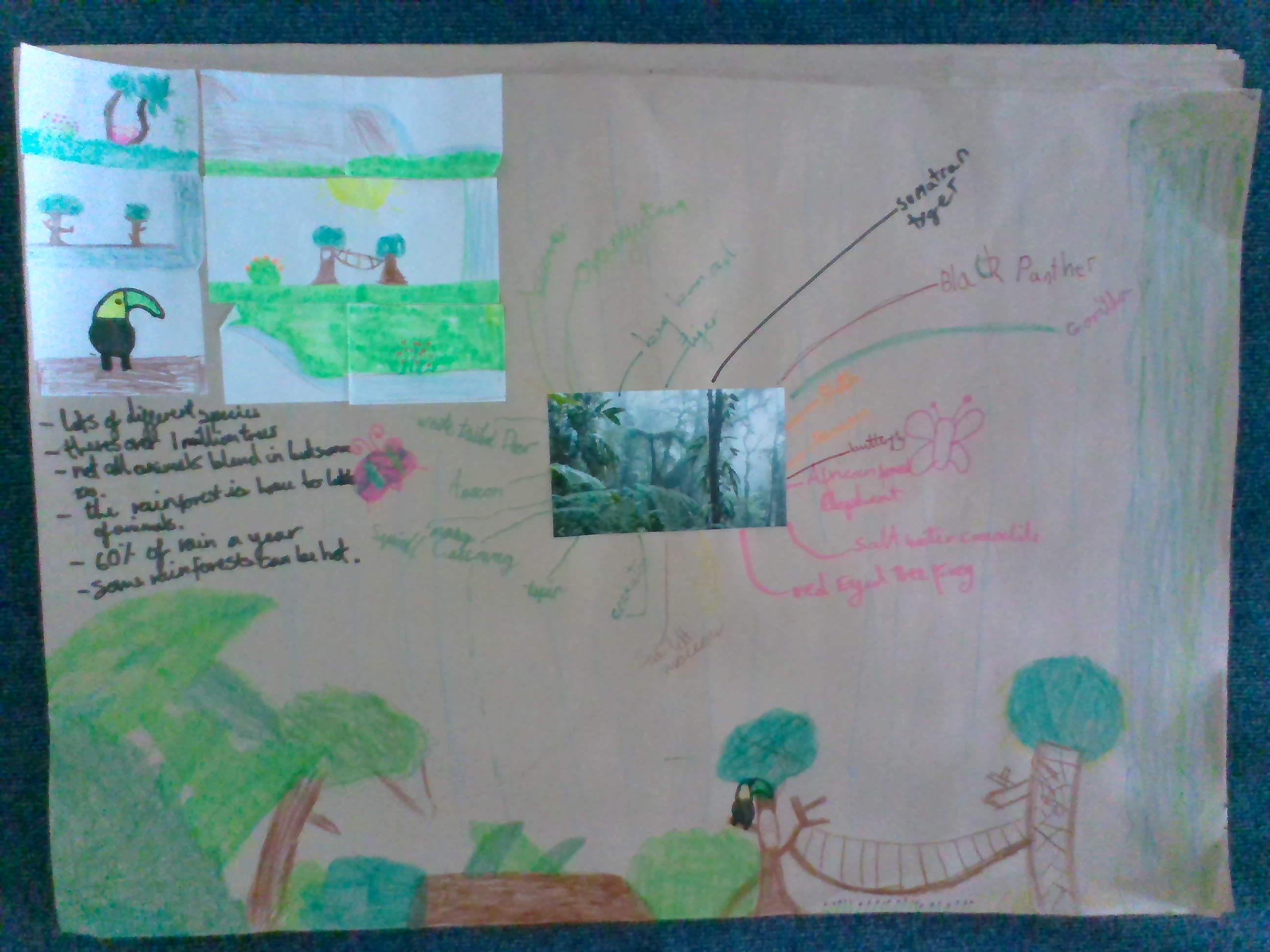 Our new enquiry focuses on the rainforest. When we came into the classroom, we listened to the sounds of the rainforest and discussed what we could hear. We were then showed the word 'biomes'. We were all quite familiar with this word because of a game so many of us play. Biomes are a large community with a variety of plants/trees and animals. Each plant/tree or animal is specifically adapted to that environment. A rainforest is a type of biome.