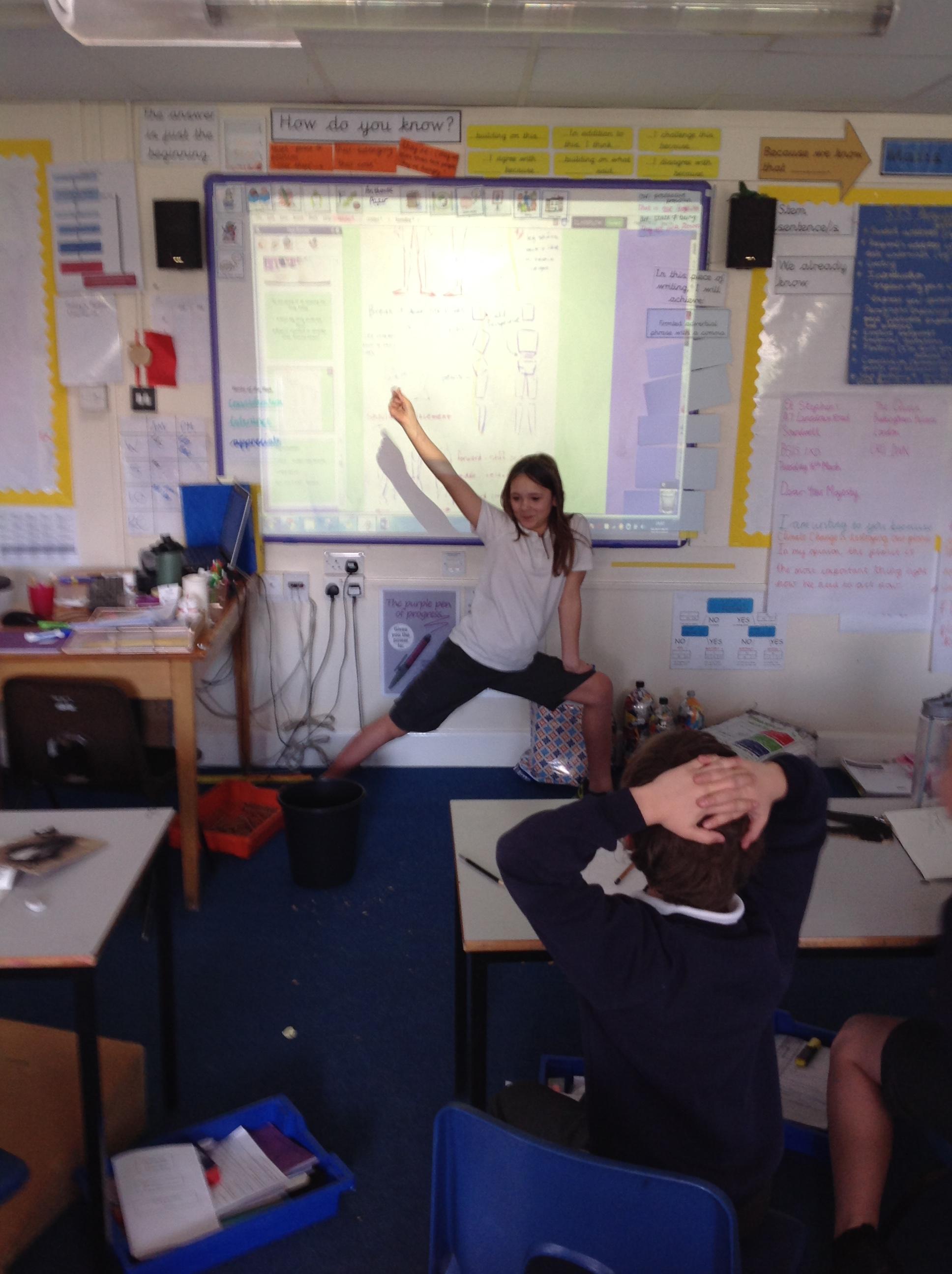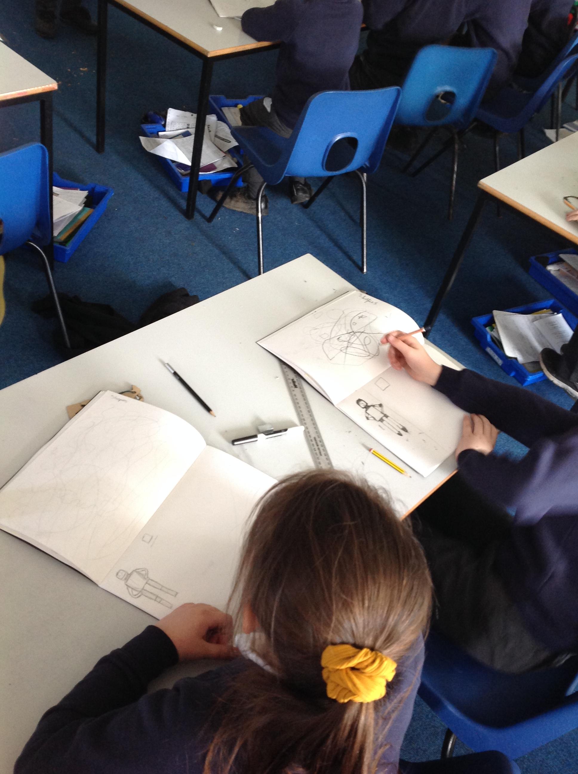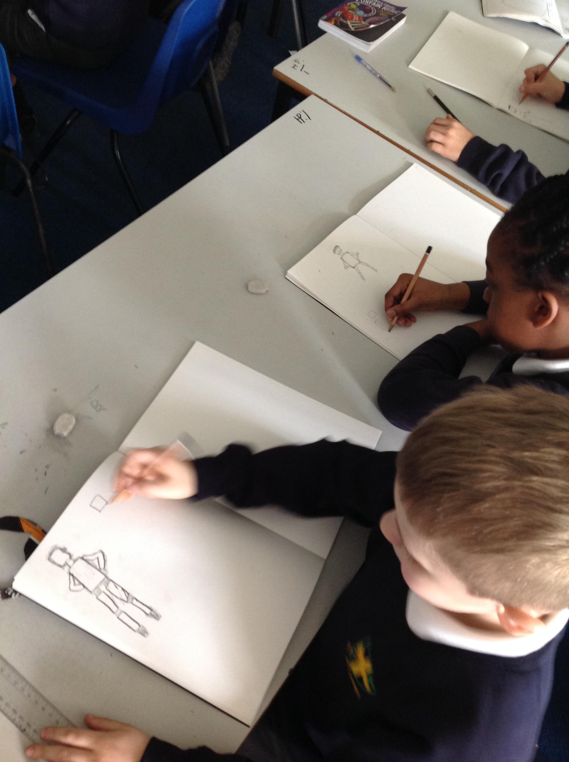 This then helped up the focus on the main activity. We are going to be drawing people so we started by looking at the body and what shapes we think it is made up of. One person stood at the front of the class and we drew them using squares and rectangles (strange, we know!) but it actually worked! We were then able to round off the squares and rectangles using a range of sketching techniques. We were all pretty impressed with our outcomes and looking forward to working towards our final piece.