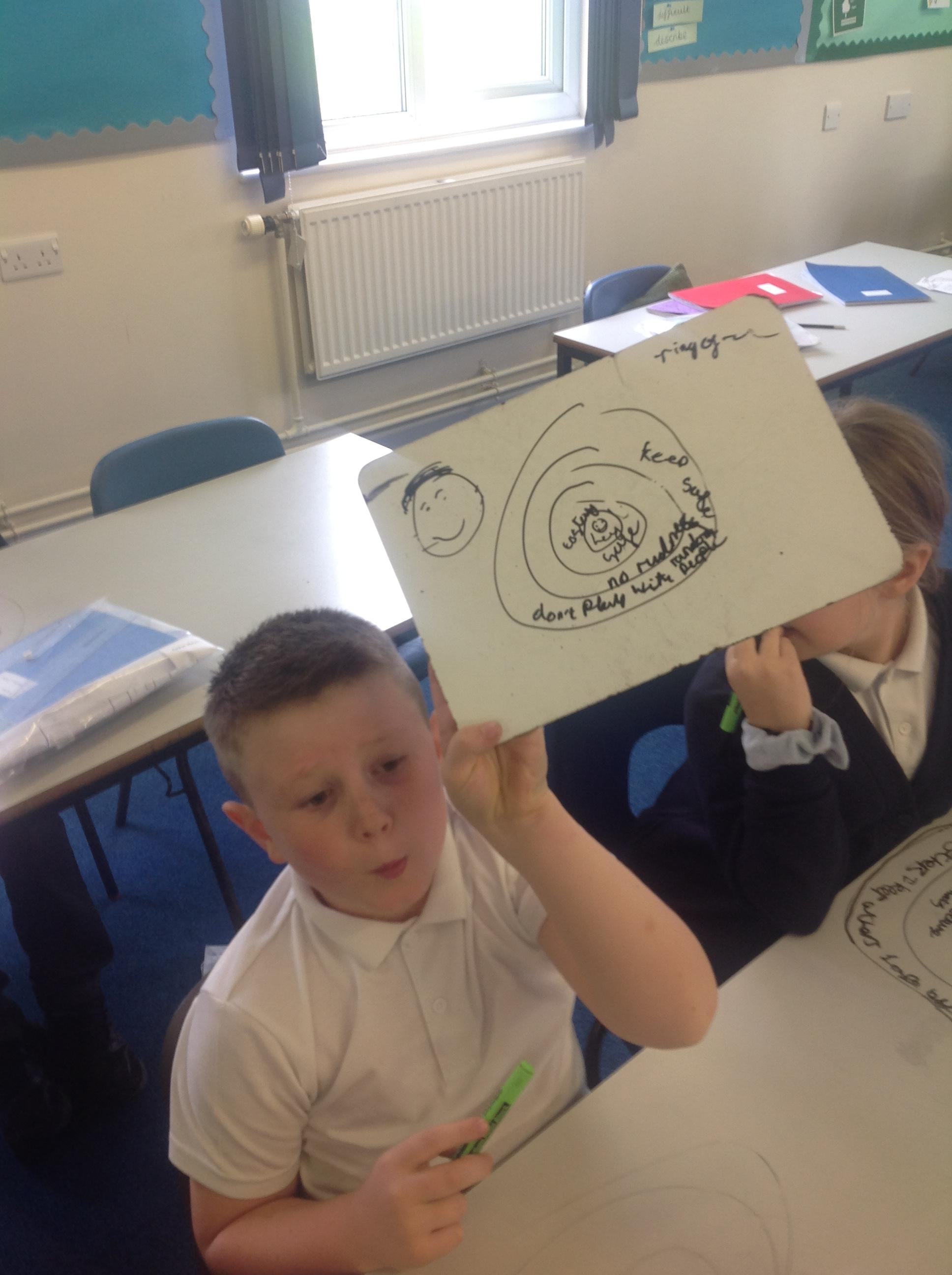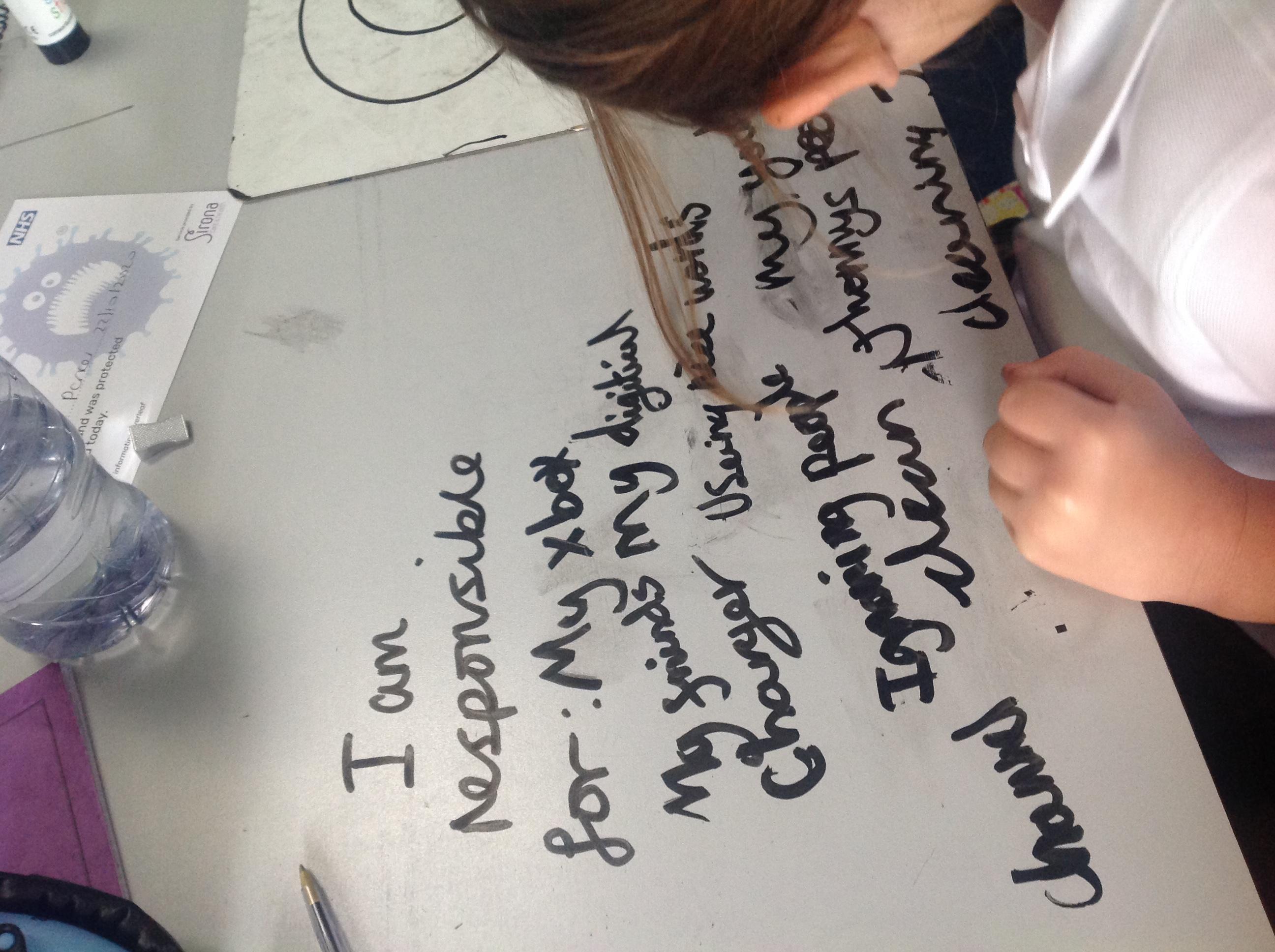 In online safety, we learned what it means to be a responsible digital citizen means and how we can be responsible in the digital world. We discussed what it meant by being a digital citizen to start with and what responsibility means. We then created 'Rings of Responsibility' on our whiteboards to show what we were responsible for, what we were responsible for in our community and in our world.