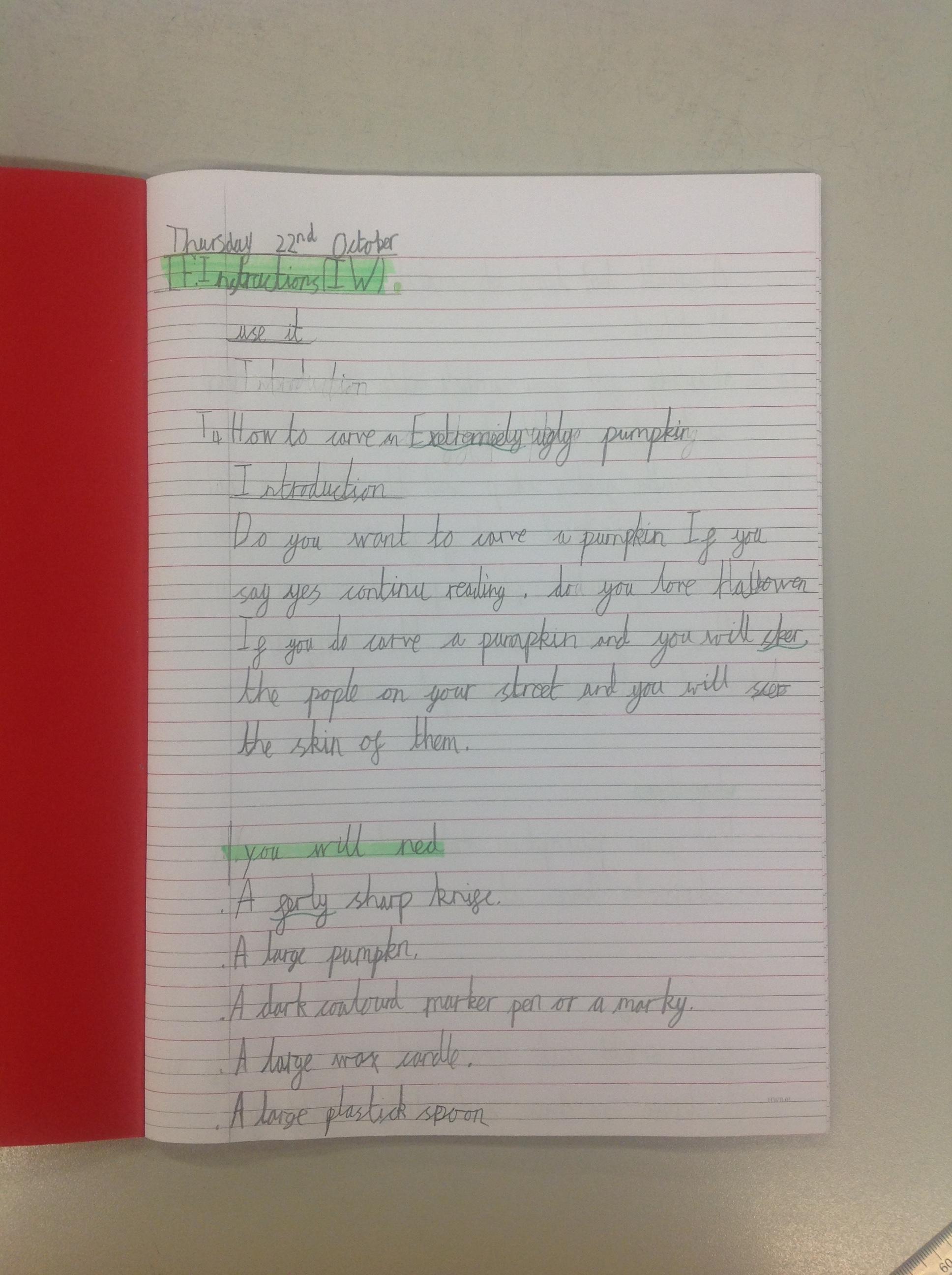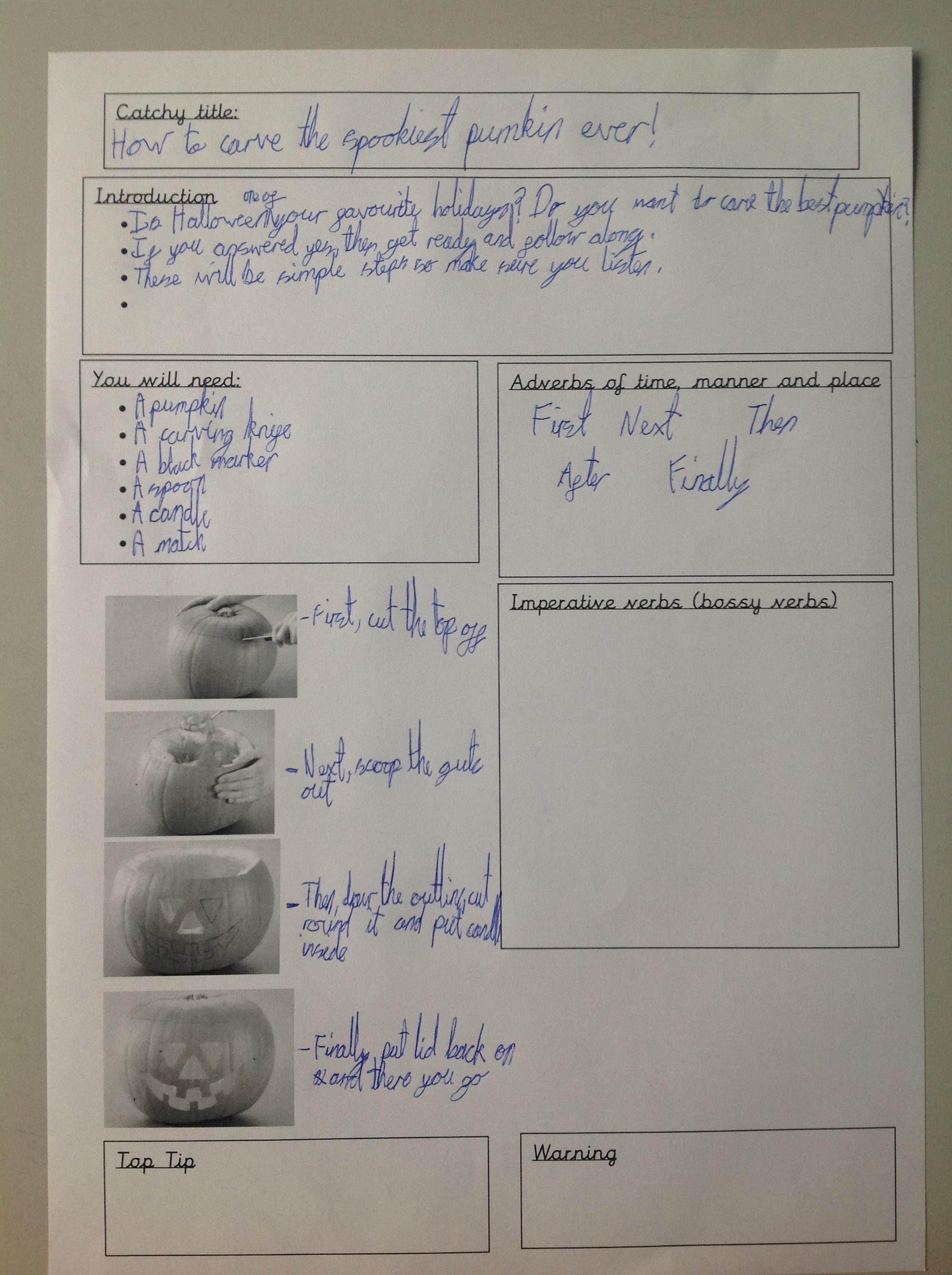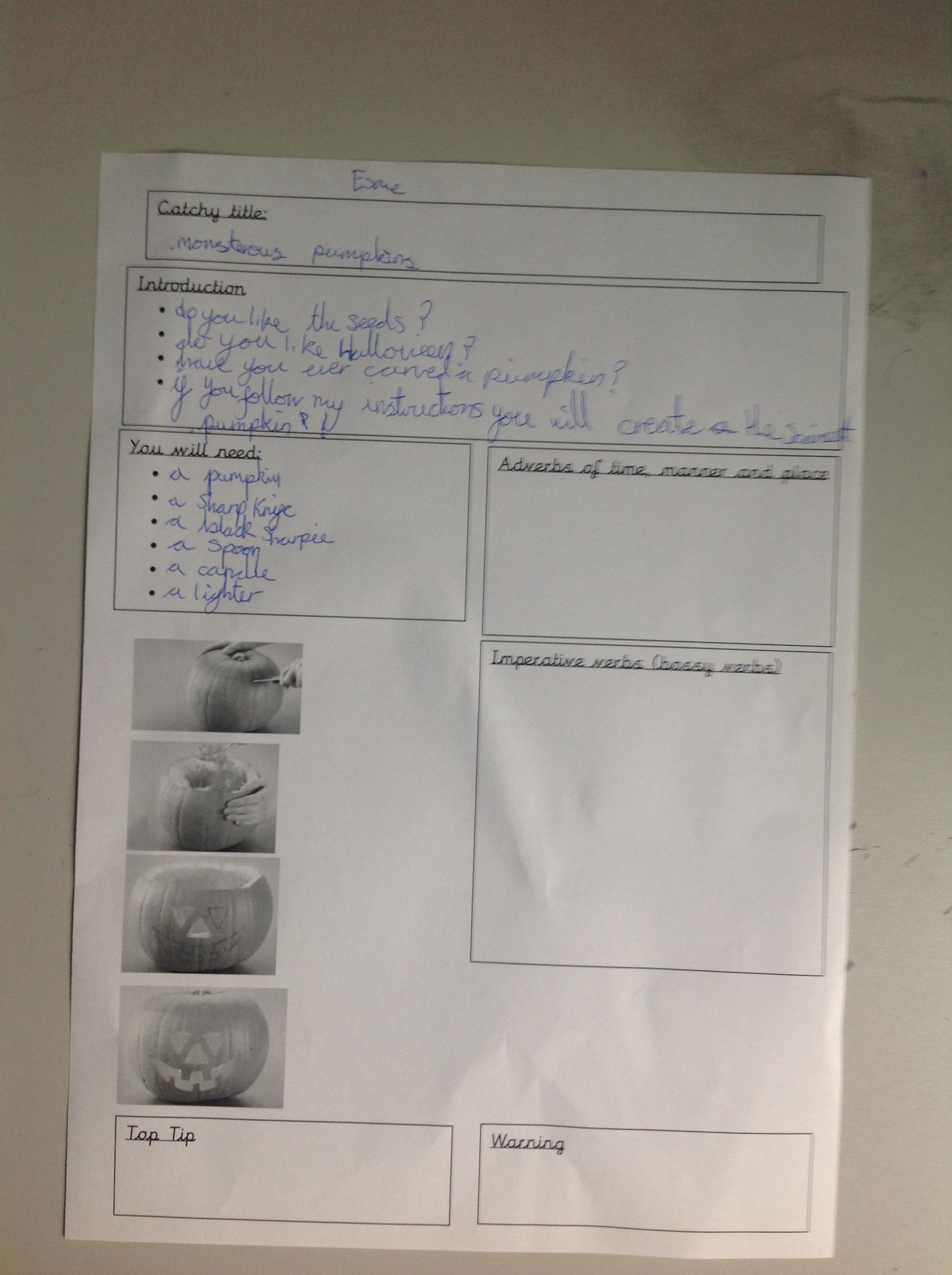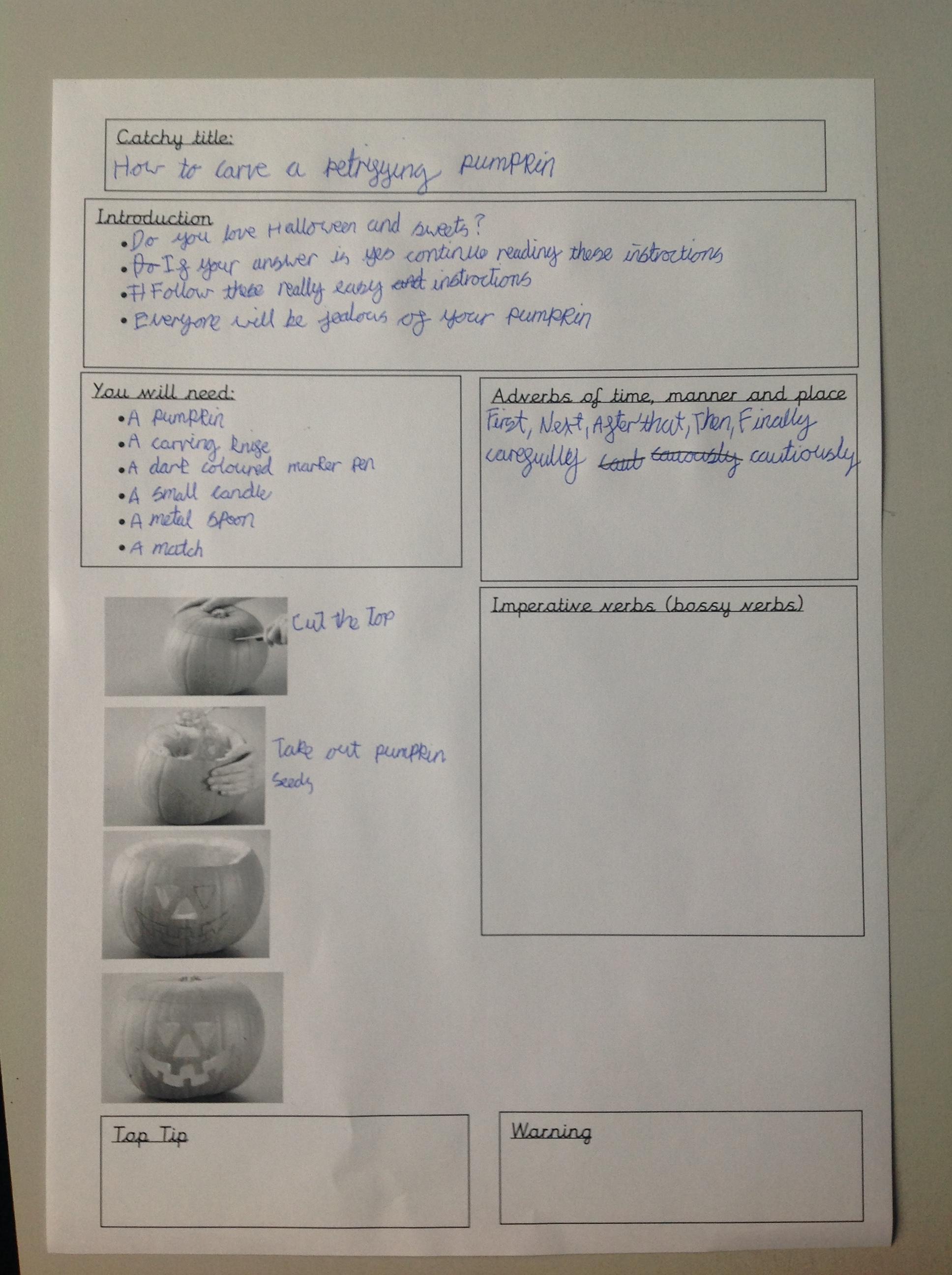 This week, we have been planning and then writing our own set of instructions on how to carve a spooky pumpkin. We thoroughly enjoyed writing this with Halloween coming up soon! The first thing we did was discuss why we have instructions and what we use them for.Then we looked at a range of instructions and what features they all had. After that, we got planning. To support our learning, we watched a video of someone carving a pumpkin and used this to write our method.