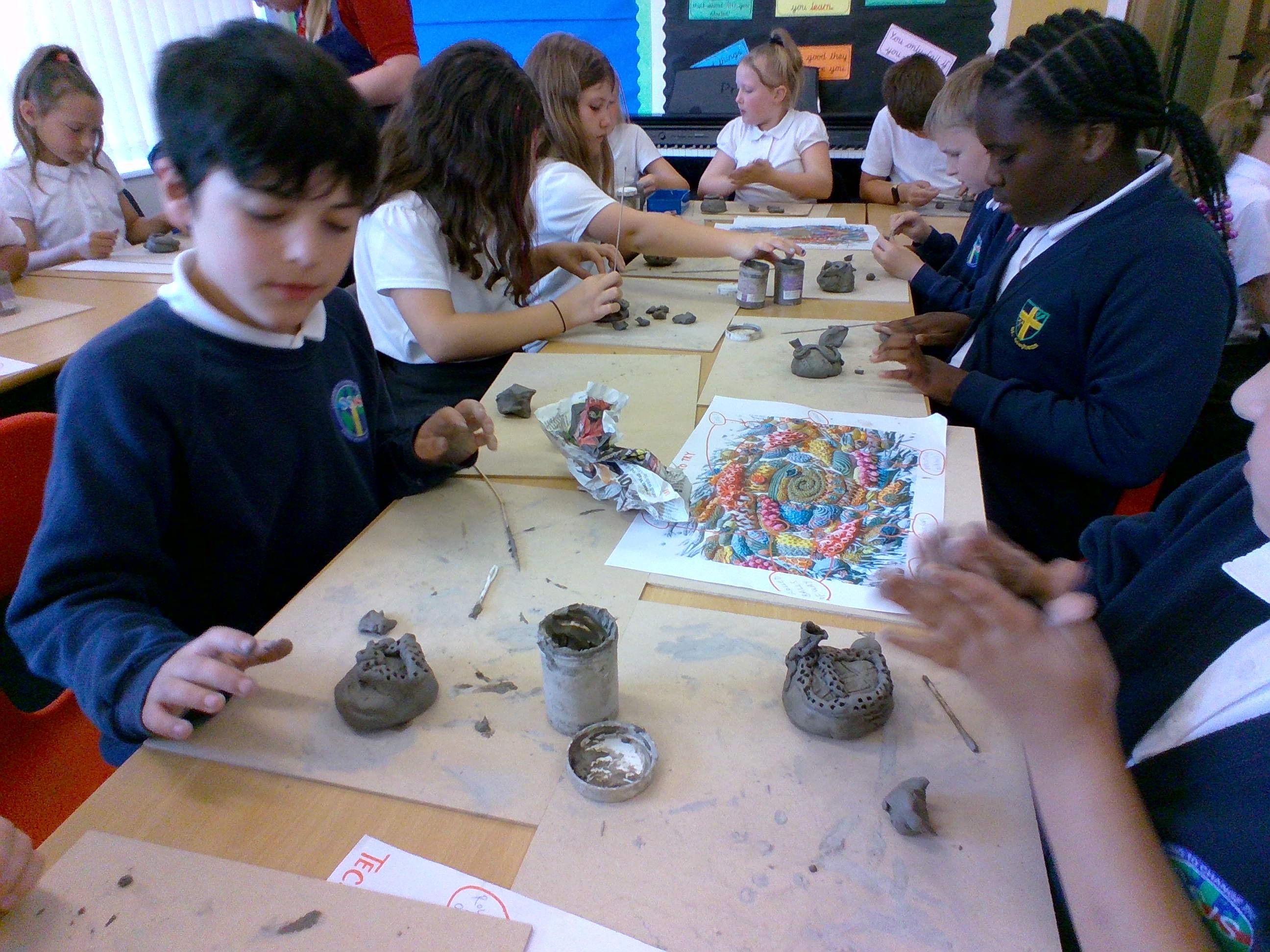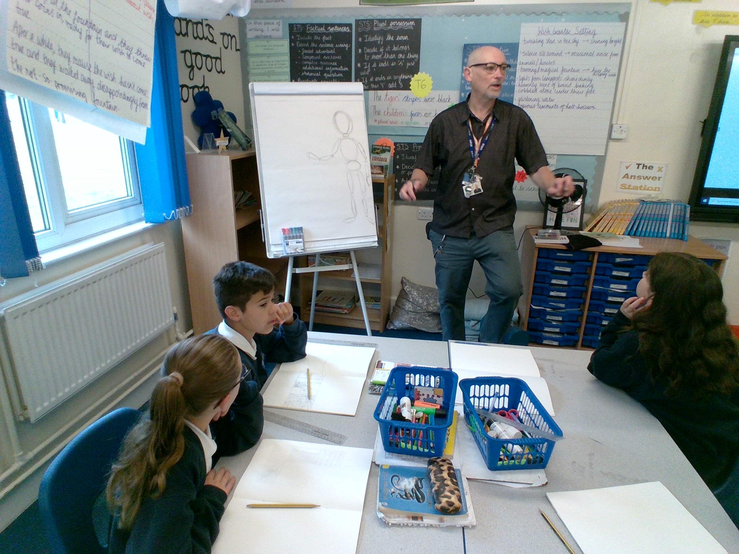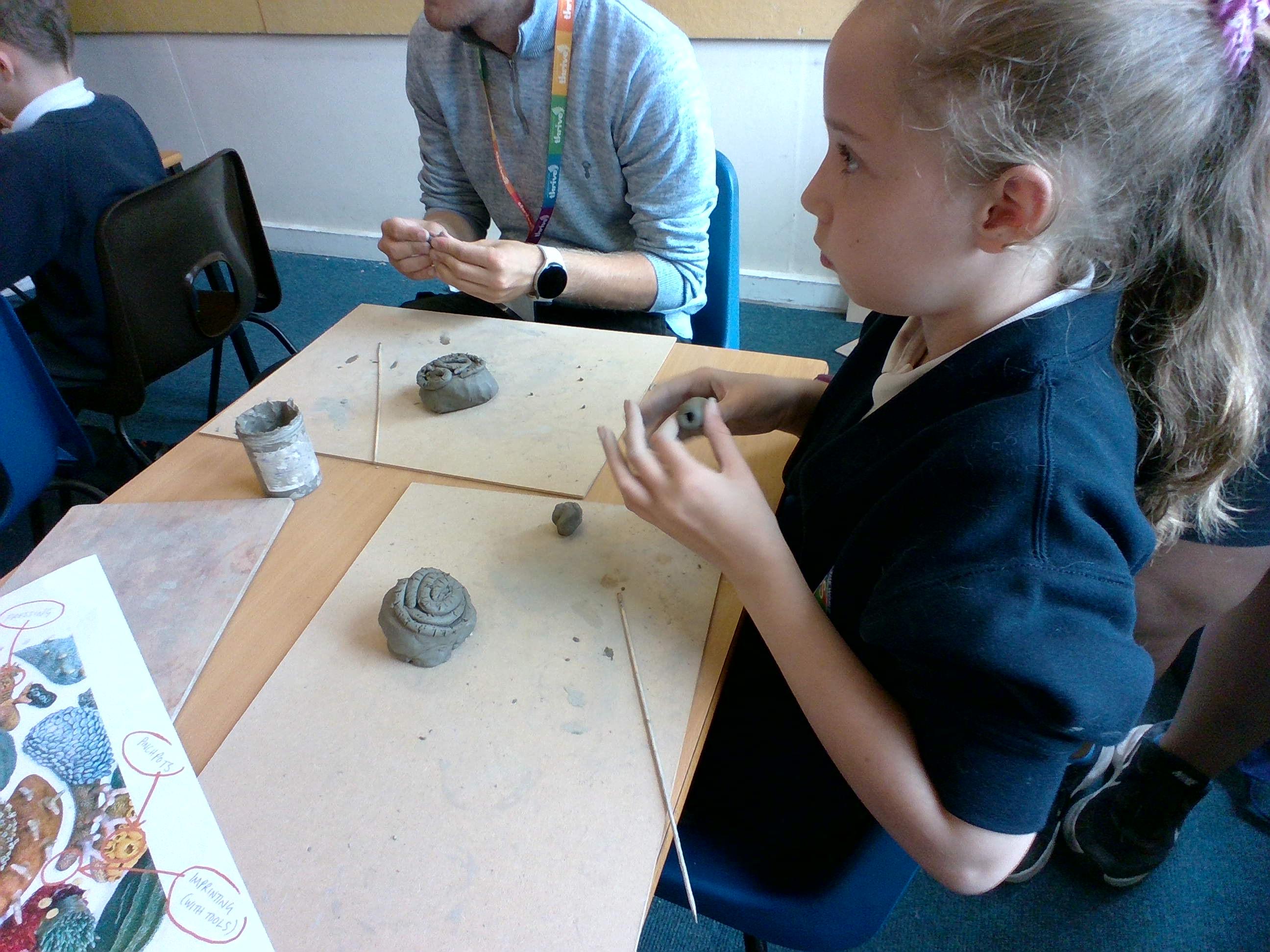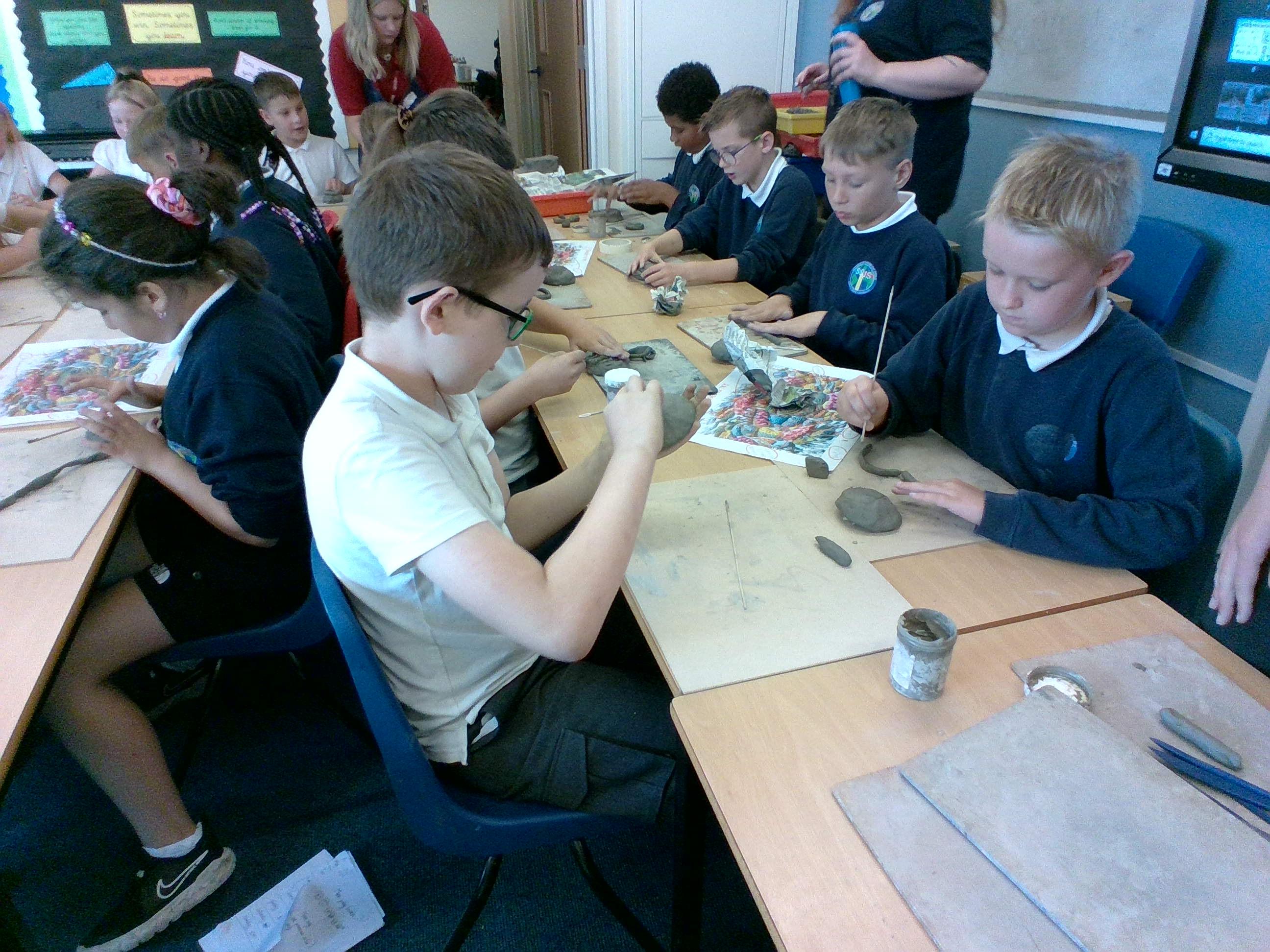 This week we have been artists and practising our drawing skills. We were lucky enough to be joined by Mr Taylor who taught us how to draw cartoons and he explained that most drawings, especially cartoons can be broken down into smaller, simple shapes. This helped us create our own cartoon people and then we followed some videos explaining how to draw cartoon animals and buildings. We also used nature to create art inspired by the artist Andy Goldsworthy! We also had a visit from Mangotsfield Secondary School and their Year 9 students, show taught us new pottery skills, making a coral sculpture from clay!