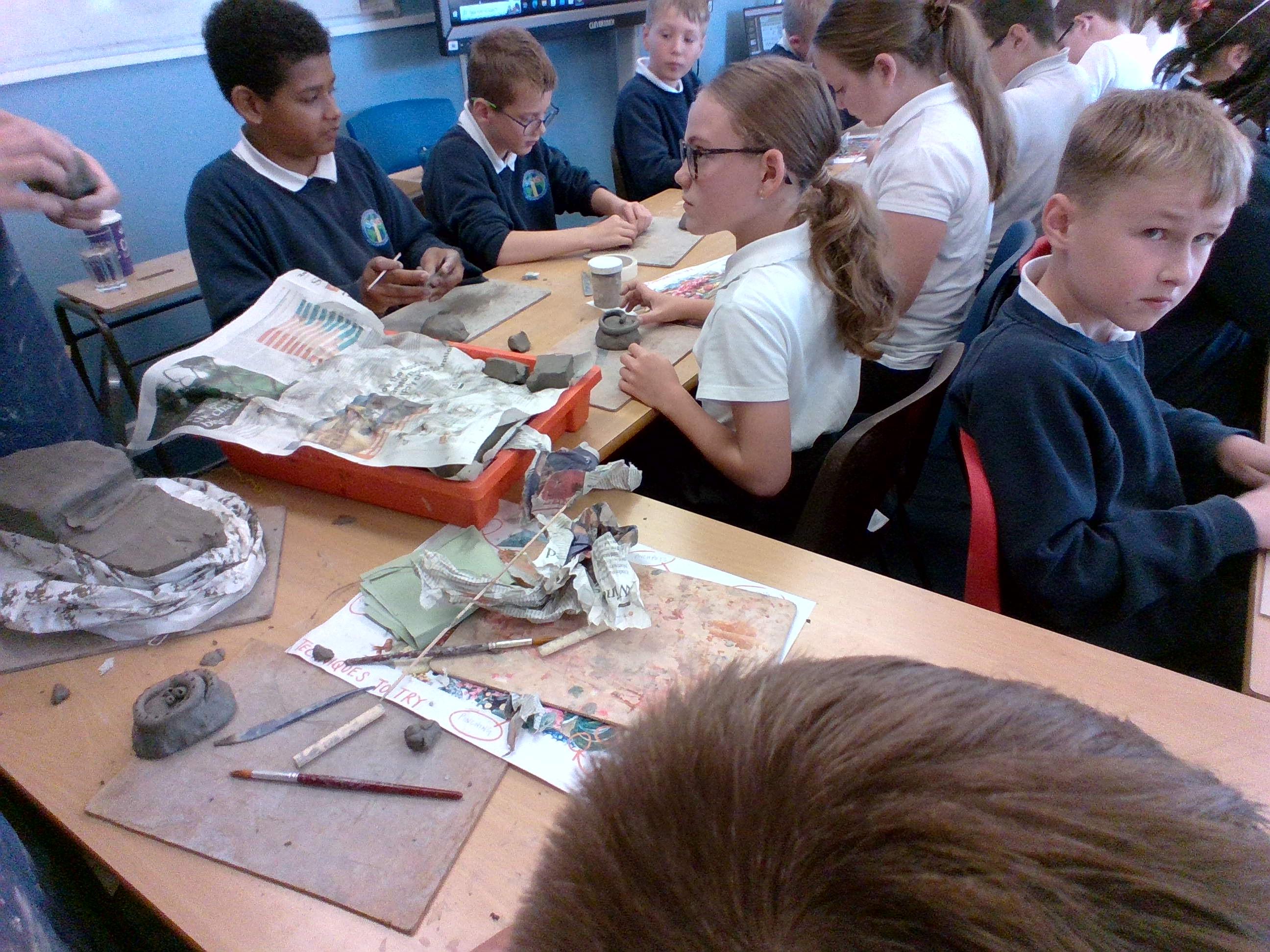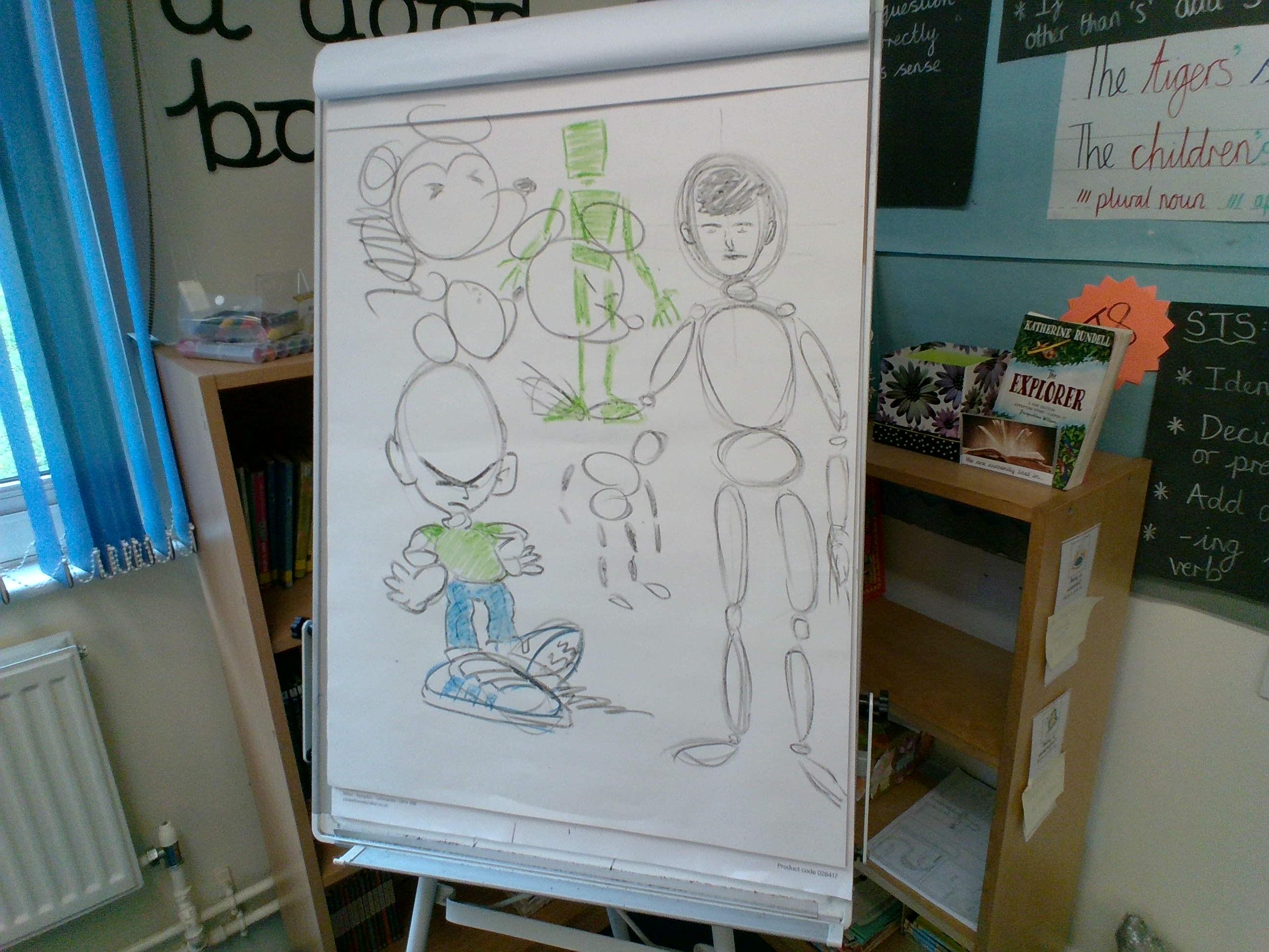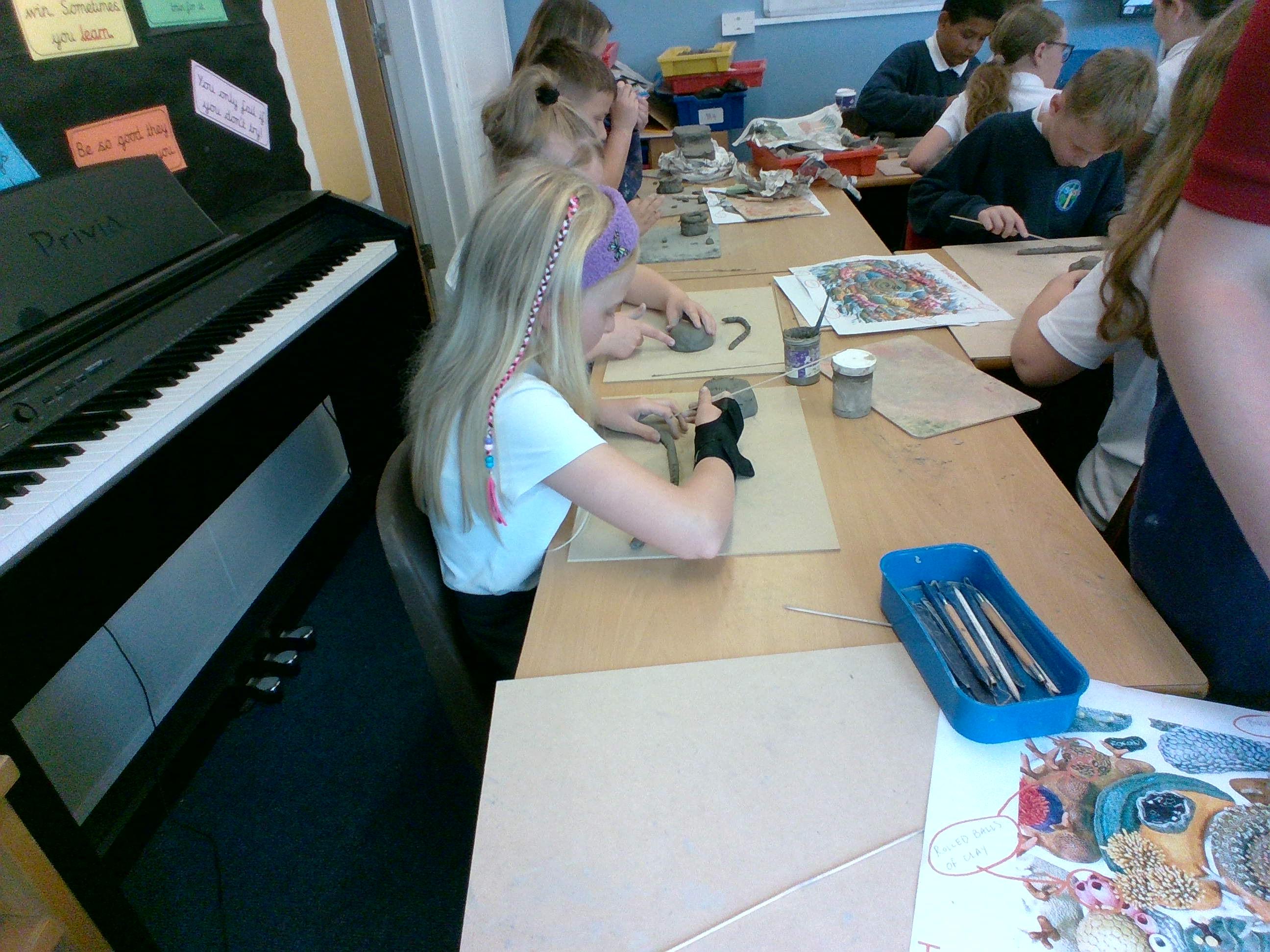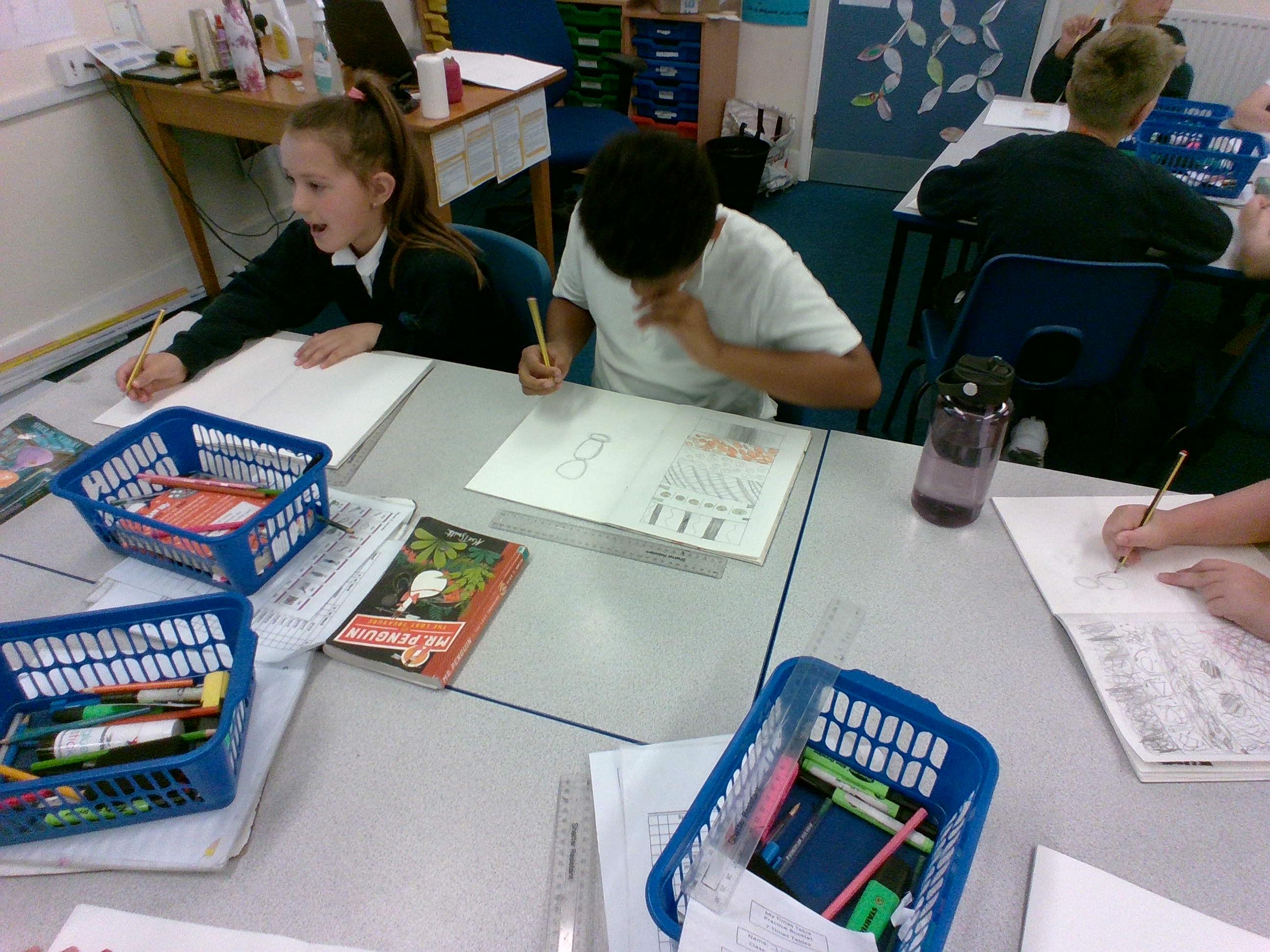 This week we have been artists and practising our drawing skills. We were lucky enough to be joined by Mr Taylor who taught us how to draw cartoons and he explained that most drawings, especially cartoons can be broken down into smaller, simple shapes. This helped us create our own cartoon people and then we followed some videos explaining how to draw cartoon animals and buildings. We also used nature to create art inspired by the artist Andy Goldsworthy! We also had a visit from Mangotsfield Secondary School and their Year 9 students, show taught us new pottery skills, making a coral sculpture from clay!
