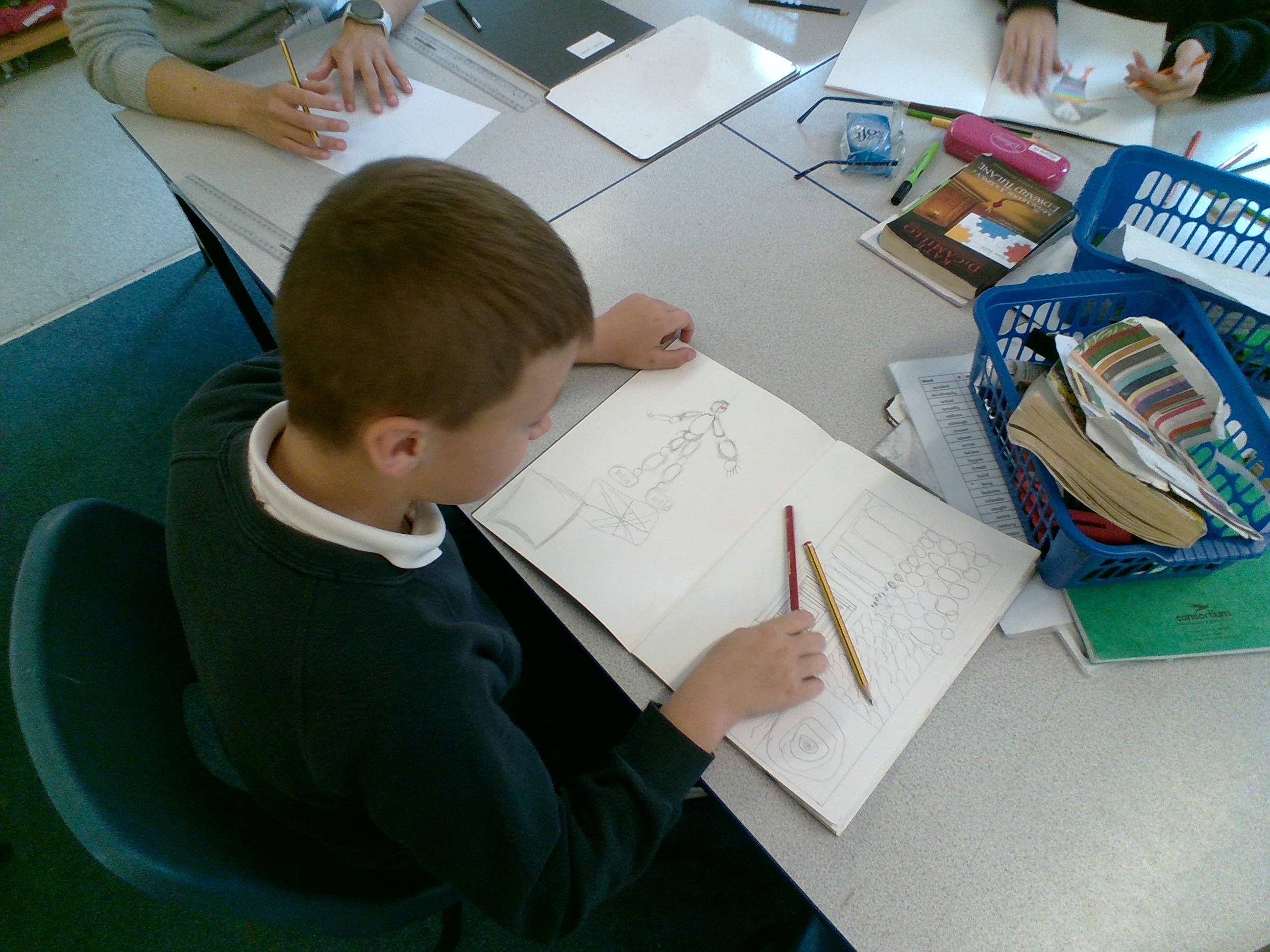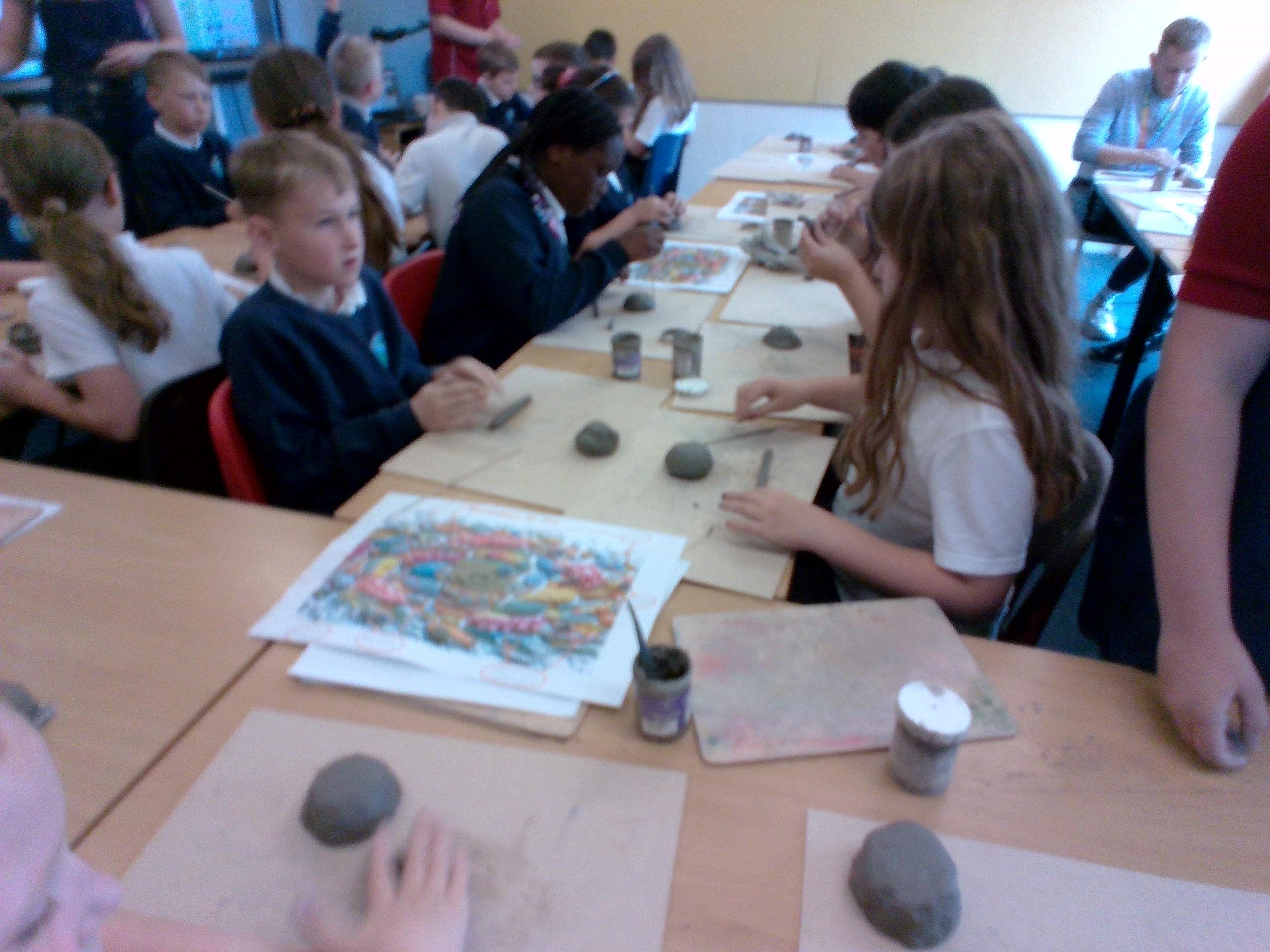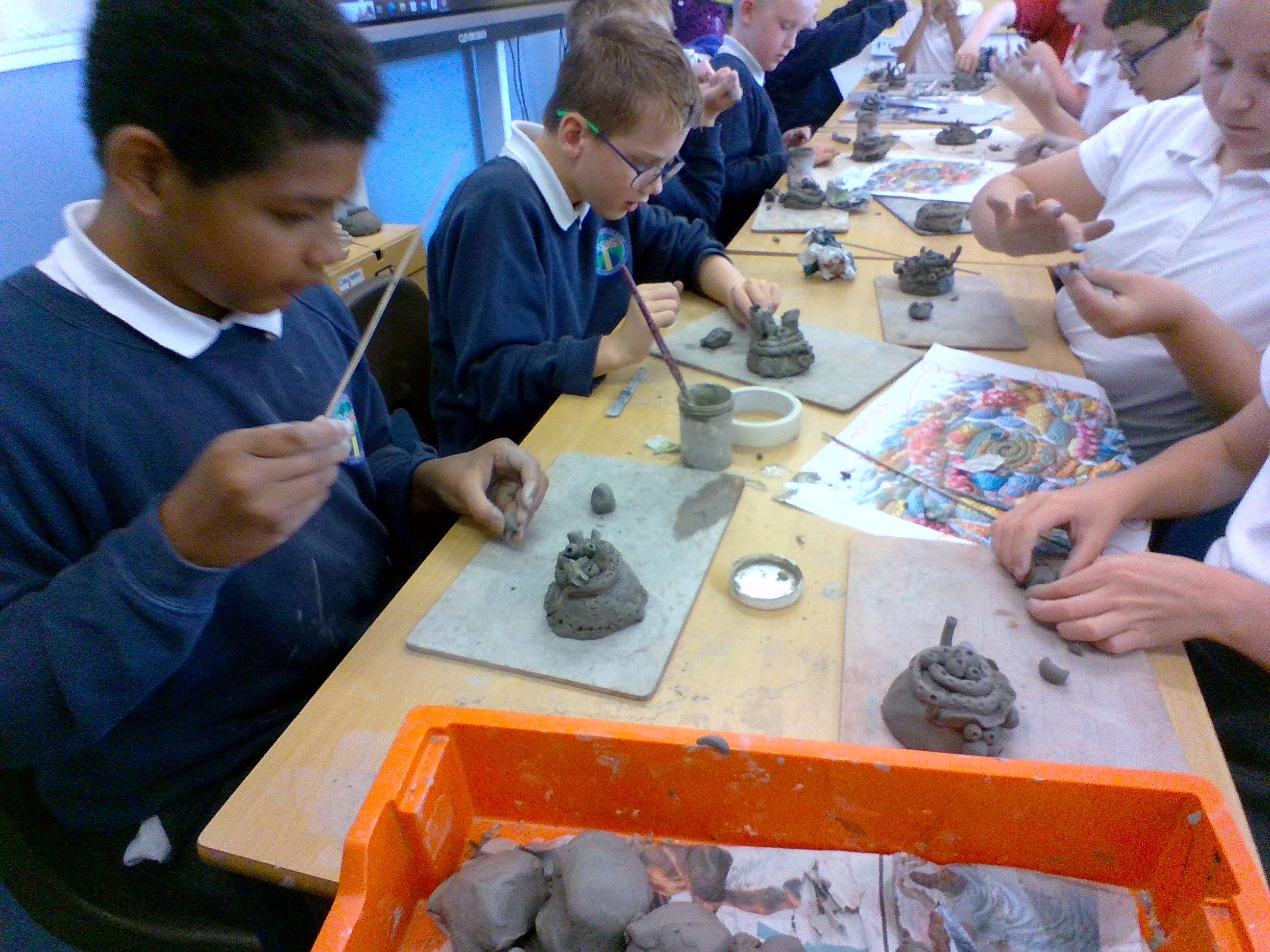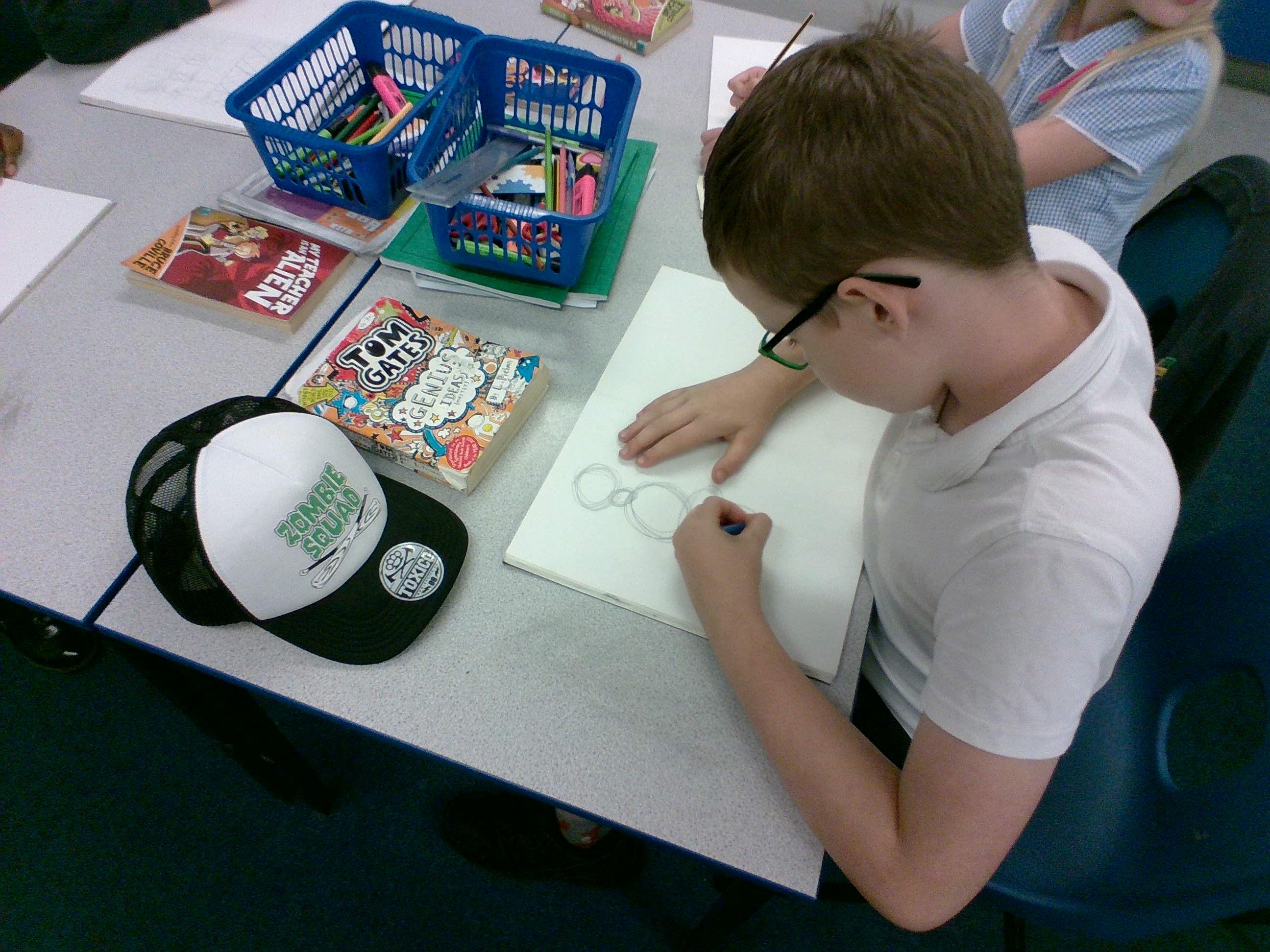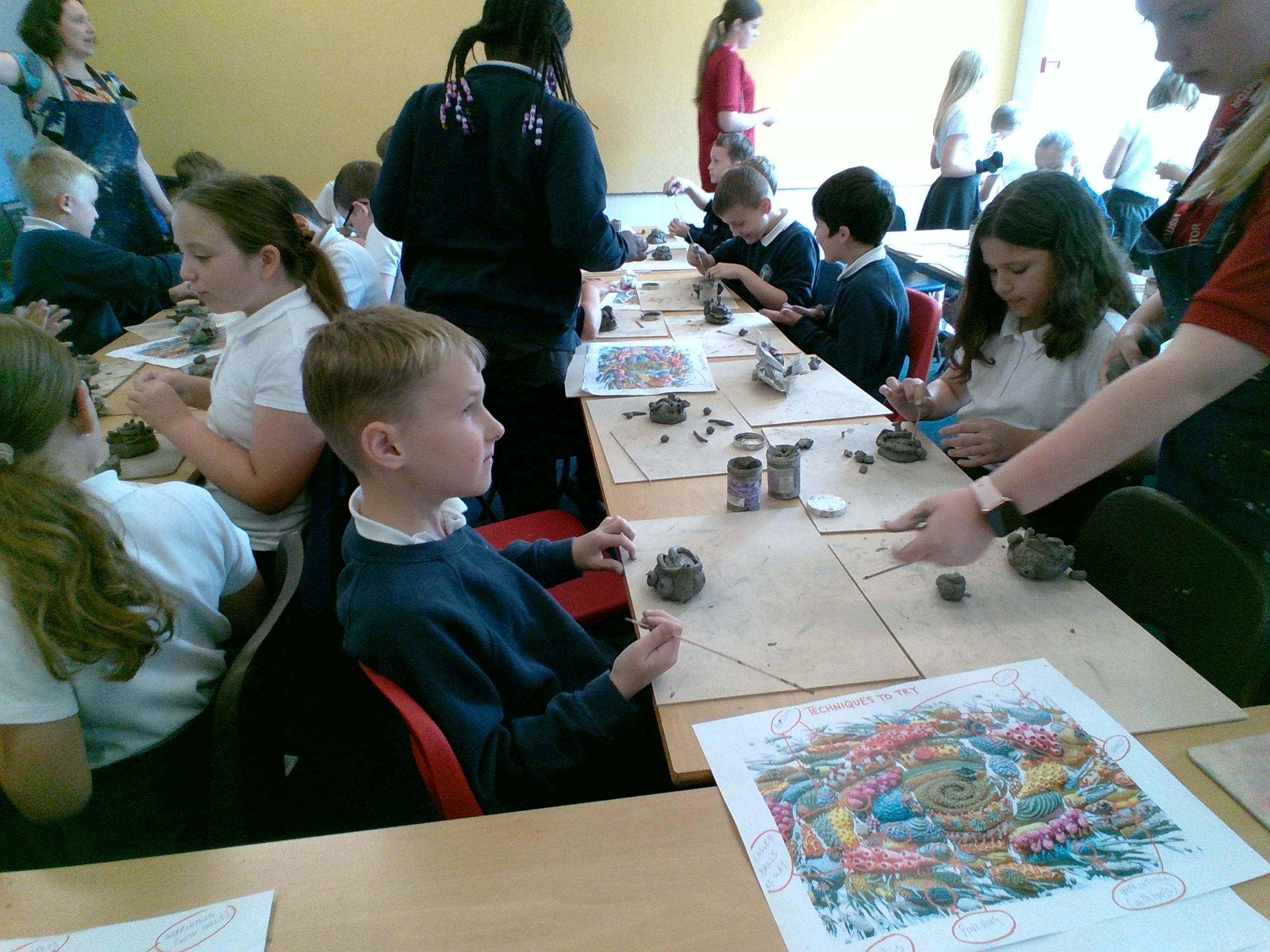 This week we have been artists and practising our drawing skills. We were lucky enough to be joined by Mr Taylor who taught us how to draw cartoons and he explained that most drawings, especially cartoons can be broken down into smaller, simple shapes. This helped us create our own cartoon people and then we followed some videos explaining how to draw cartoon animals and buildings. We also used nature to create art inspired by the artist Andy Goldsworthy! We also had a visit from Mangotsfield Secondary School and their Year 9 students, show taught us new pottery skills, making a coral sculpture from clay!