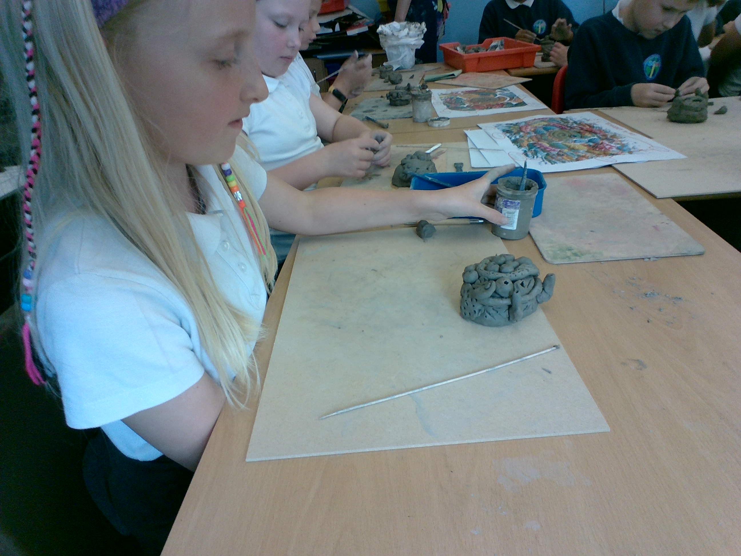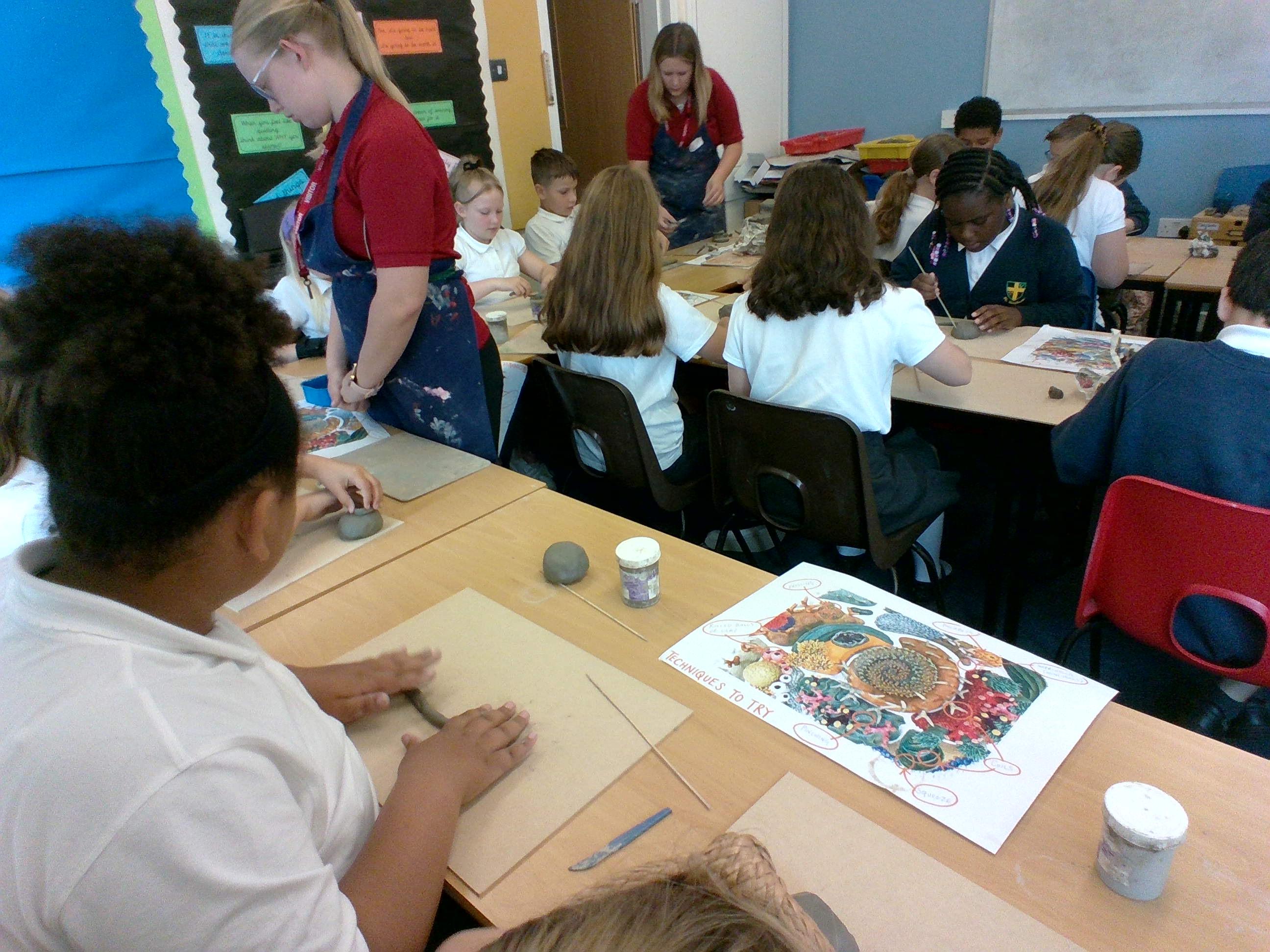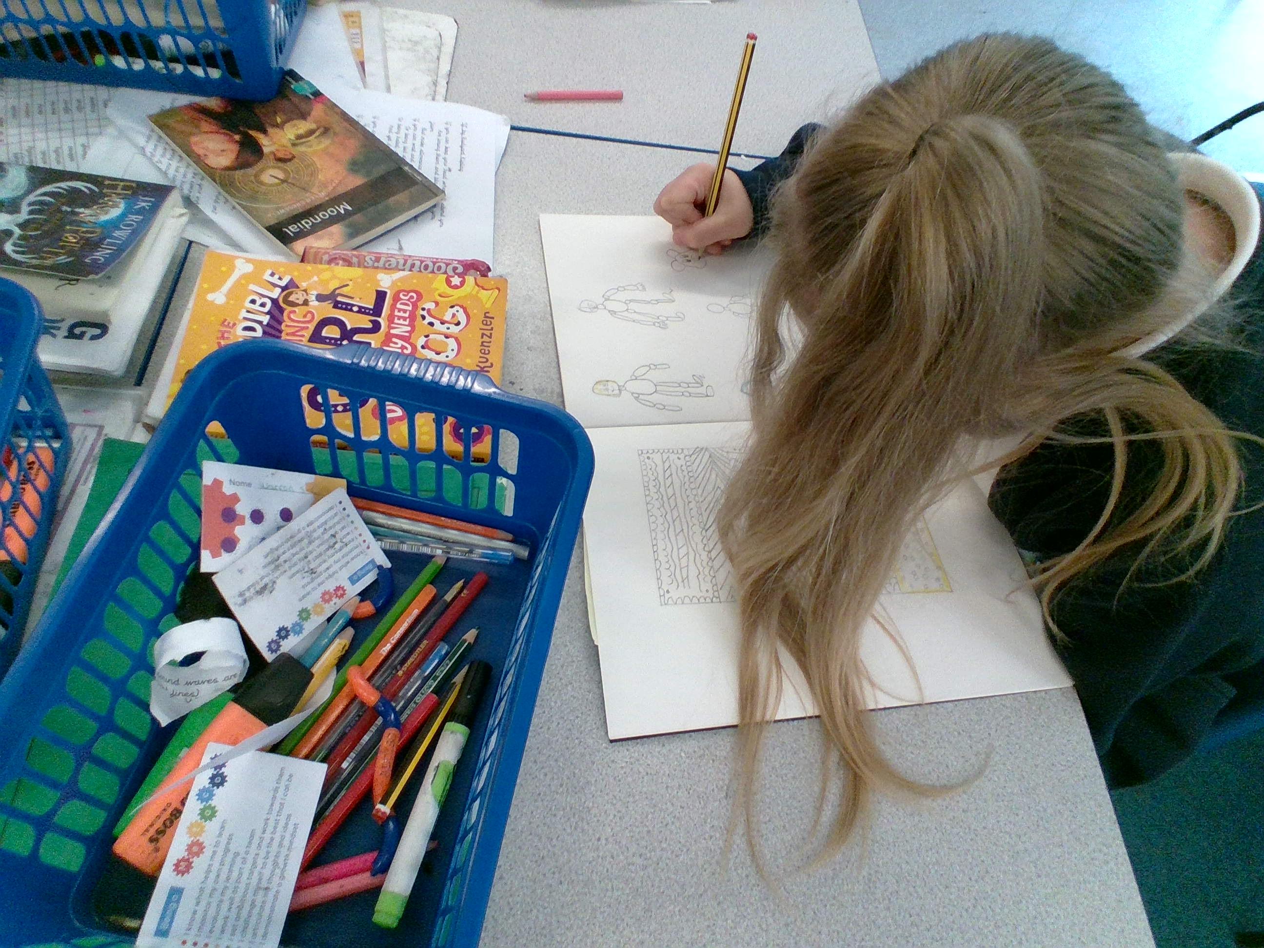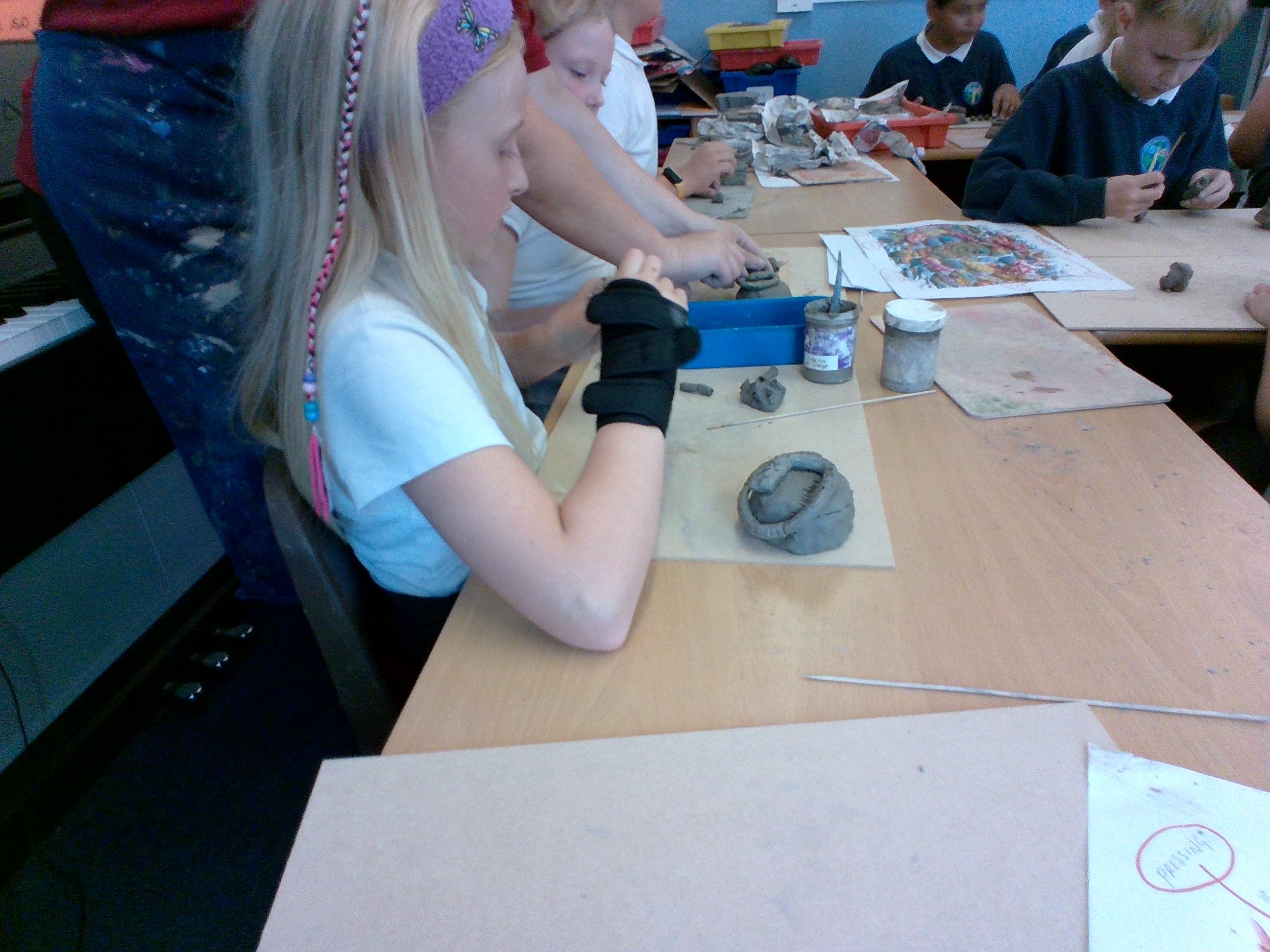 This week we have been artists and practising our drawing skills. We were lucky enough to be joined by Mr Taylor who taught us how to draw cartoons and he explained that most drawings, especially cartoons can be broken down into smaller, simple shapes. This helped us create our own cartoon people and then we followed some videos explaining how to draw cartoon animals and buildings. We also used nature to create art inspired by the artist Andy Goldsworthy! We also had a visit from Mangotsfield Secondary School and their Year 9 students, show taught us new pottery skills, making a coral sculpture from clay!