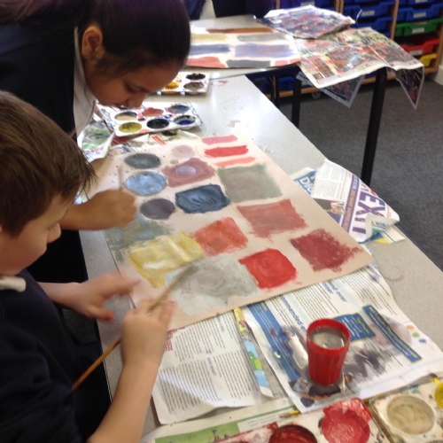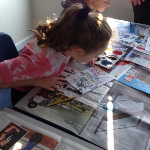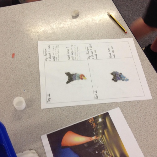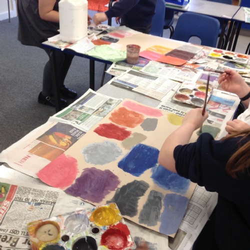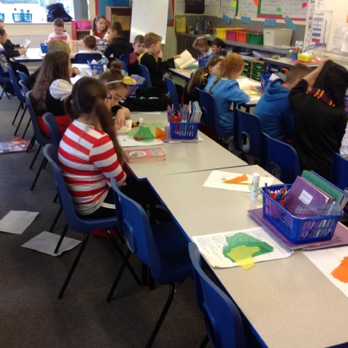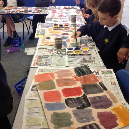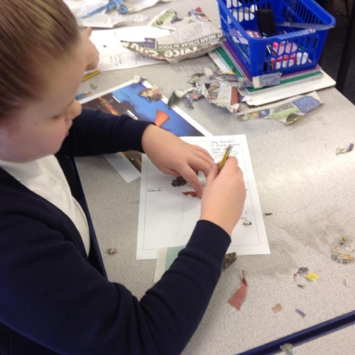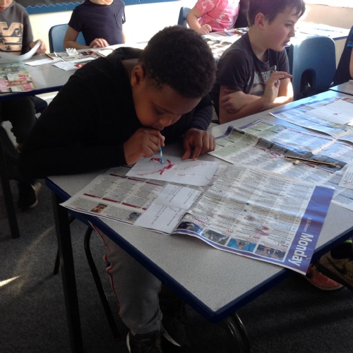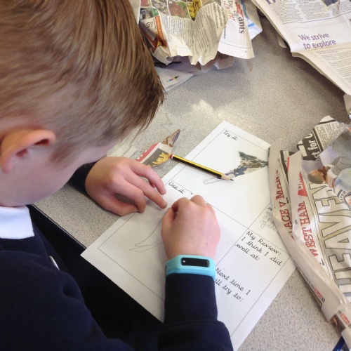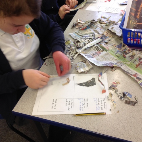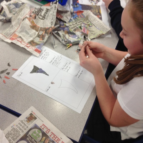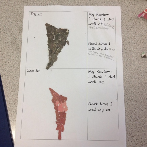 We drew one of the horns that form part of this amazing piece of engineering. Used one colour of newspaper to build up the shades of the horn. Once we had finished the ‘Try it’ stage, we reviewed what we had done and looked for ways to improve our next ‘Use it’ attempt. Shortly, we will use the painted colour palettes to create our final collage piece.