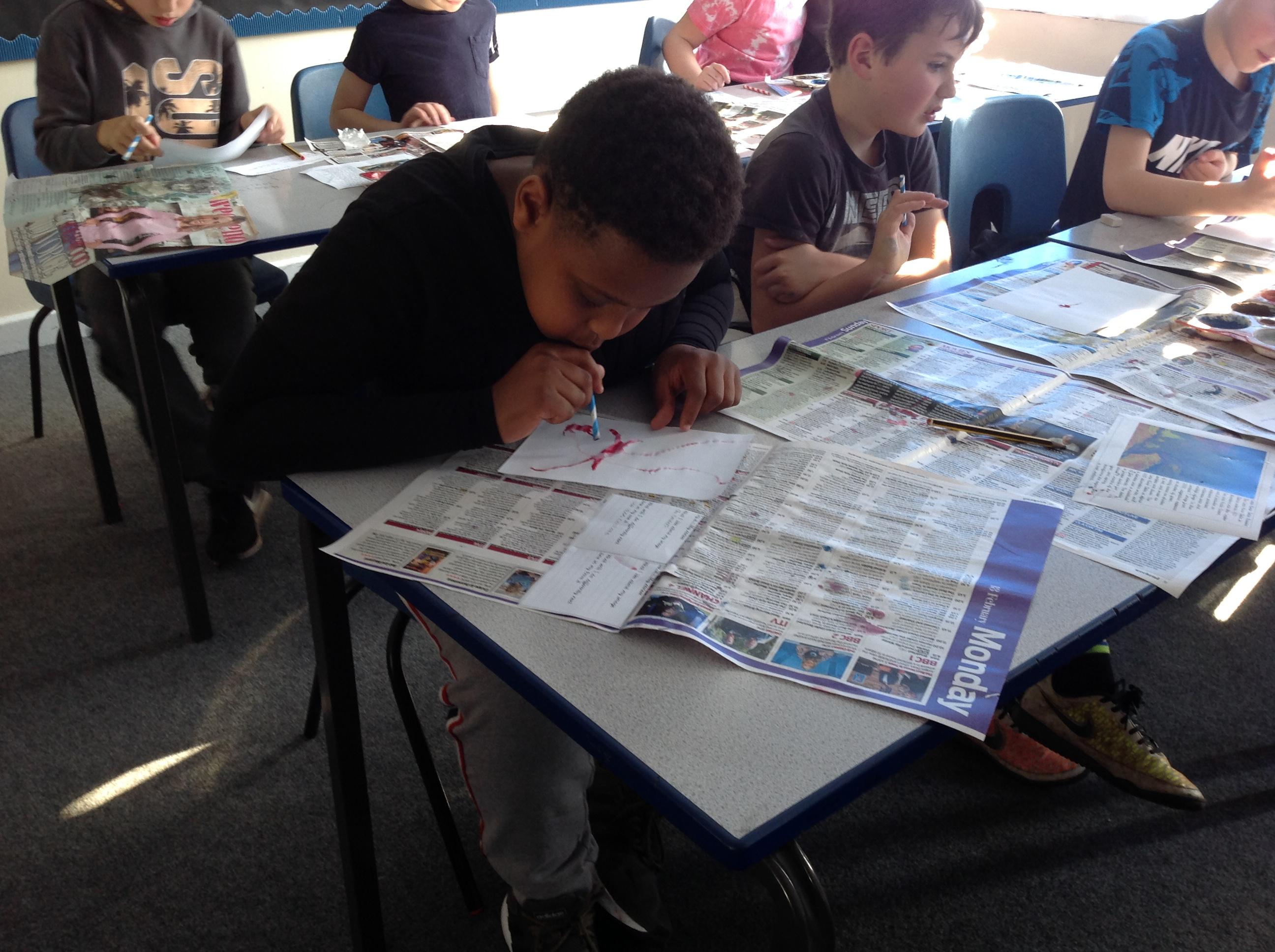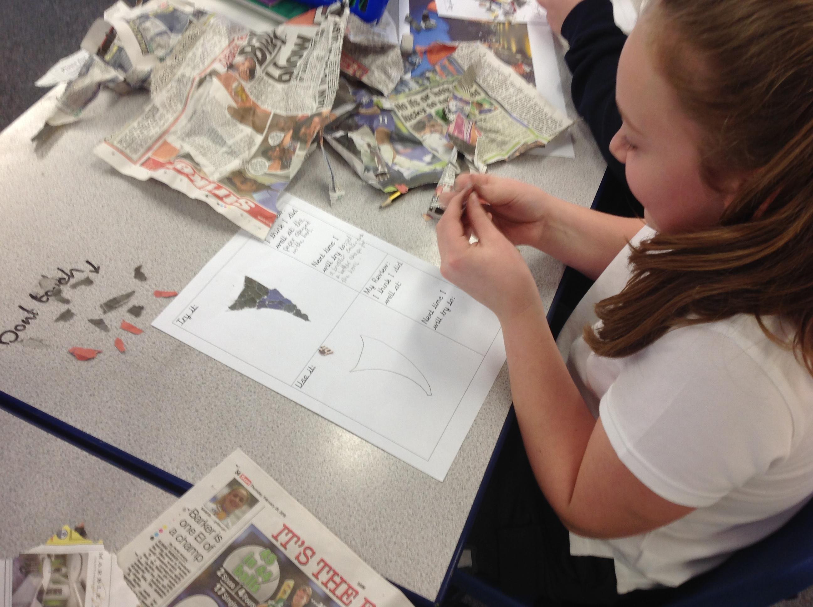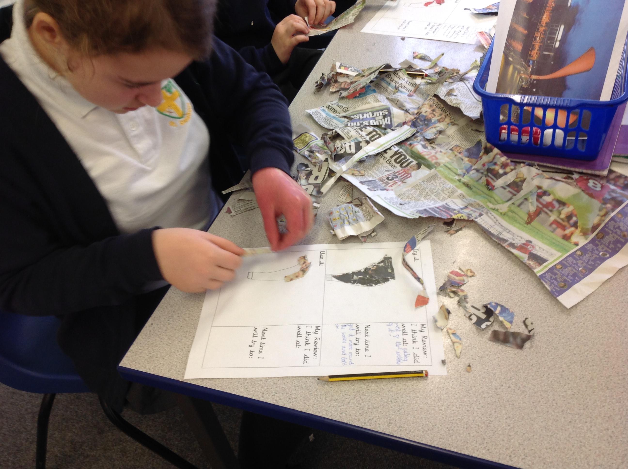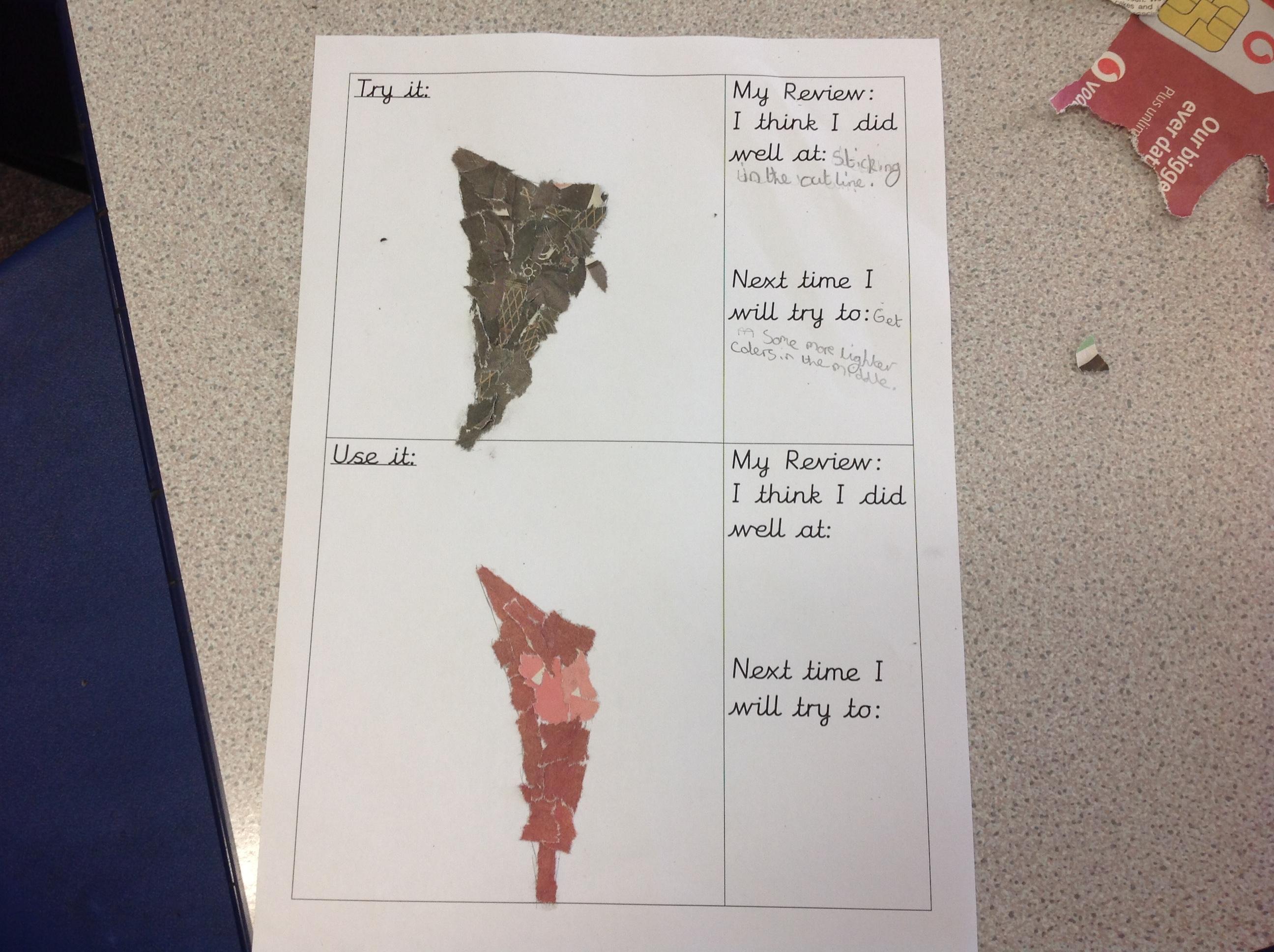 We drew one of the horns that form part of this amazing piece of engineering. Used one colour of newspaper to build up the shades of the horn. Once we had finished the ‘Try it’ stage, we reviewed what we had done and looked for ways to improve our next ‘Use it’ attempt.  Shortly, we will use the painted colour palettes to create our final collage piece.