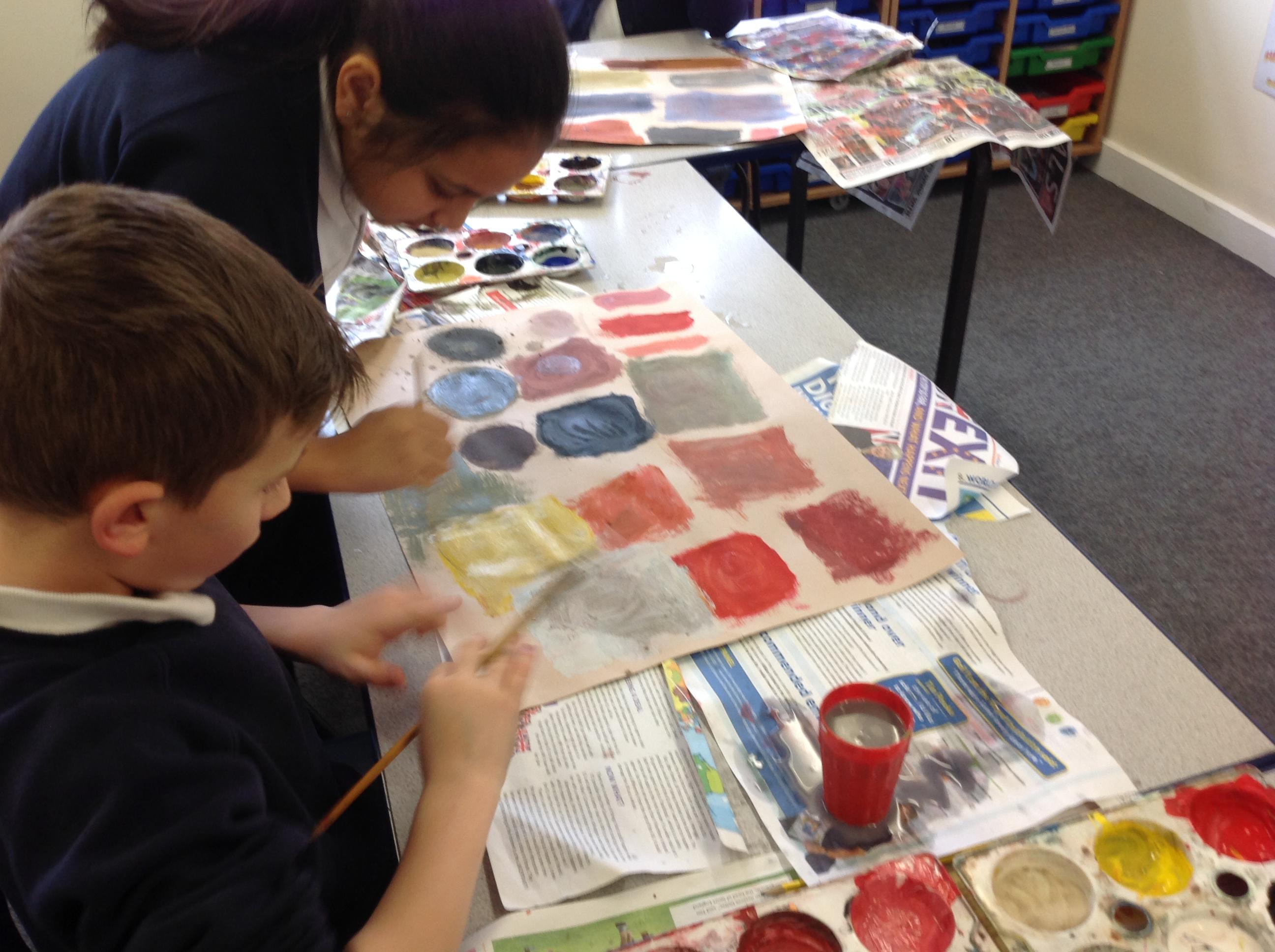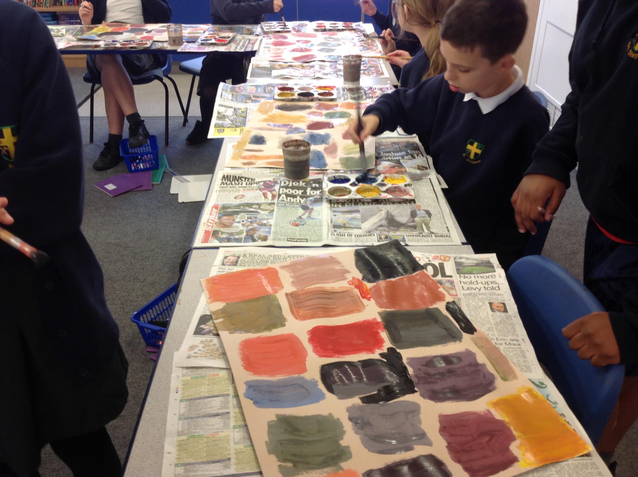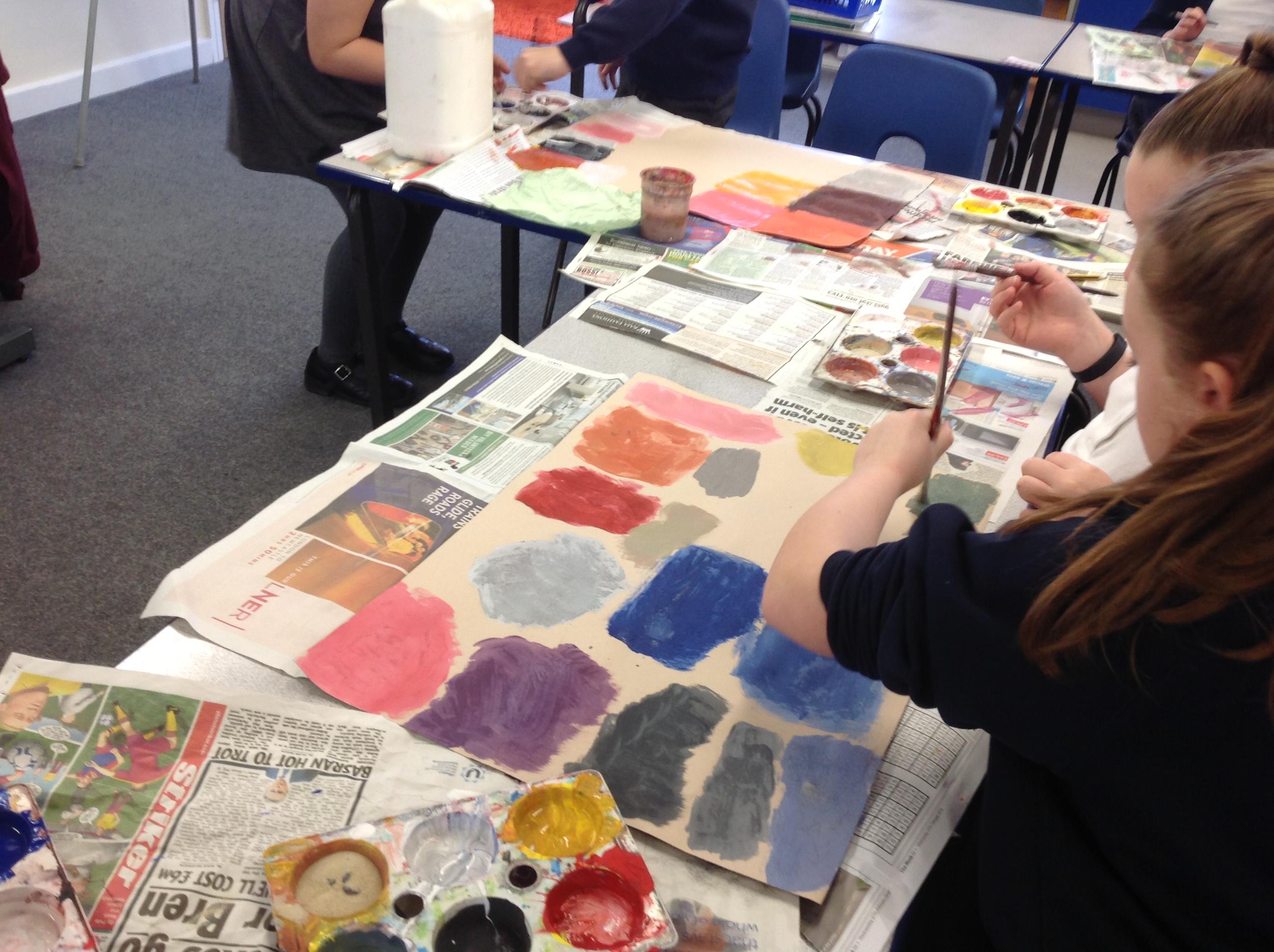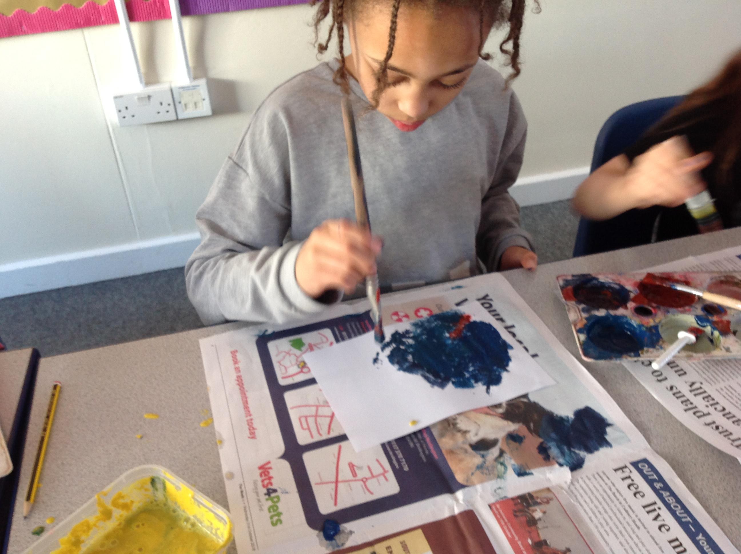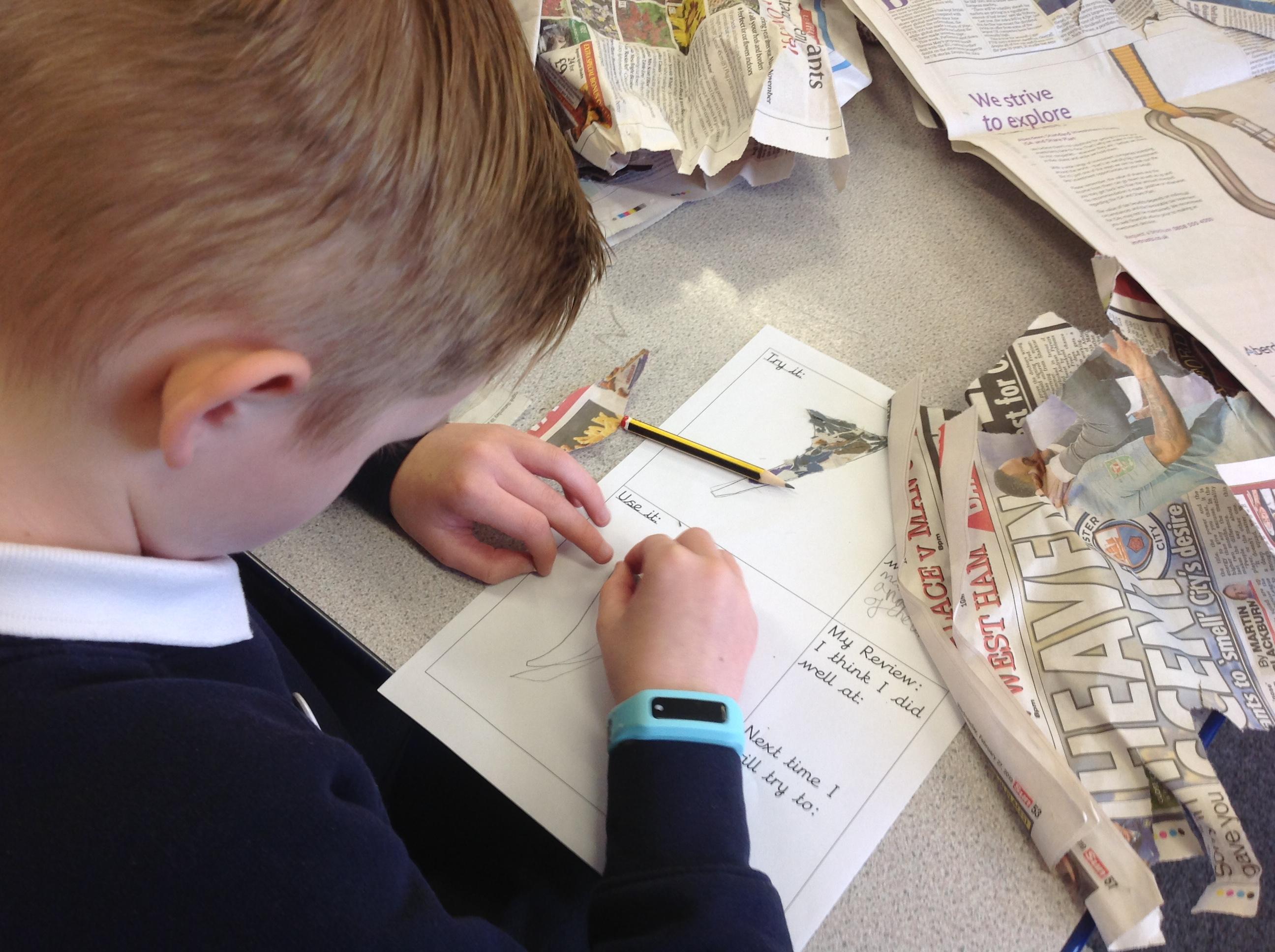 We drew one of the horns that form part of this amazing piece of engineering. Used one colour of newspaper to build up the shades of the horn. Once we had finished the ‘Try it’ stage, we reviewed what we had done and looked for ways to improve our next ‘Use it’ attempt.  Shortly, we will use the painted colour palettes to create our final collage piece.