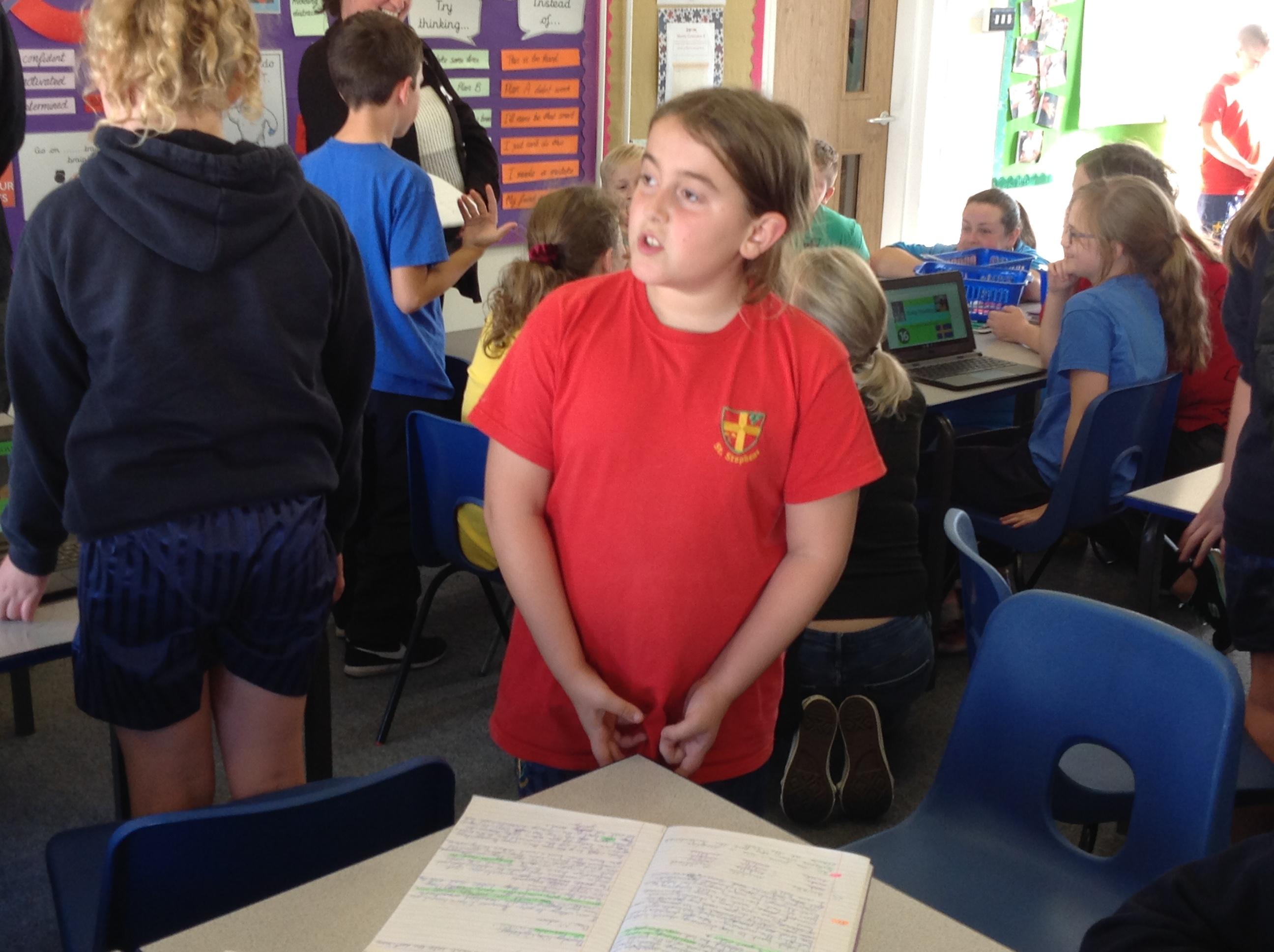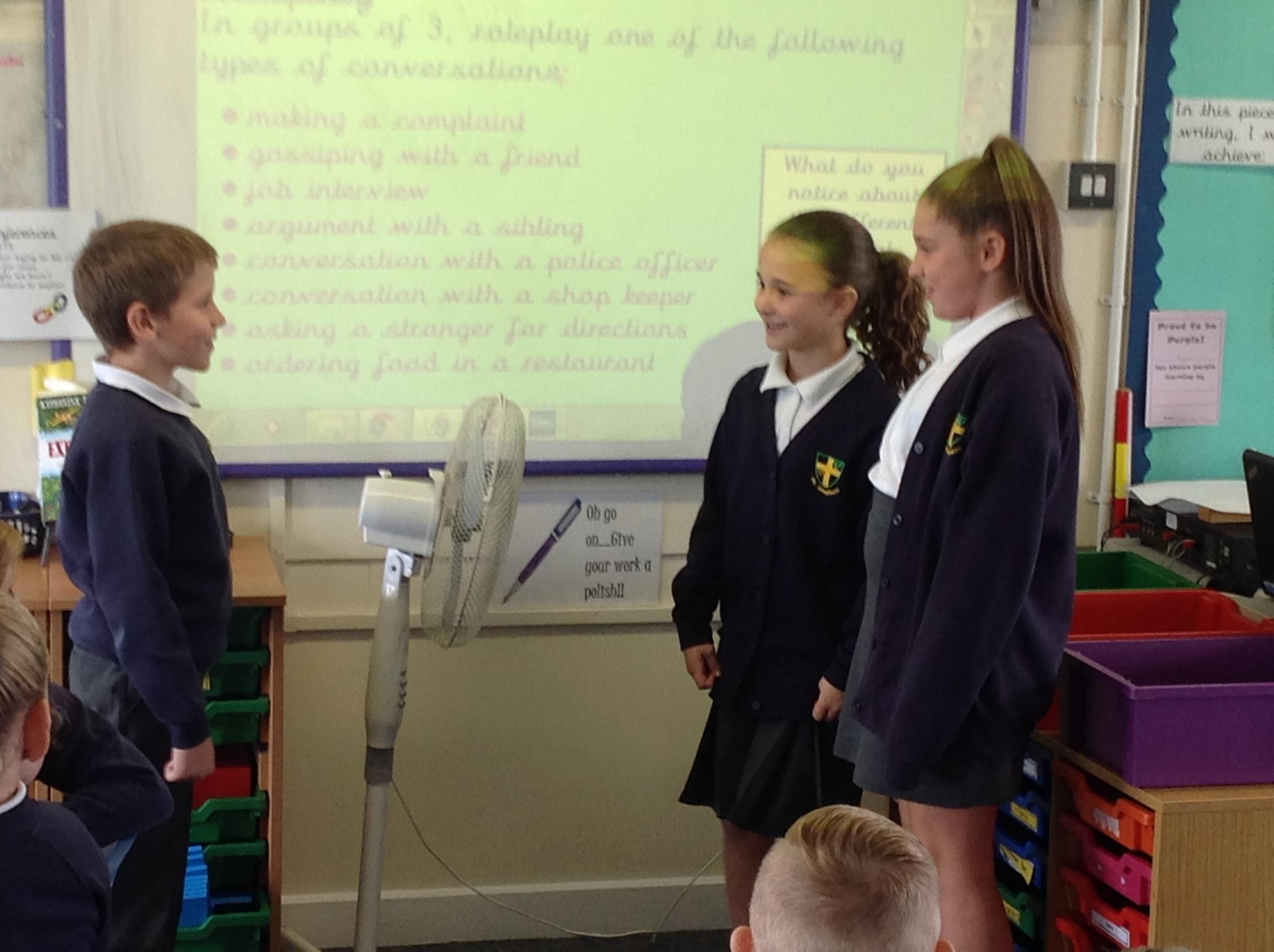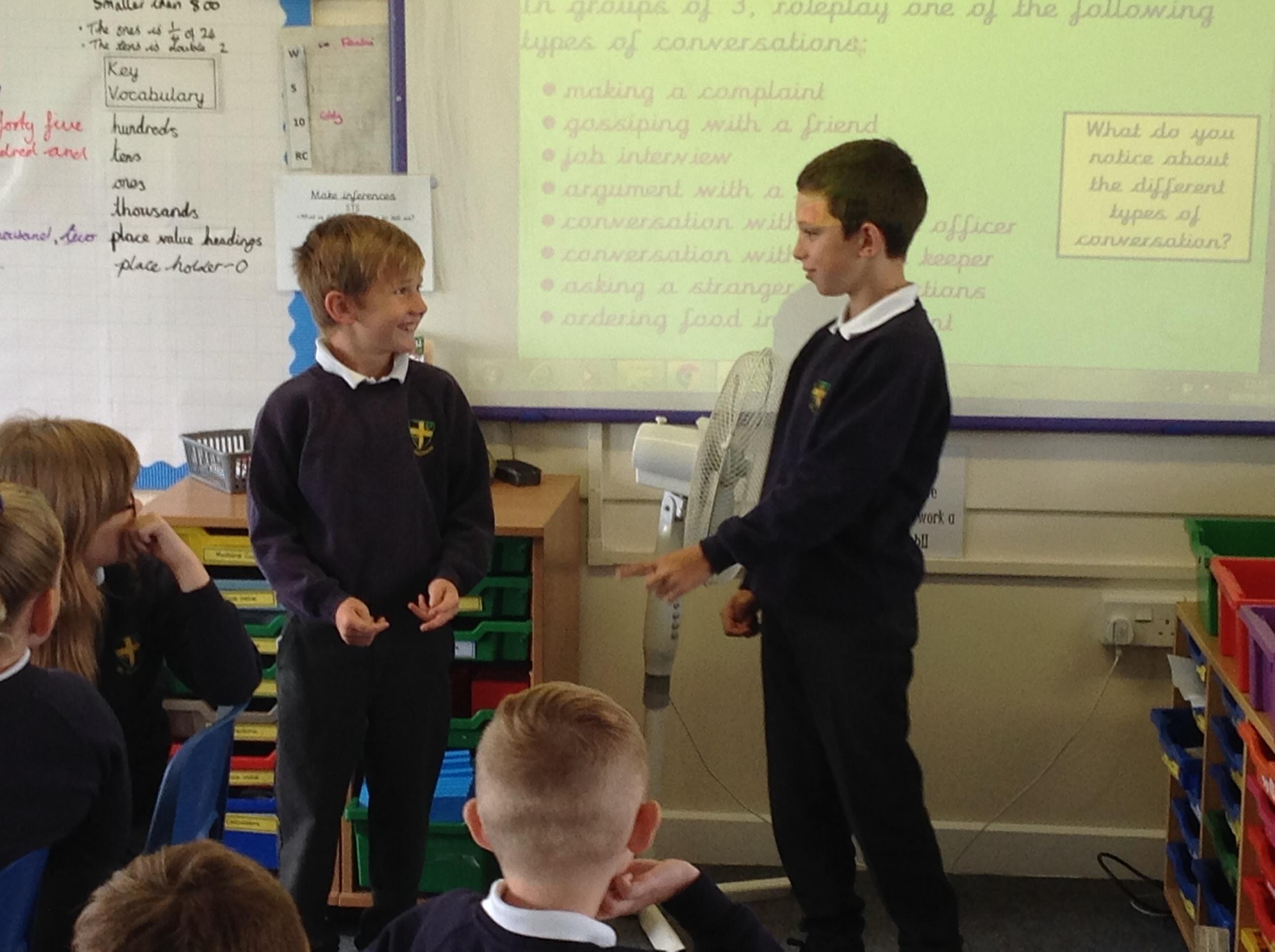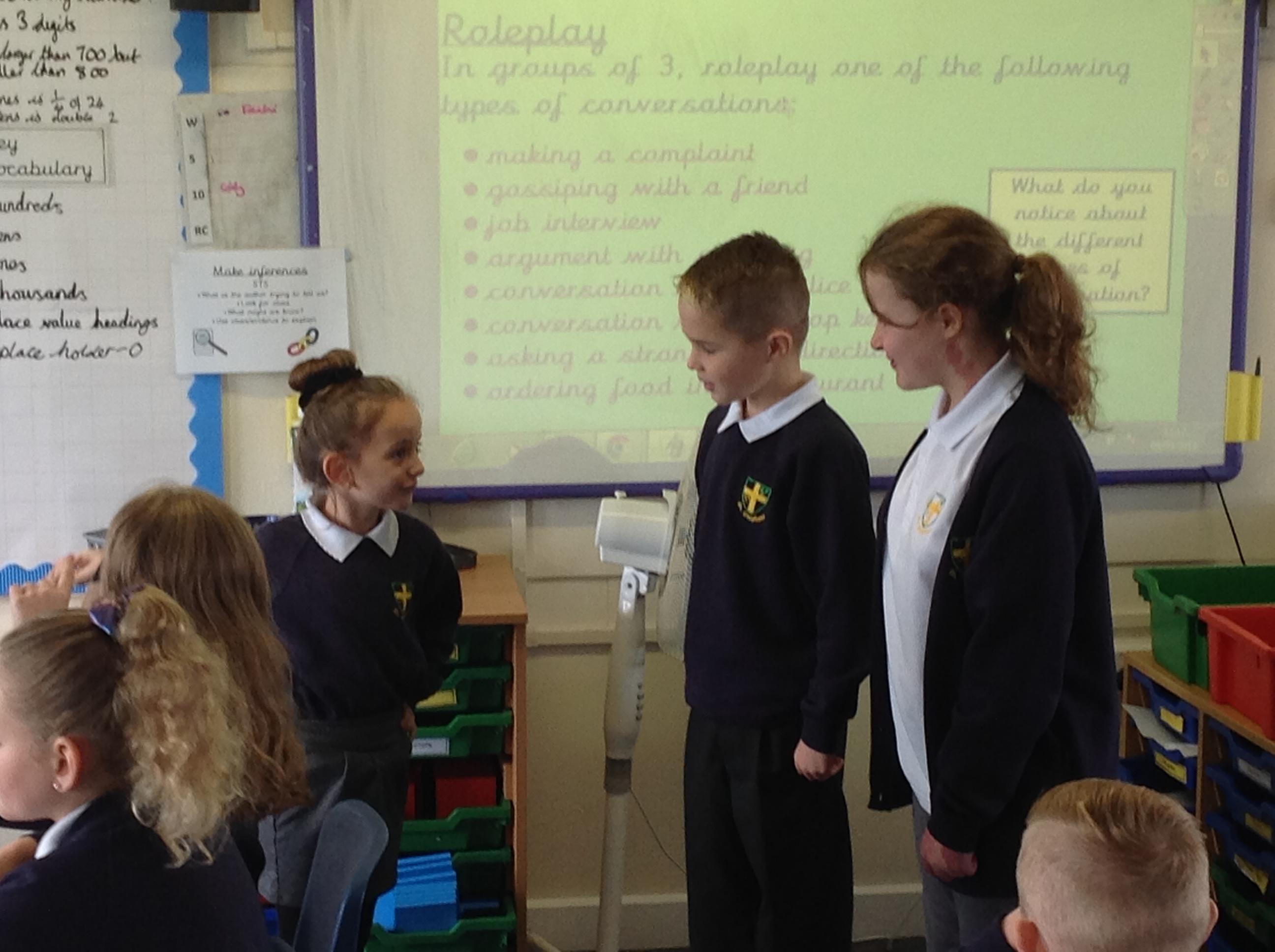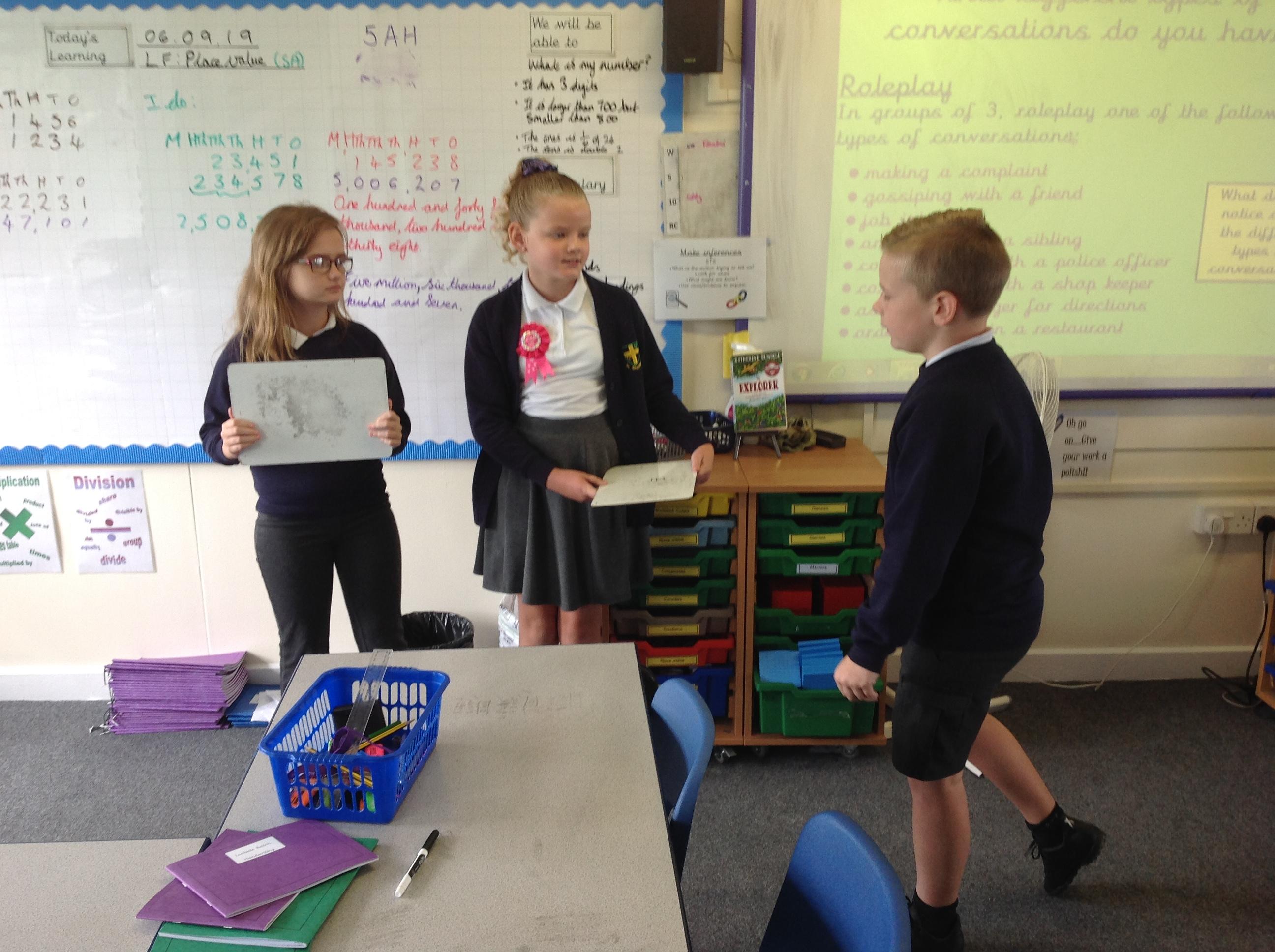Today, we started learning about oracy in Year 5. Part of our learning involved working in trios and we were asked to pick one of the scenarios on the board to roleplay- making a complaint, gossiping with a friend, job interview, argument with a sibling, conversation with a police officer, conversation with a shop keeper, asking a stranger for directions and ordering food in a restaurant. We needed to consider the way we talk and how talk changes depending on who we might be speaking to:  our friends/teacher/family etc.
