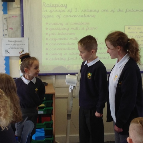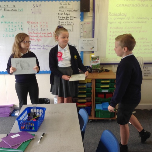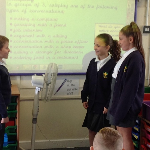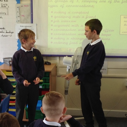 Today, we started learning about oracy in Year 5. Part of our learning involved working in trios and we were asked to pick one of the scenarios on the board to roleplay- making a complaint, gossiping with a friend, job interview, argument with a sibling, conversation with a police officer, conversation with a shop keeper, asking a stranger for directions and ordering food in a restaurant. We needed to consider the way we talk and how talk changes depending on who we might be speaking to: our friends/teacher/family etc.