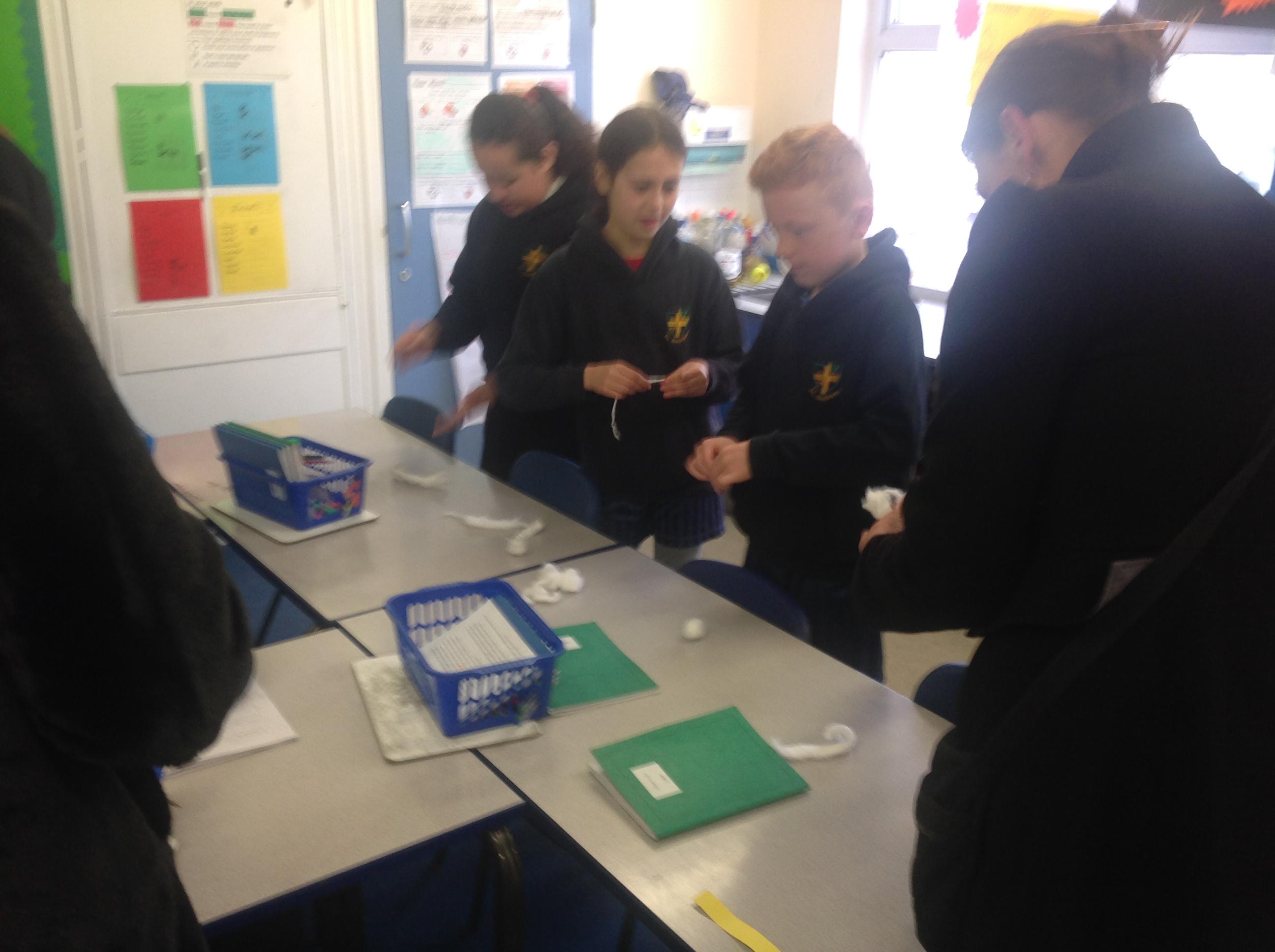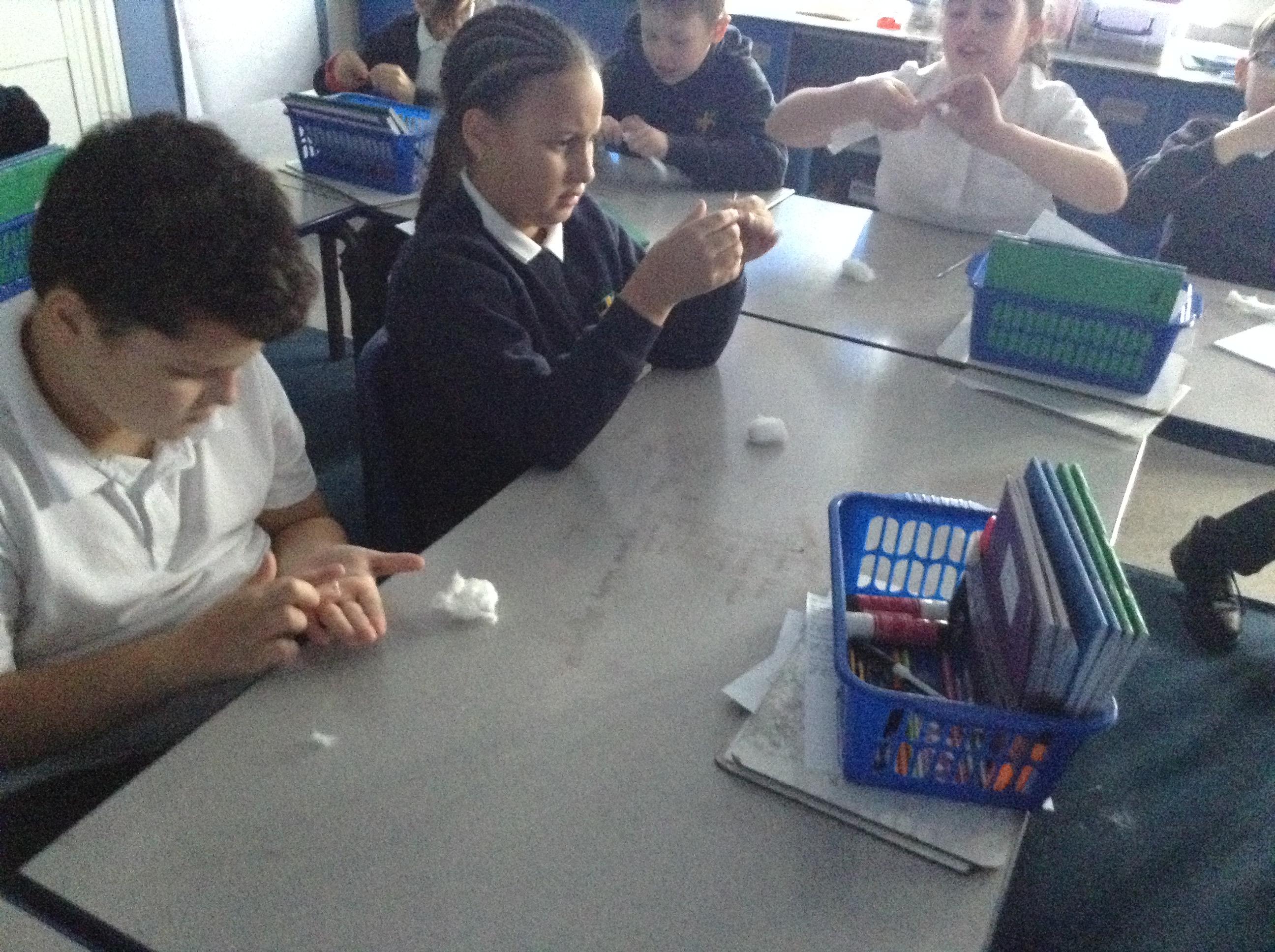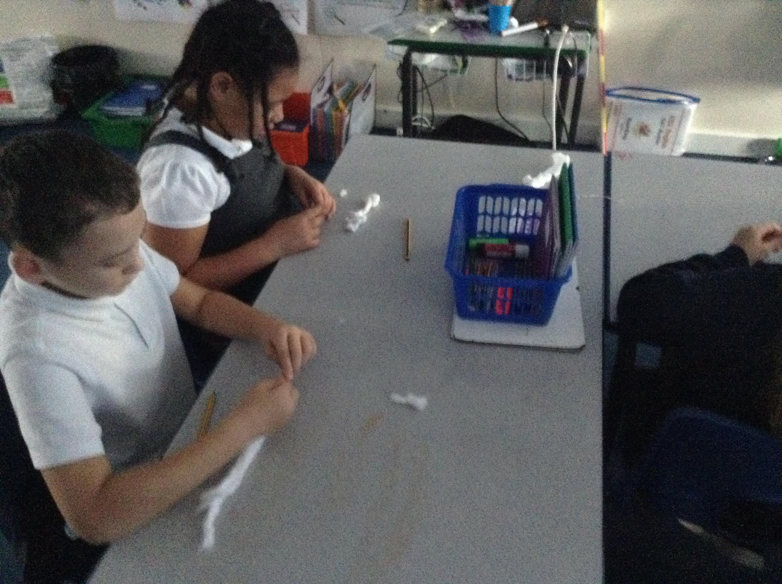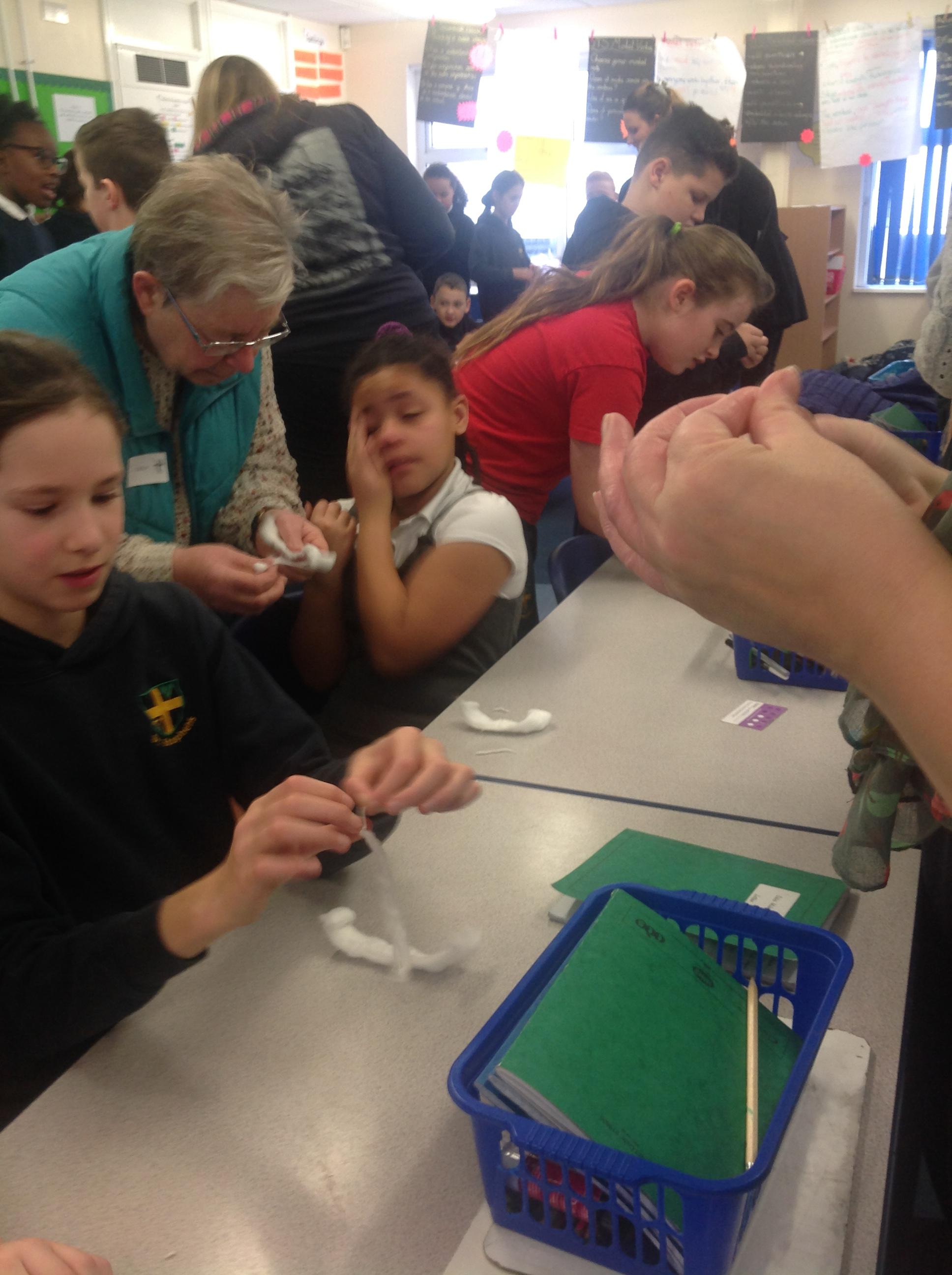 We then learned what it could be like to work in a cotton mill. We tried to create thread from raw cotton and we also learned how to stitch two pieces of material together by hand- something which many people are still doing as part of their jobs.