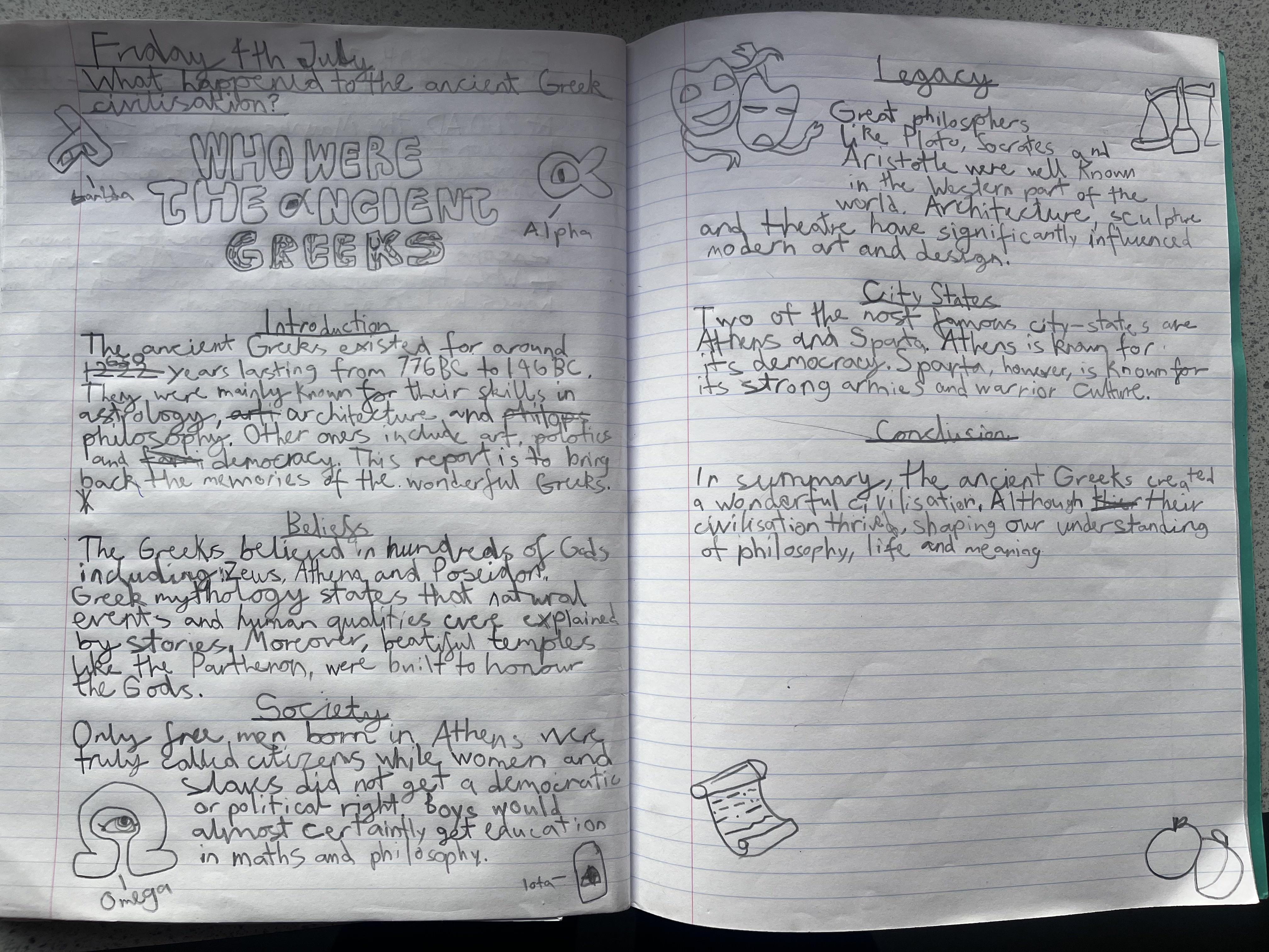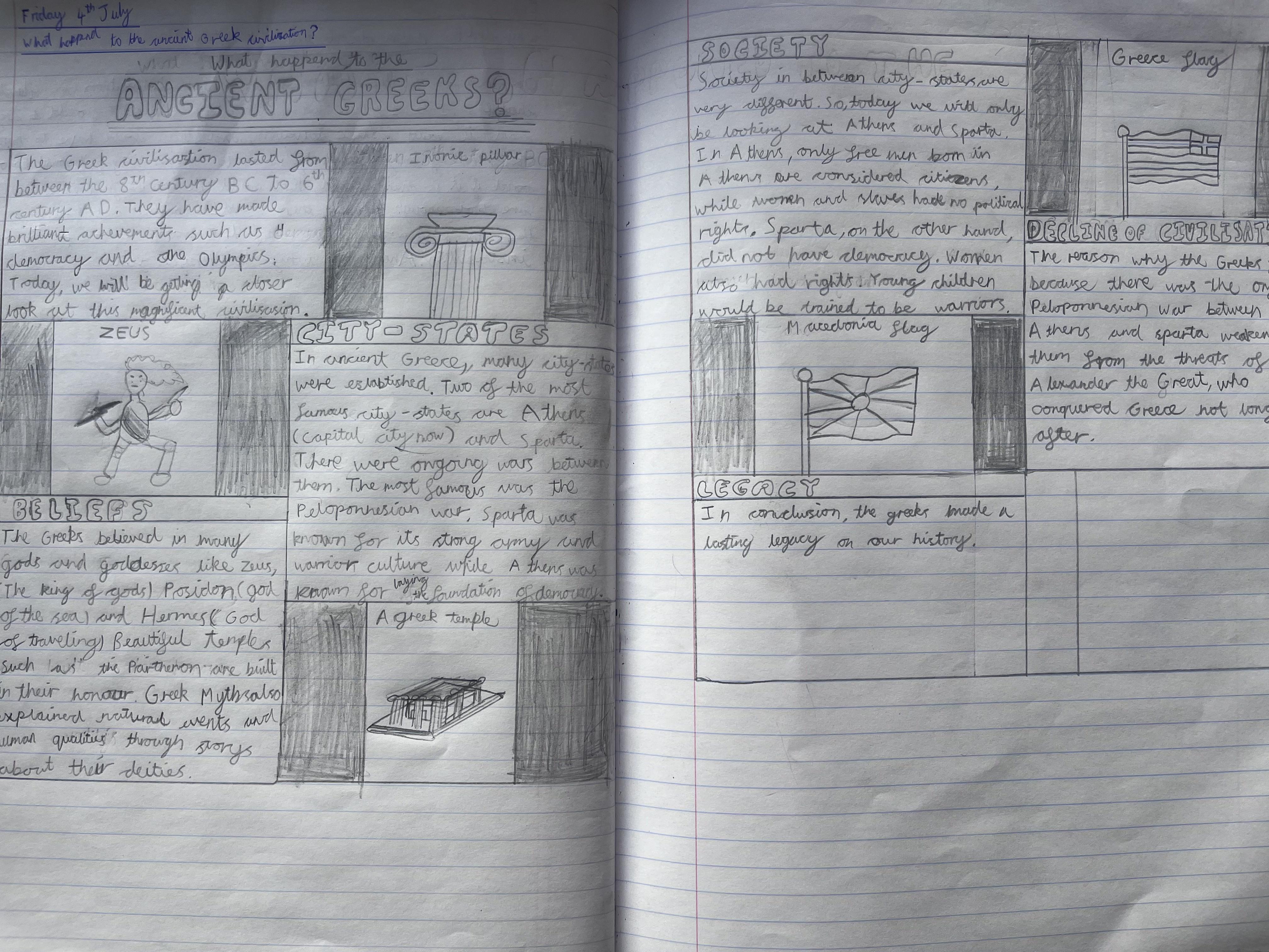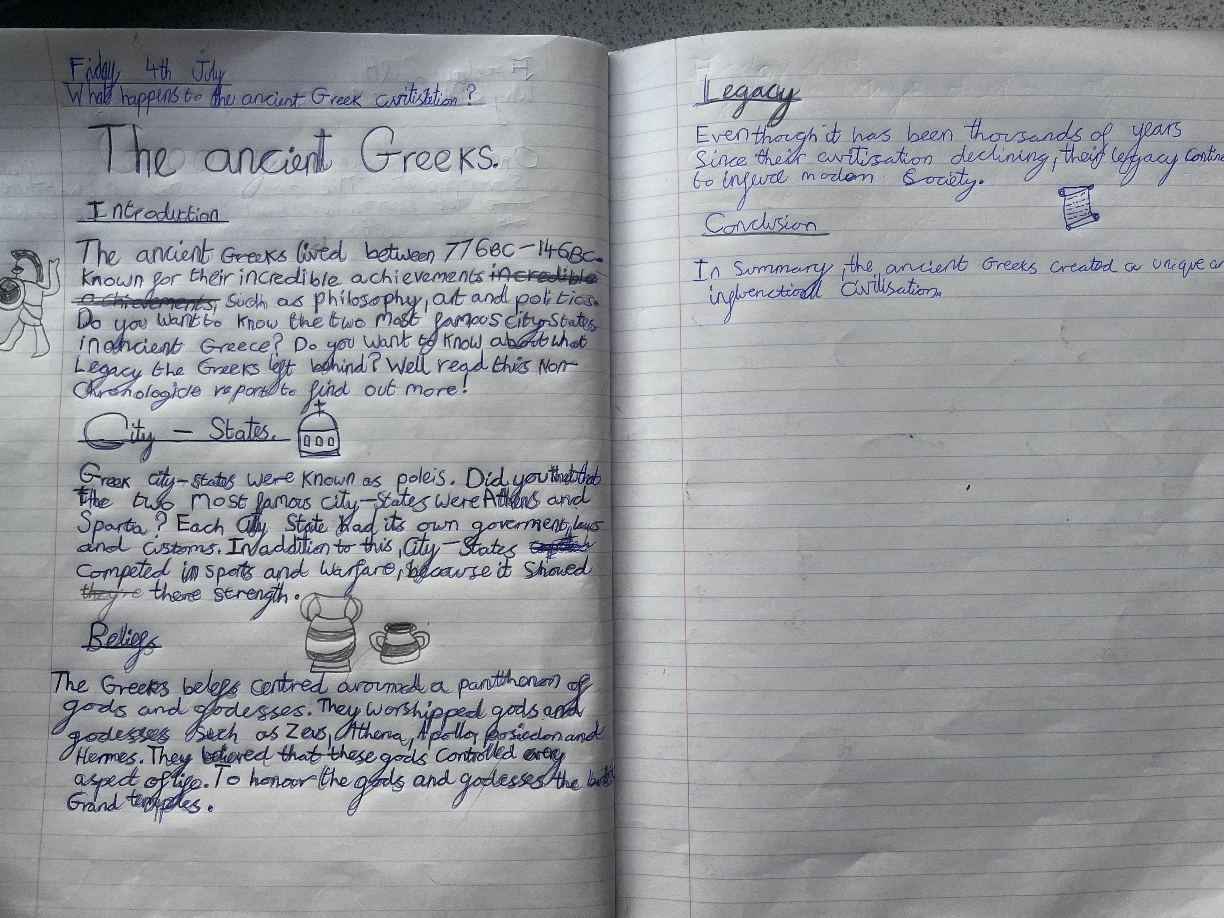 We recapped the information that we had learned in Y4 and used this knowledge to create our reports with the subheadings; city-states, beliefs, society, declining civilisation and legacy.