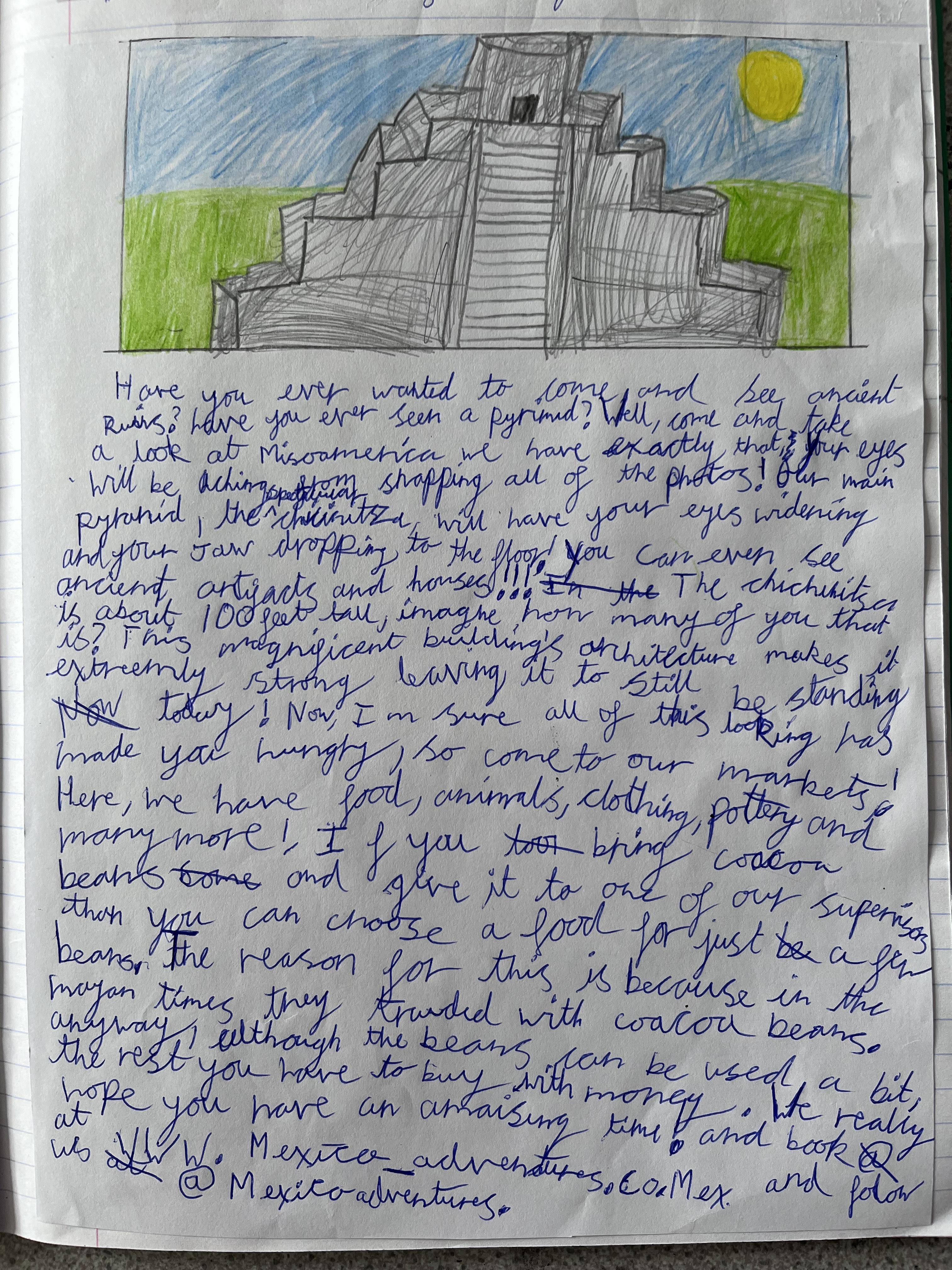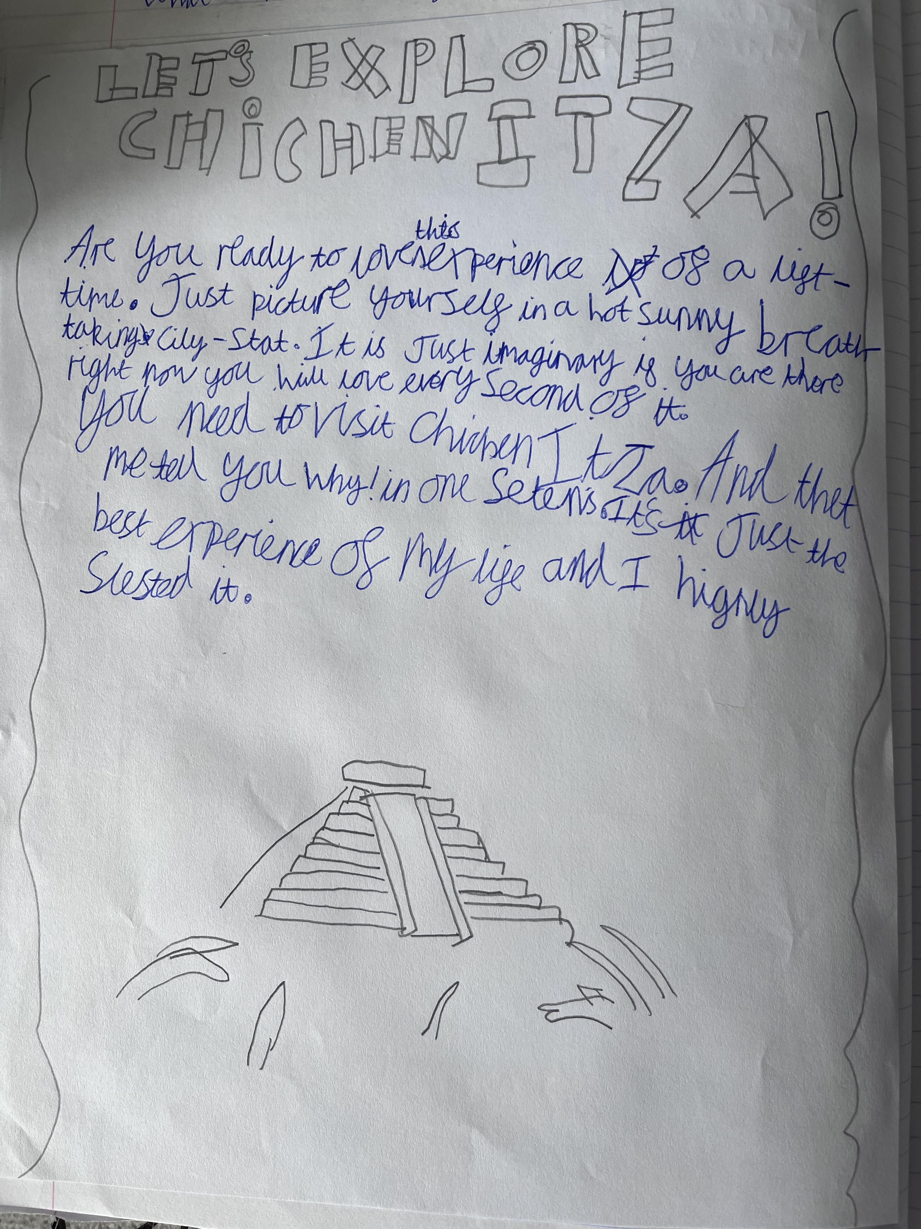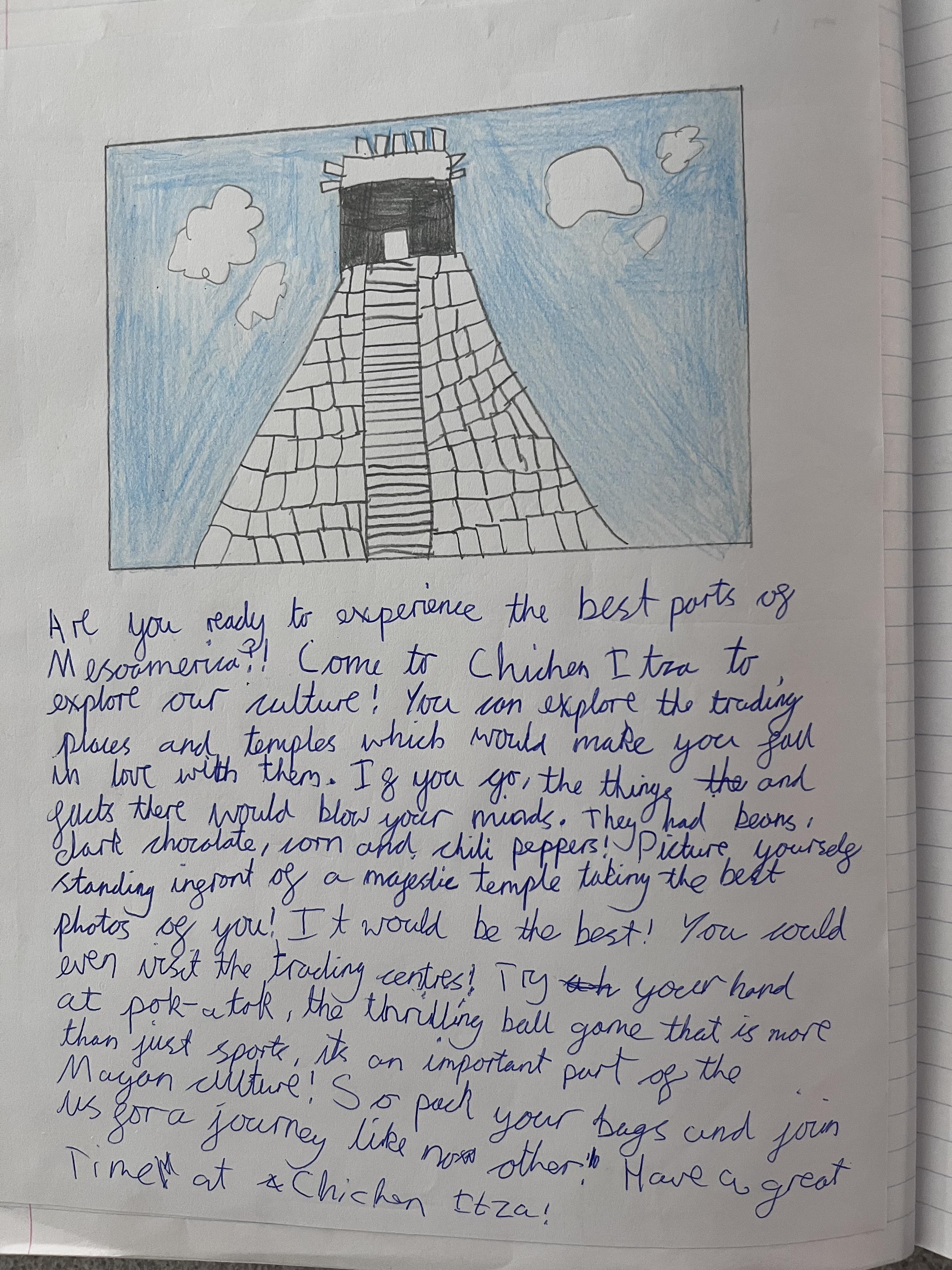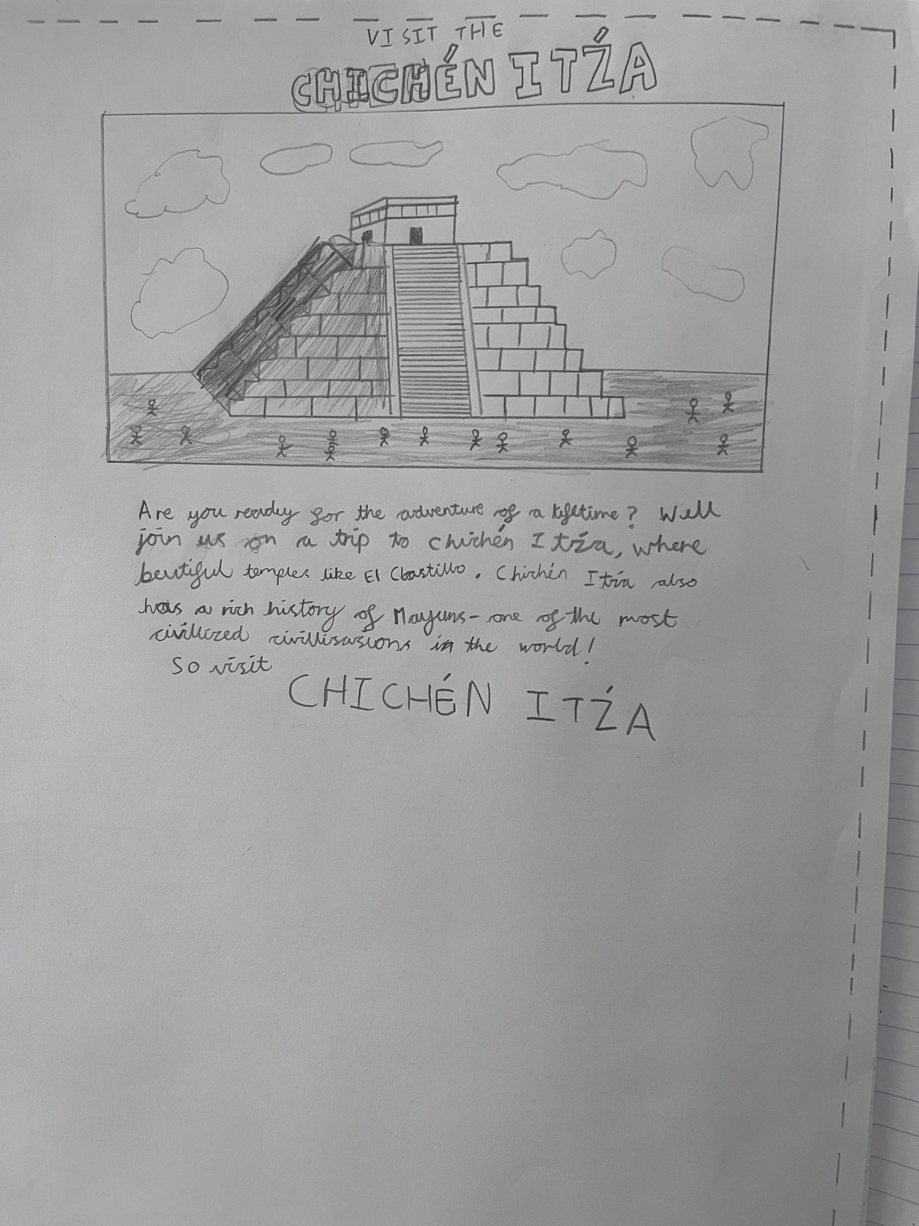 This week in Year 5, we have been exploring the fascinating world of the ancient Maya civilisation. We focused on one of their most famous landmarks – Chichén Itzá! To bring our learning to life, we created colourful and persuasive travel adverts to encourage people to visit this amazing site.
