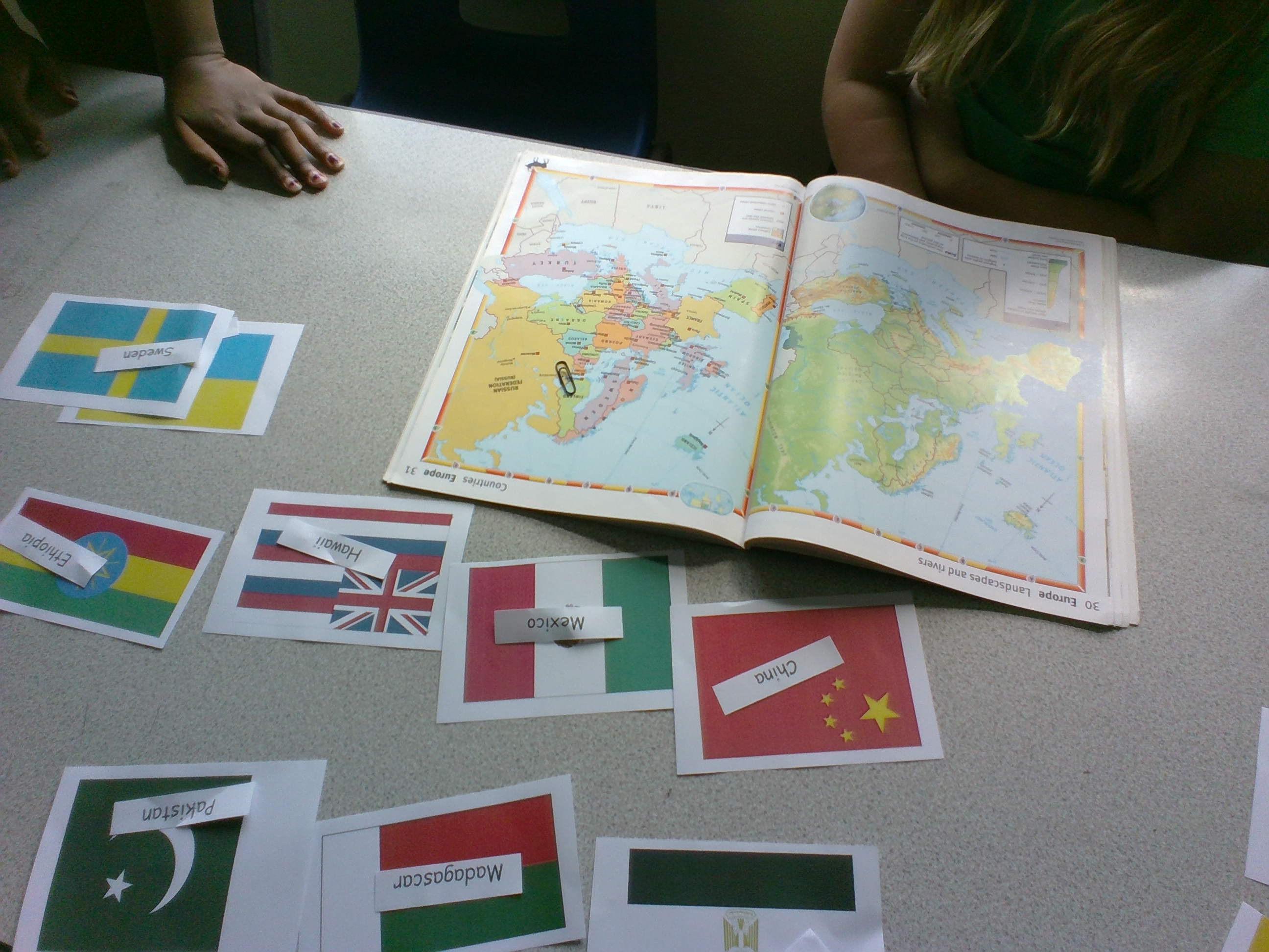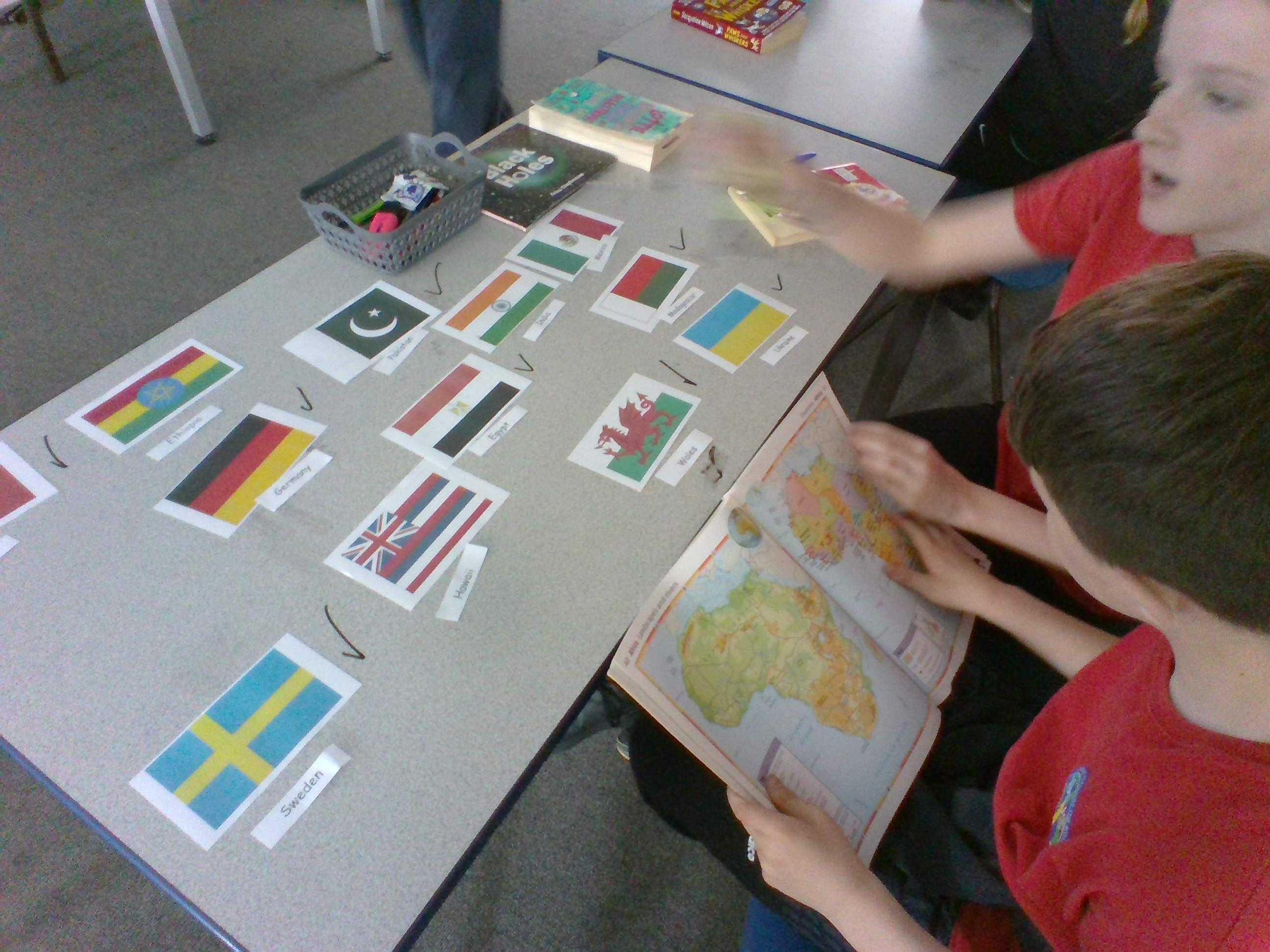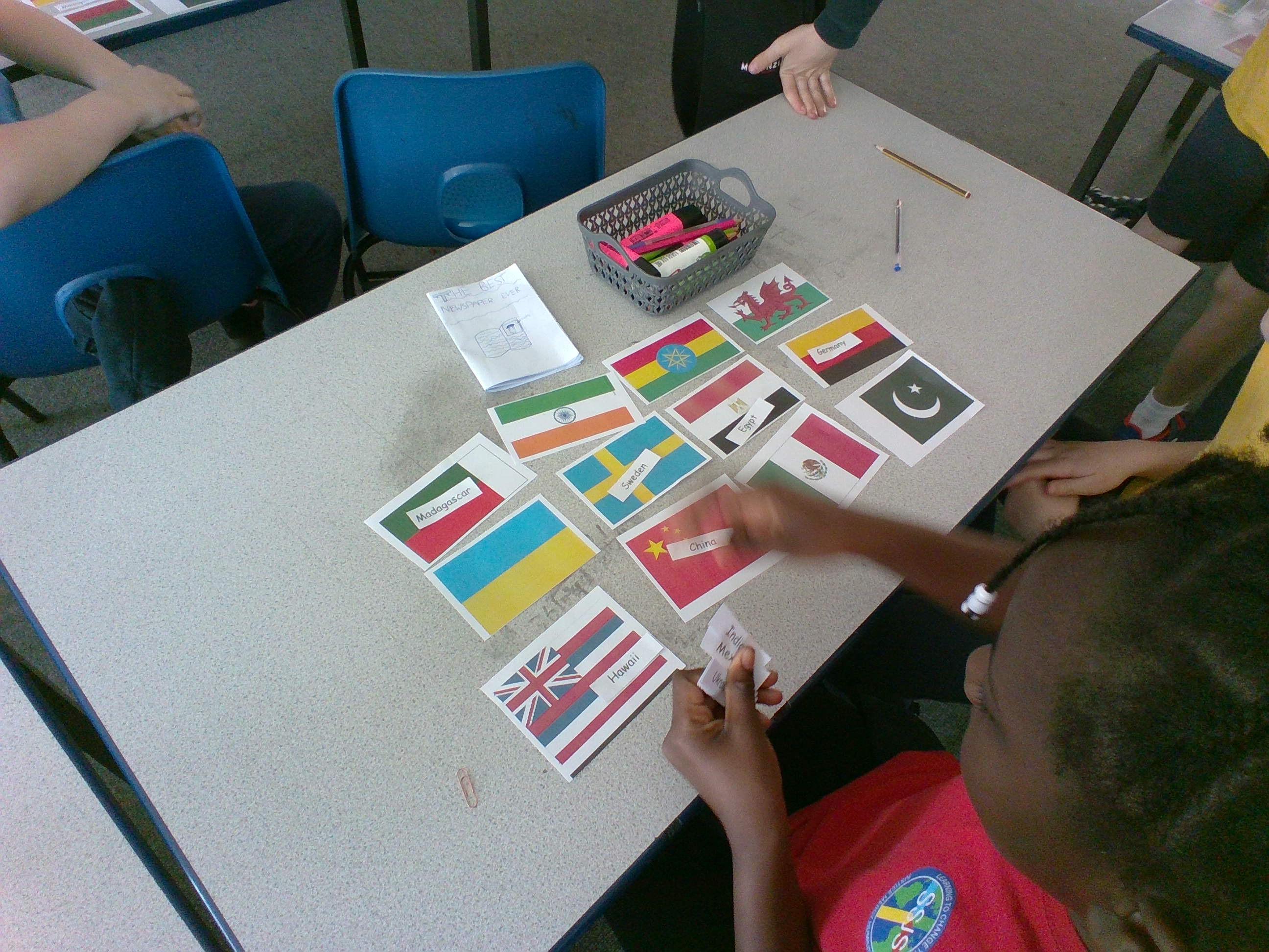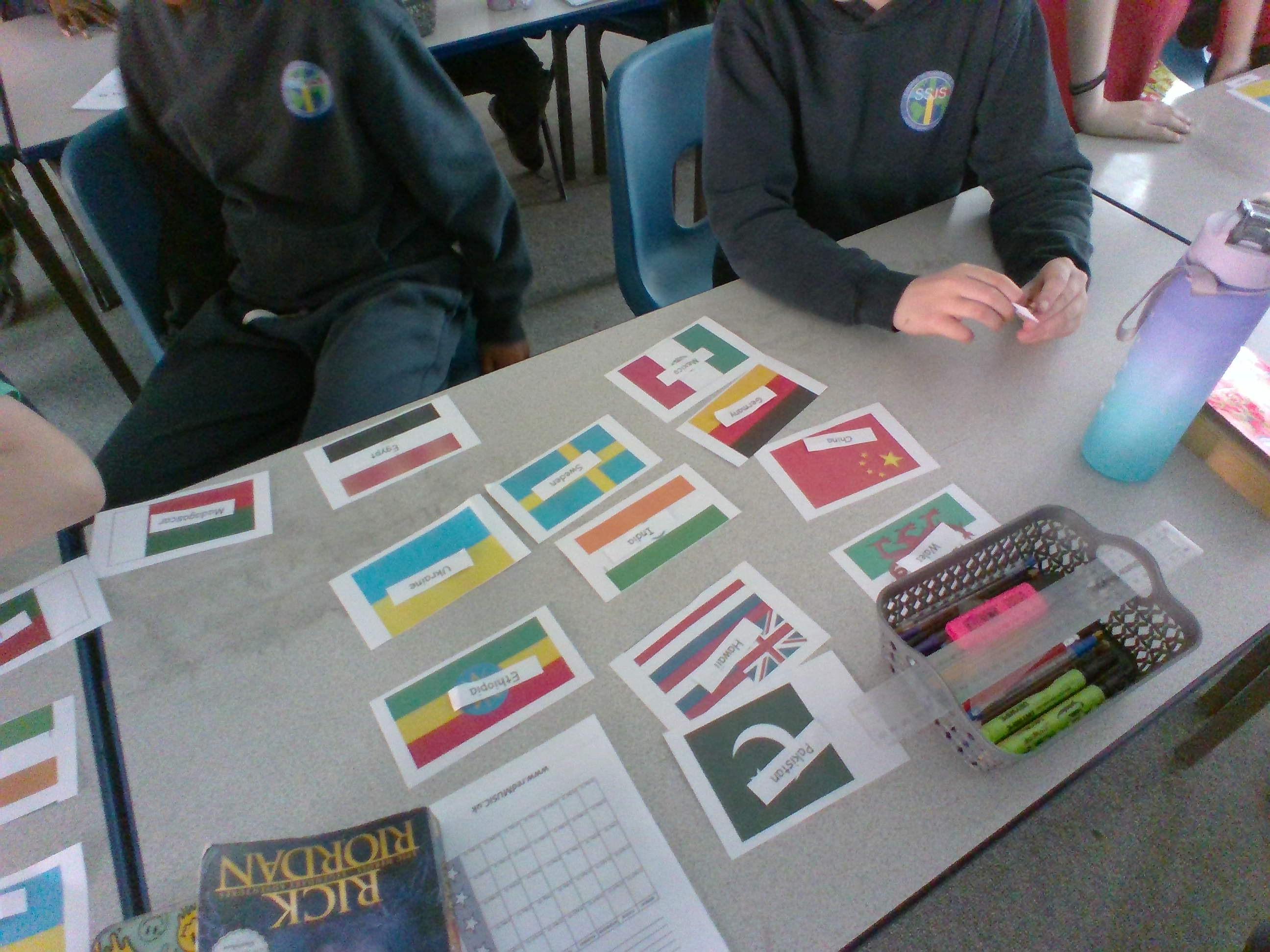 In the second part of the lesson, we worked in pairs to match up different flags with their names to see how many we knew / could remember. After matching them up successfully, we dove into the atlases to locate the countries on a map and find out some more information about each of them.
