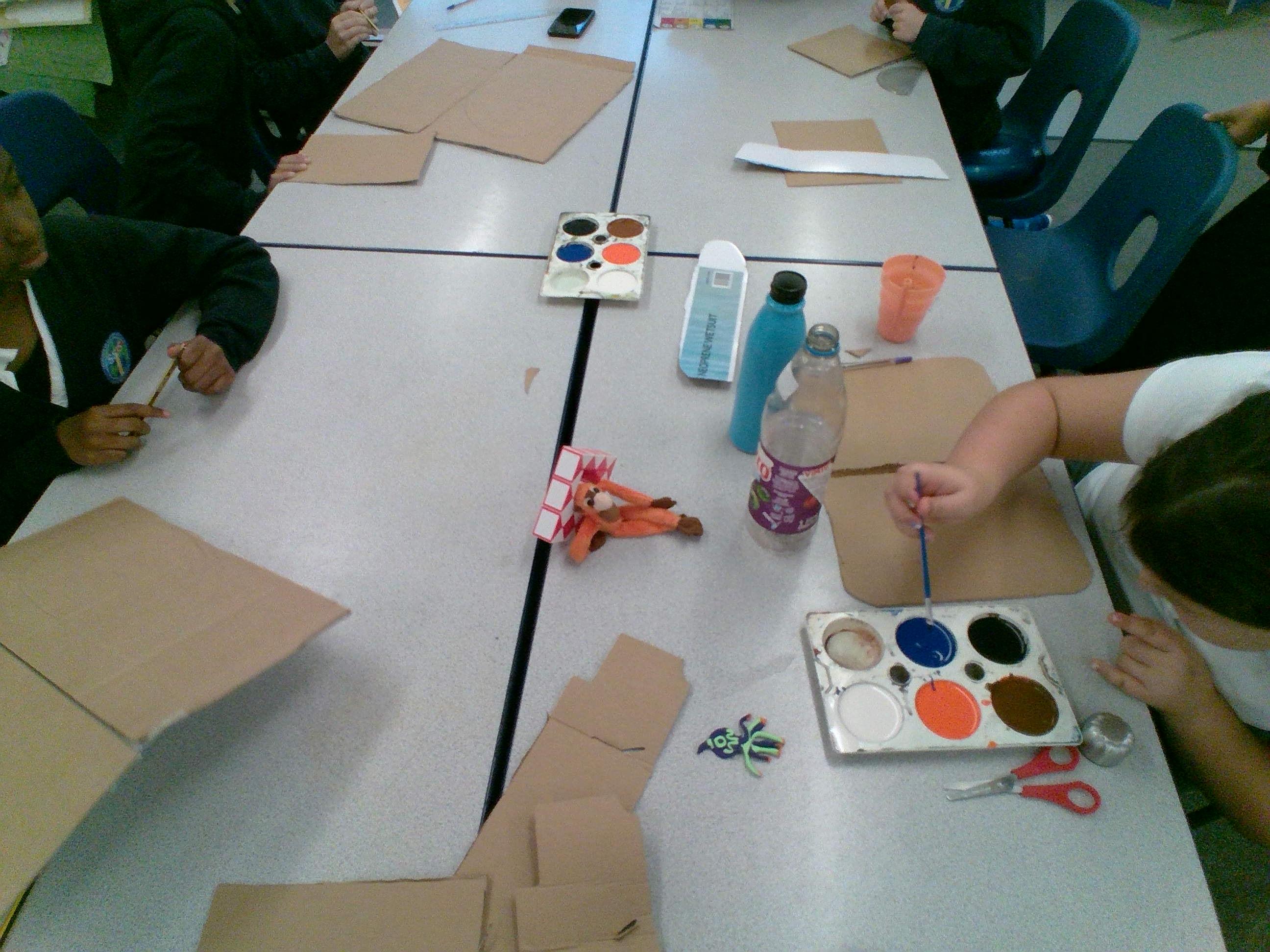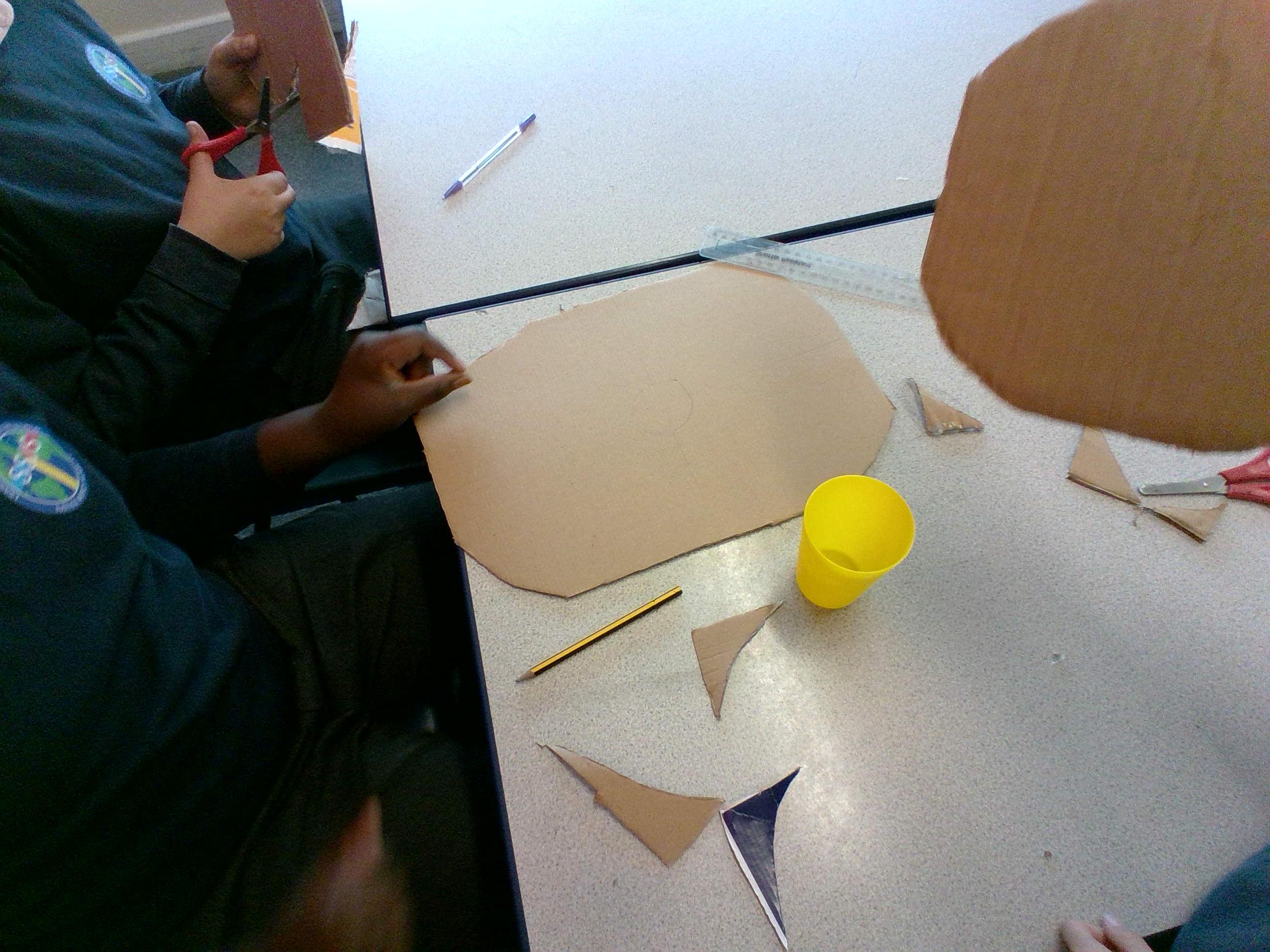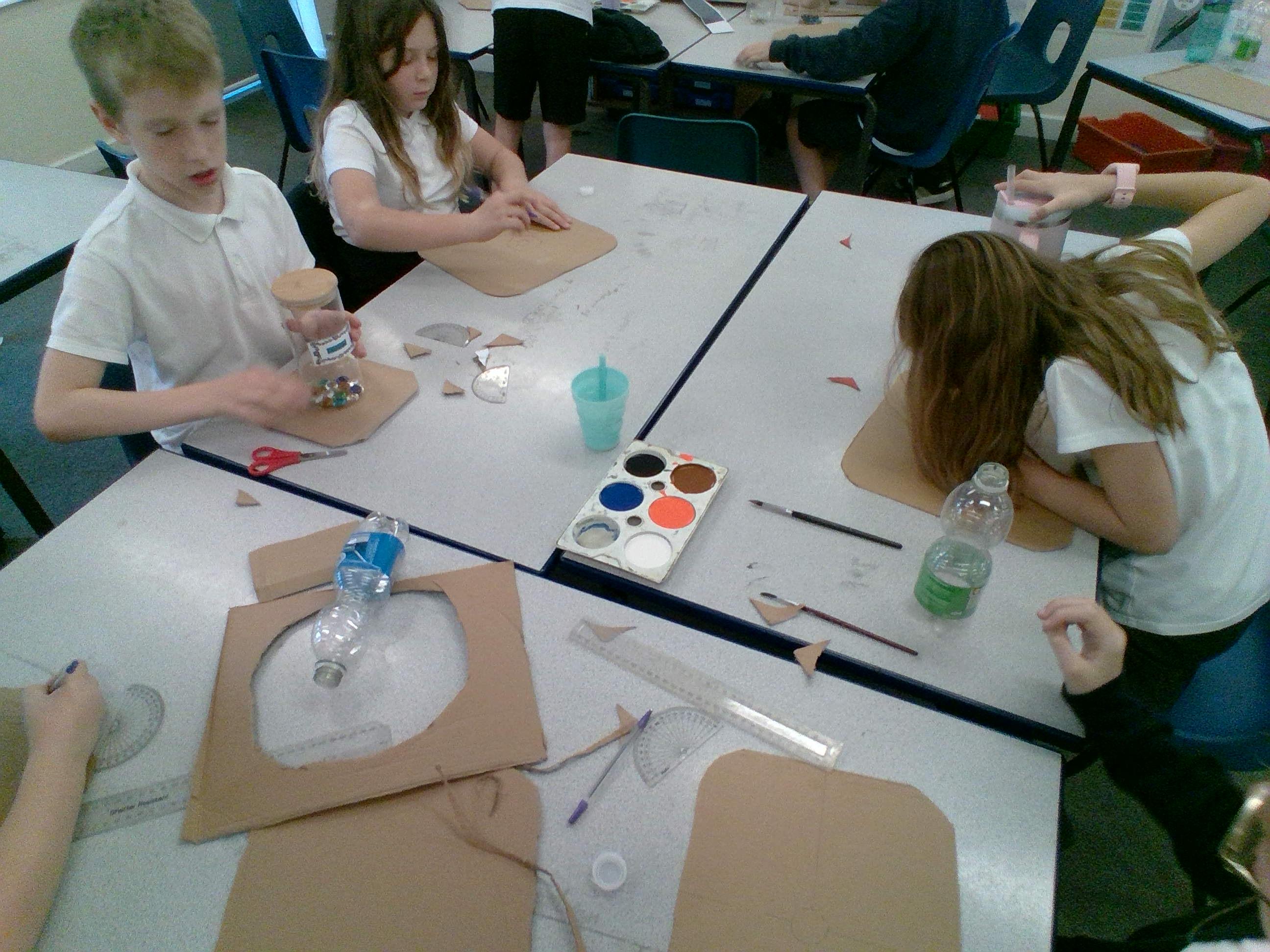 Then we created our own shields! Using recycled plastics and cardboard, we cut the cardboard into the correct shape, carefully drew the lines and the circle in the middle and then painted them in lots of different colours and patterns.