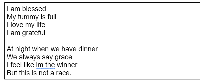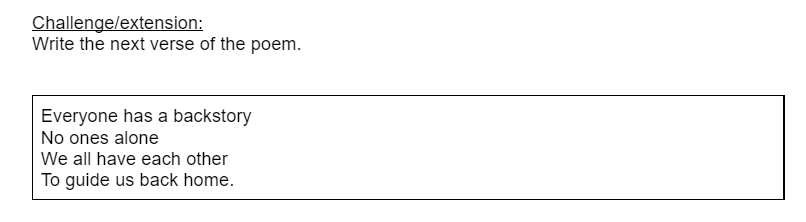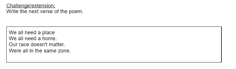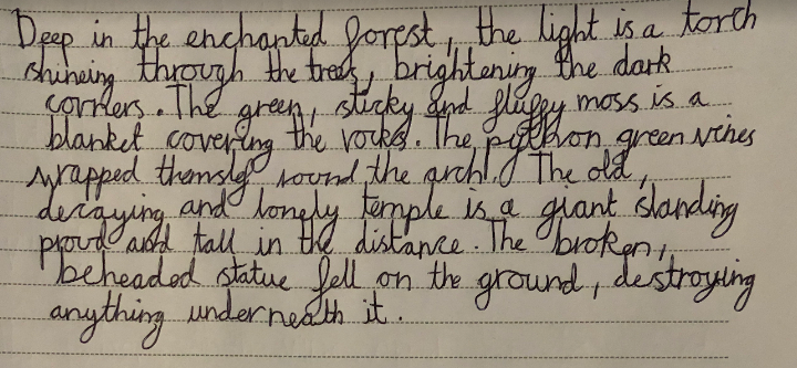 In Week 5, 5KD have been learning from home on Google Classroom. We have taken this opportunity to practise our creative writing and we have really enjoyed letting our imaginations run wild! We have even written some poems related to our Guided Reading text about asylum seekers and our RE learning about Jesus' teachings of grace and generosity. Take a look at some of our super writing below.