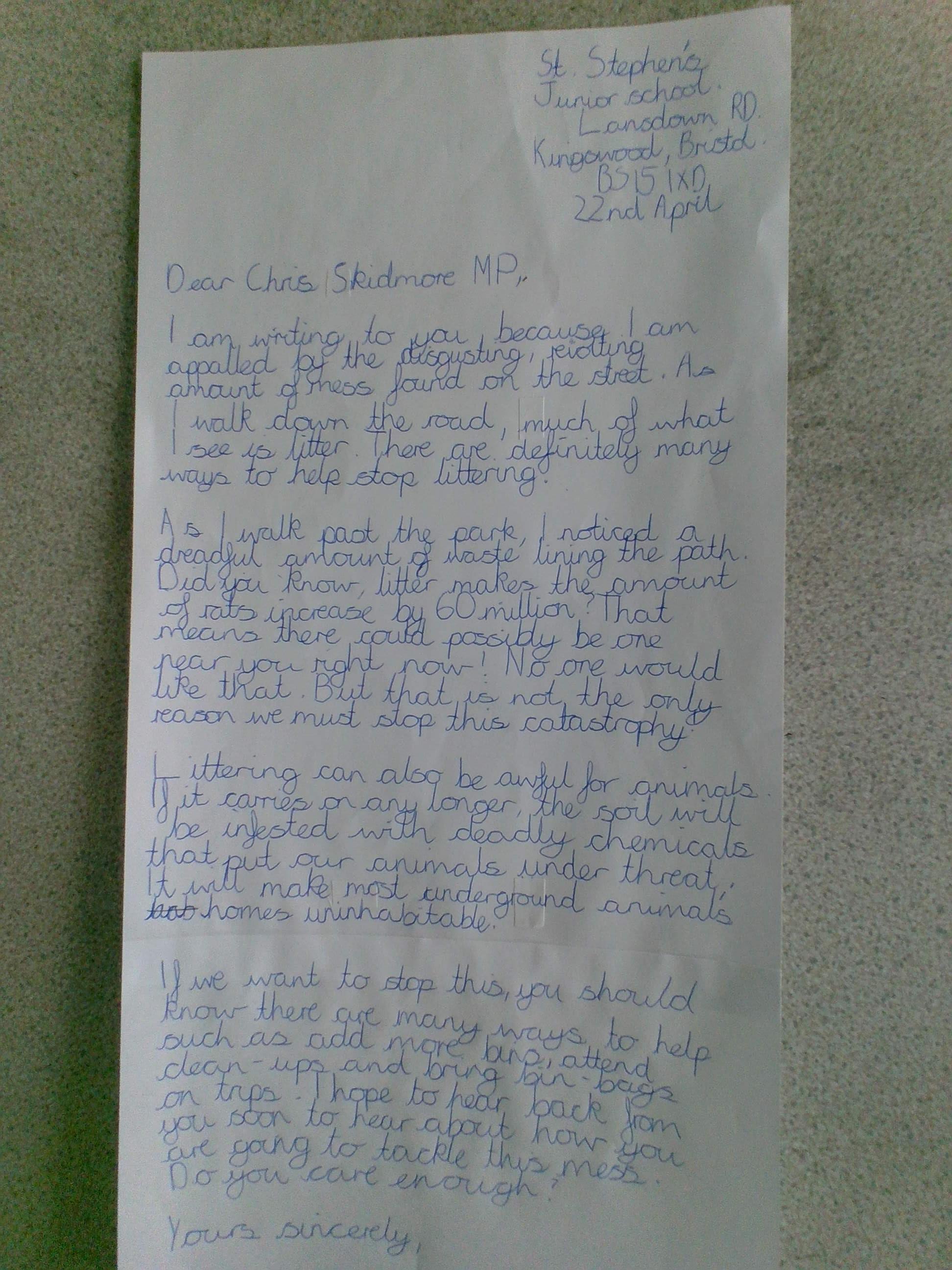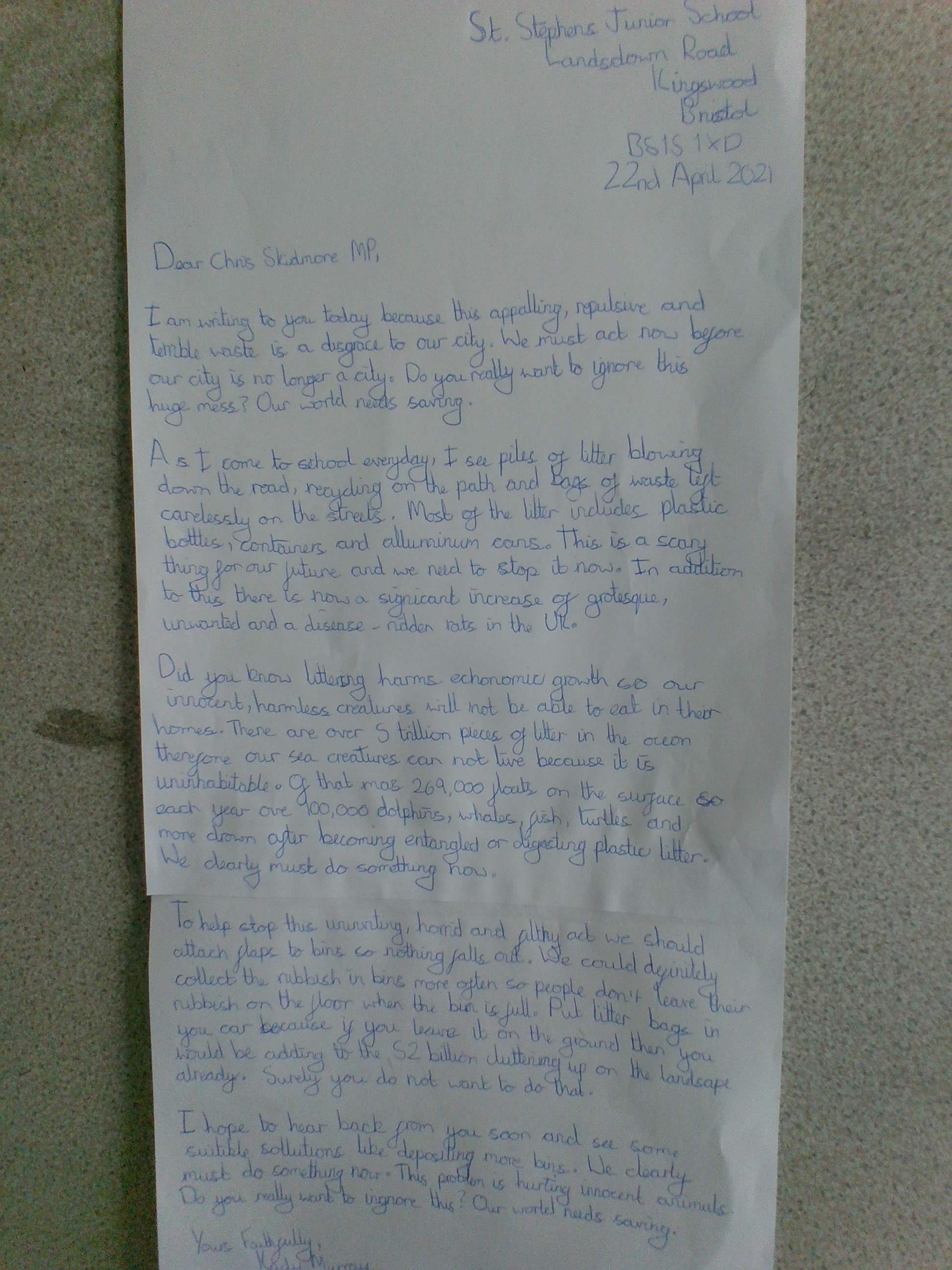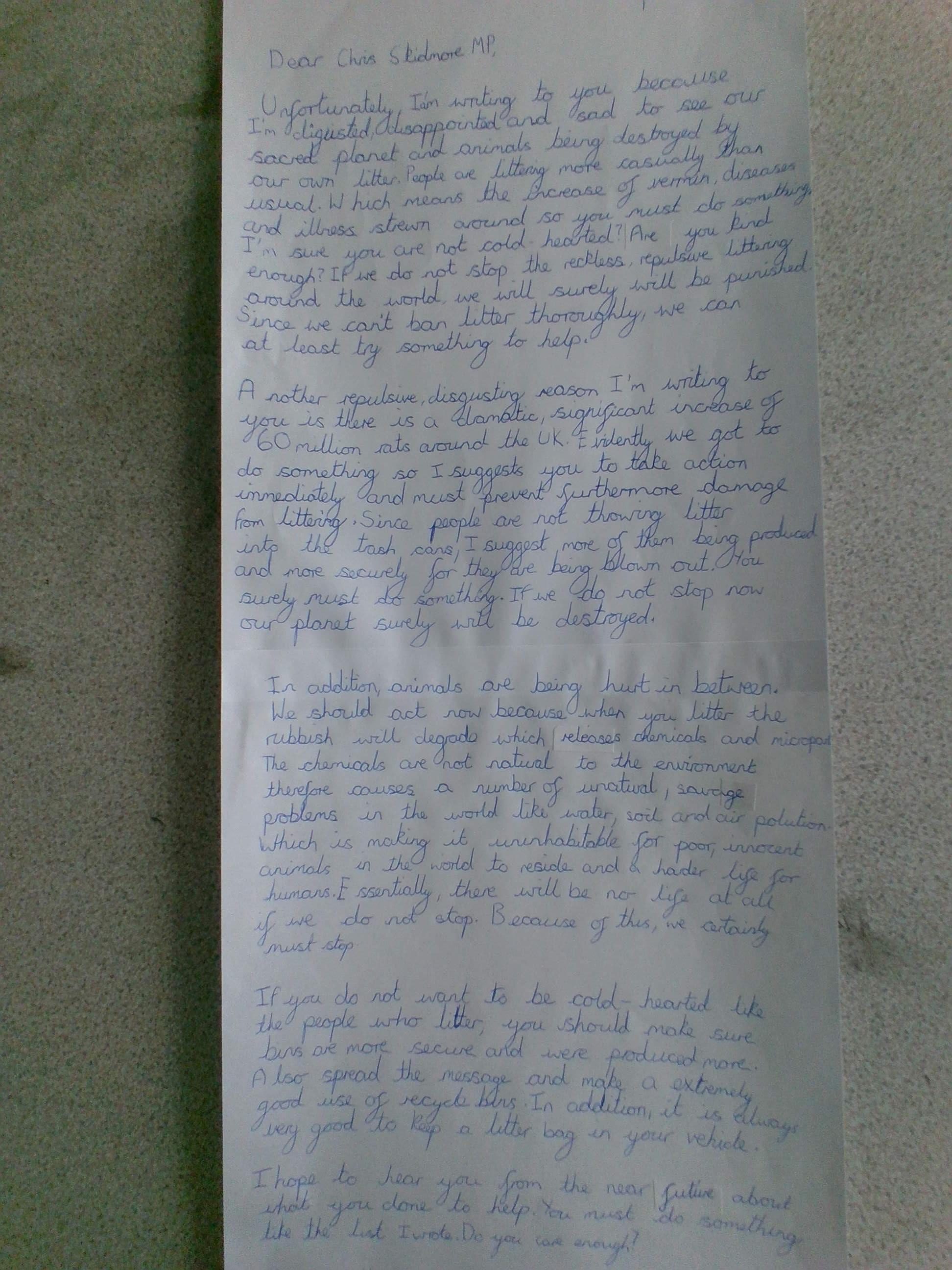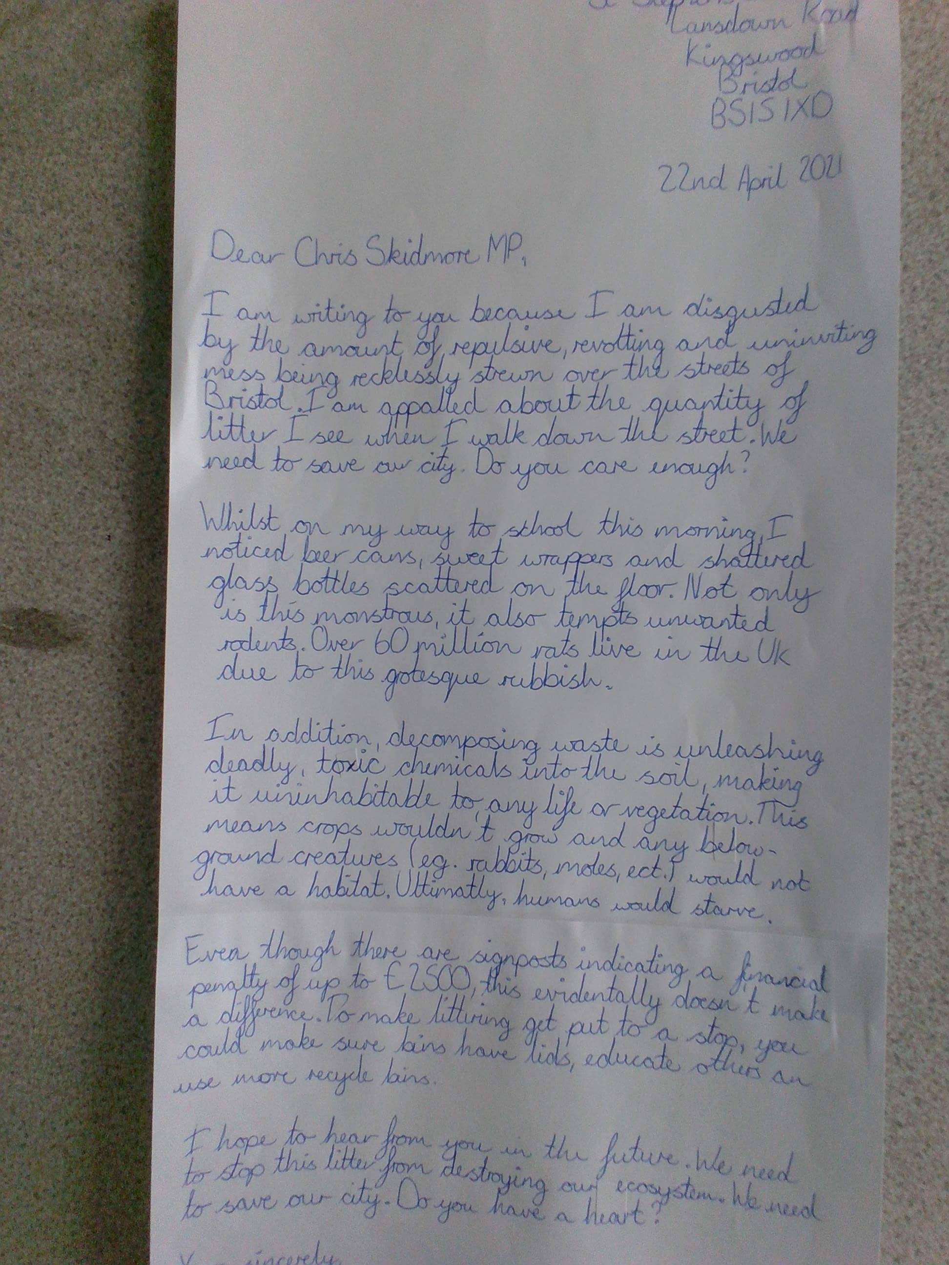 In Week 2, we have been working hard on our letter writing. We have used our new knowledge of persuasion to write persuasive letters to our local MP, Chris Skidmore, asking him to do something about littering in our area. We have given reasons why he should listen to us and possible solutions that he could put in place to make Kingswood a cleaner and safer place to live for humans and animals. We are looking forward to sending these to him and hopefully getting a response to make a real change to our community! Have a read of some of our letters below.