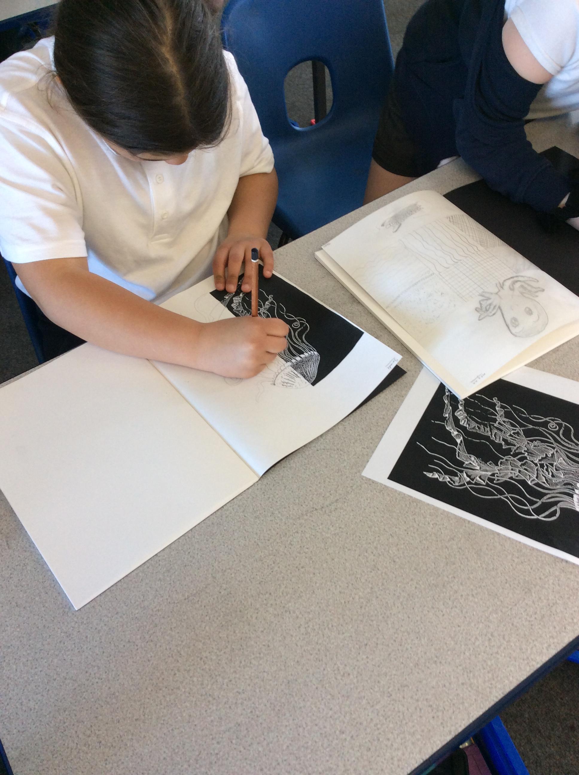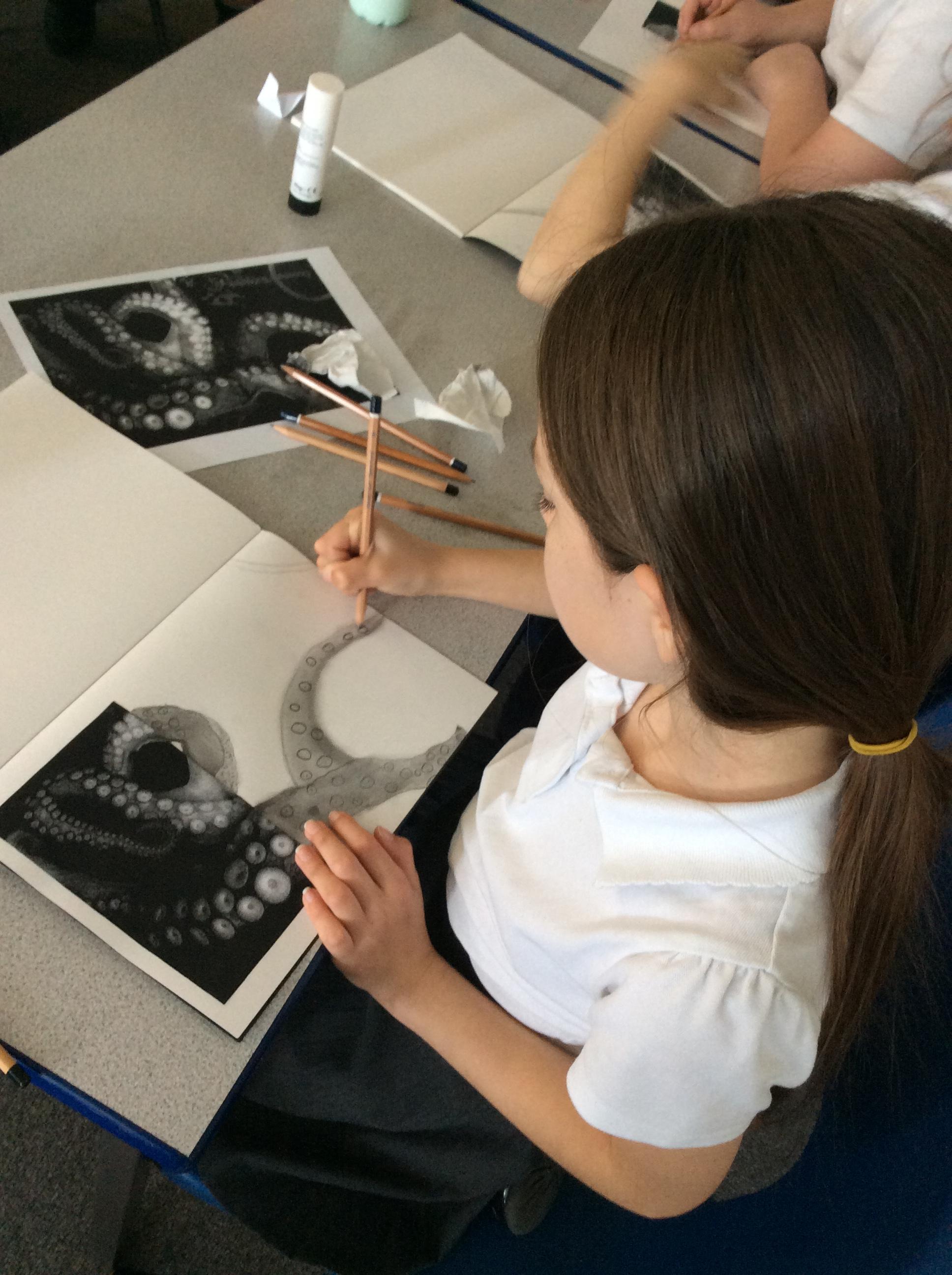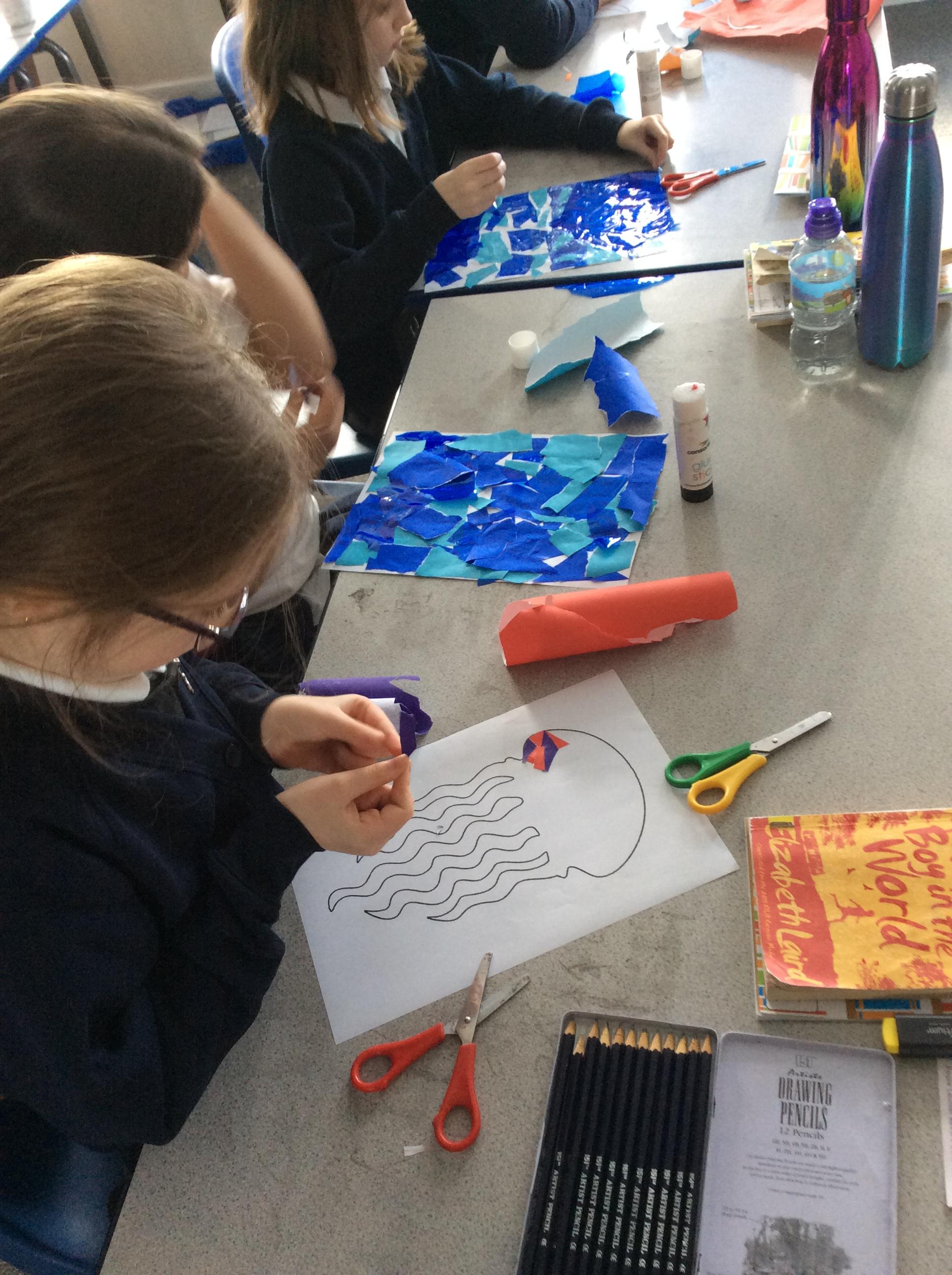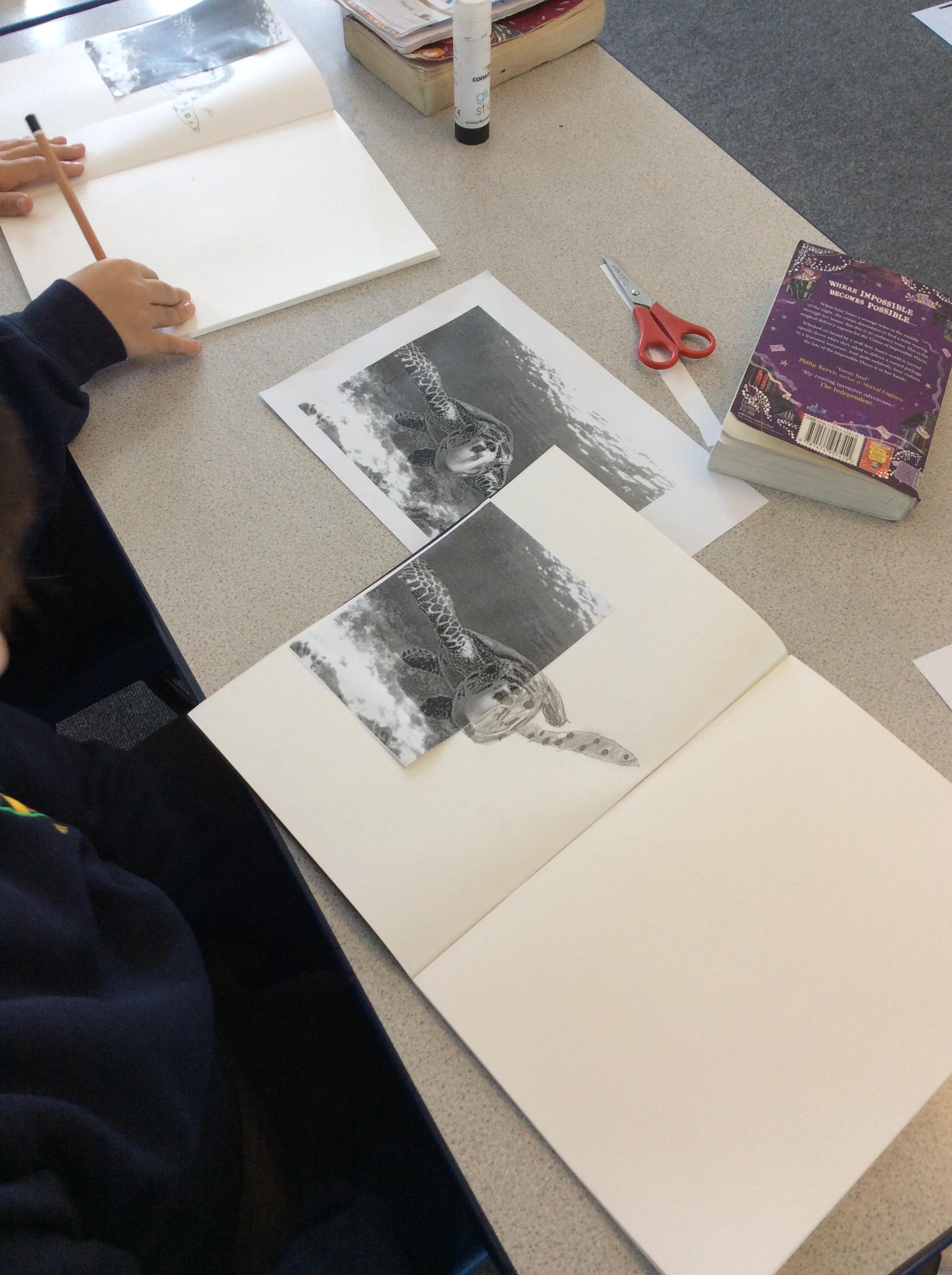 In Week 6, we have been completing some art work based on a picture from the book 'Here We Are'. We have practised our shading skills by focusing on using dark and light effectively in our sketching. We have also put our collage skills into practise and our coming together as a year group to create a collaged ocean scene. Check out some of our amazing art work below!