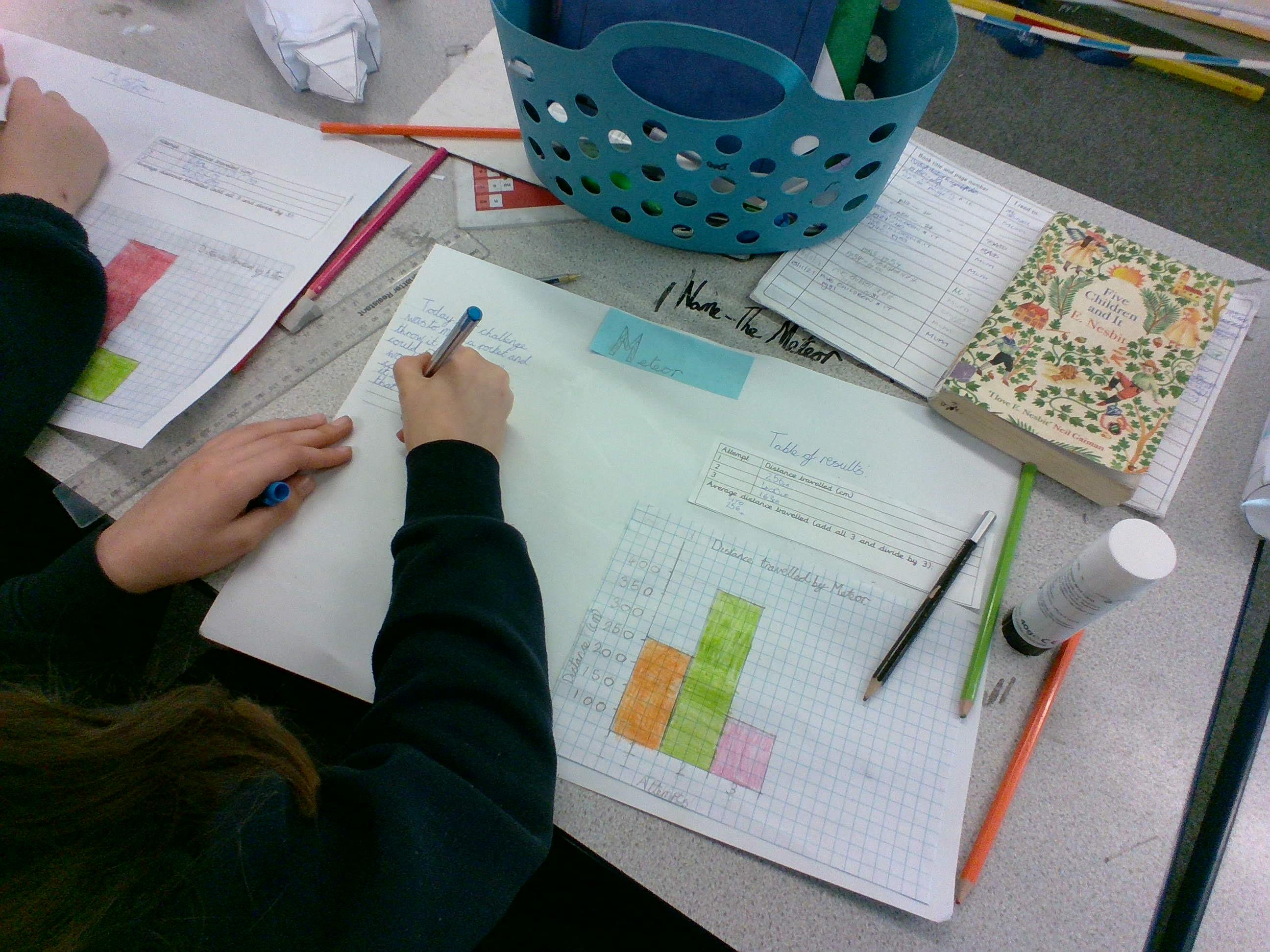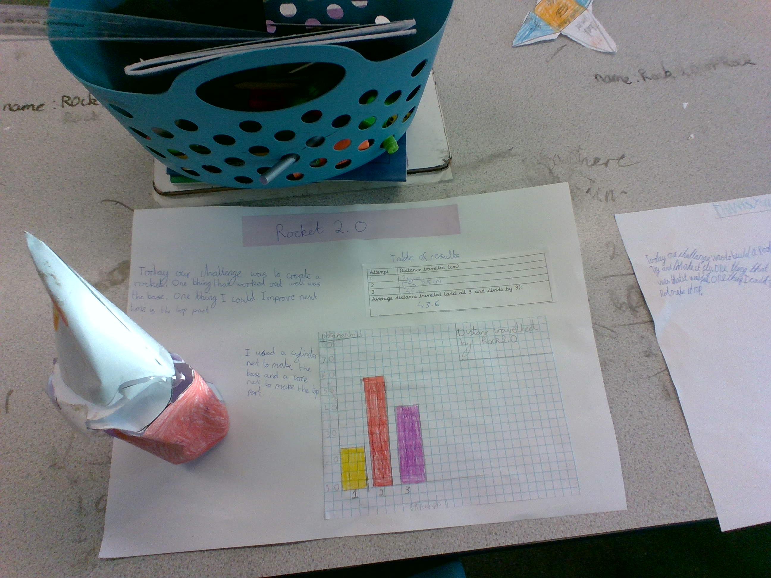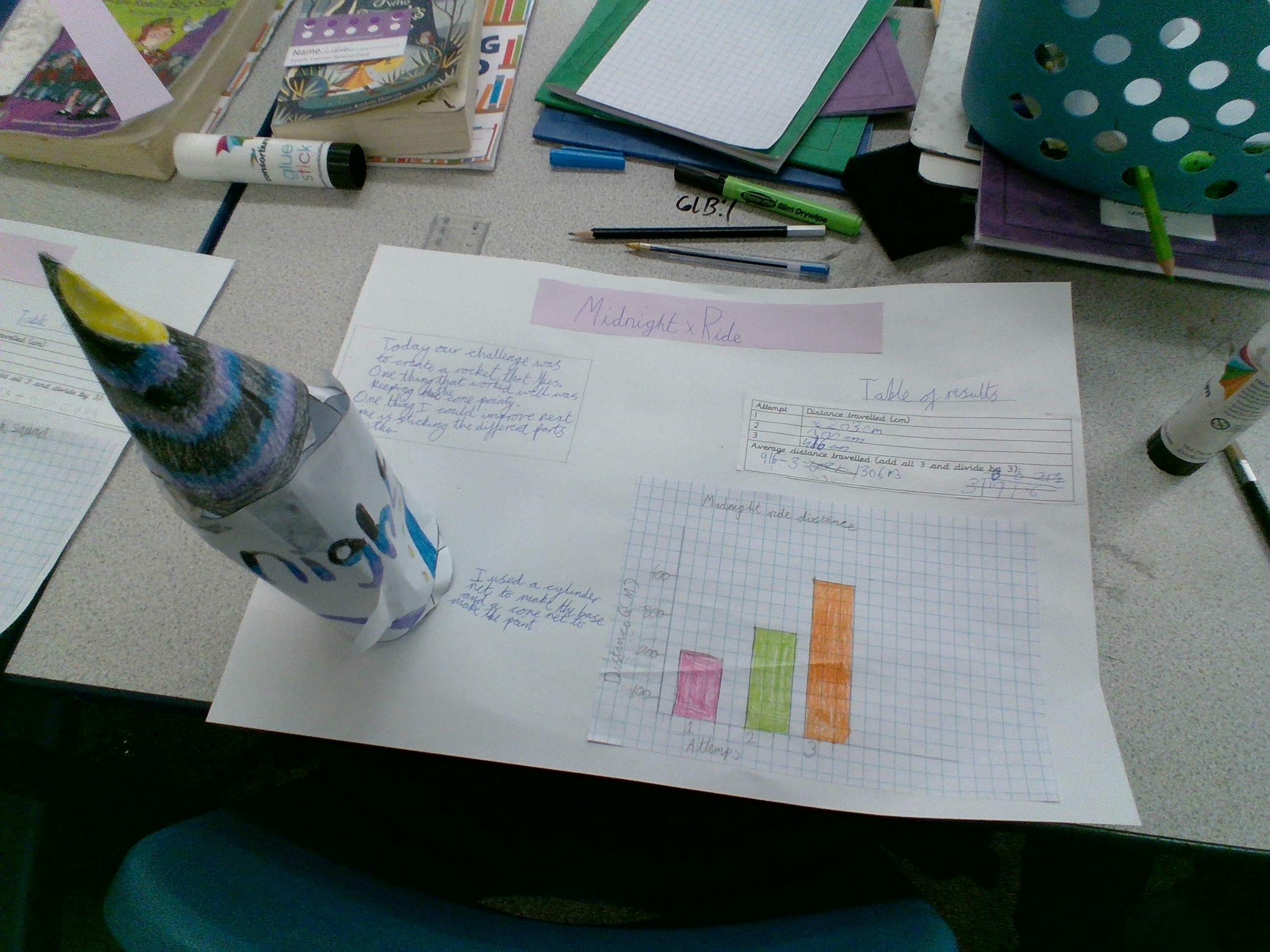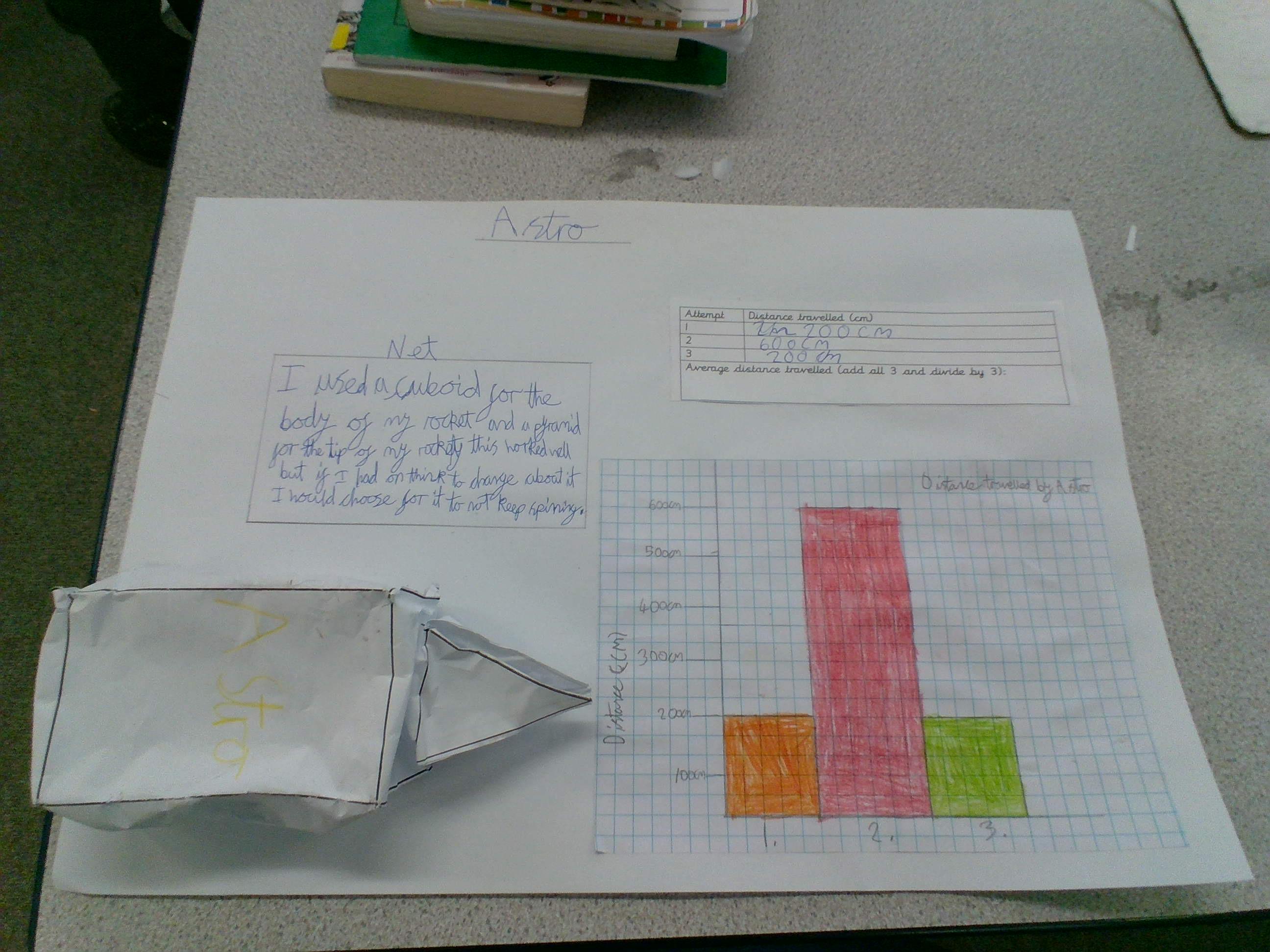 We then used the context of Space and our Solar system to explore rockets. We used maths to design our rockets using 3D shapes, create our rockets using nets, measure our launches, calculate the average of our distances and plot our results onto a graph.