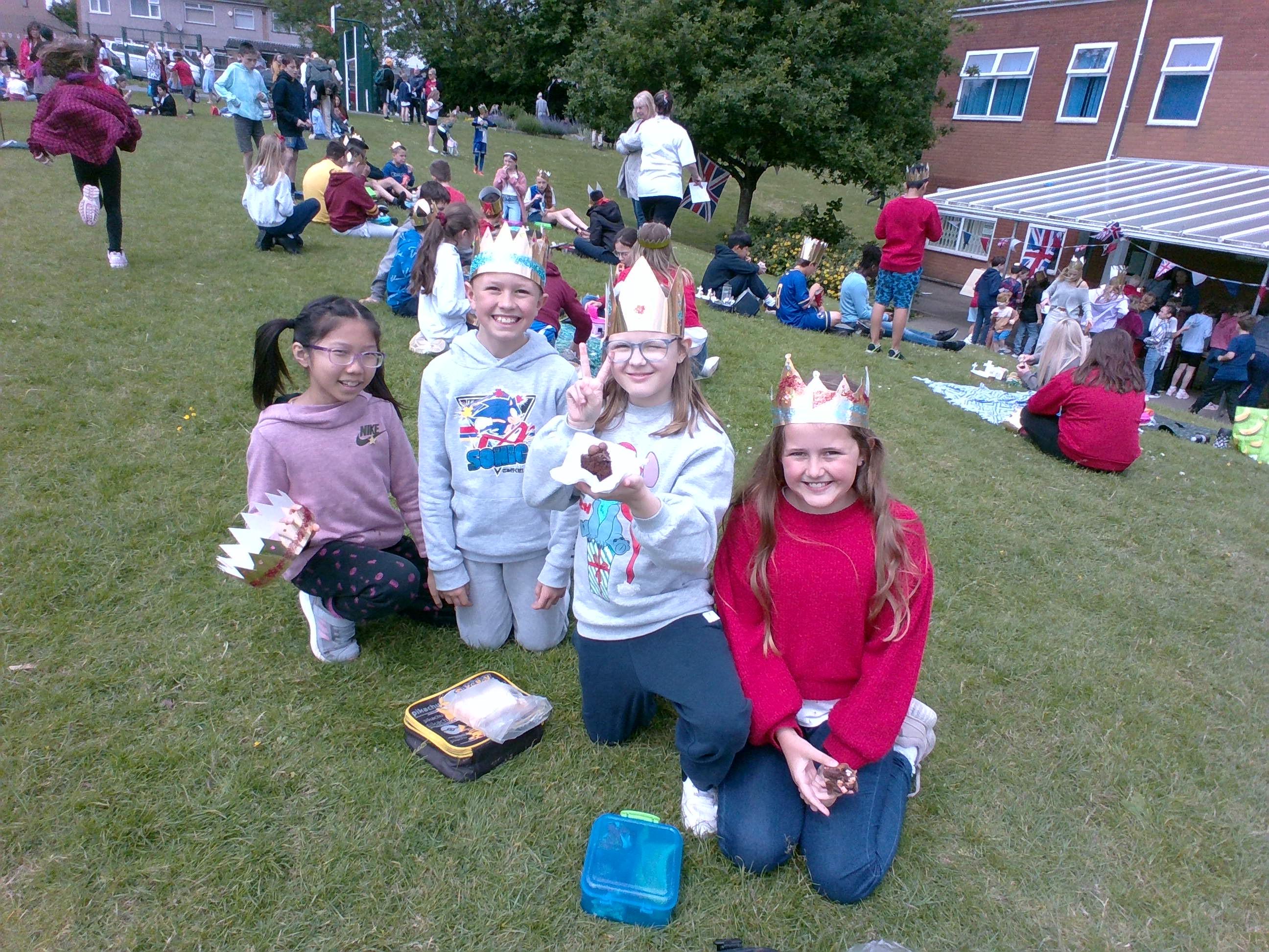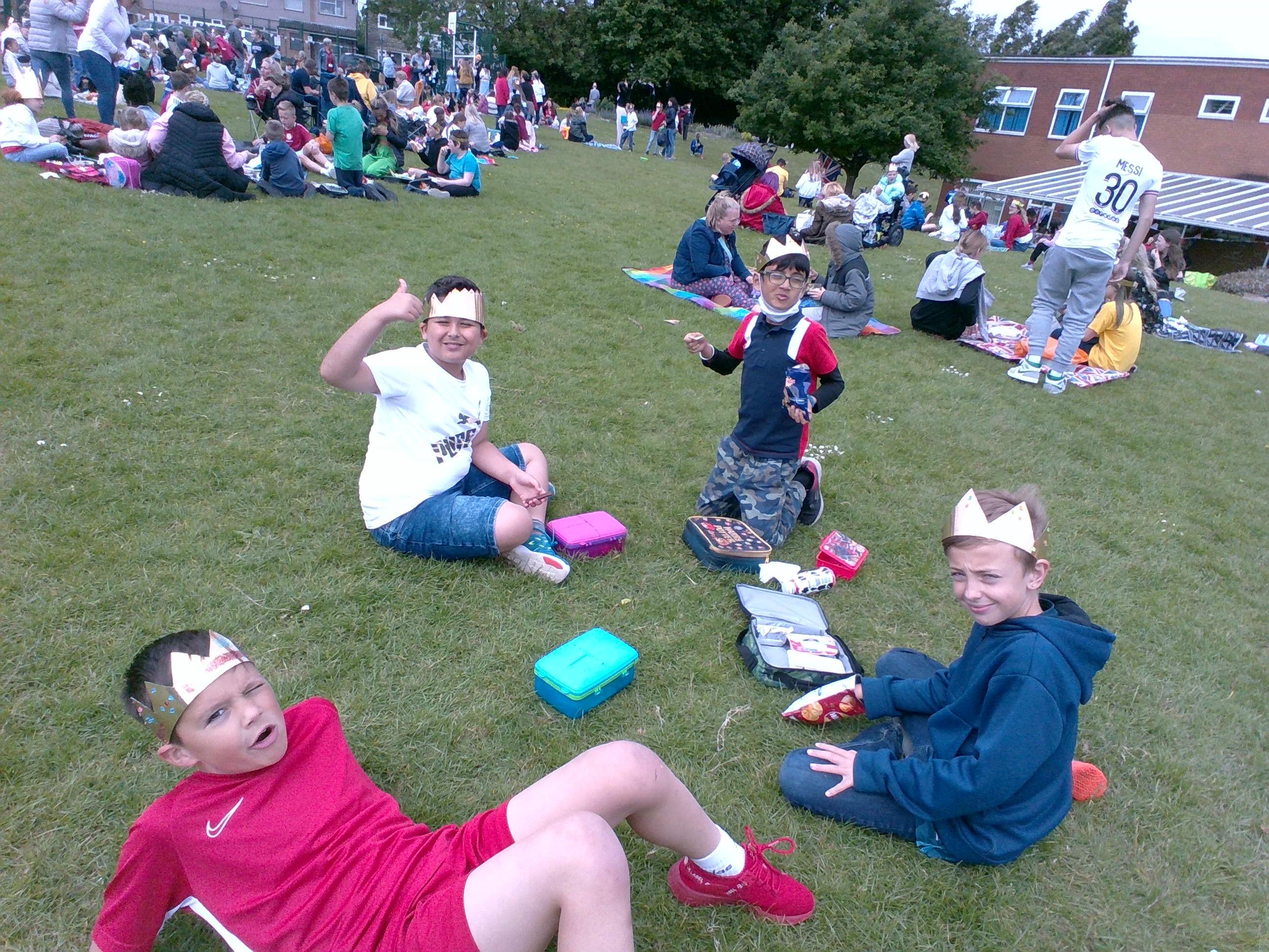 Today, we held a picnic in celebration of the Queen's Jubilee. We created beautiful crowns to wear and invited our parents and carers to our school field, which we decorated with celebratory bunting, to eat lots of delicious treats with us.