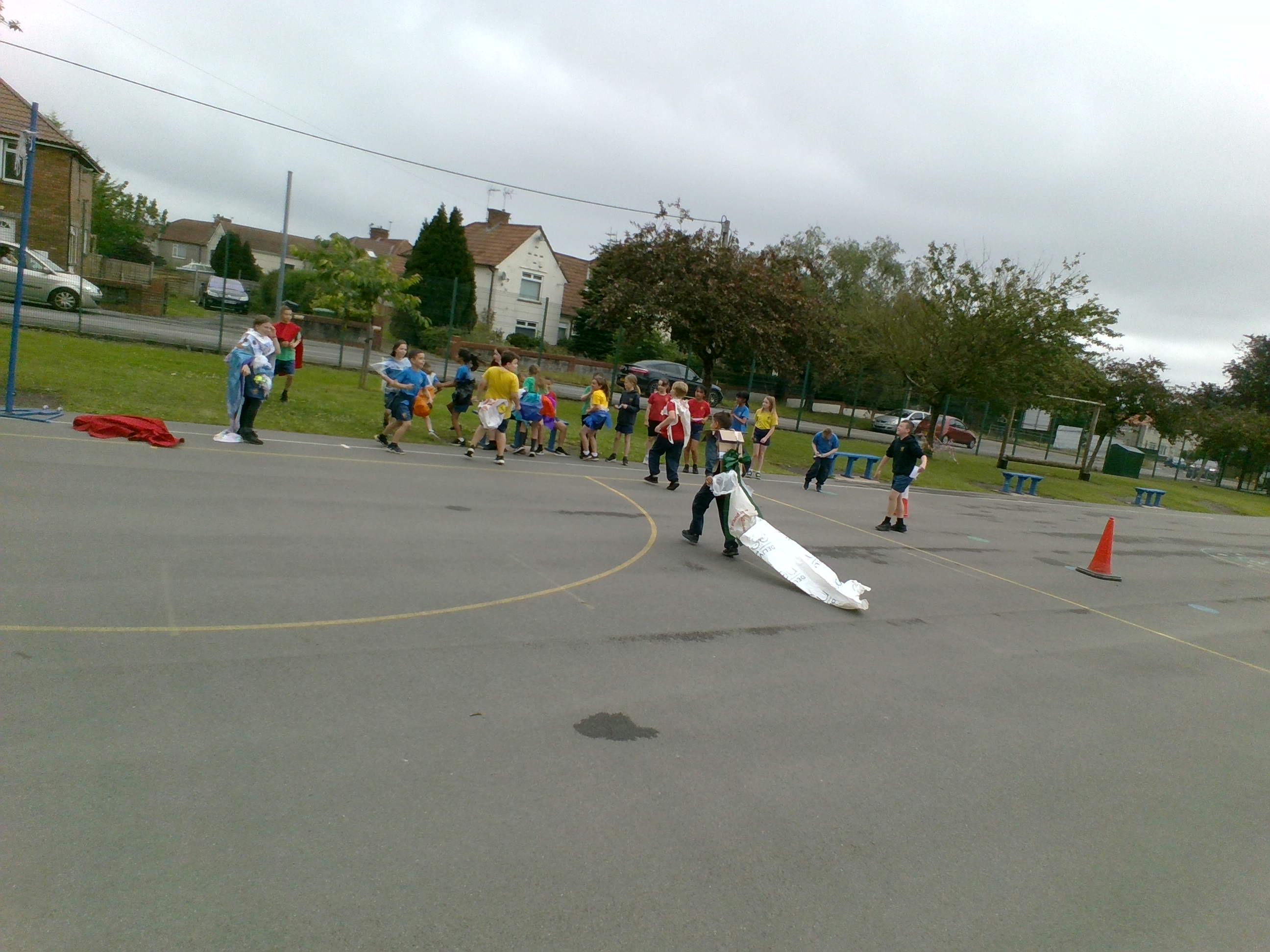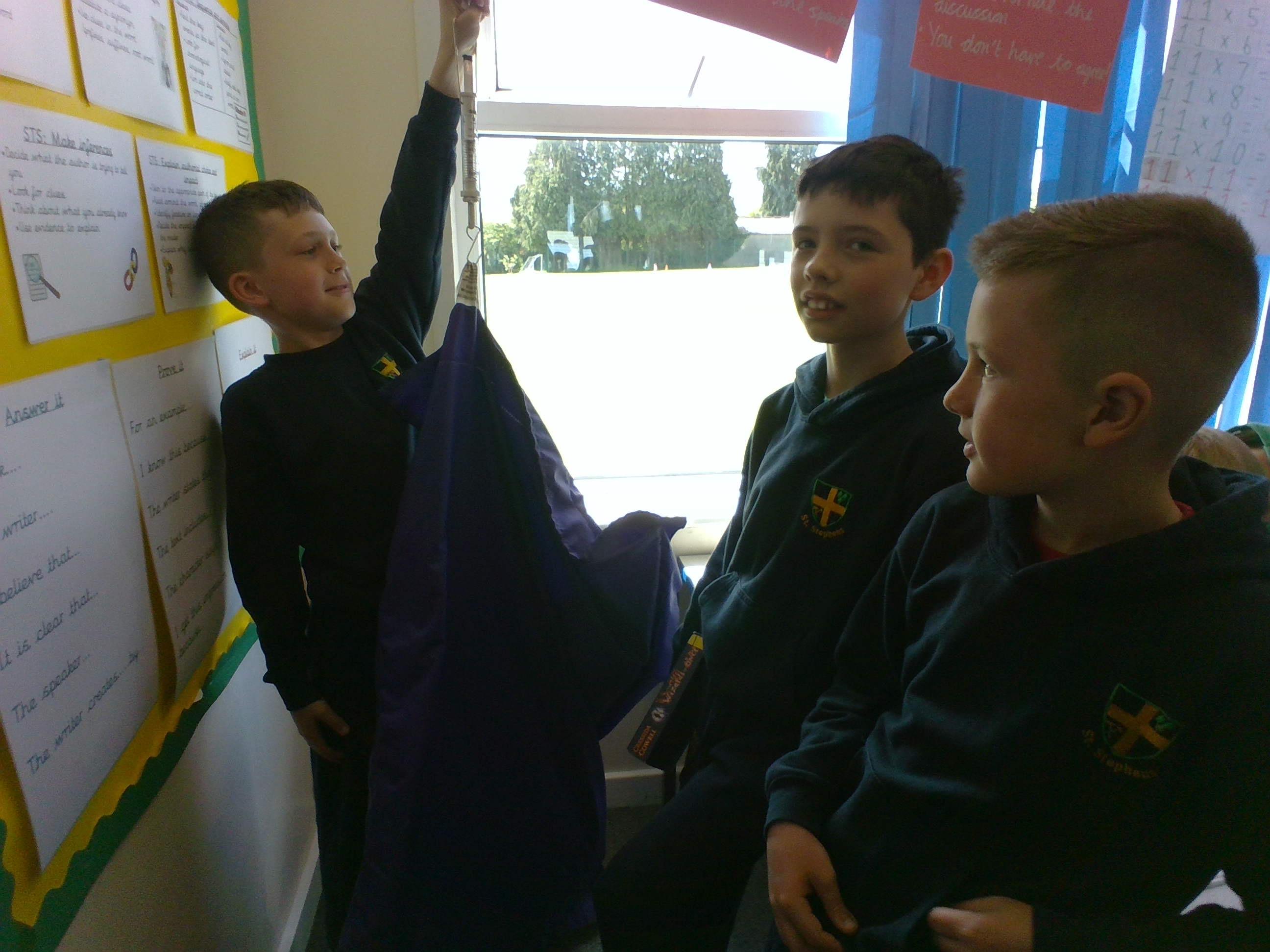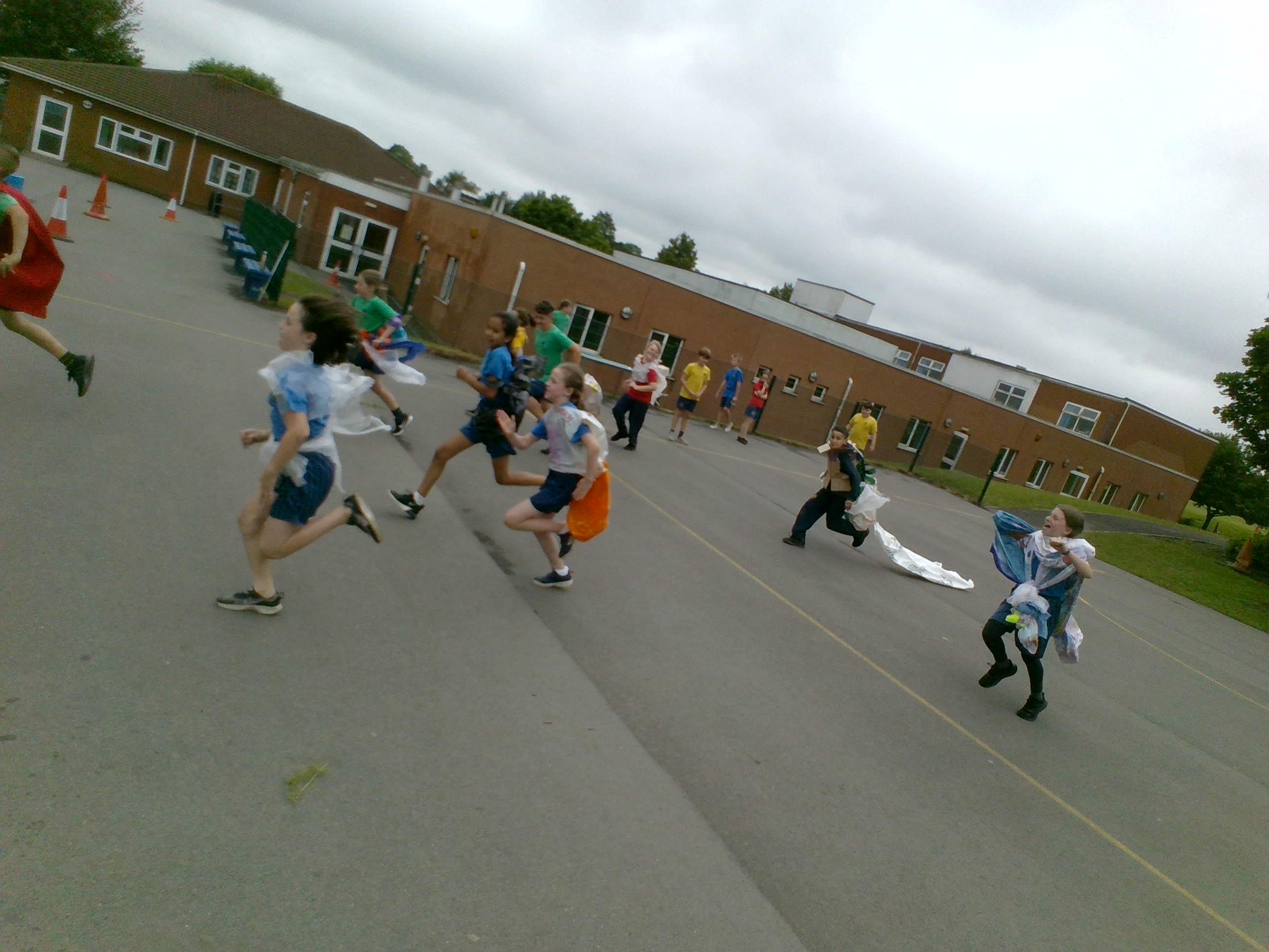 In Week 4, we investigated and researched a range of forces. We found out about air resistance and made costumes to try and slow down our opponents in a running race. Then, we tested out our final air resistance costumes and had so much fun. We couldn't believe how much slower we ran with them on!