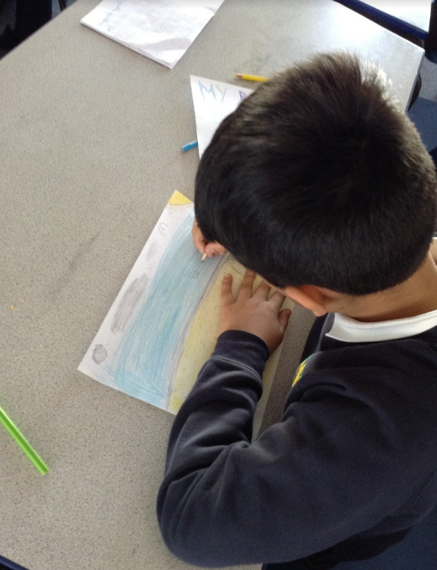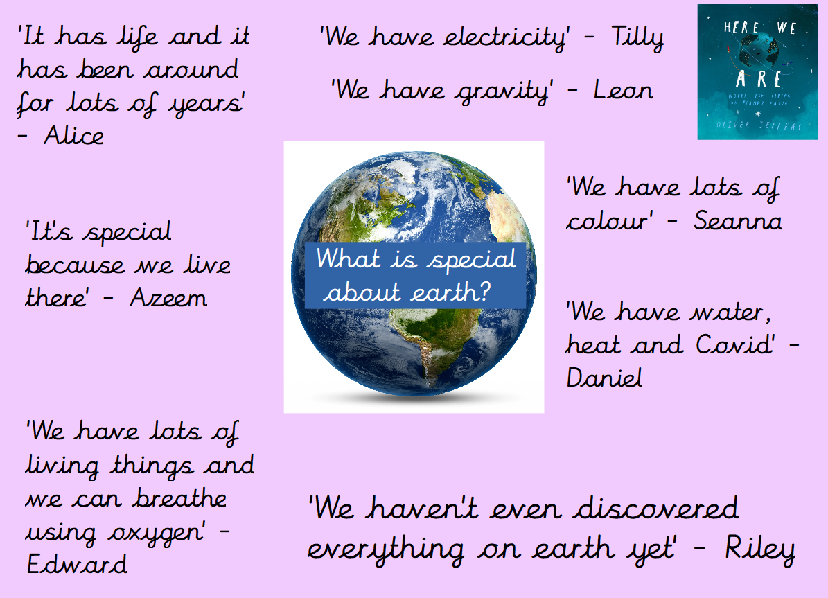 In Week 3, we have began to immerse ourselves into the wonderful book, 'Here We Are' by Oliver Jeffers. Firstly, we discussed where we currently are, how we felt about being back at school and what is similar and what is different. Then, we discussed how wonderful our earth is and listed features of the earth that makes it special. We extended our appreciation of the earth and sketched our favourite places. After reading the book, the children decided on their favourite illustrations and collaboratively decided on the message of the story - 'We only have one world so we must look after it'. Finally, we linked this story to our school intent of 'Learning to Change the World' and understood that we are more than capable of making a difference.