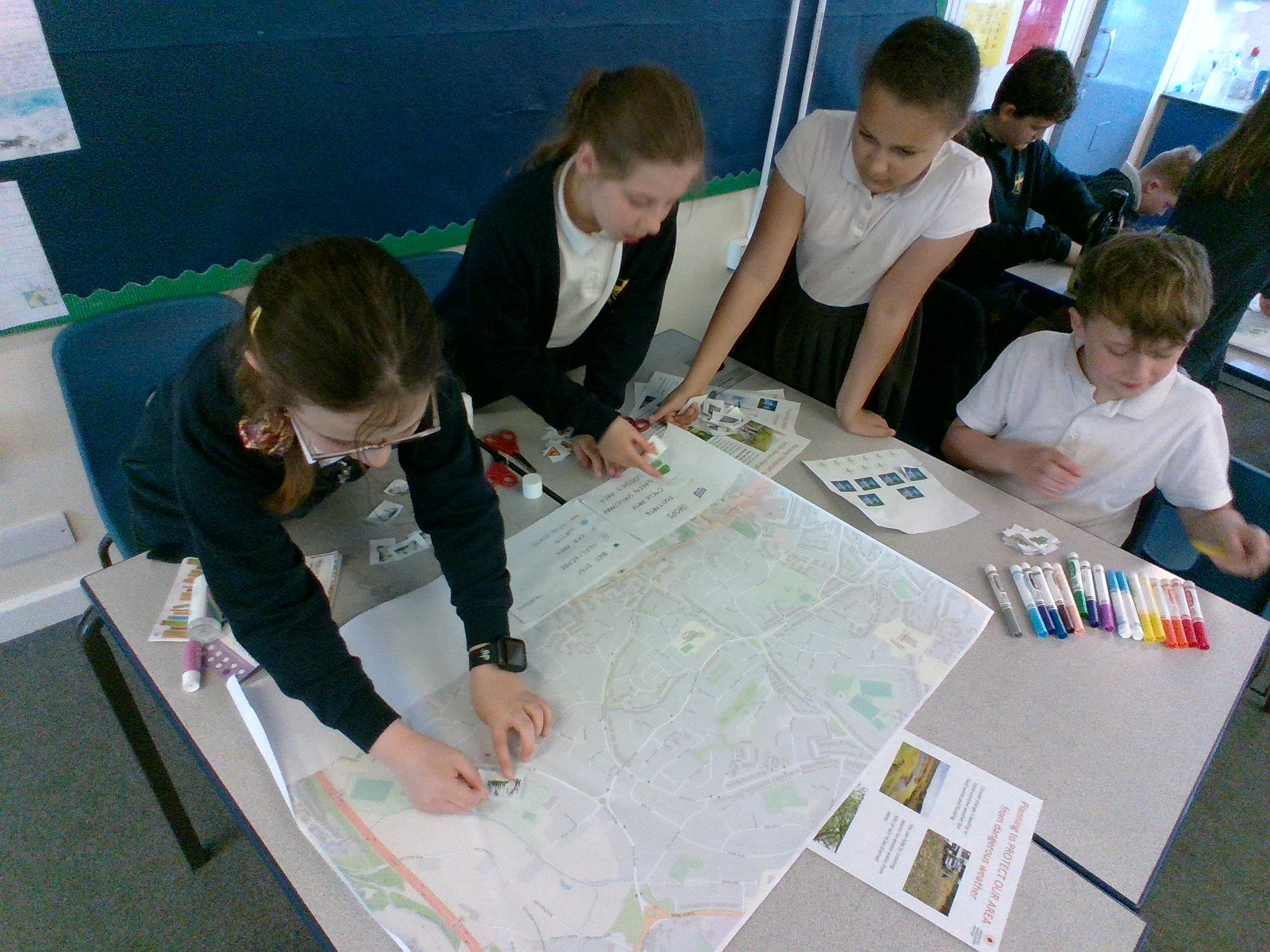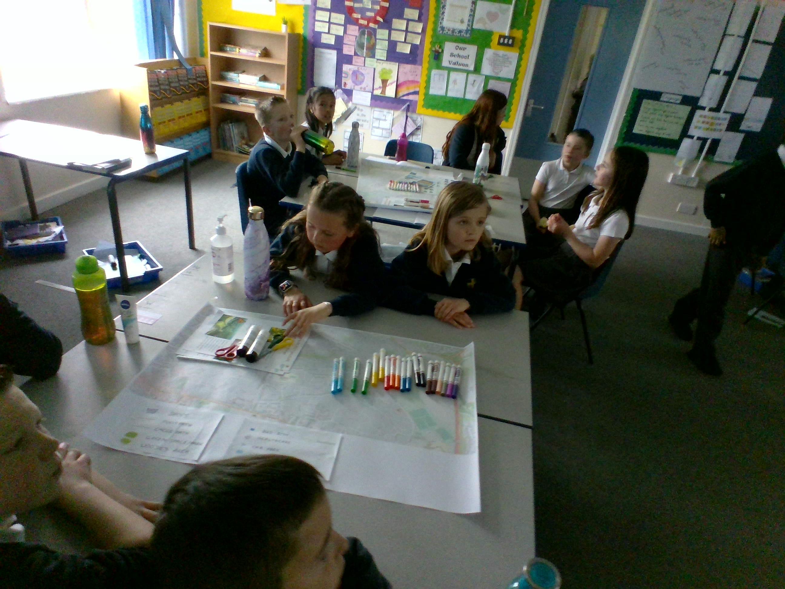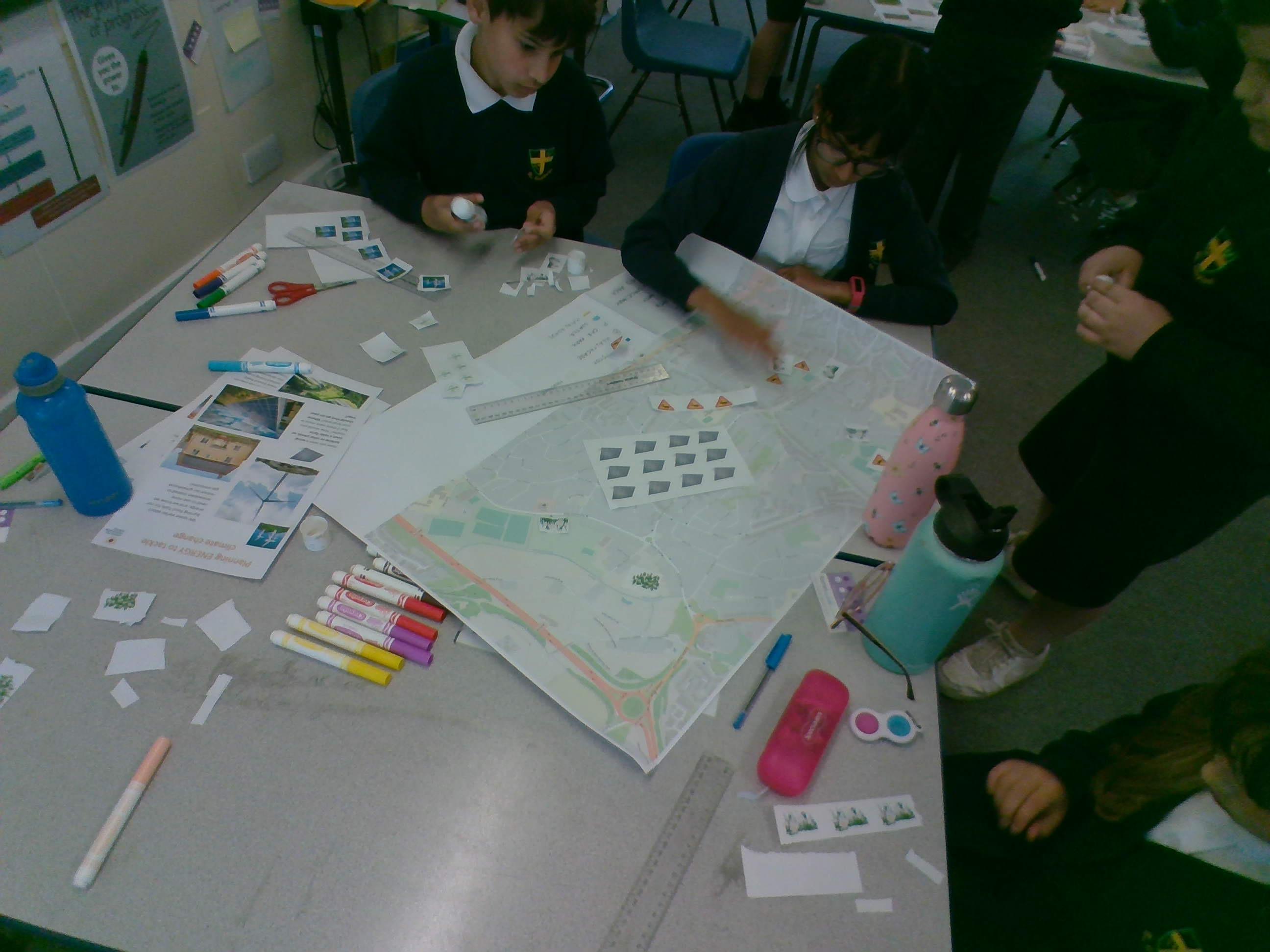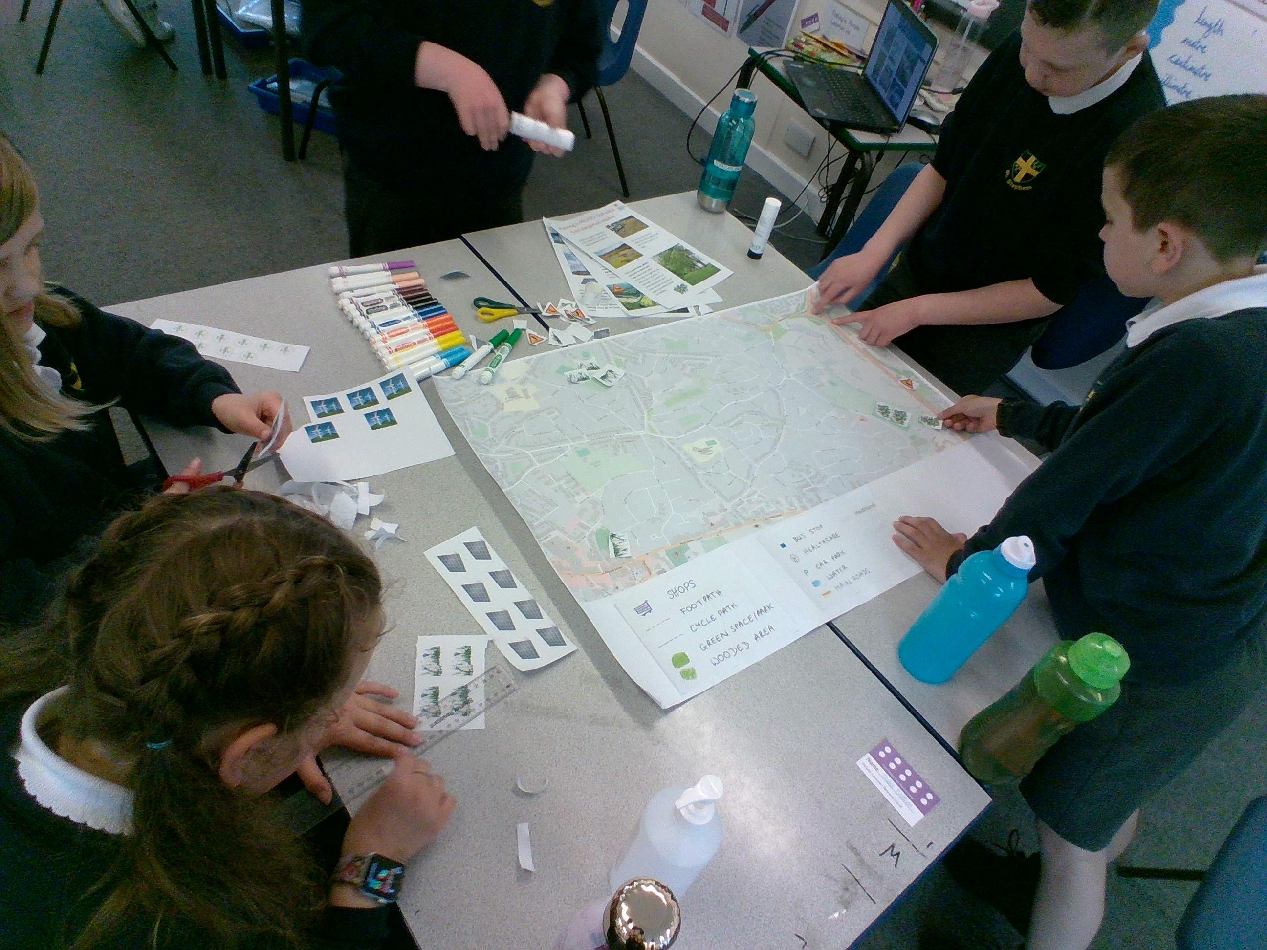 Today, we took part in a fantastic workshop which helped us think about what we can do to help our local envronment. We added in electric vehicle charging points, solar panels, wind turbines and green space onto maps of our local area .
