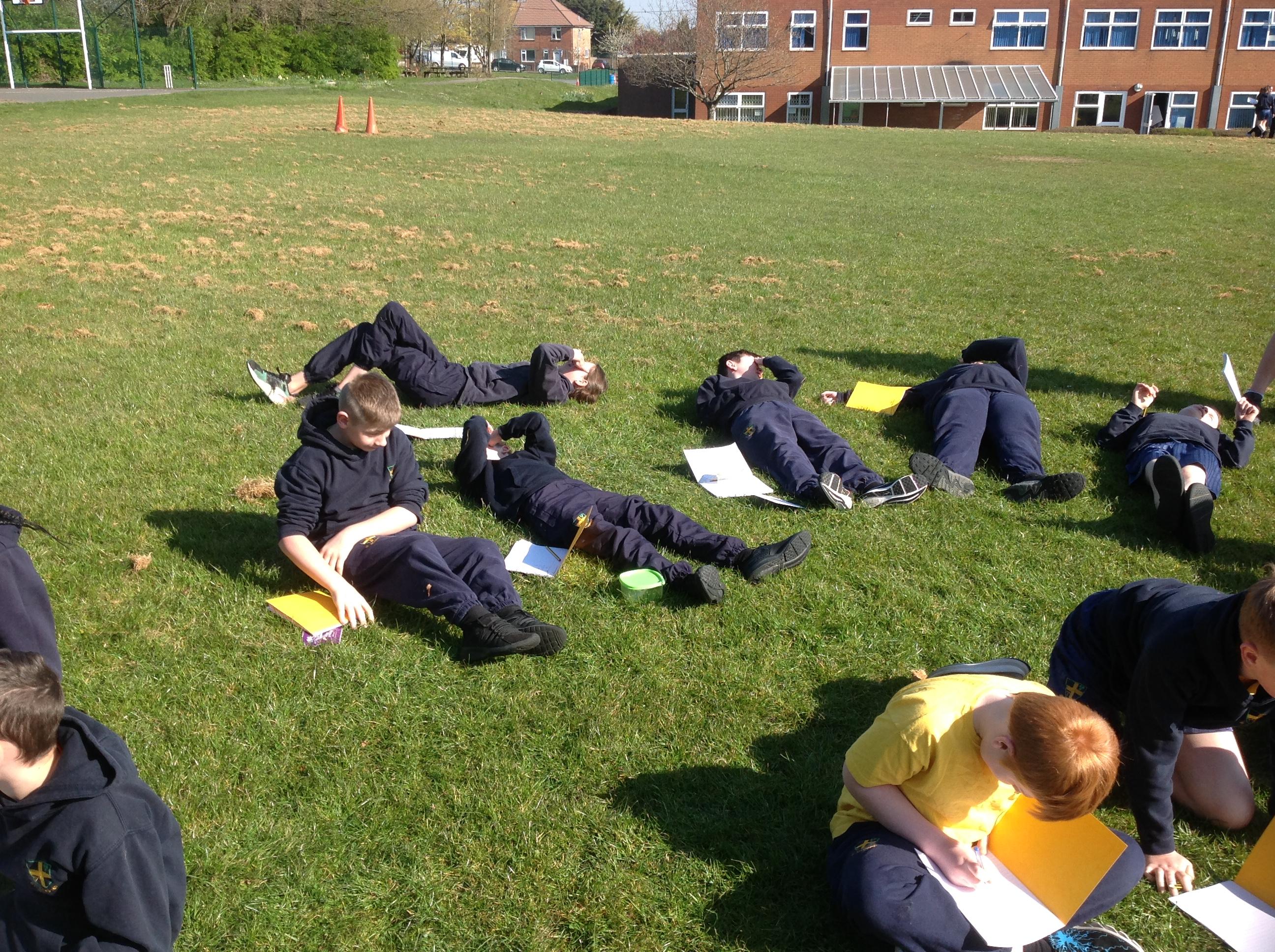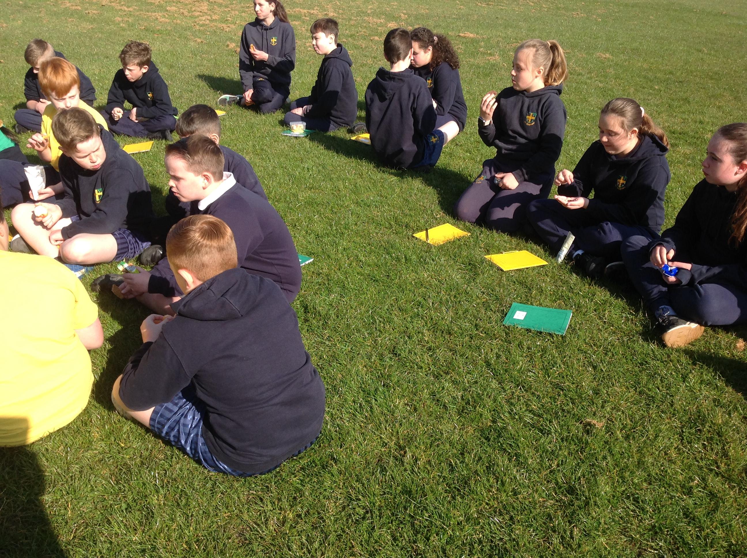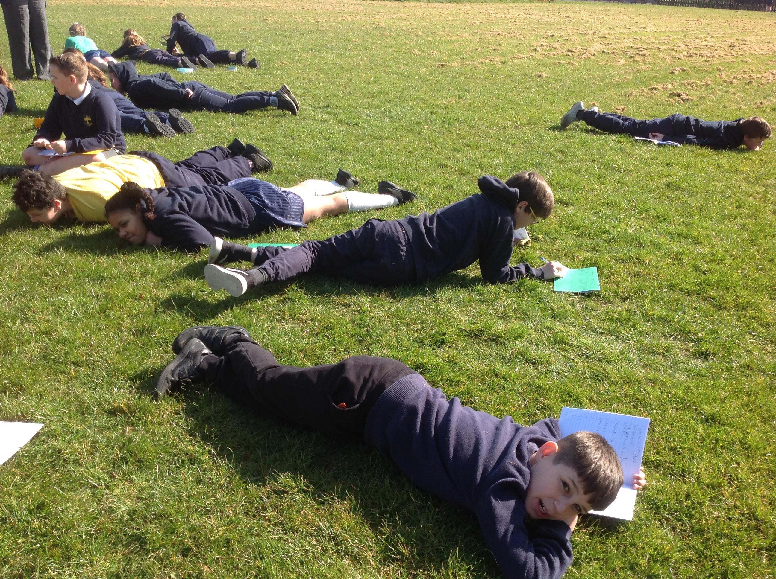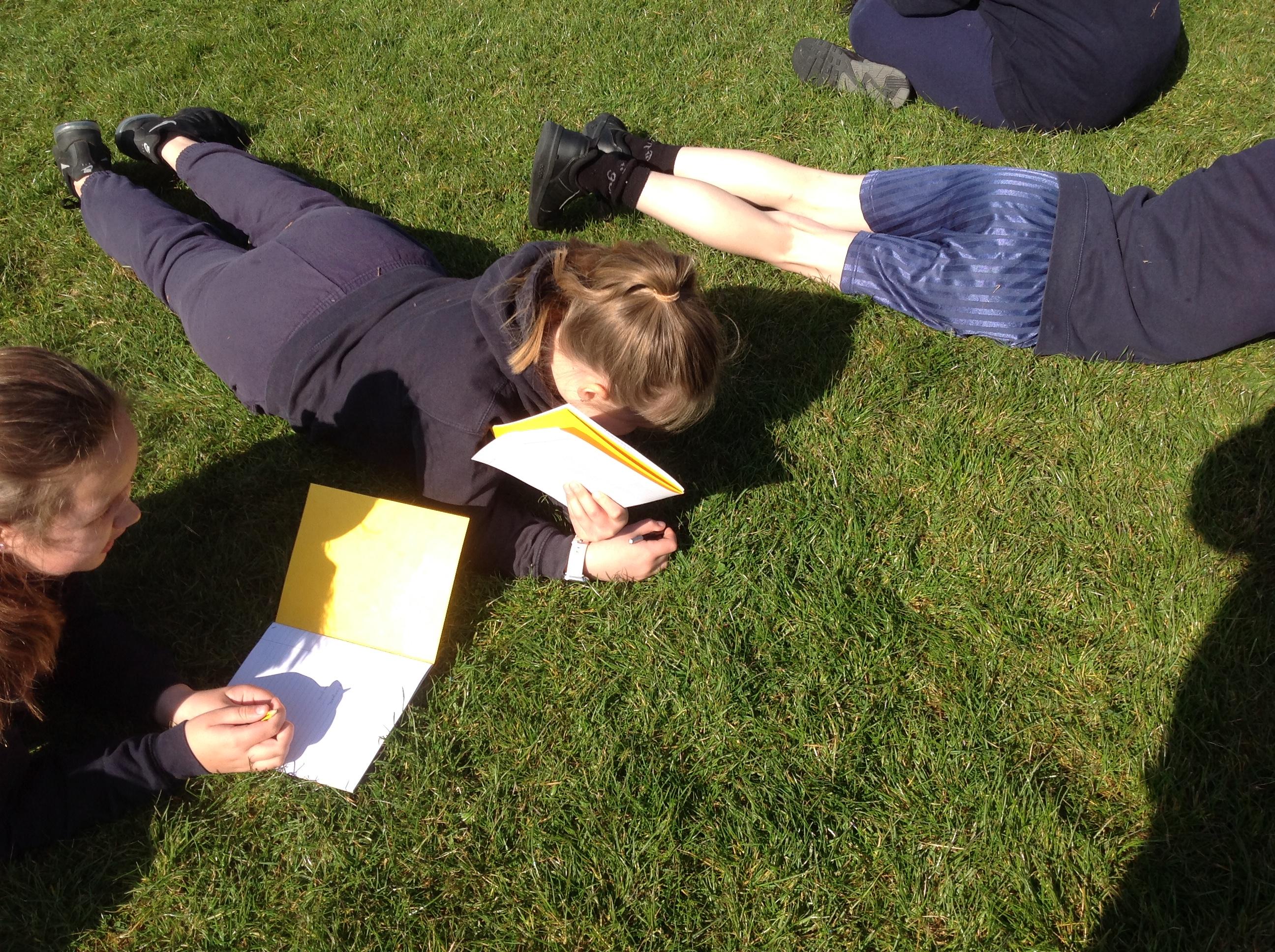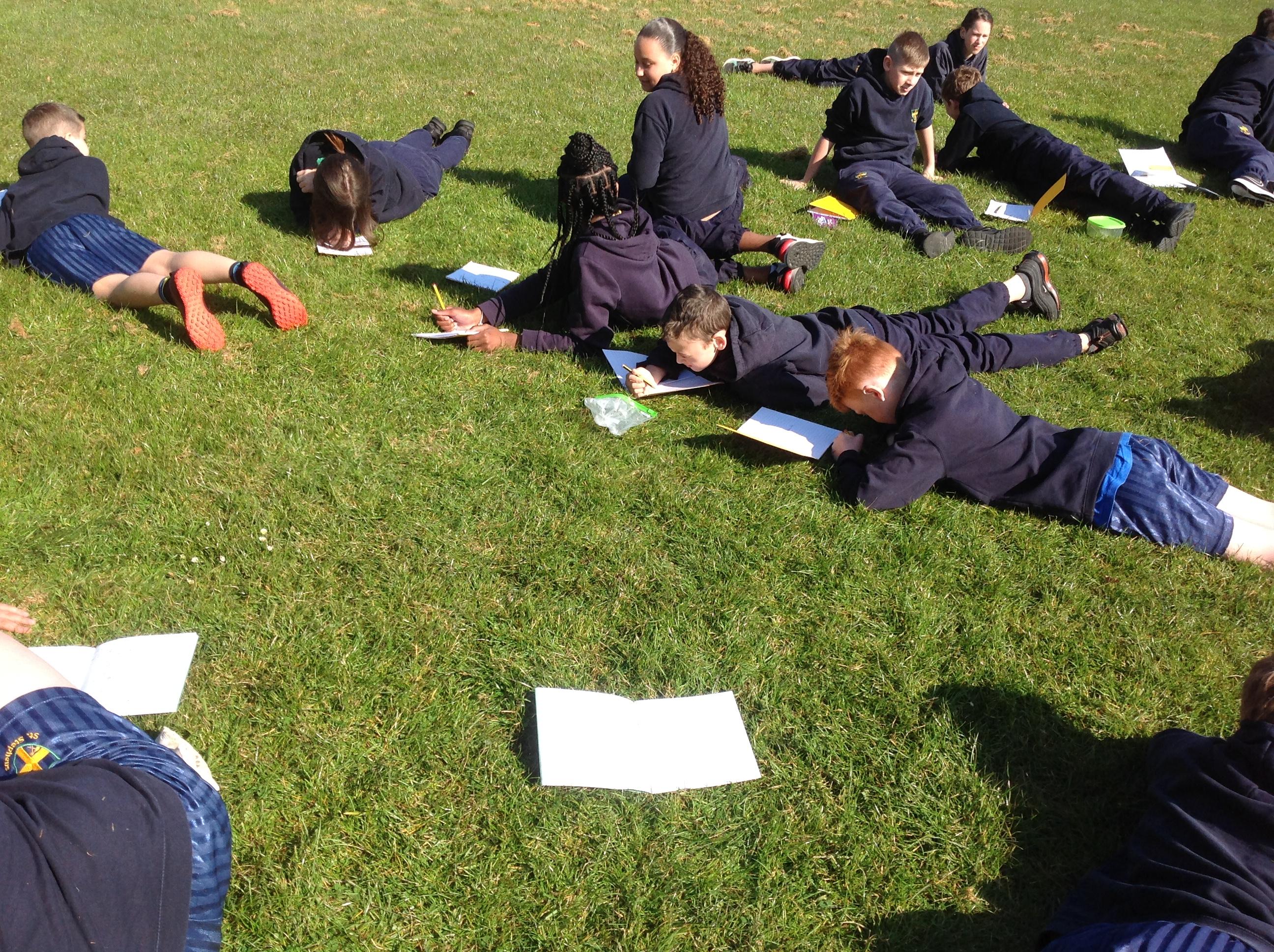 In Week 1, we went outside to imagine what it might be like if we were just 15cm tall! After enjoying a picnic snack (to fully immerse ourselves within the setting of a meadow) we led down and explored the ground and surrounding vegetation. From there, we collected words and phrases related to our senses that will help us to write our stories next week.