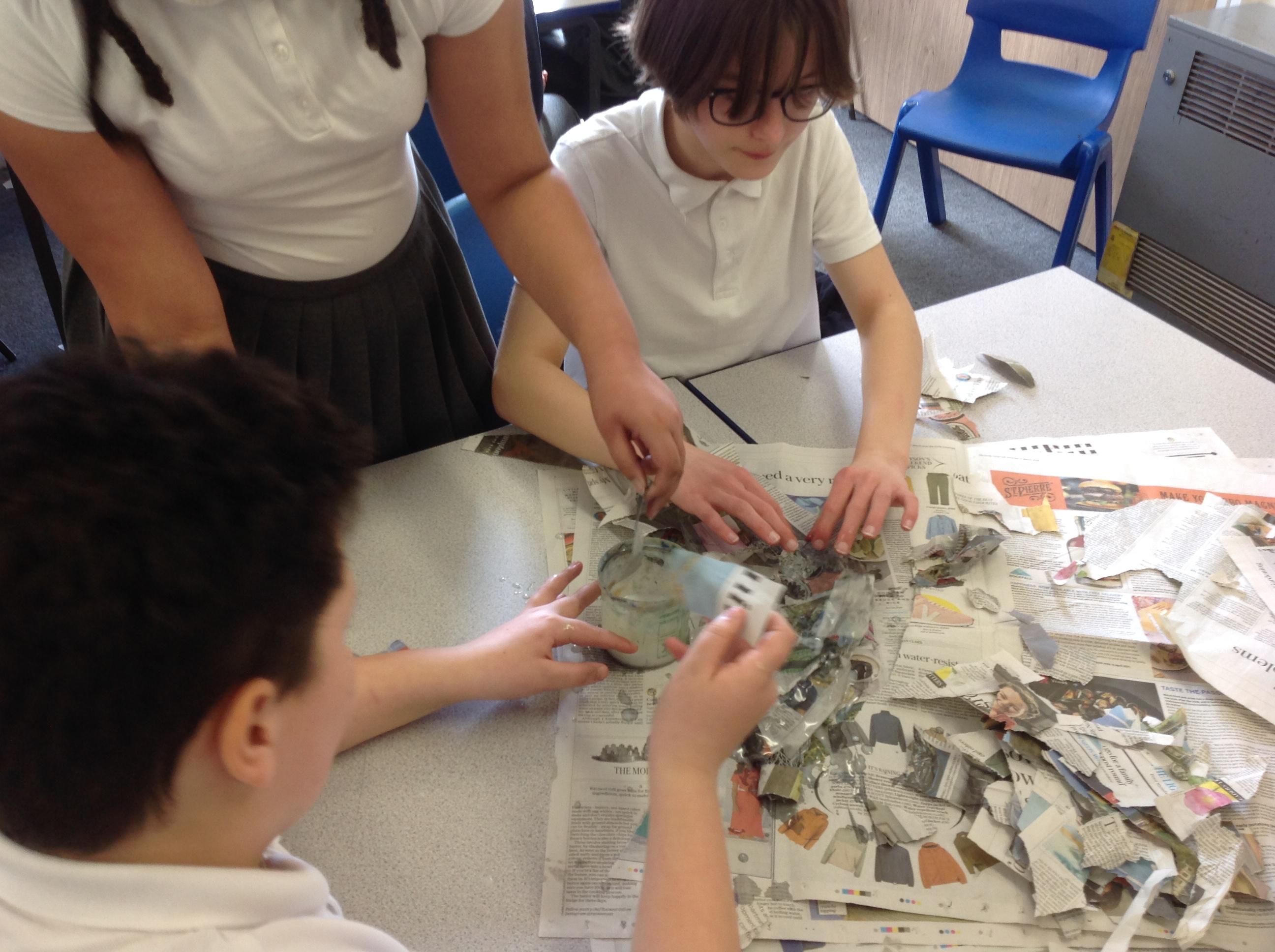 In Week 2 we had excellent fun making 3D sculptures using chicken wire, tissue paper, paper mache and crisp packets! We focussed on a page from 'Here we are' and noticed that there were some insects in the forefront so we wanted to recreate them. After looking at the work of a variety of sculptors, we collaboratively planned our own project and finished them this week. Take a look at our photos below!