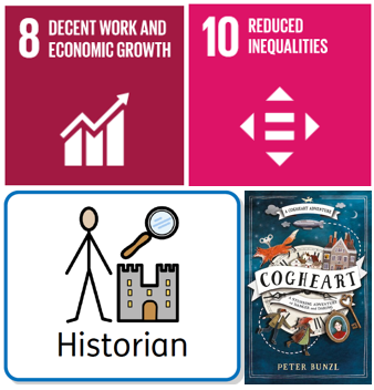 Through this enquiry, we will be looking at two Global Goals: Goal 8 - Decent work and economic growth and Goal 10 - Reduced inequalities. Throughout the enquiry, we will be focusing on developing our skills are historians. As well as this, we are going to be immersing ourselves in the book Cogheart, using this to enhance our writing and to further immerse ourselves into the Victorian era.