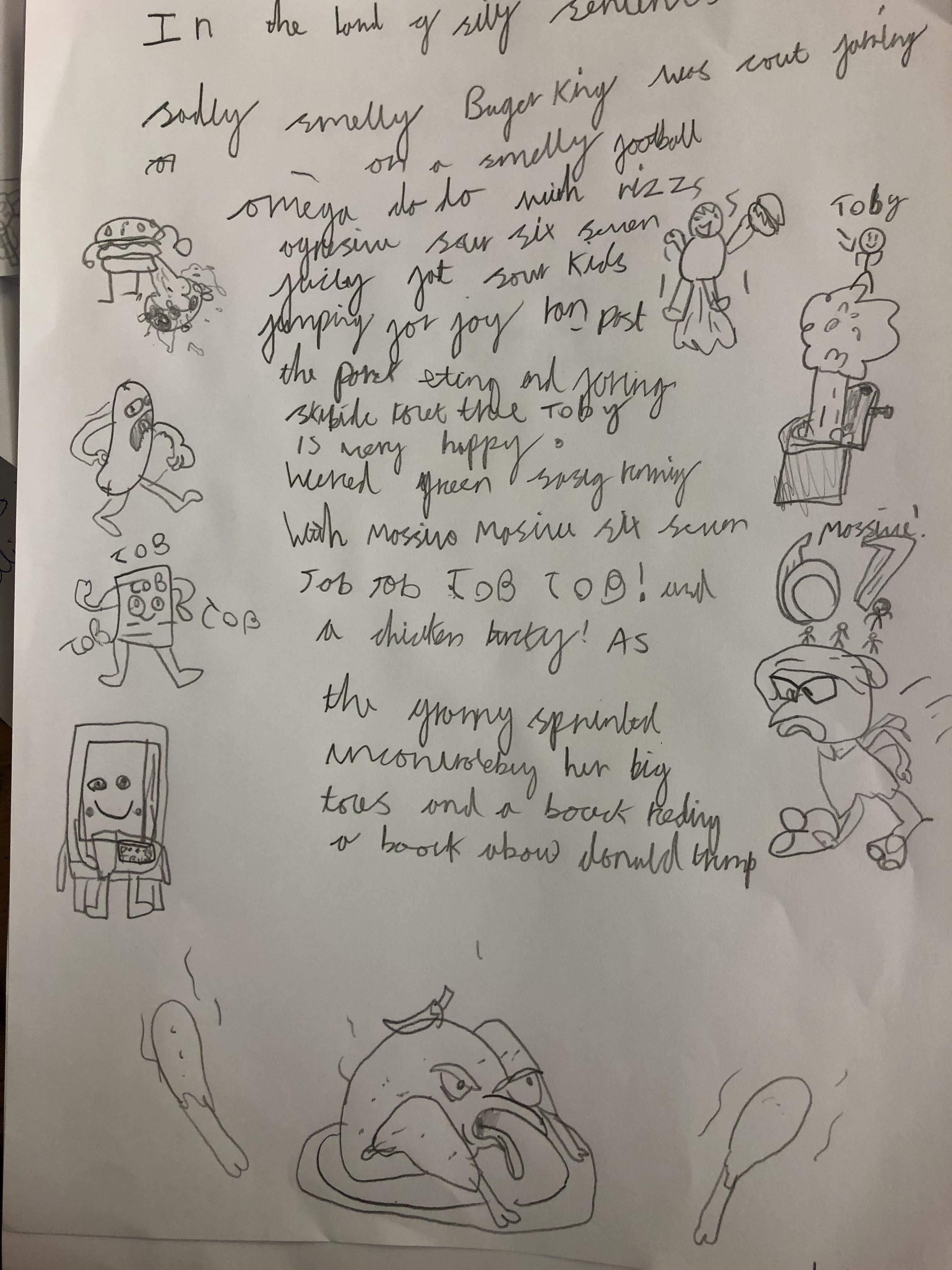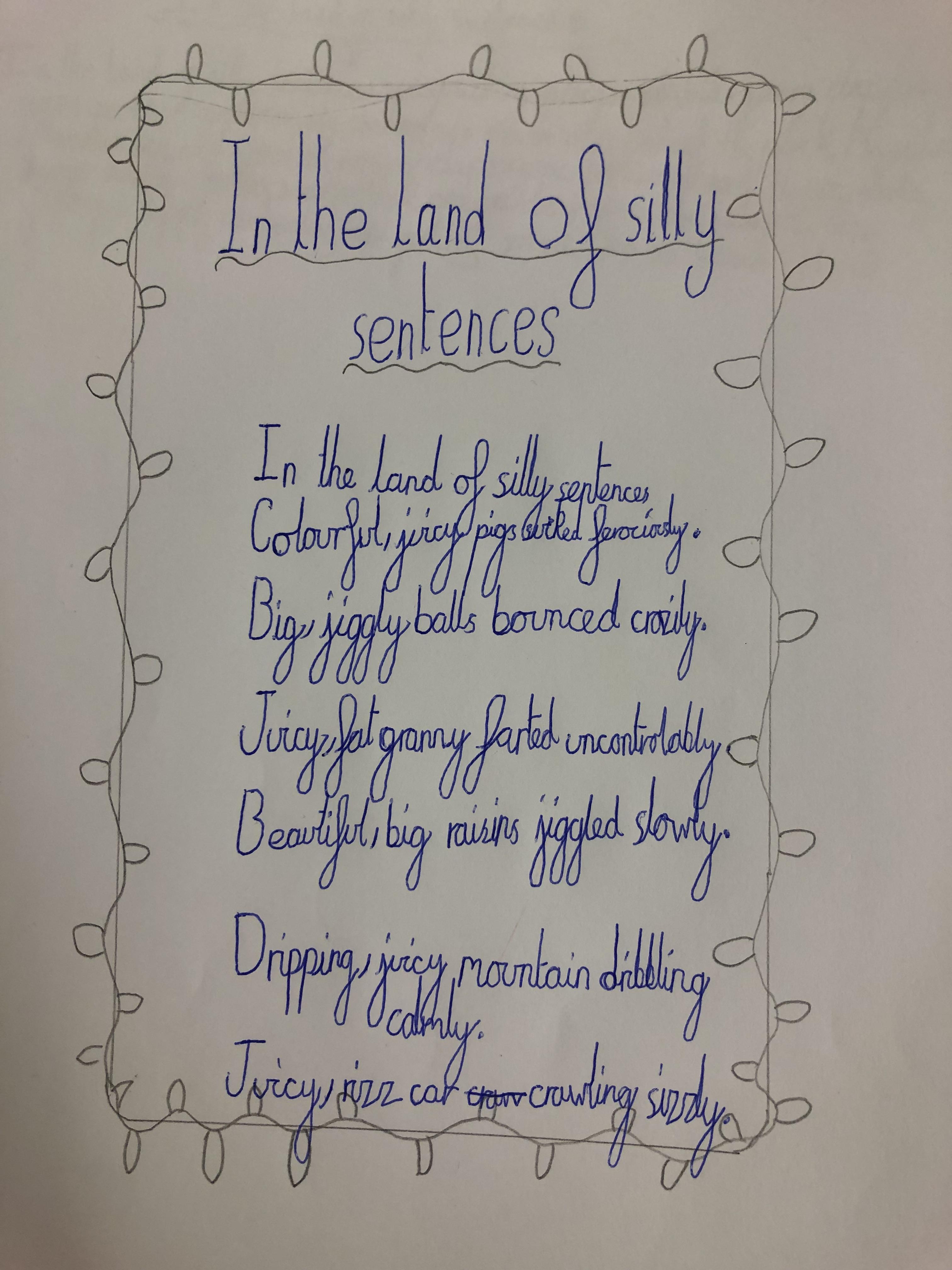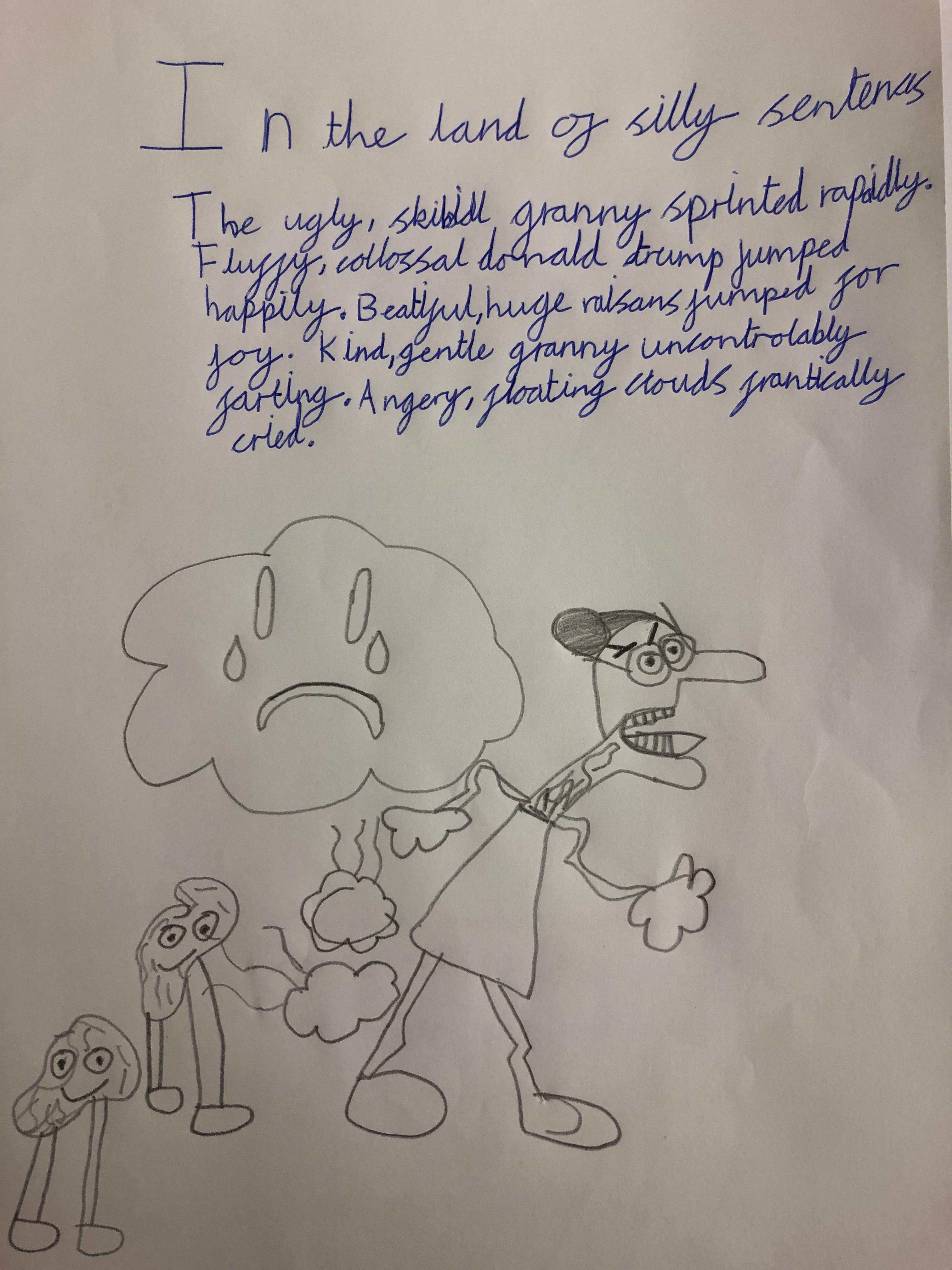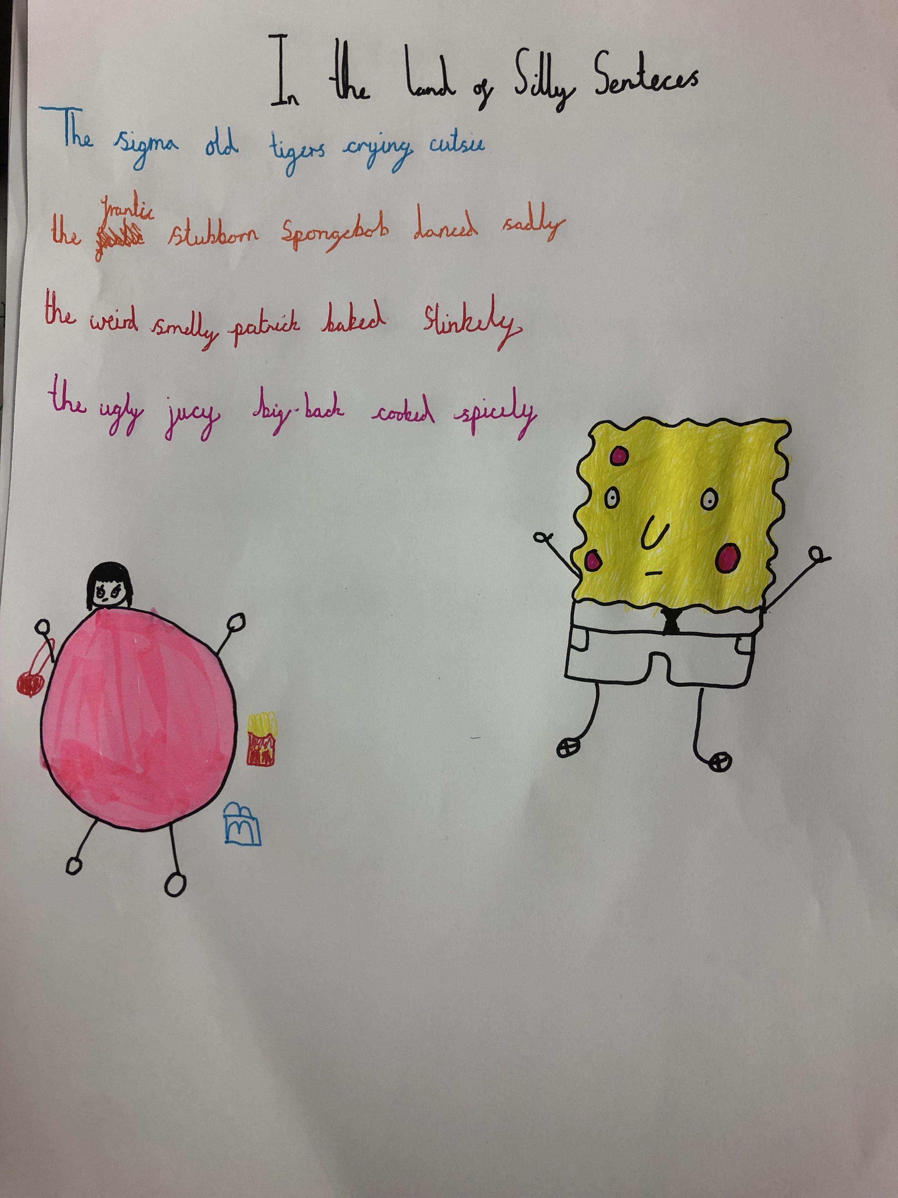 For National Poetry Day 2025, we learned about and created a shared class 'silly sentence' poem. We thought about the silliest verbs, nouns and adjectives that we could combine and had fun deciding which was the most full of nonsense. Together, we created individual poems (some have been shown in the pictures); we also asked AI to create some of the sentences as pictures!