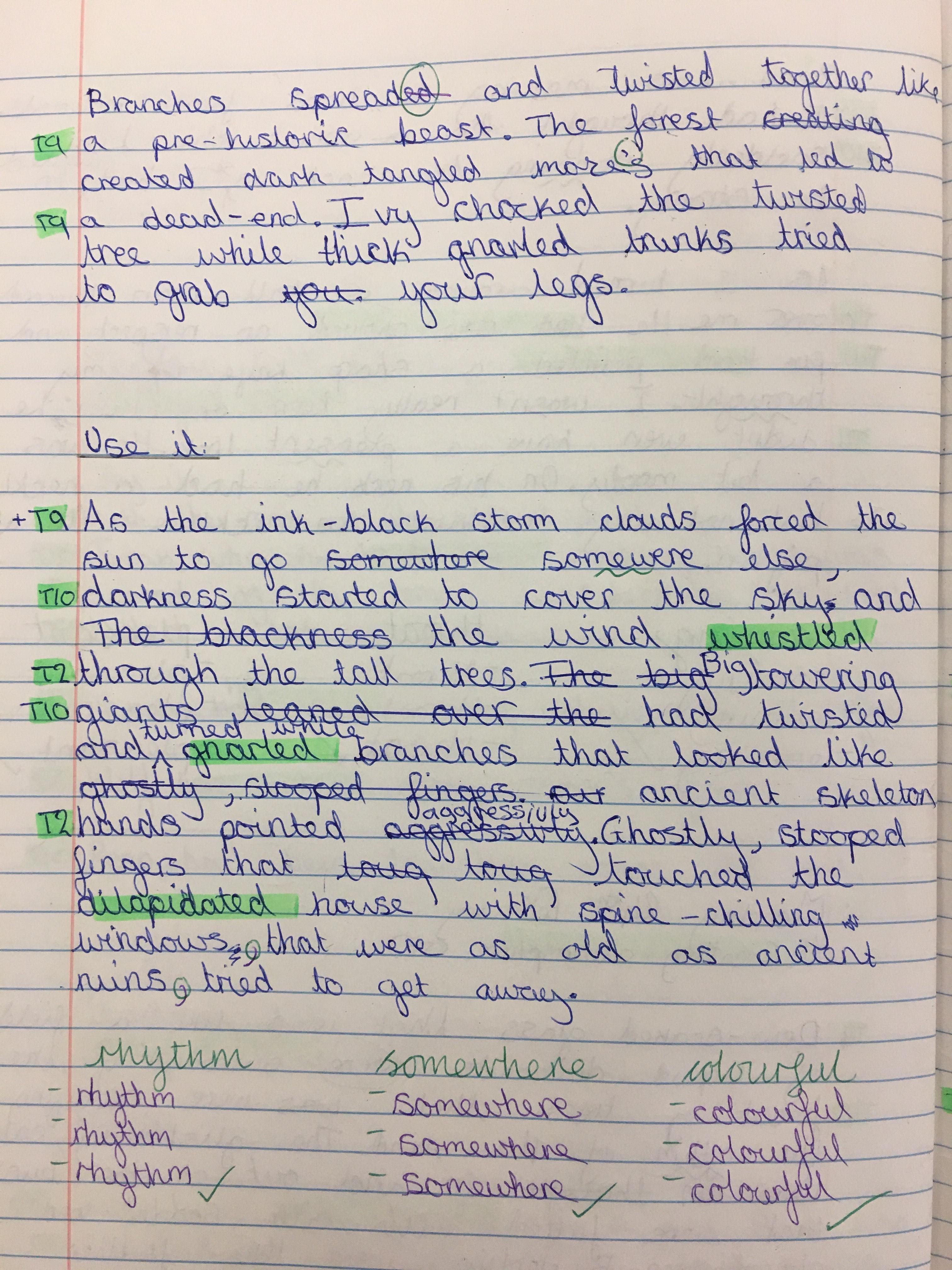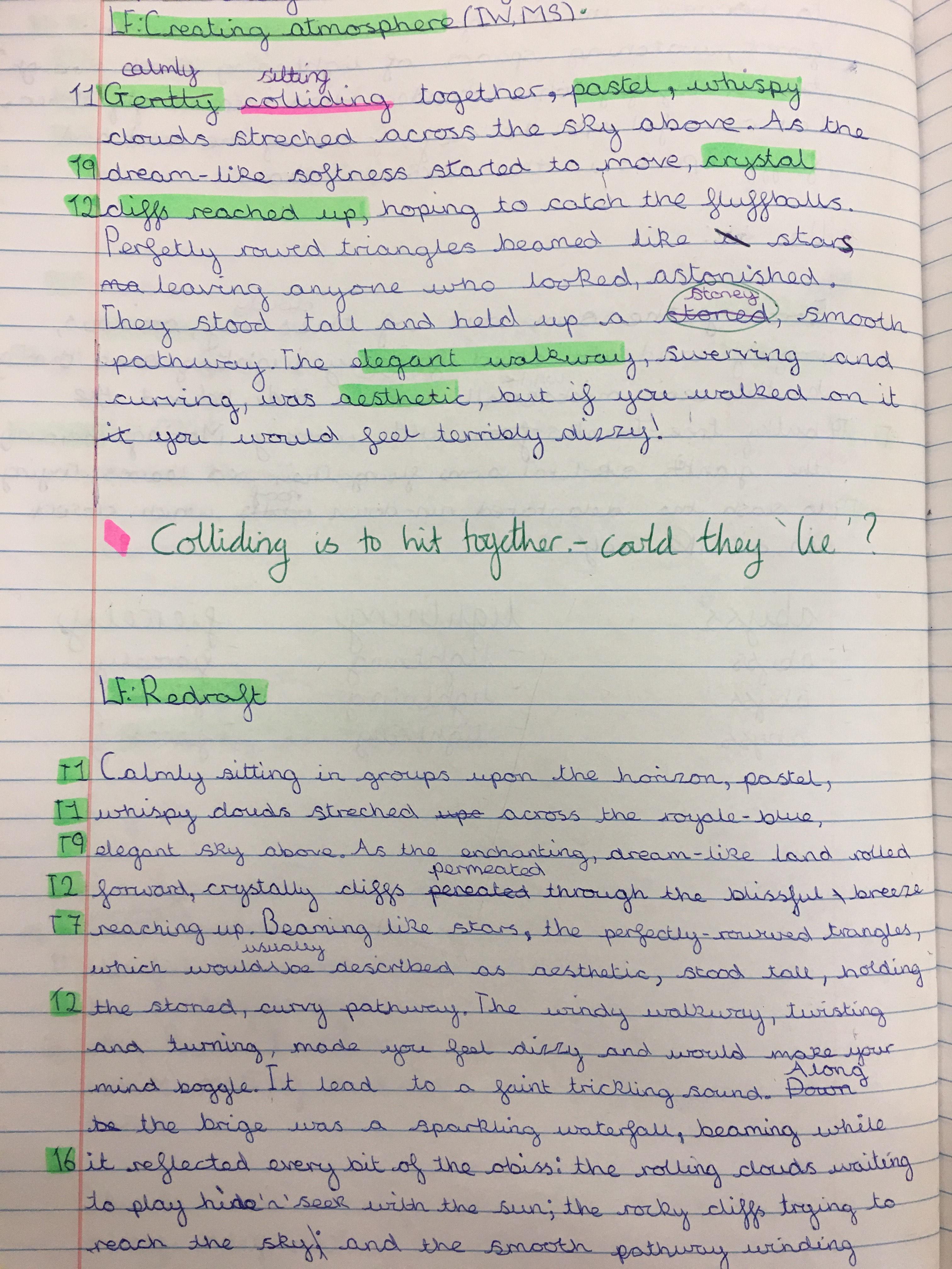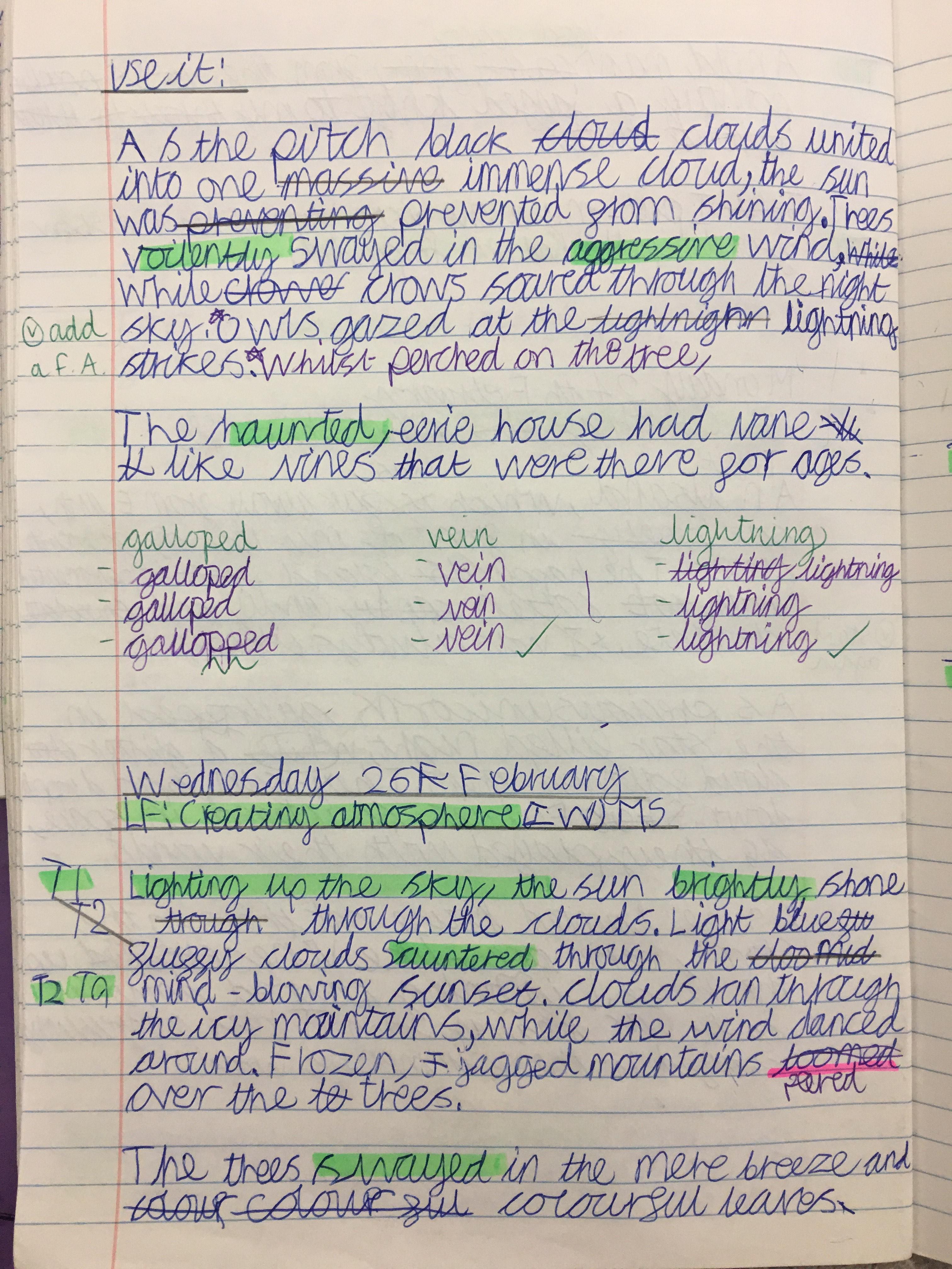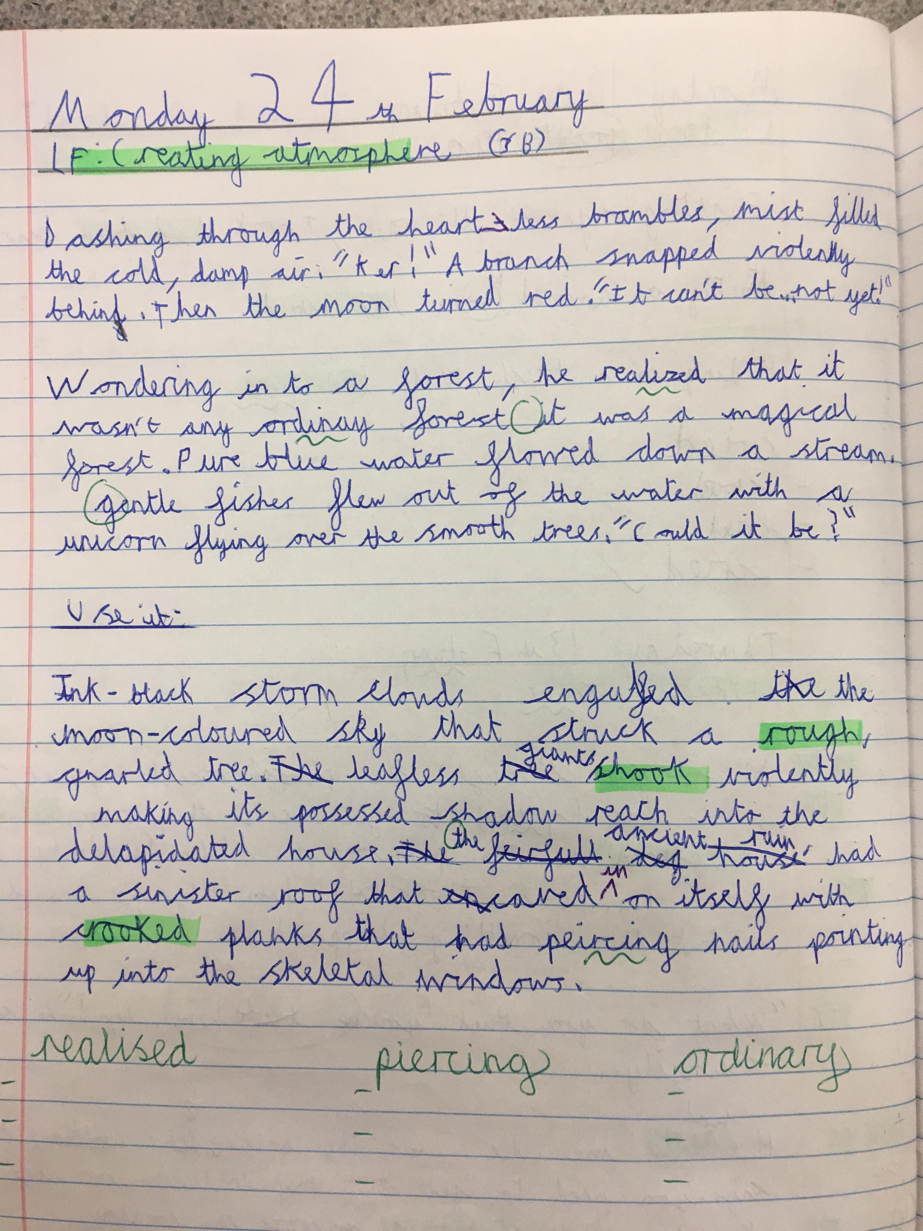 In Week 1, we have been learning to create atmosphere in our writing. It is important to make links between the time of day, the weather and the sensory description so that all of our sentences link. Having already learnt about cohesion, we had all the skills we needed to make our writing flow. We enjoyed exploring vocabulary when we had to choose specific words for our settings and we got to use our imaginations!